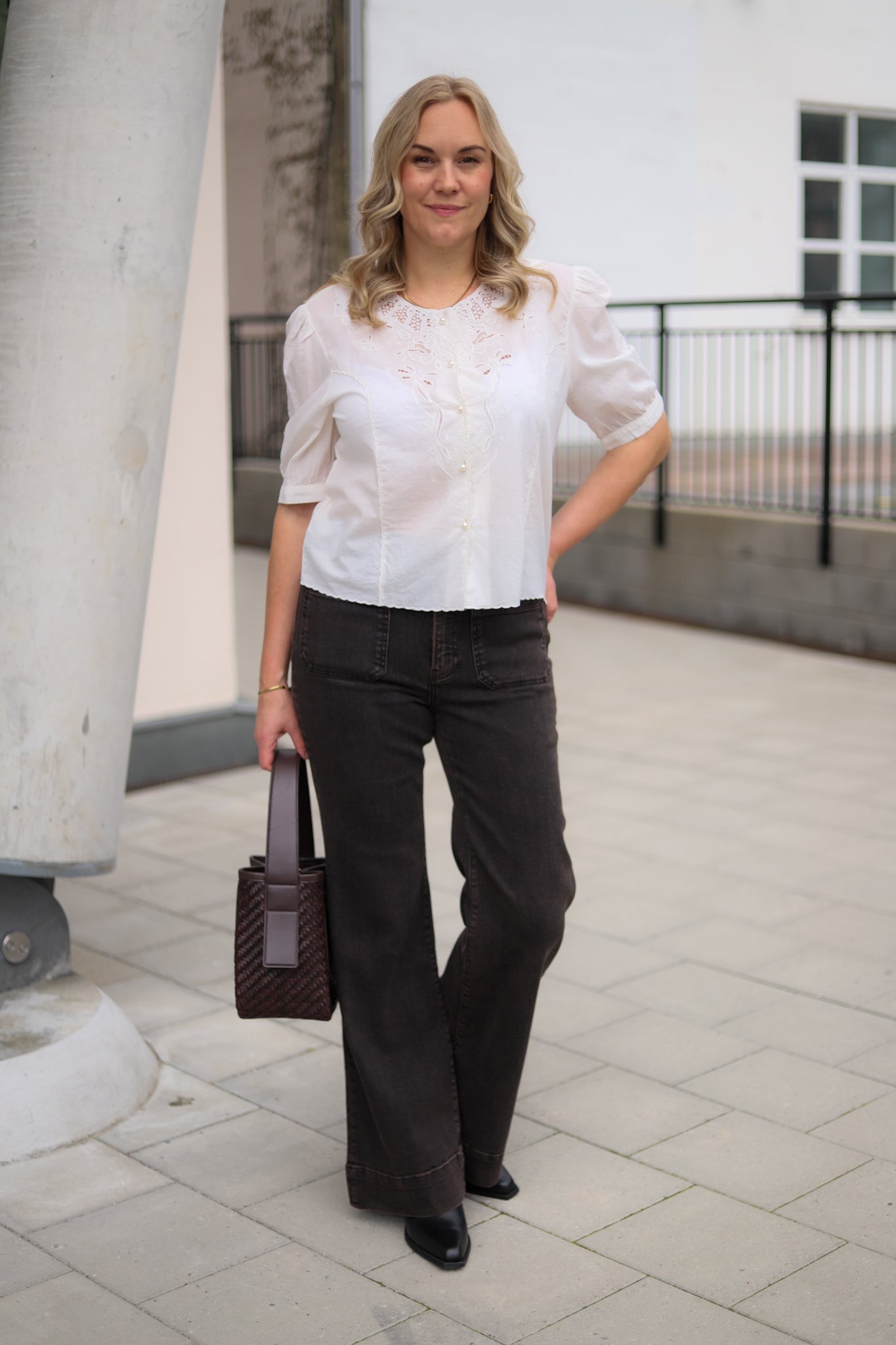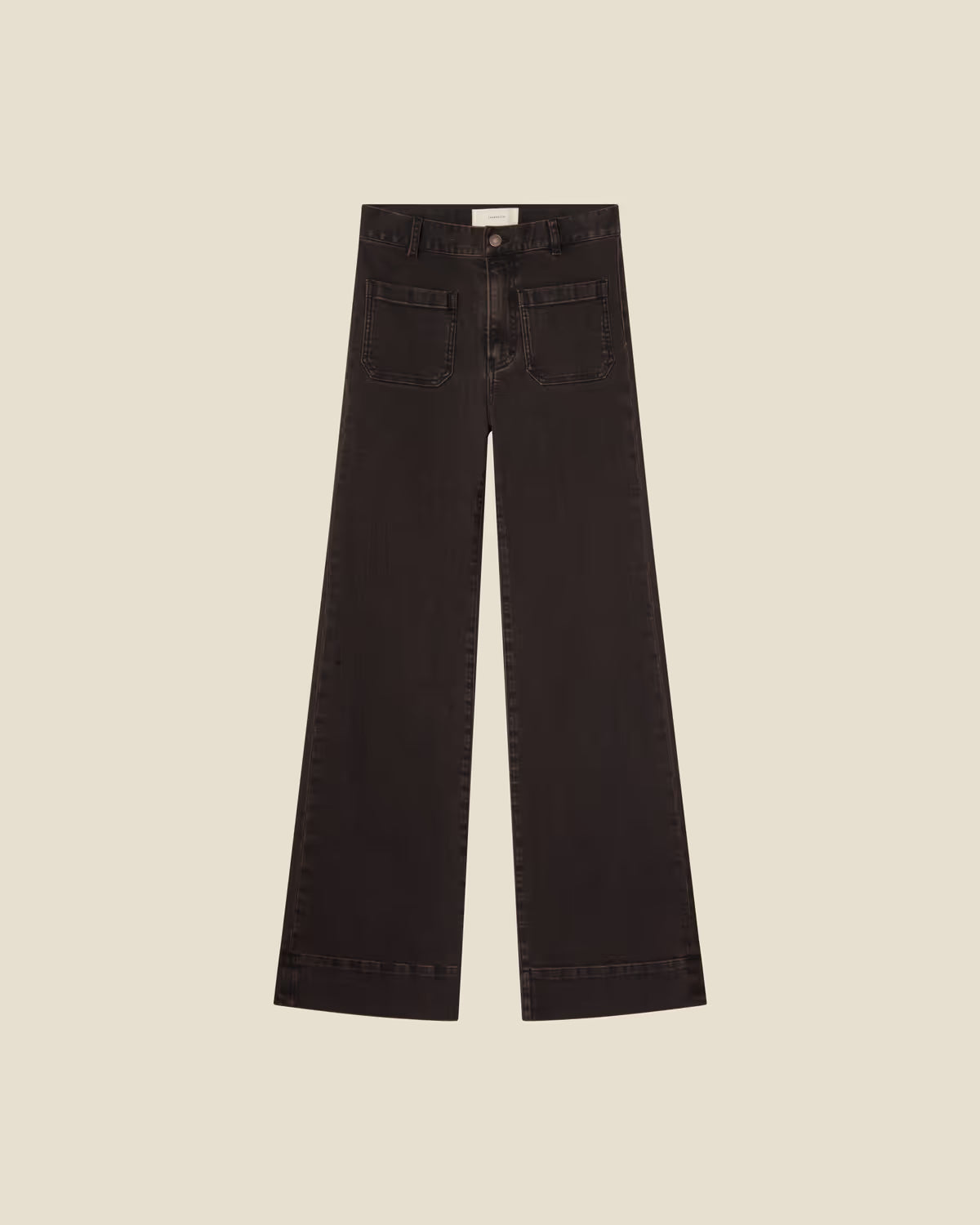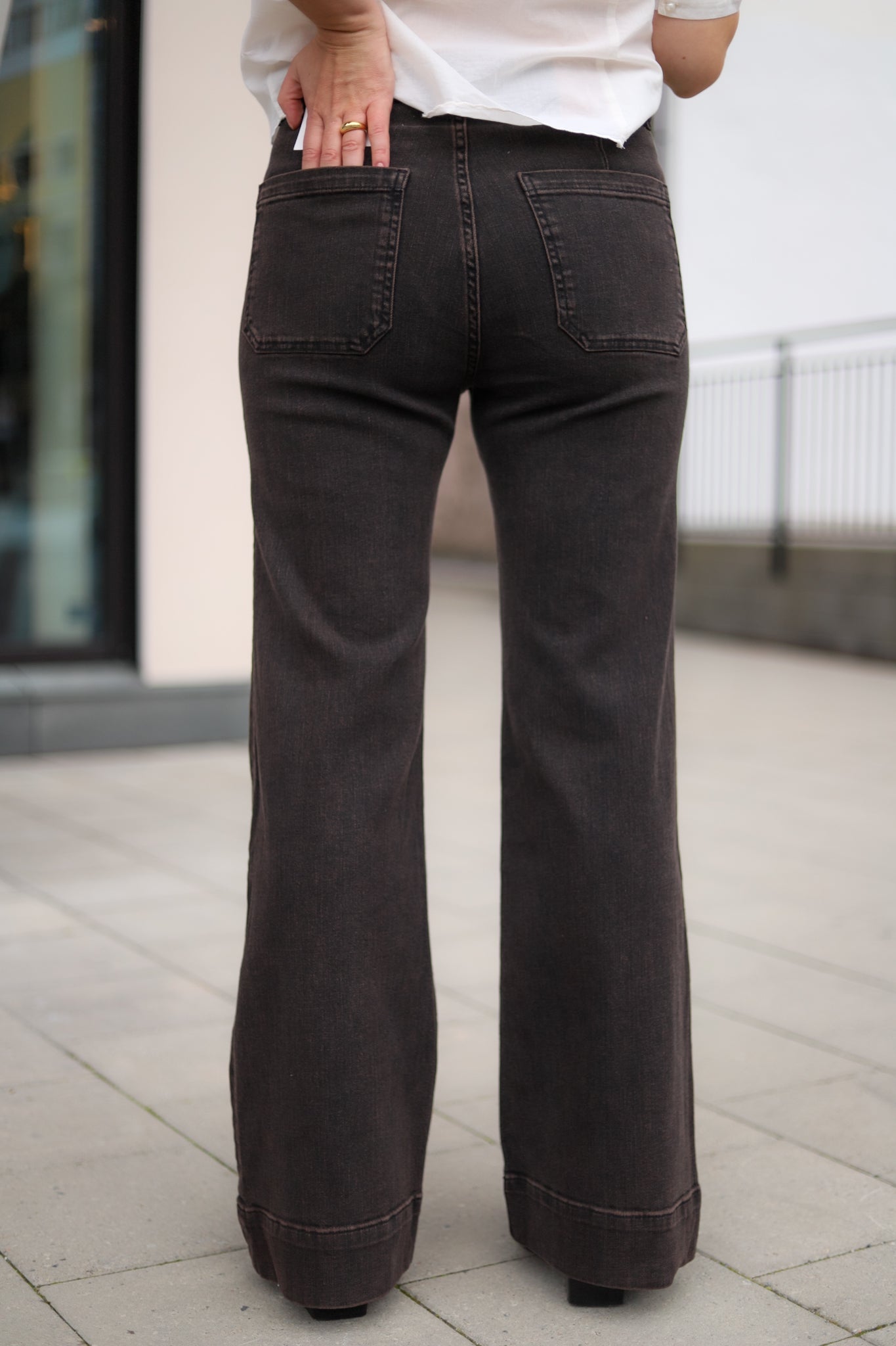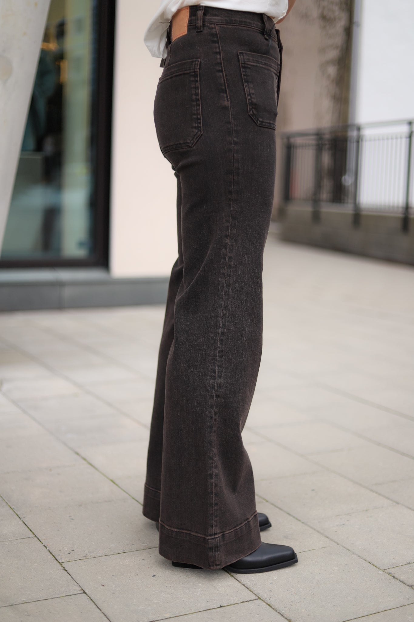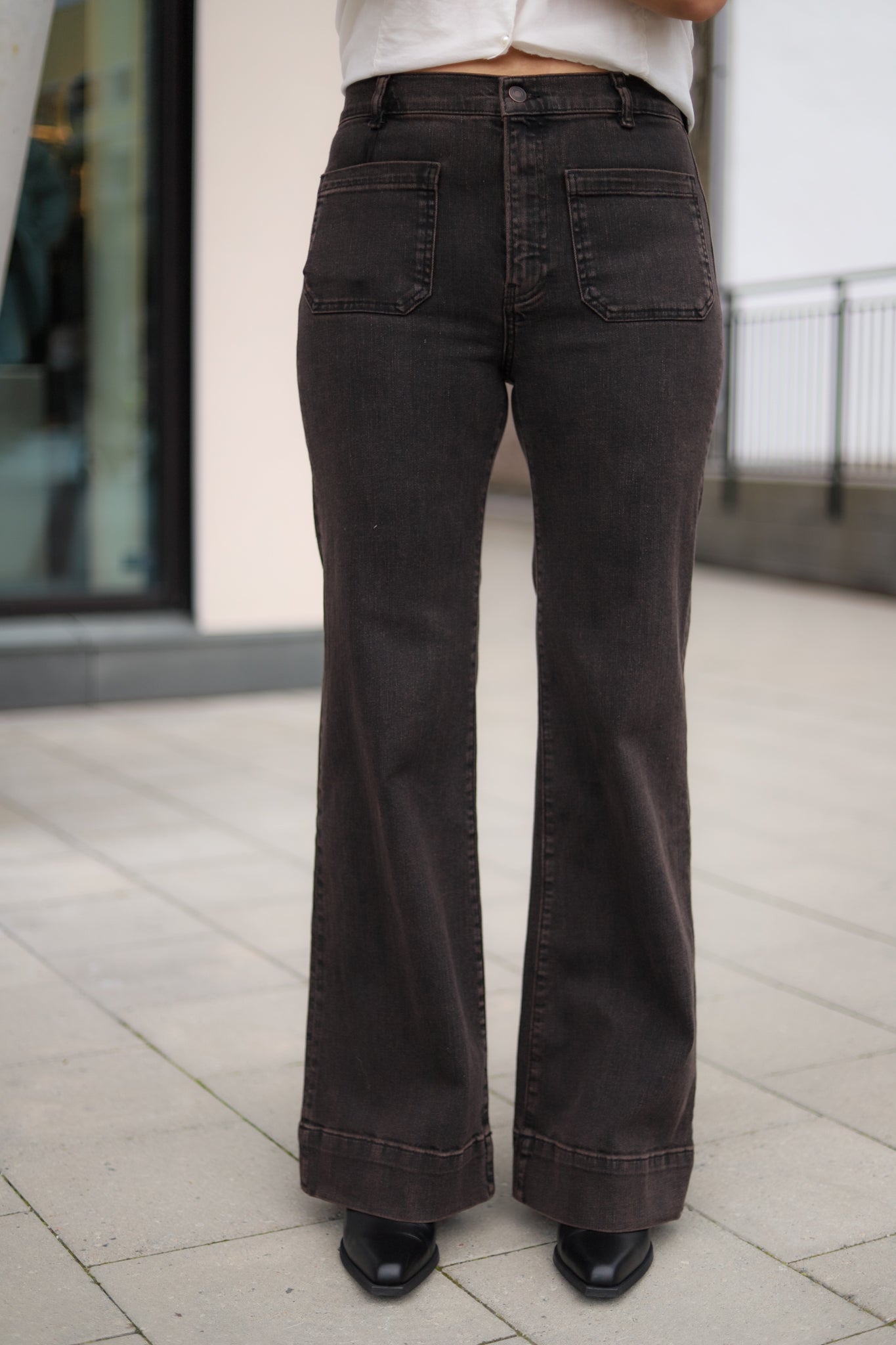 St Monica i trendy brun denim fra Jeanerica. Modellen er seiler inspirert med høyt liv, lange ben med flare og har en kul bred kant nederst. Den har 70-talls patchlommer foran og bak, linning med beltehemper, gylf med skjult glidelås og knapp. Brown Overdye er en stilig mørk brun/sort denim med mørke sømmer. En elegant og kul vask!
