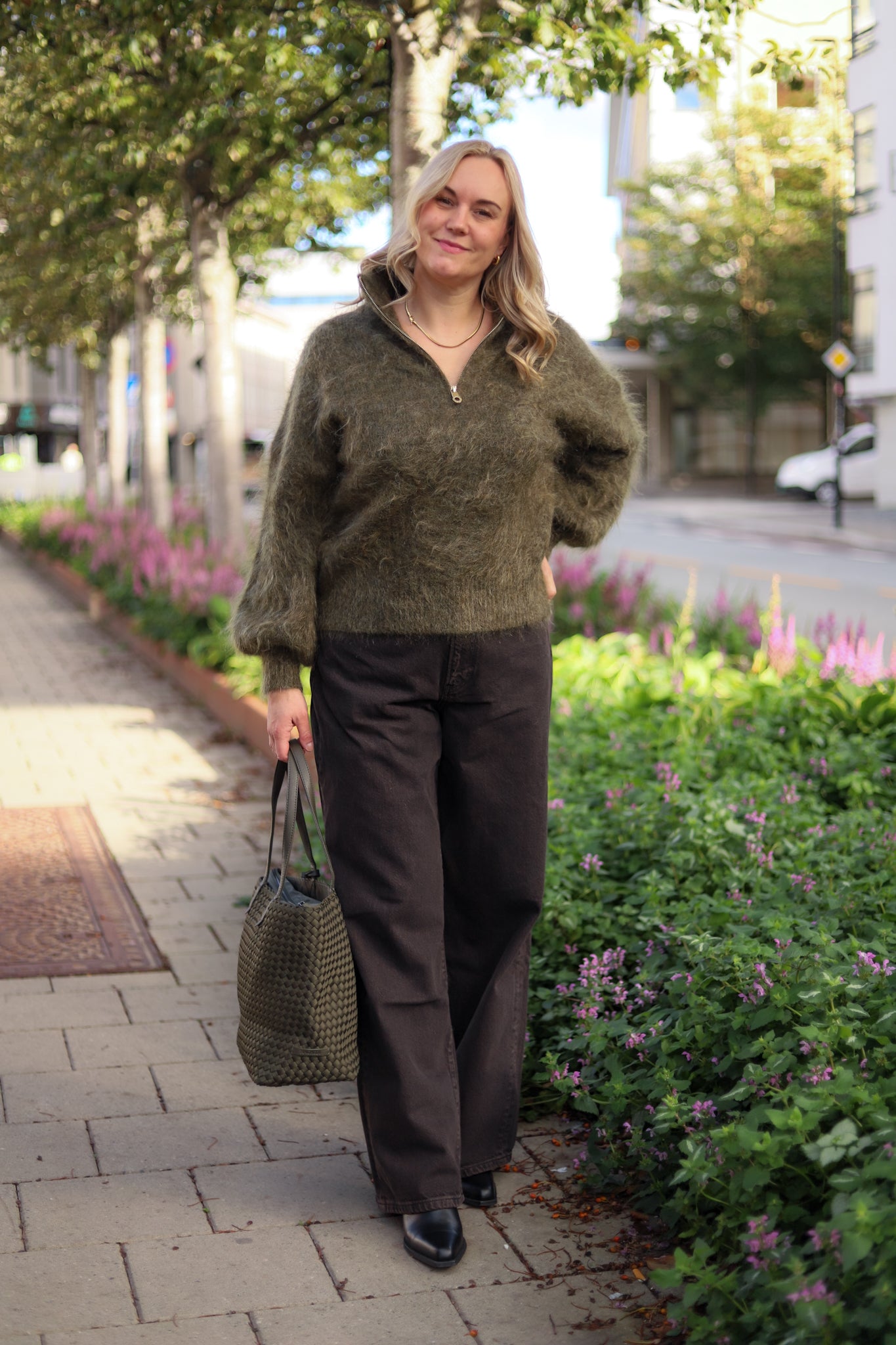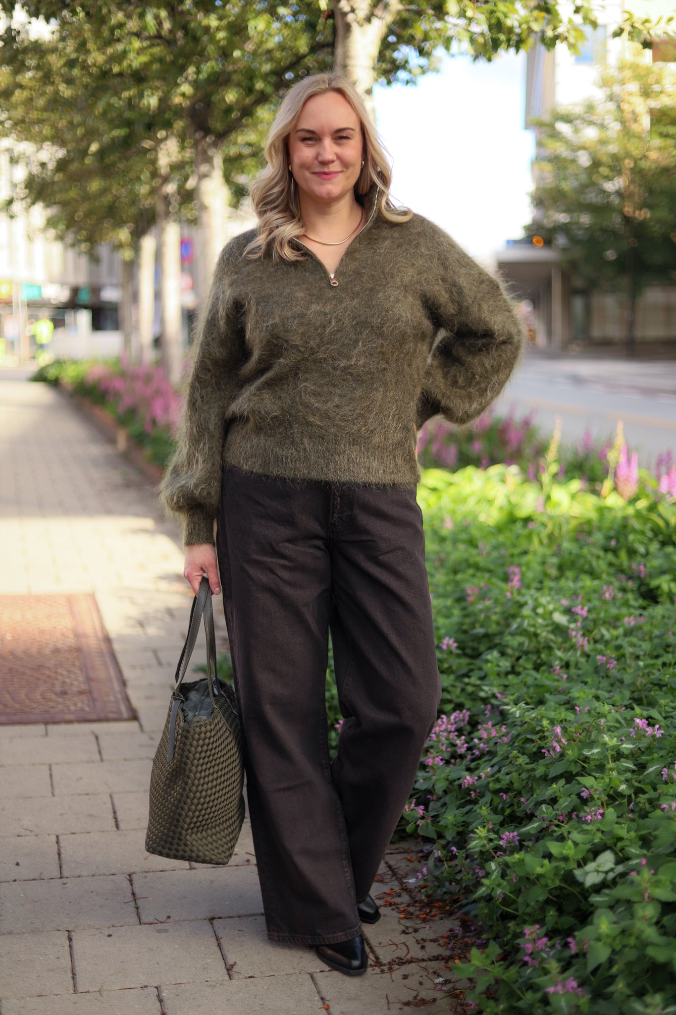 Stor på størrelsen. Her kan du size ned 1-2 størrelser, så den sitter akkurat slik du selv ønsker. Marie er 169 cm og har på seg størrelse 28/34, modellen er 175 cm og har på seg str 26/34.