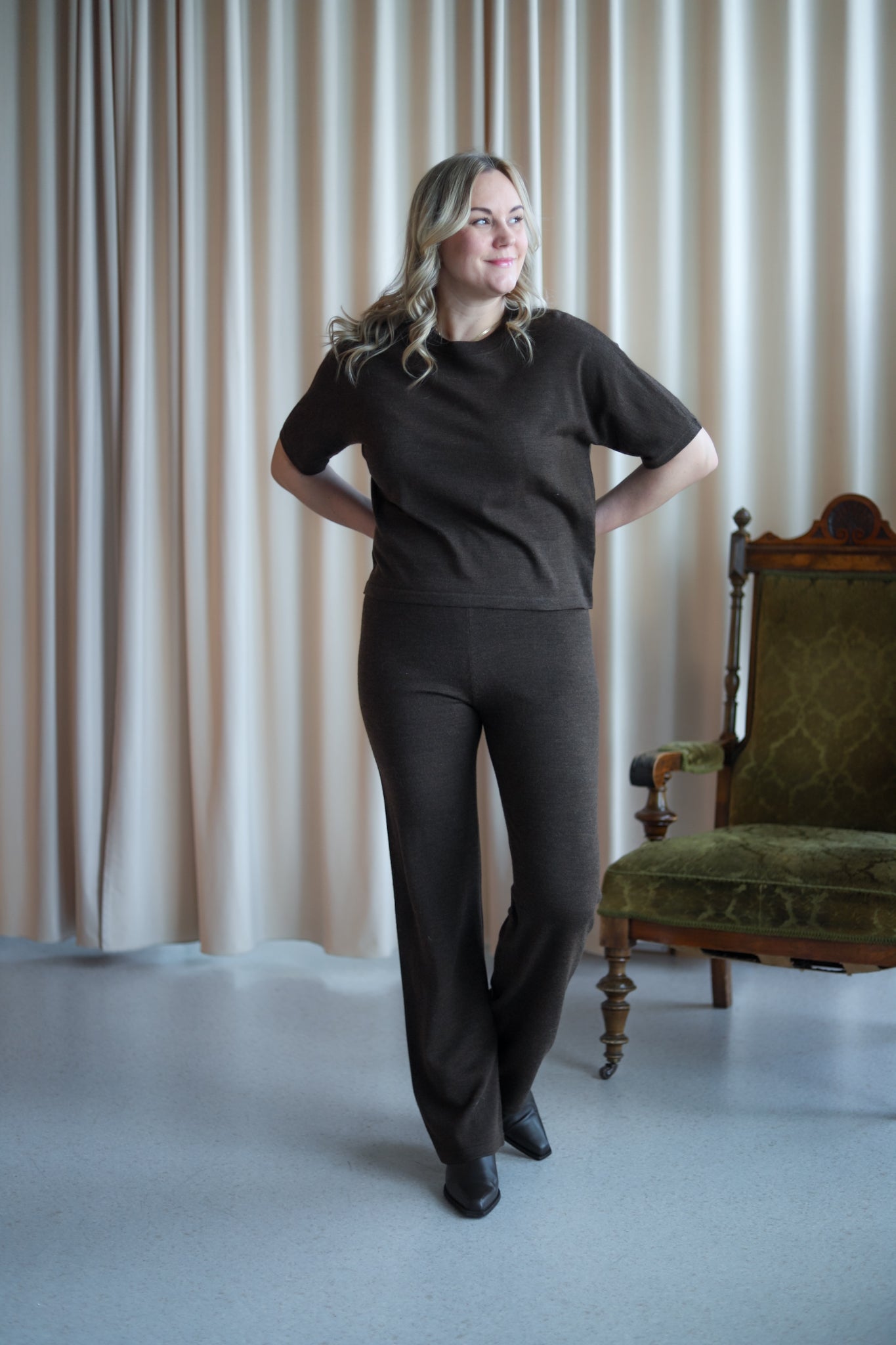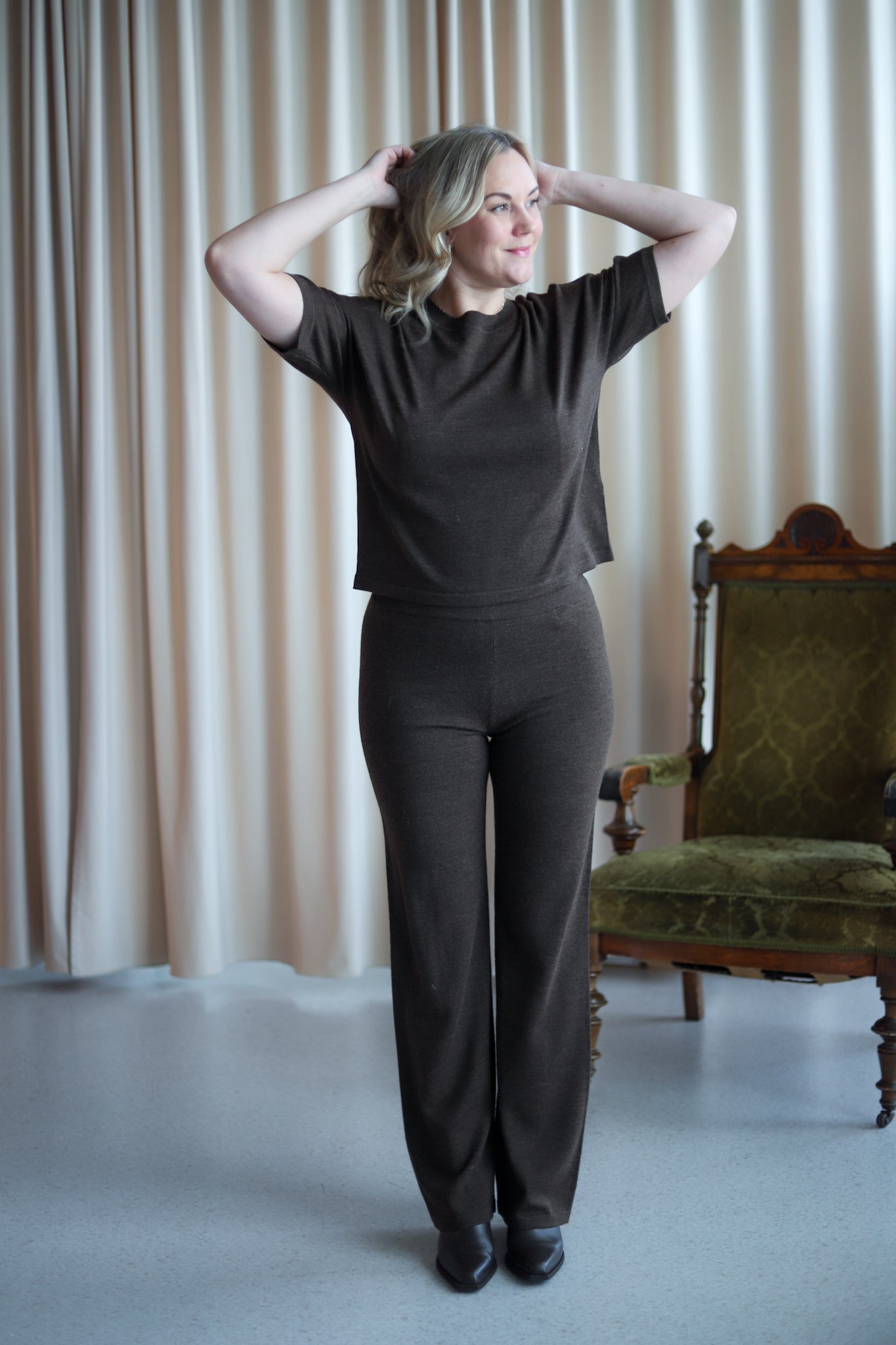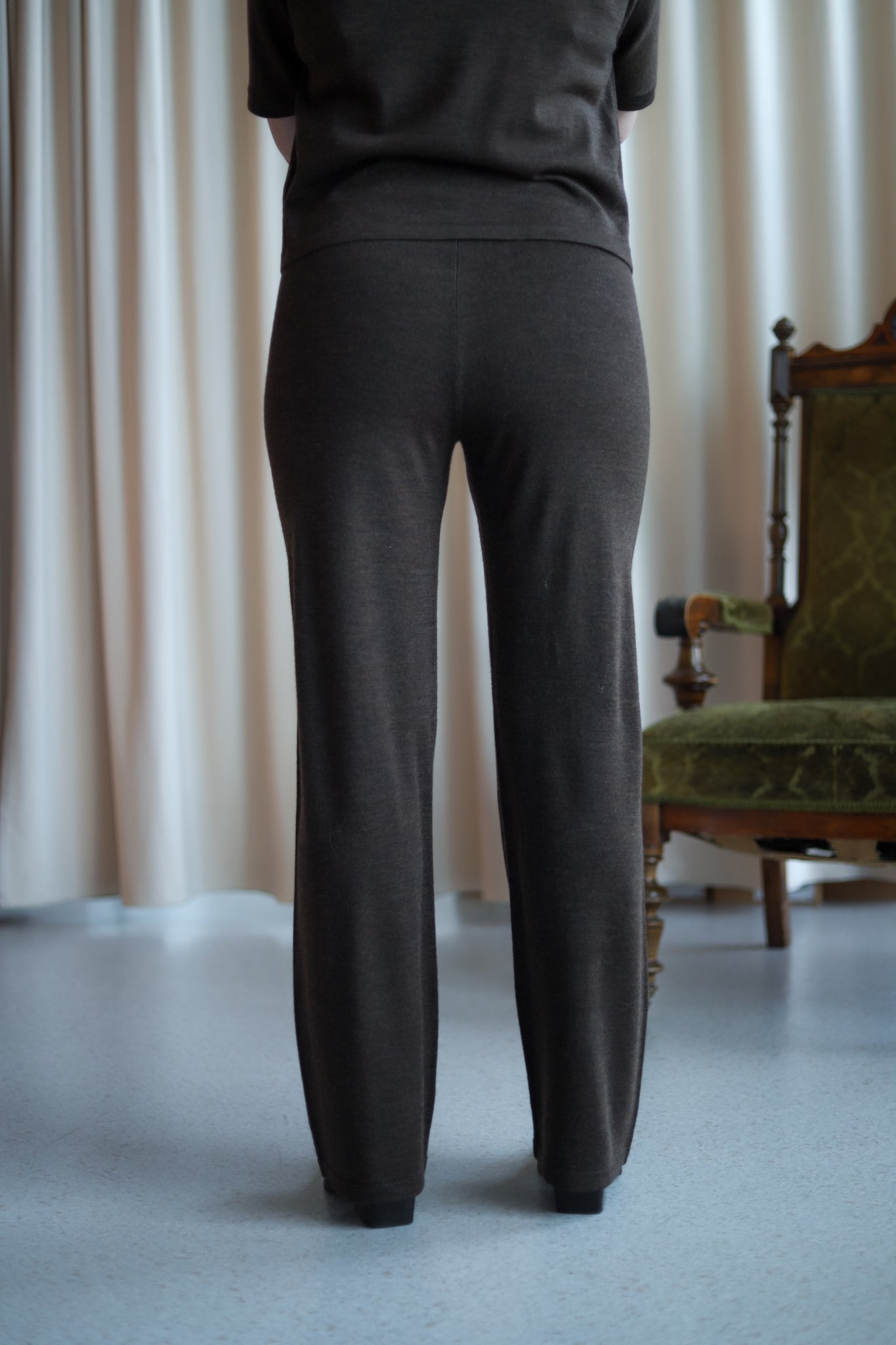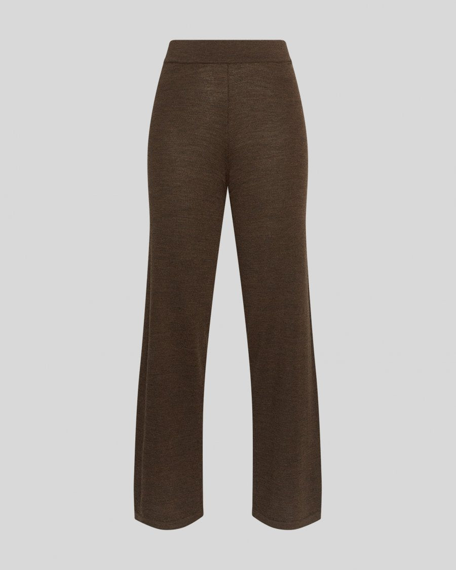 Behagelig bukse i mørk brun merinoull fra MSCH Copenhagen. Rett modell med høy midje og elastisk ribbestrikk i livet. Style med matchene topp for komplett look.