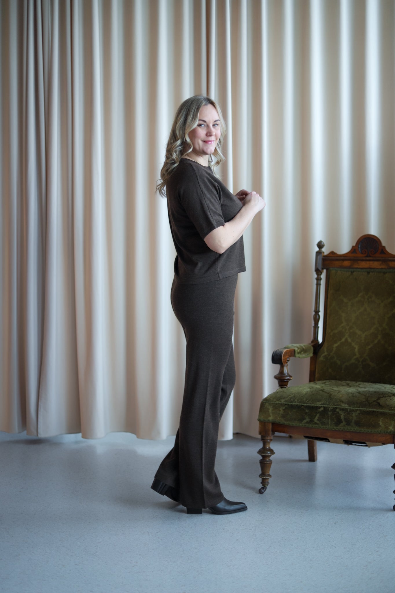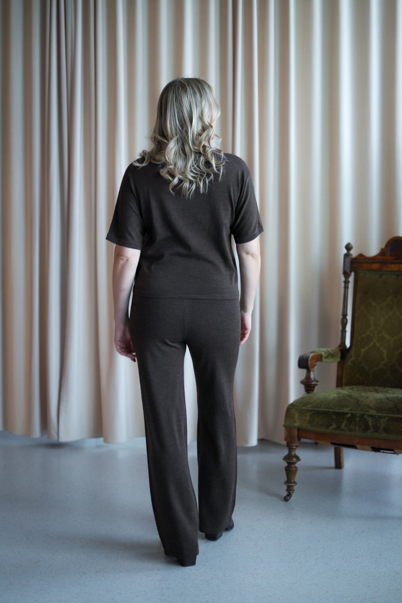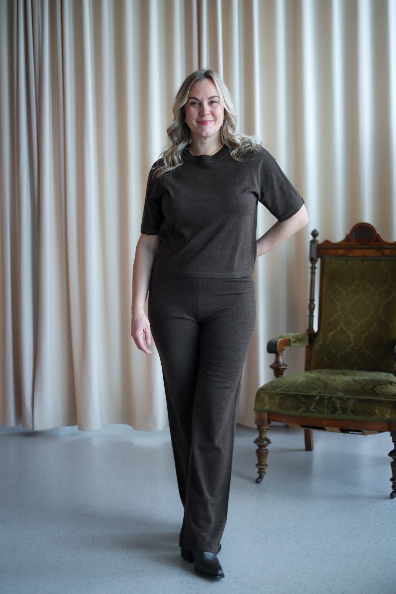 Behagelig bukse i mørk brun merinoull fra MSCH Copenhagen. Rett modell med høy midje og elastisk ribbestrikk i livet. Style med matchene topp for komplett look.