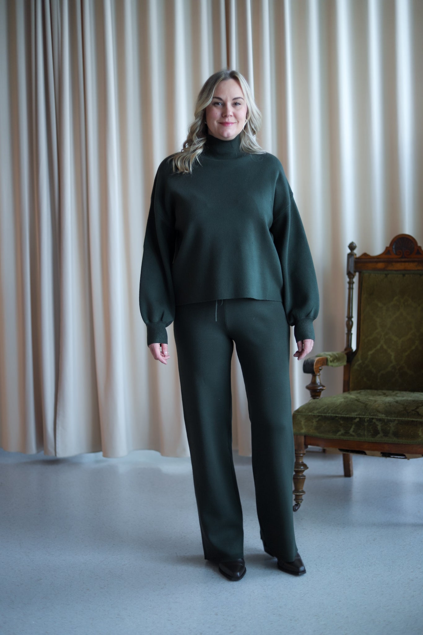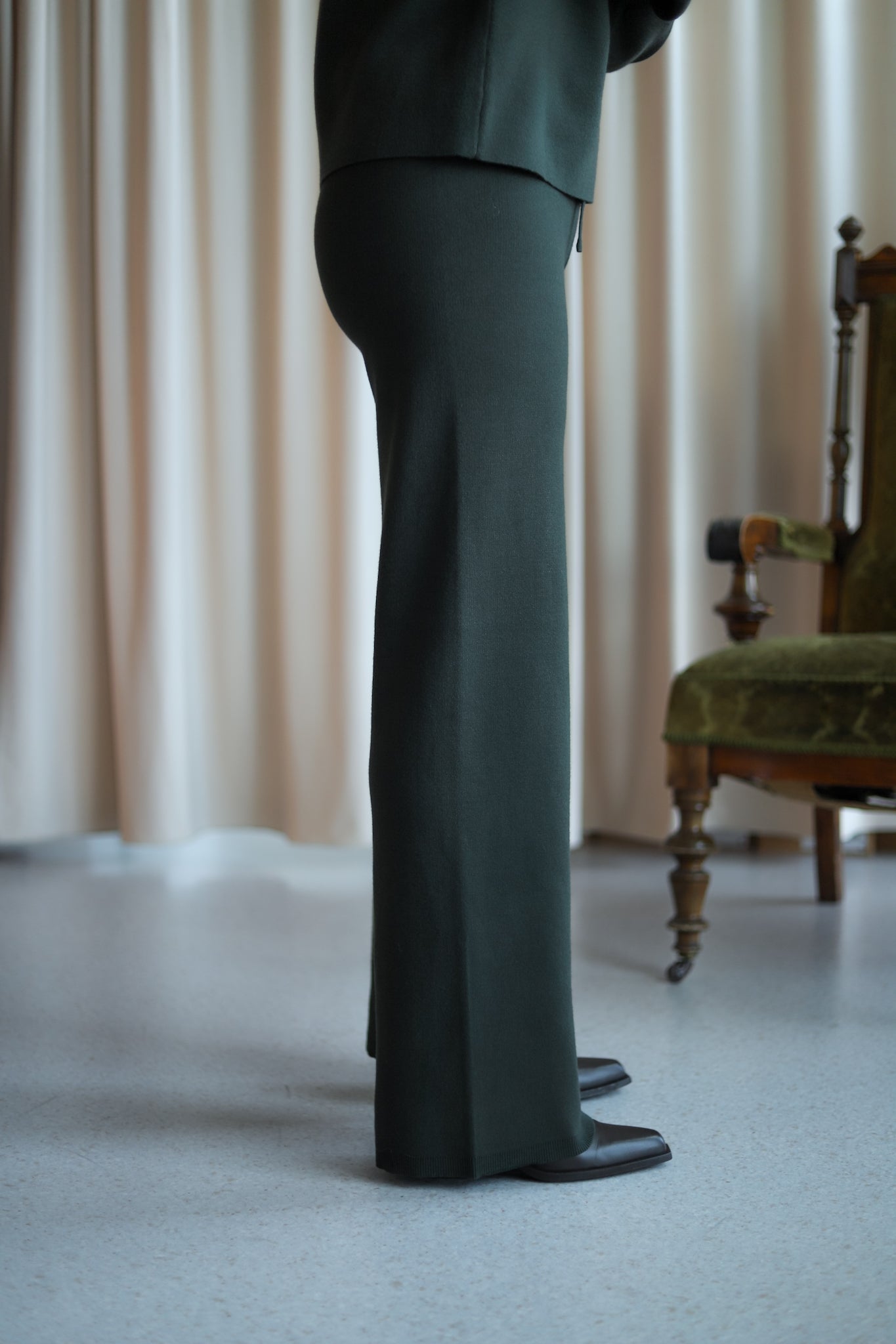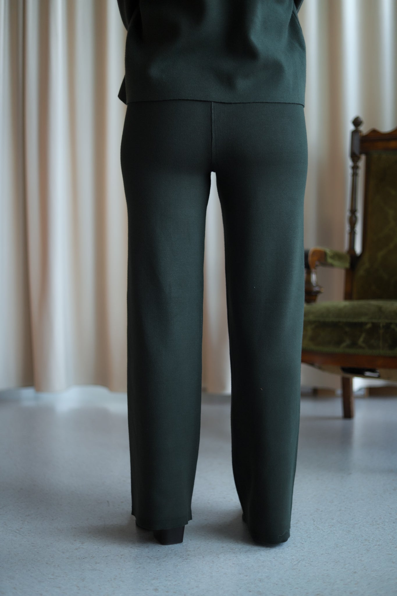 Deilig bukse i mørk grønn fra MSCH Copenhagen. Modellen er rett med lange ben og har elastisk midje med knyting. Myk og komfortabel bukse med moderne passform, style den med sesongens lekreste strikk.