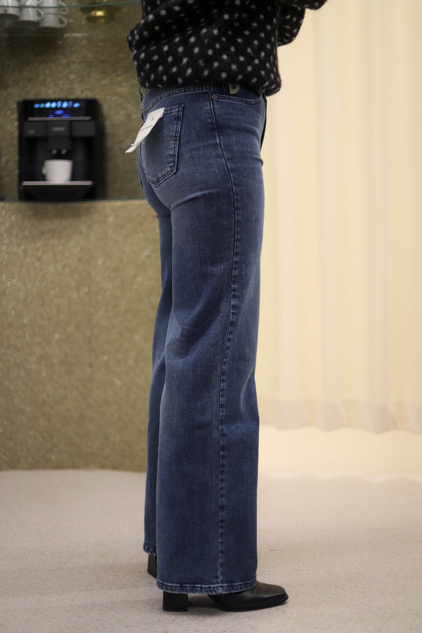 Favorittmodellen Palazzo har endelig kommet i sesongens mellomblå vask. En trendy og elegant jeans med medium livhøyde og vide ben. Buksen har klassiske 5-pocket detaljer. Linning, beltehemper, gylf med skjult glidelås og jeansknapp i front. Deilig myk og stretchy kvalitet. Buksen sitter tett rundt livet og over baken, og slipper fra hoftene. Bena er vide med full lengde. Tøff jeans til en enkel tee og loafers. Men også classy med hæler og dressjakke!