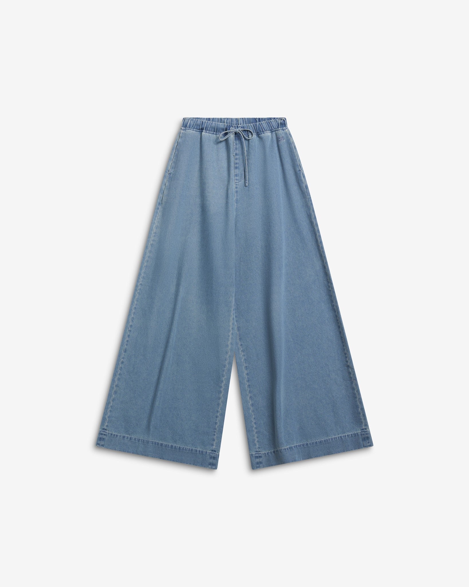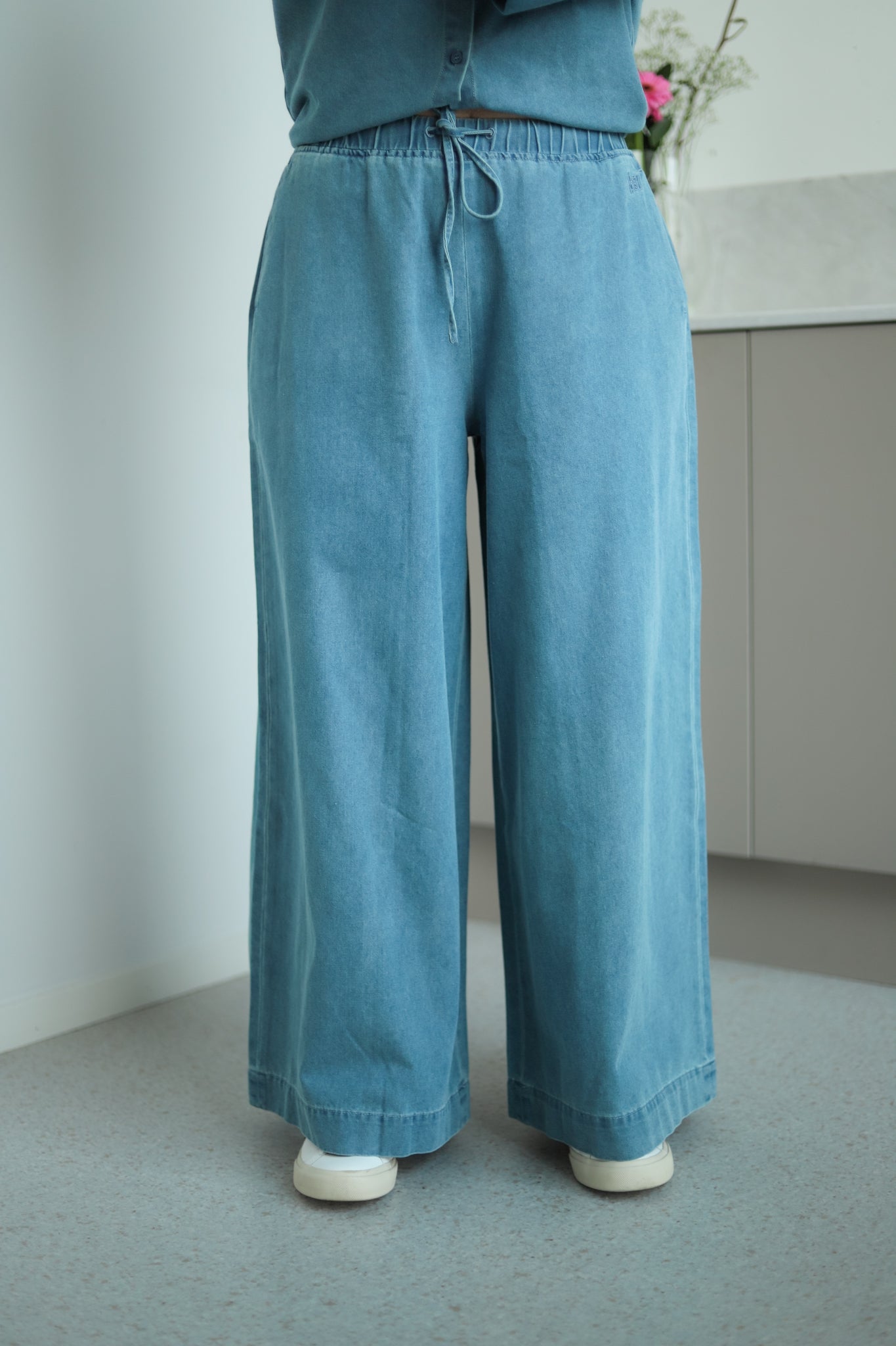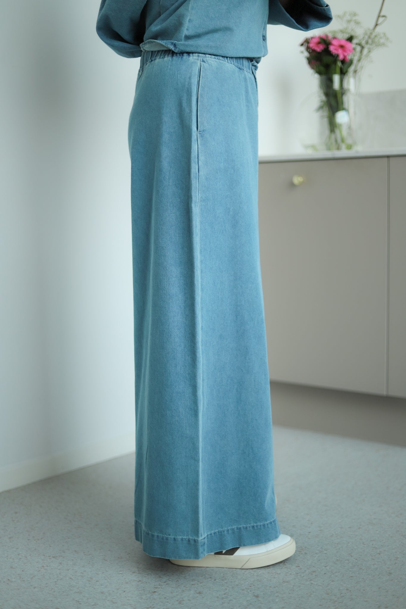Kul bukse i myk denim fra Iben. Modellen er avslappet og oversized. Den løse passformen og justerbare snøringen i midjen skaper en allsidig silhuett. Style den med matchende skjorte for komplett look.