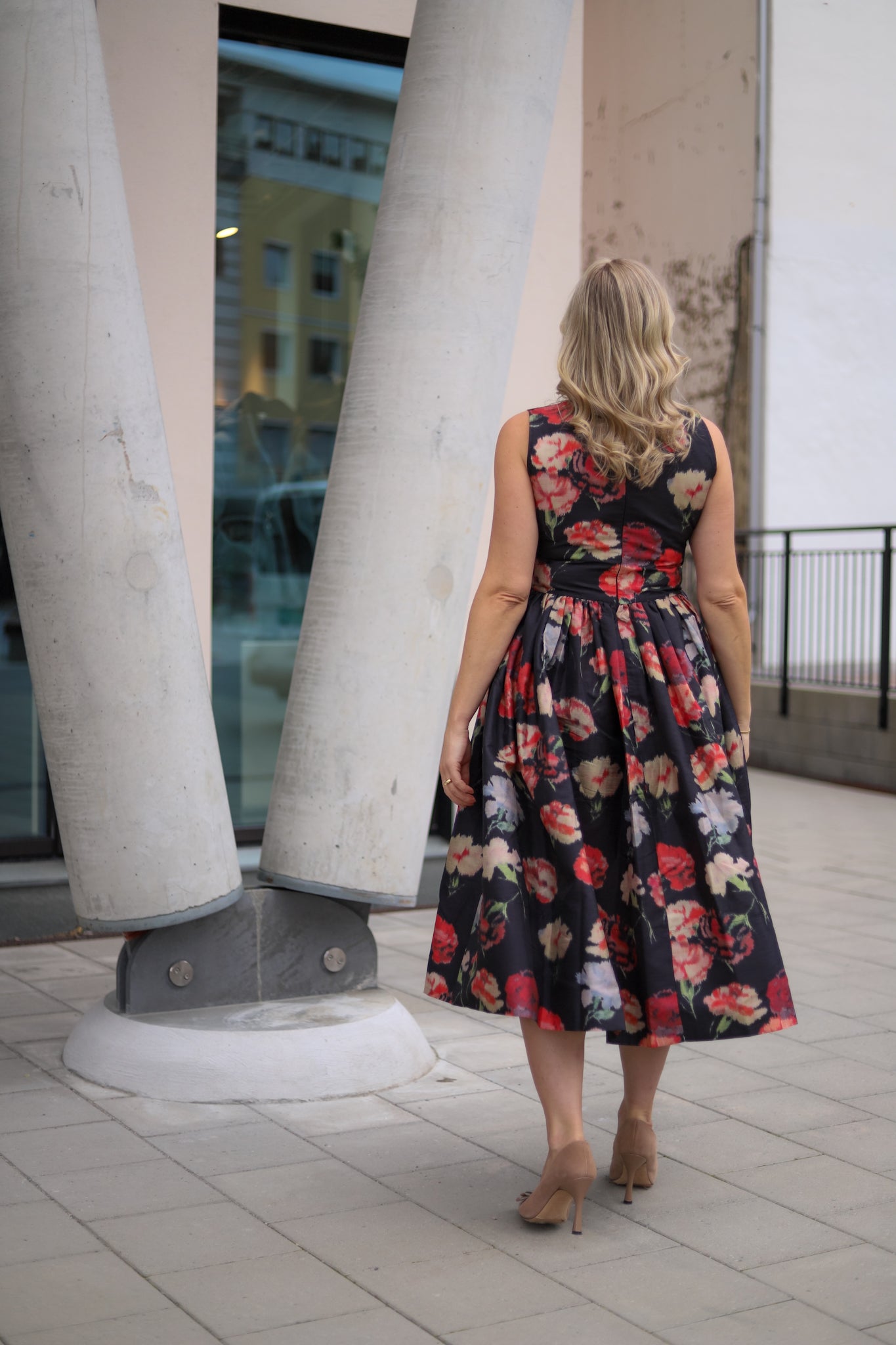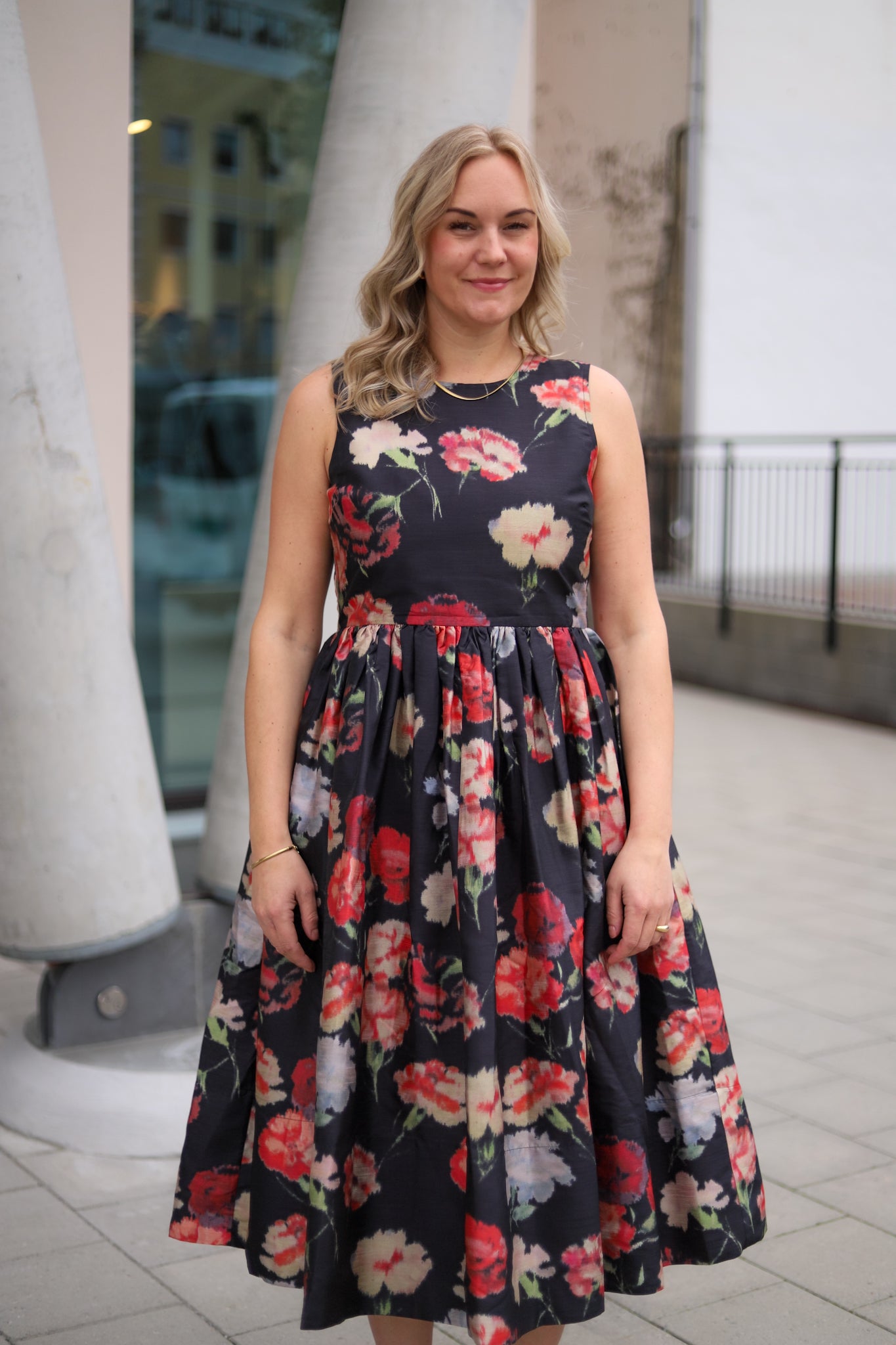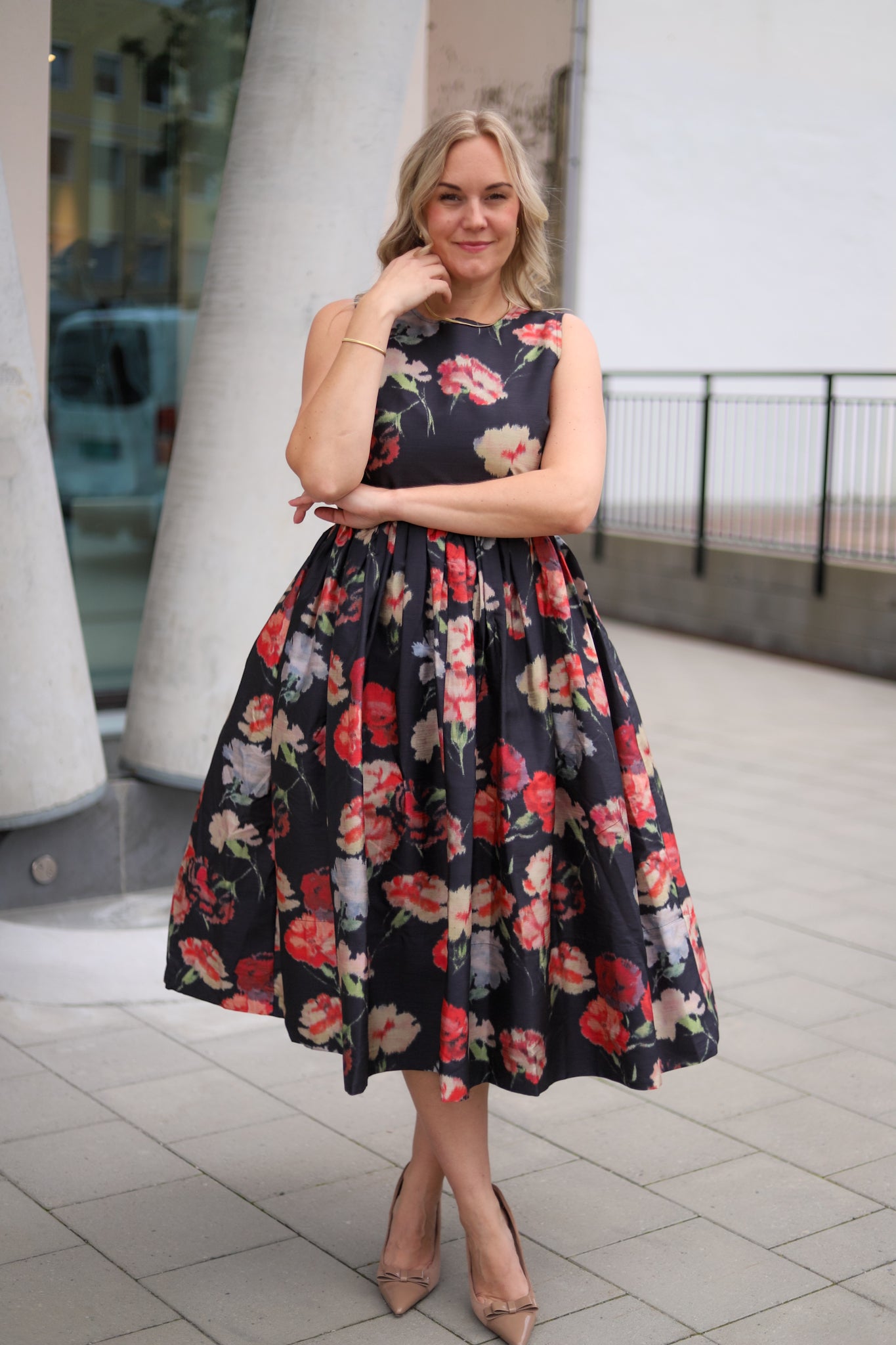 Lekker midikjole med voluminøst skjørt fra by TiMo. Sort bunn dekket av vakkert stort blomsterprint i friske toner, i en shiny, stødig og strukturert kvalitet. Modellen er ermløs med rund hals og lukkning med glidelås i ryggen. Den sitter nett i overkroppen og har markert midje. Skjørtet har flotte draperinger fra midjen som gir volum og kontrast. Lengden stopper øverst på leggen og kjolen har behagelige lommer i sidesømmen. Drømmekjole til alle penere anledninger!