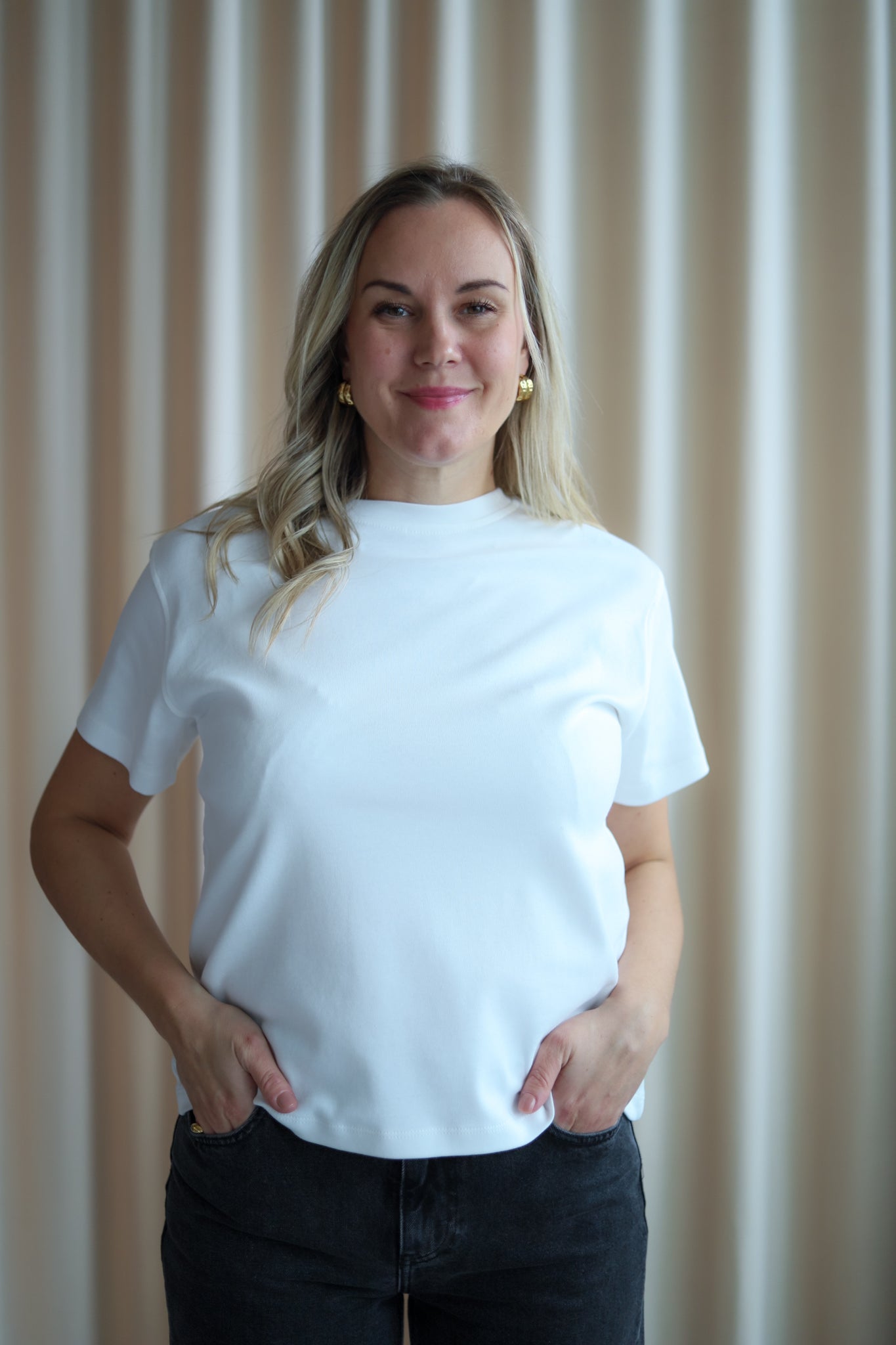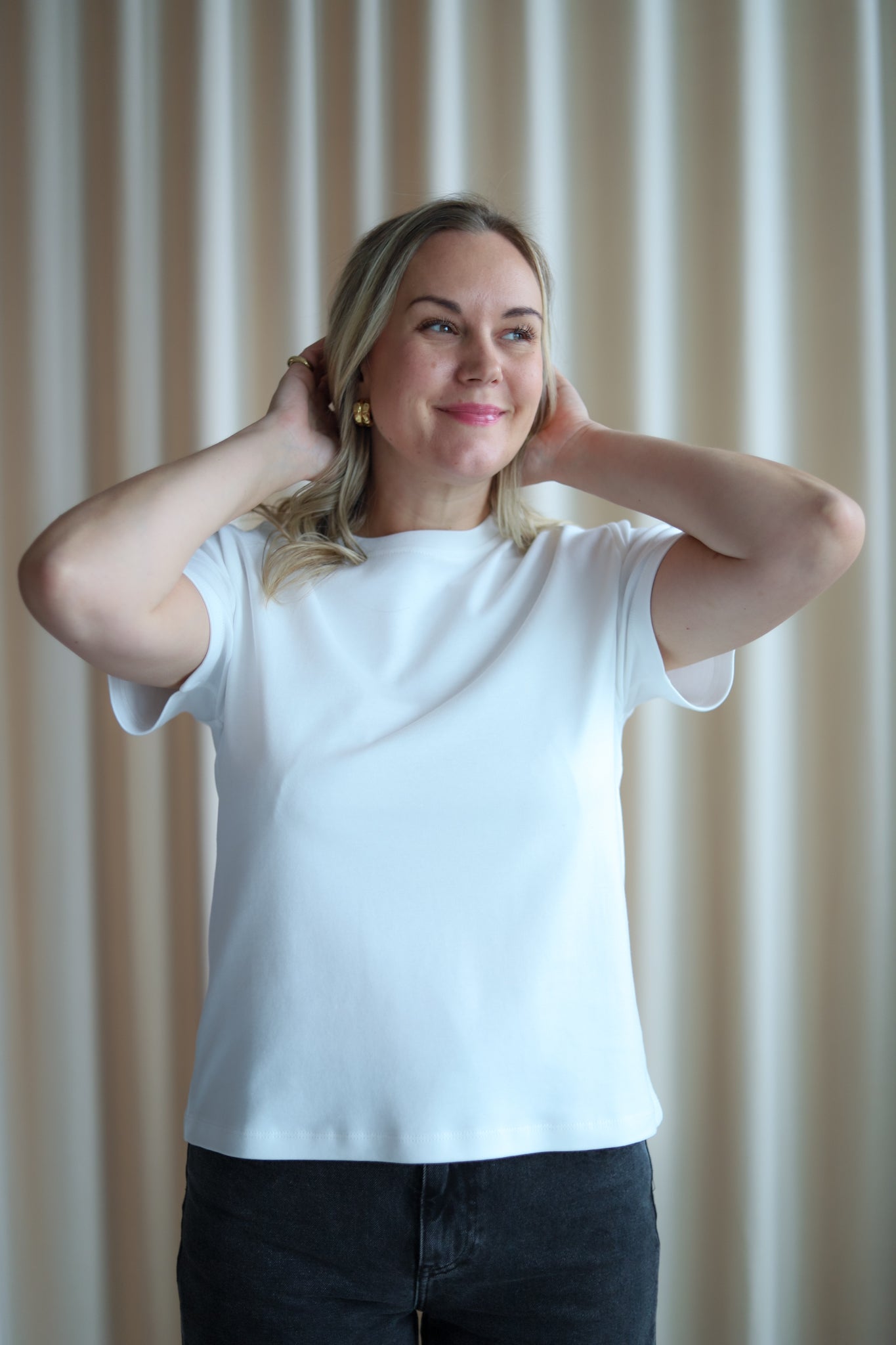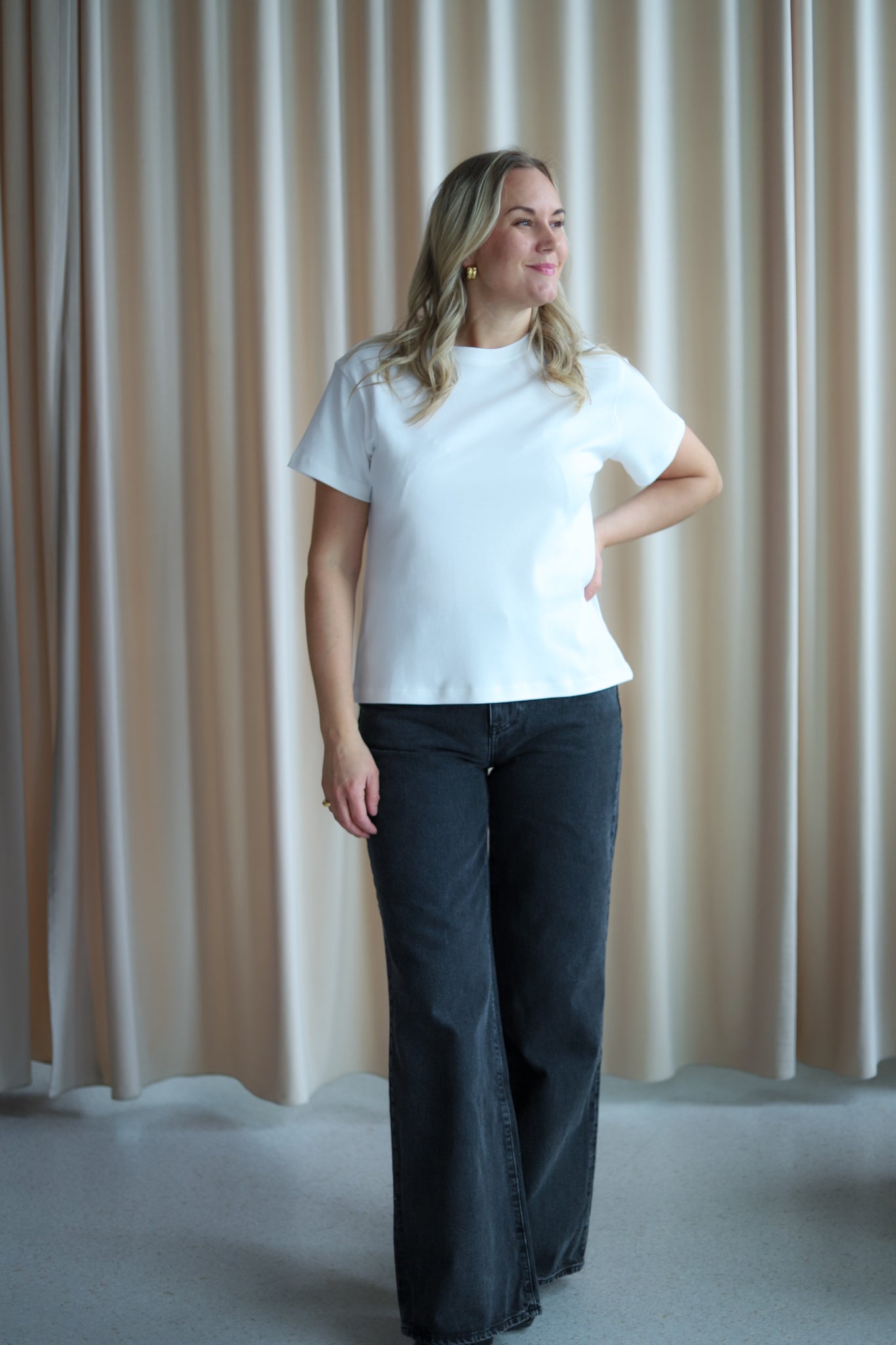 Klassisk t-shirt i bomull fra Camilla Pihl Denim. Deilig myk kvalitet i delikat off-white farge. Regulær modell med rund hals, nette ermer og pen hoftelengde. Perfekt basic i basegarderoben!