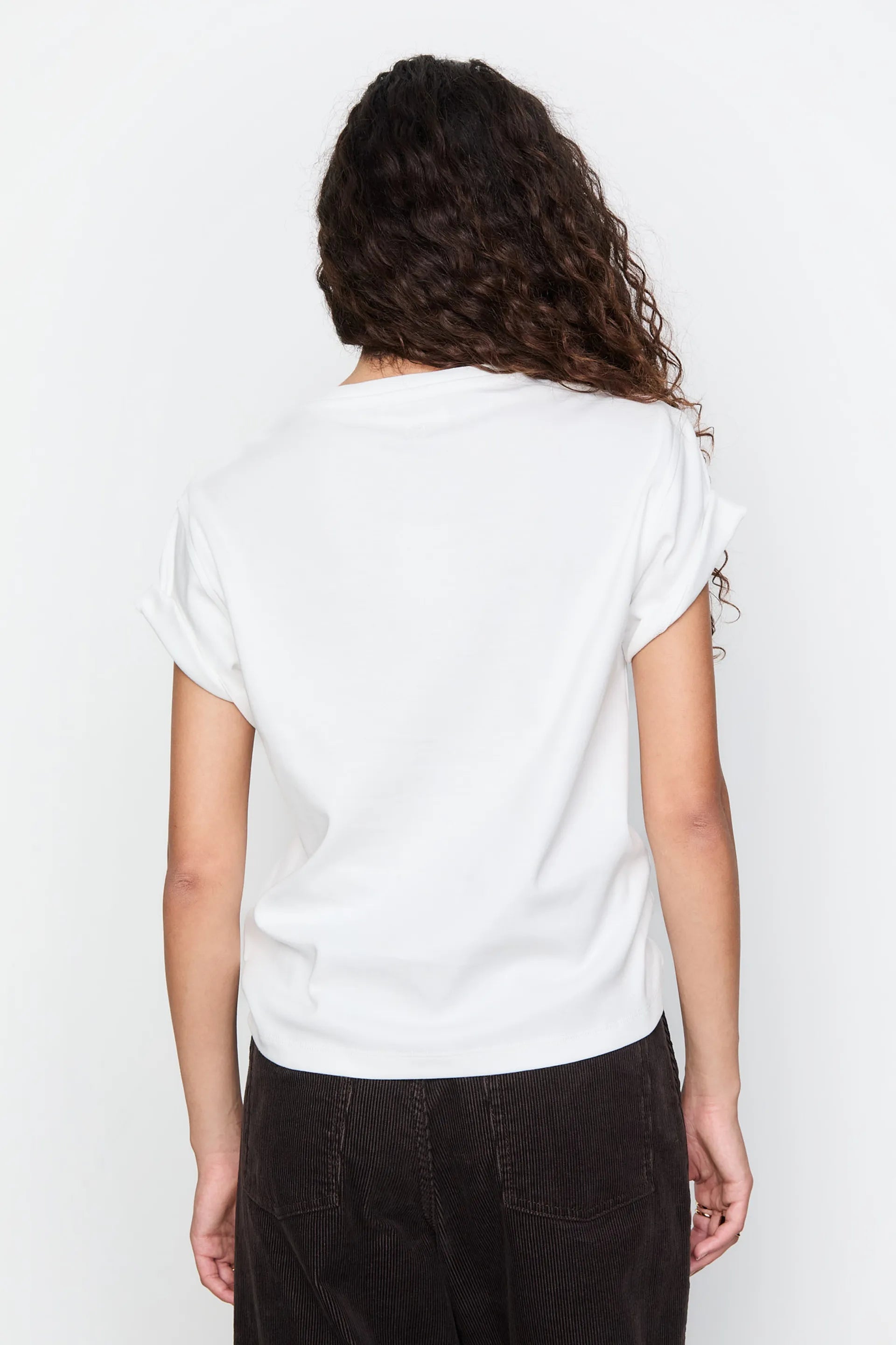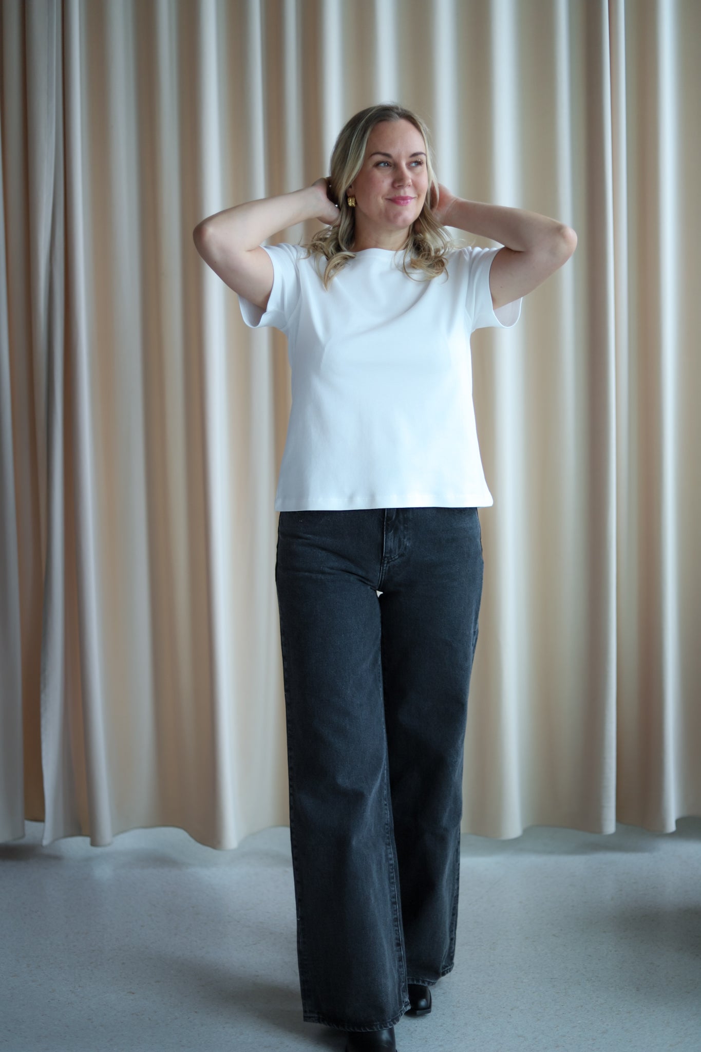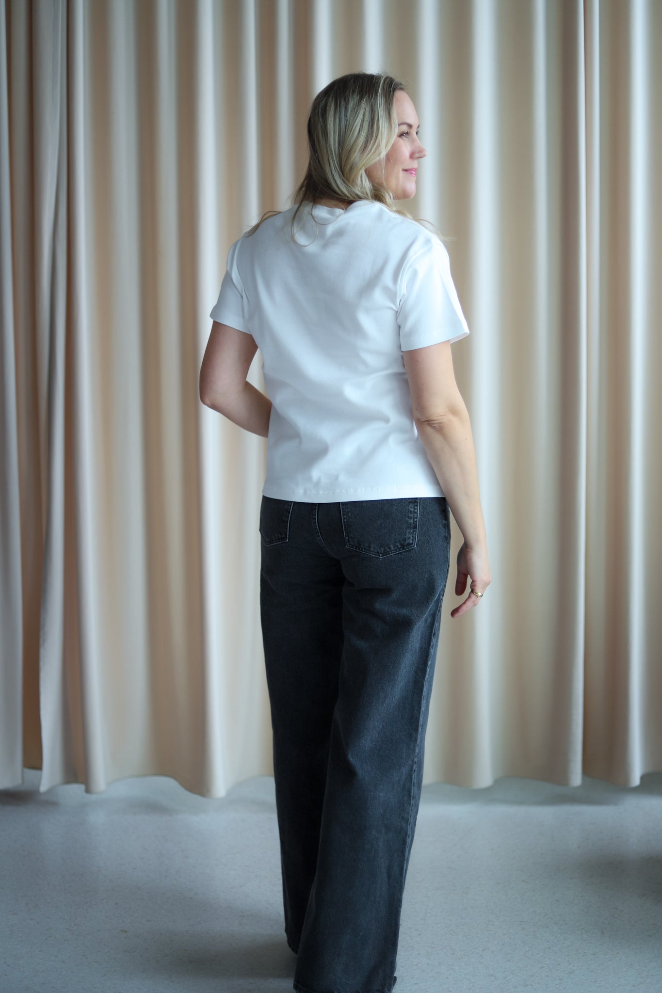 Klassisk t-shirt i bomull fra Camilla Pihl Denim. Deilig myk kvalitet i delikat off-white farge. Regulær modell med rund hals, nette ermer og pen hoftelengde. Perfekt basic i basegarderoben!