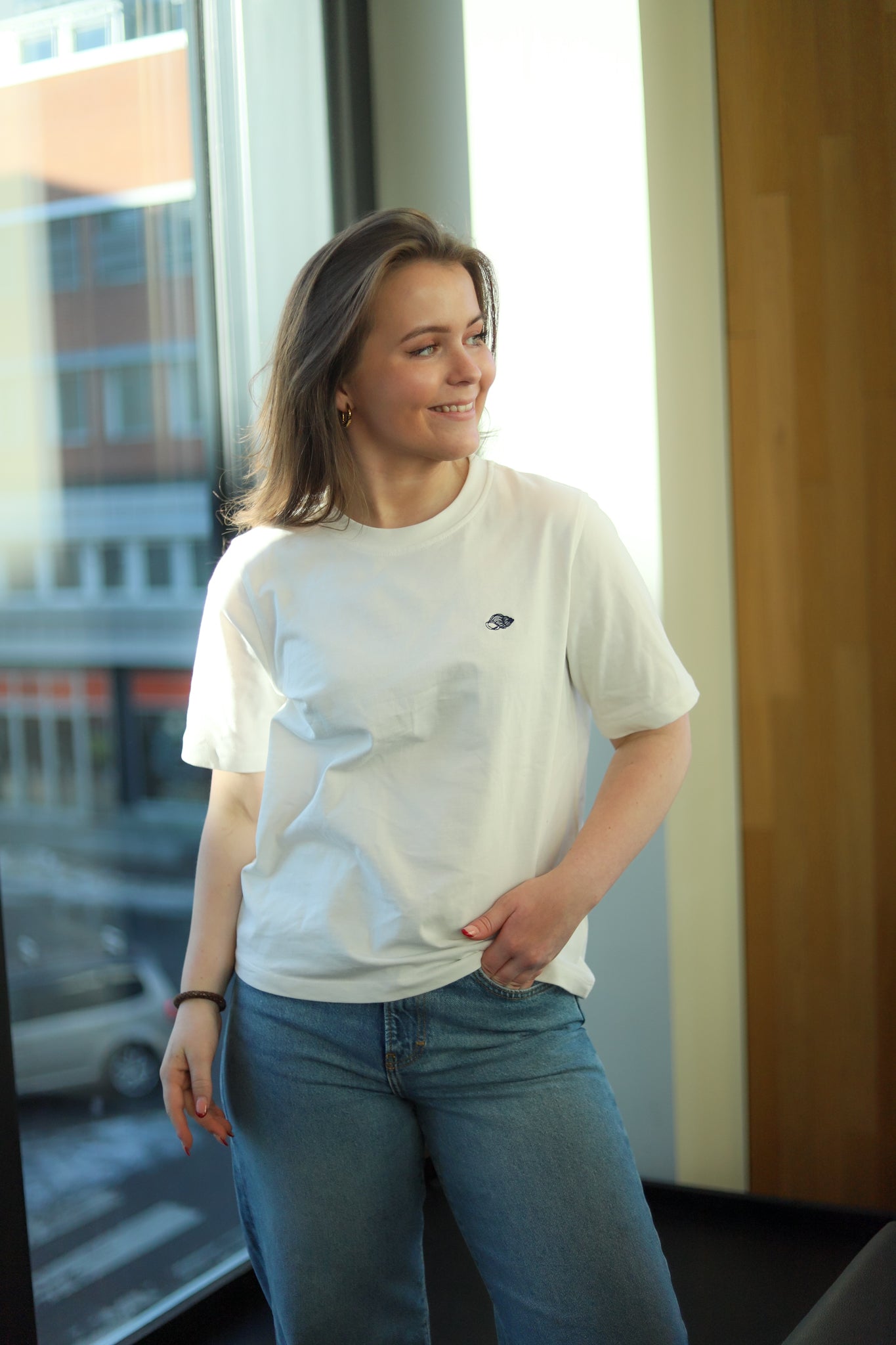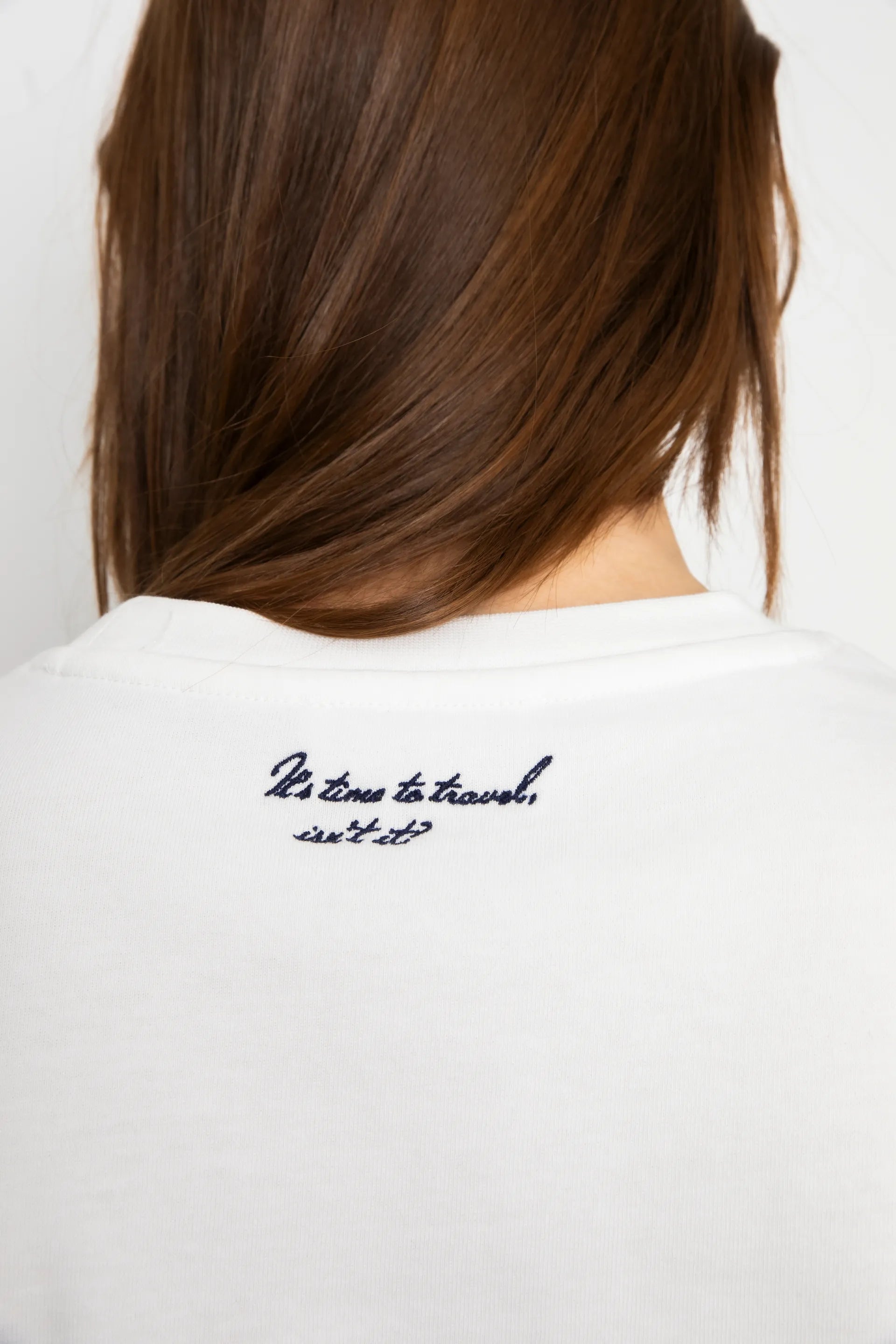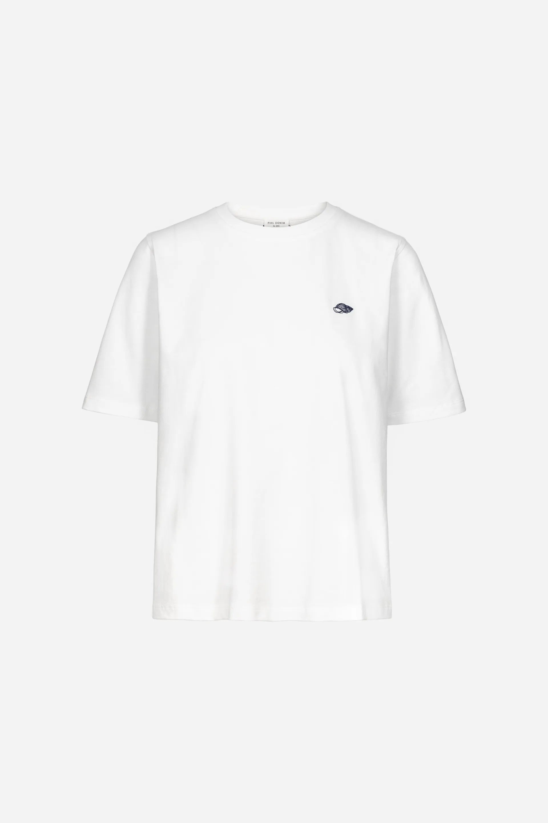 Perfekt tee i offwhite med slogan fra Camilla Pihl. T-skjorten er behagelig myk og har en regulær rett passform. Den har ribb i hals, nette ermer og pen hoftelengde. Dekorativt skjell brodert på brystet og tekst i nakken. En søt base til sesongens garderobe.