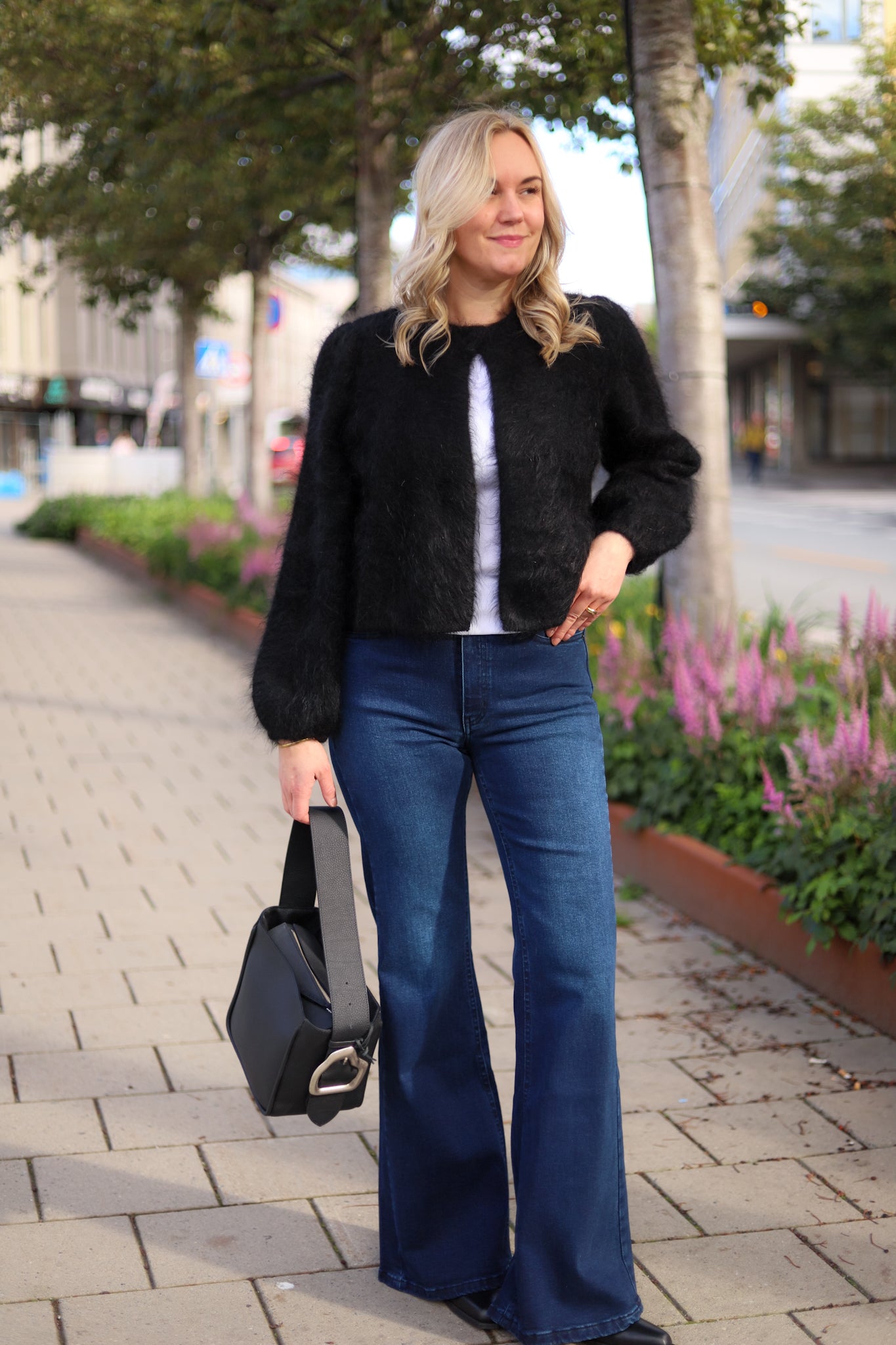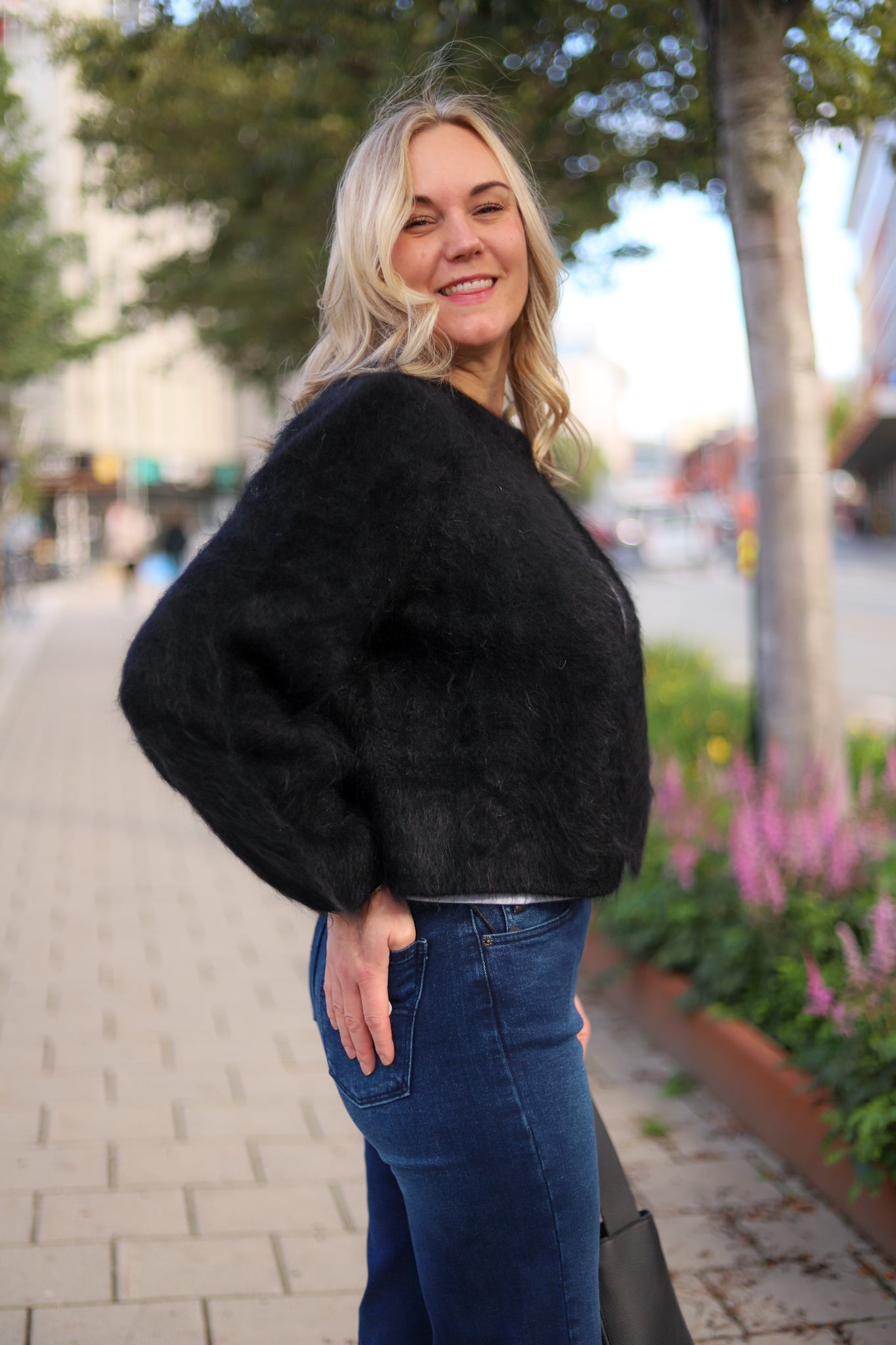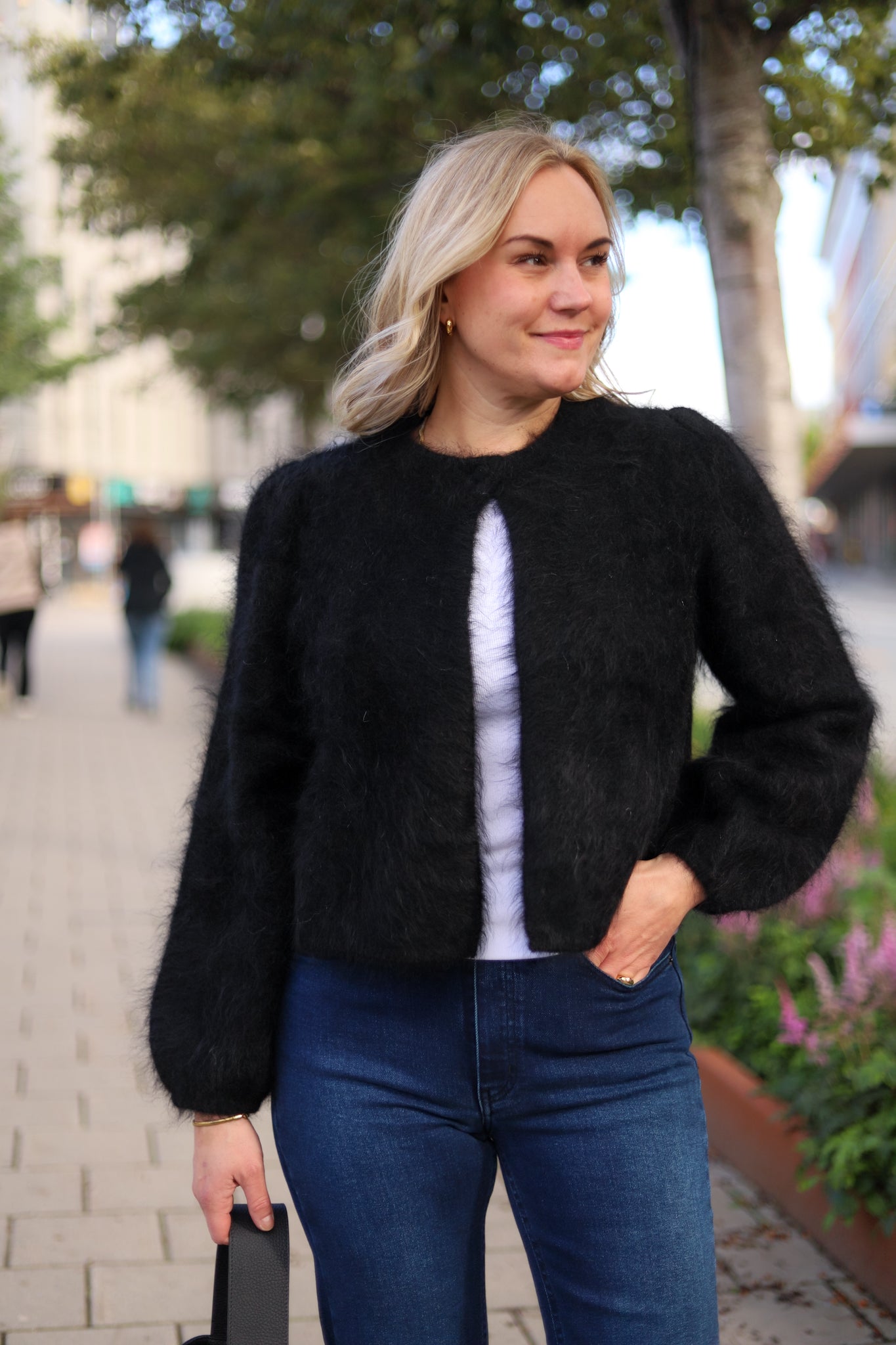 Nydelig cardigan i klassisk sort bøstet kvalitet fra Ella&il. Modellen er rett med rund hals og en liten knapp øverst i front. Lange ballongermer med puff i skuldre som smalner inn i mansjett. En søt cardigan i herlig kvalitet som er like fin over kjoler som til jeans.