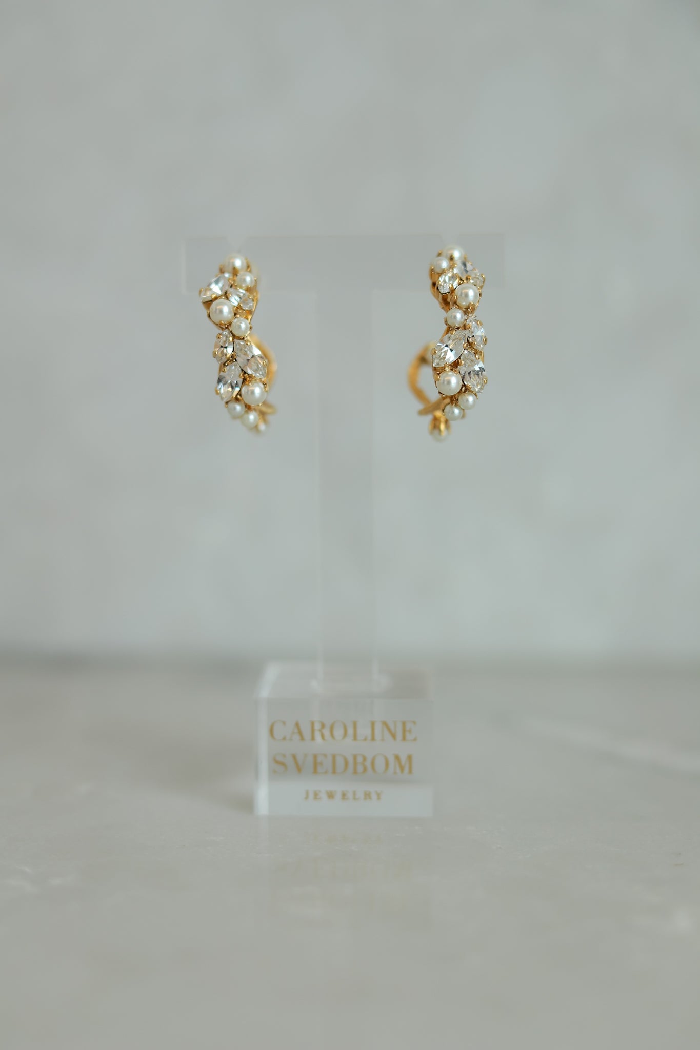 Stella er vakre øreringer dandert med små Swarovski-krystaller og perler i ulike størrelser og former. Her i blanke Swarovski-stener. Stift og bakside i forgyllt rhodium.