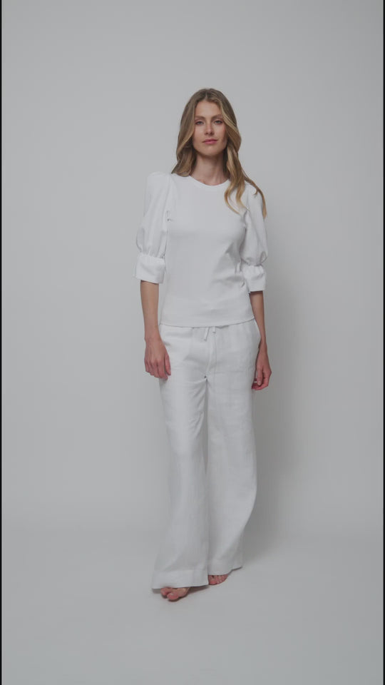 Deilig linbukse i tidløs sort fra ella&il. Modellen har høyt liv med bred strikk, snøring og stikklommer i sidesømmen. Den har rette vide ben med full lengde. Perfekt bukse i myk og lett kvalitet som er både behagelig og elegant!