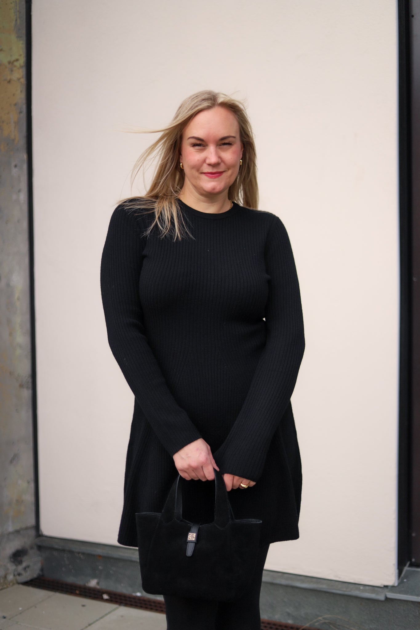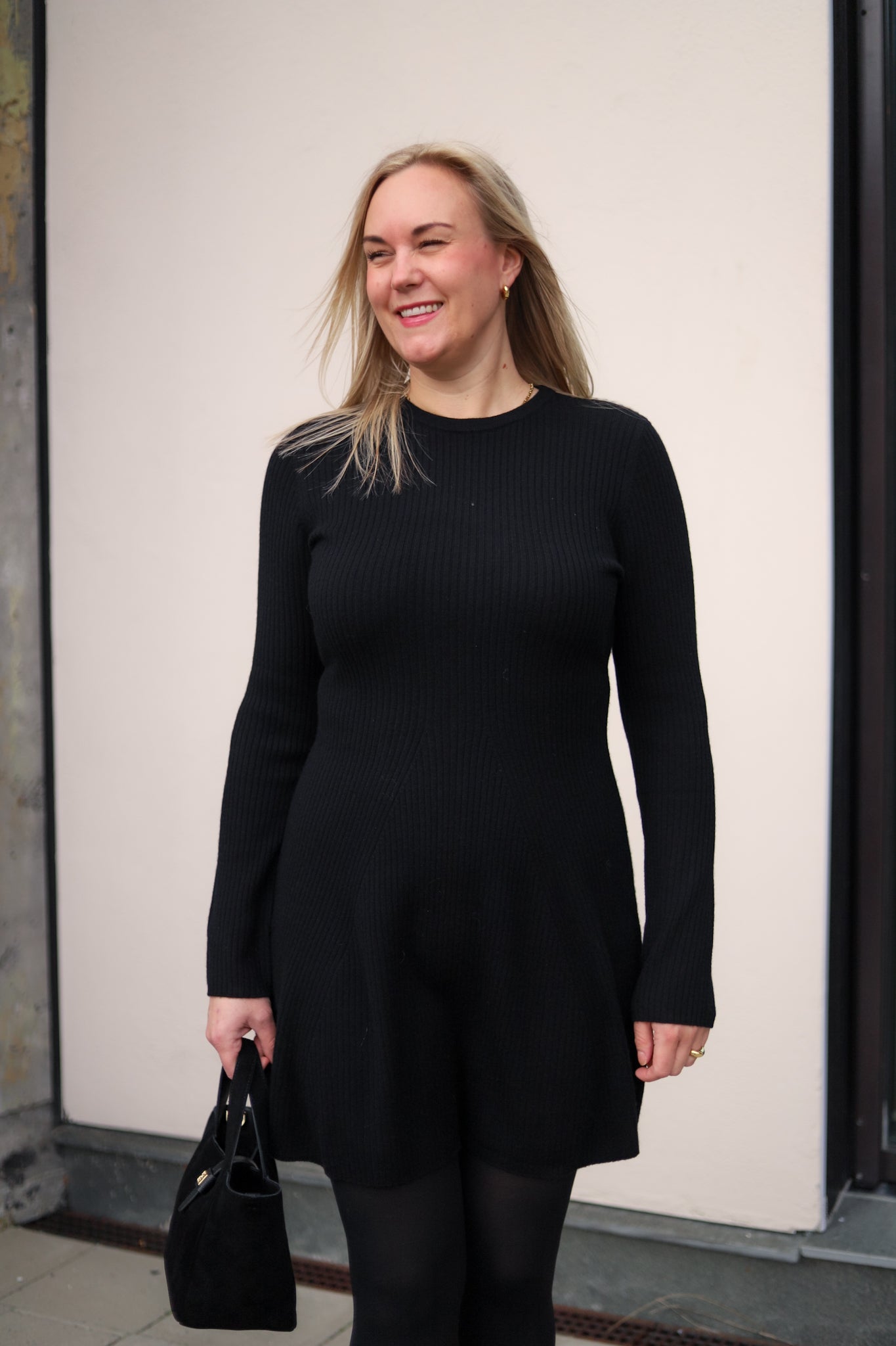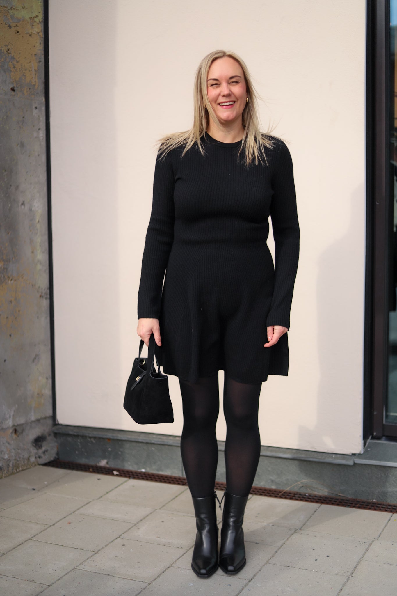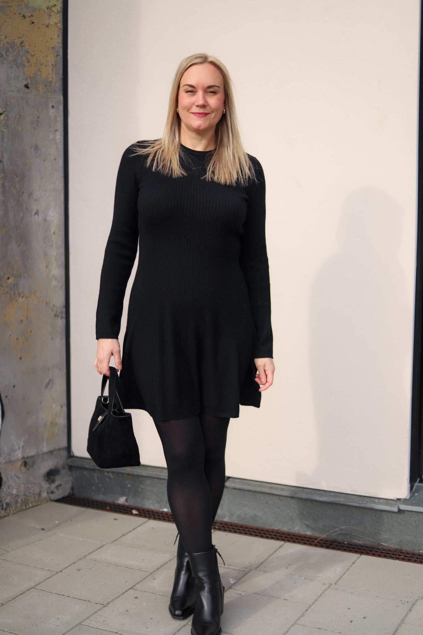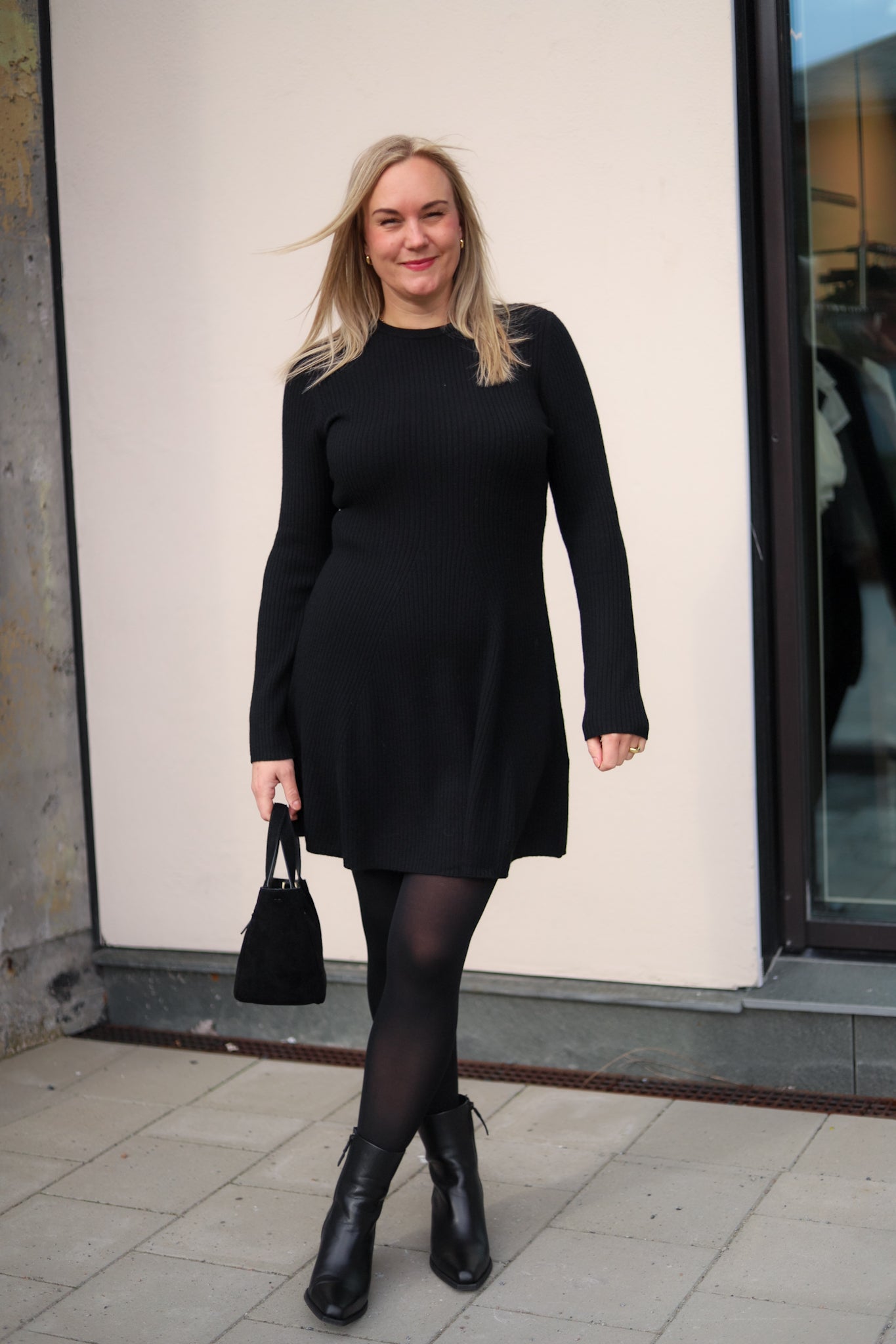 Minikjole i klassisk sort fra Christian Aks. Modellen er tettsittende med lengde til midt på låret, rund hals og lange smale ermer. Skjørtet skrår lett ut med lengde til midt på låret. Kjolen er i elastisk ribbestrikk med 100% varm og god merinoull. Et sikkerstrikk i basegarderoben.