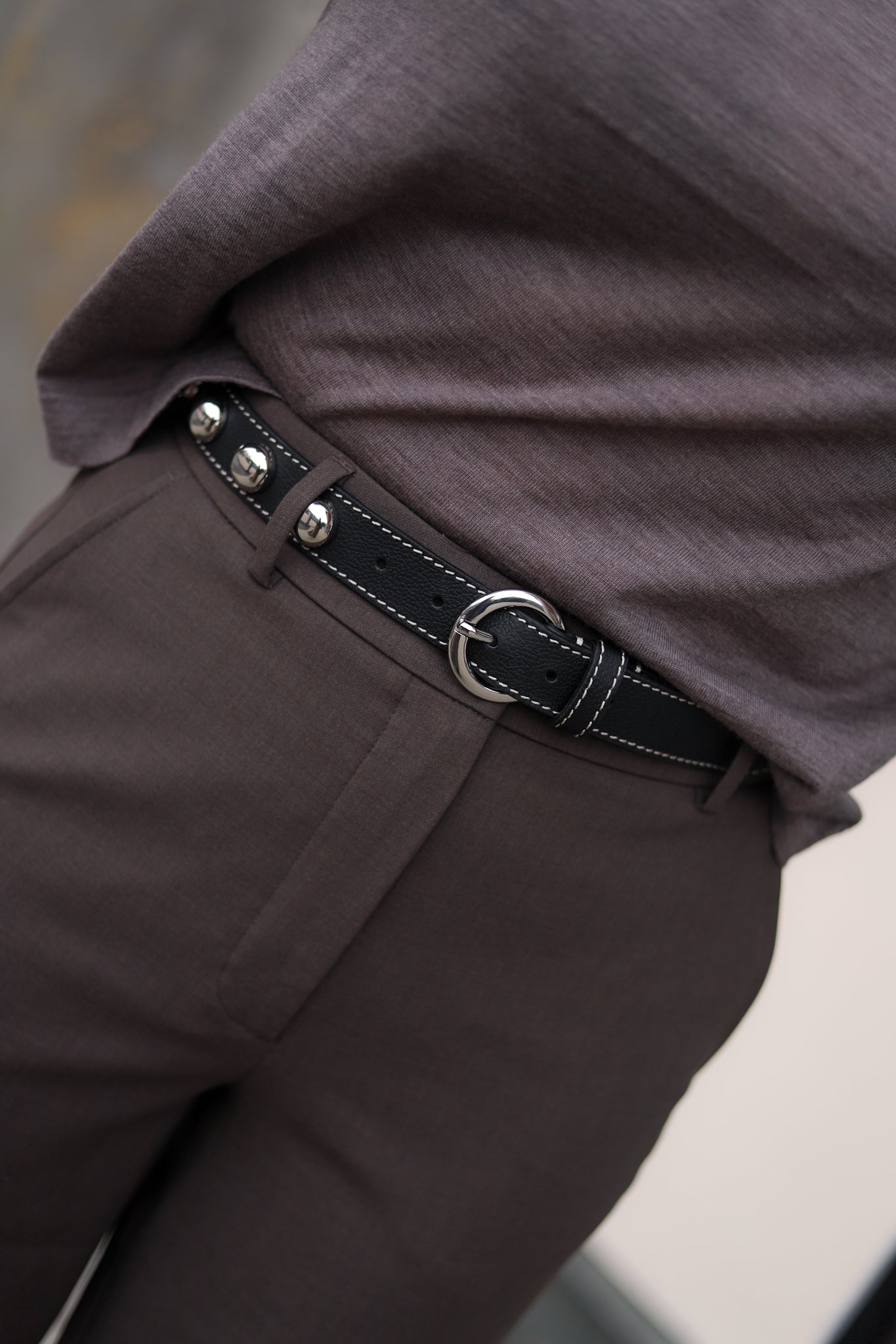 Stilig belte laget i kuskinn, detaljert med kontrastsømmer og store nagler. Topp antrekket med dette tøffe beltet.