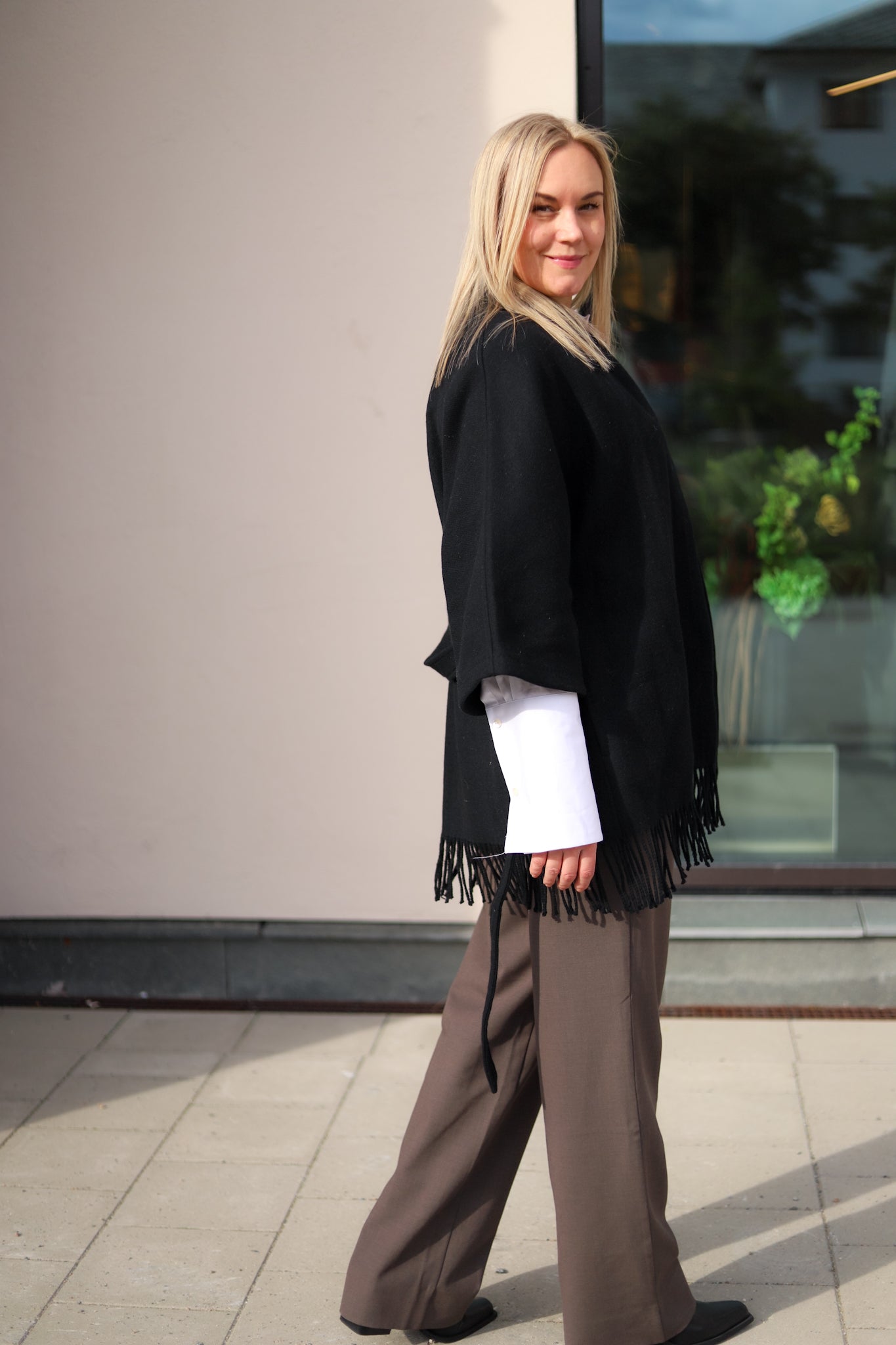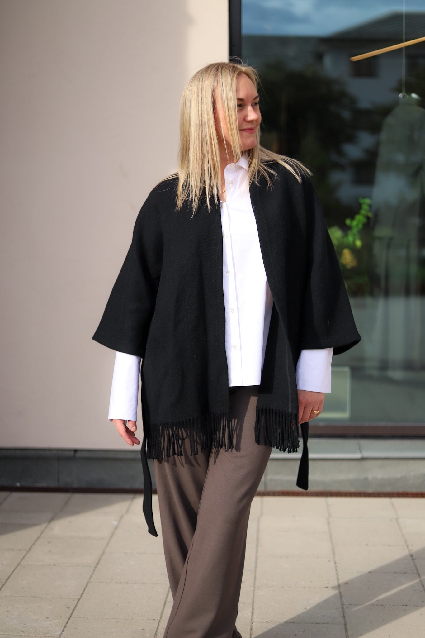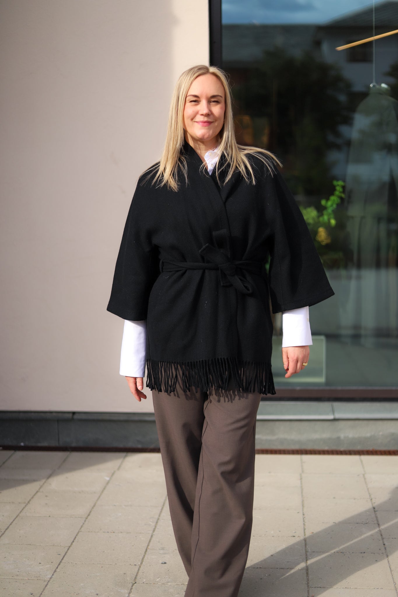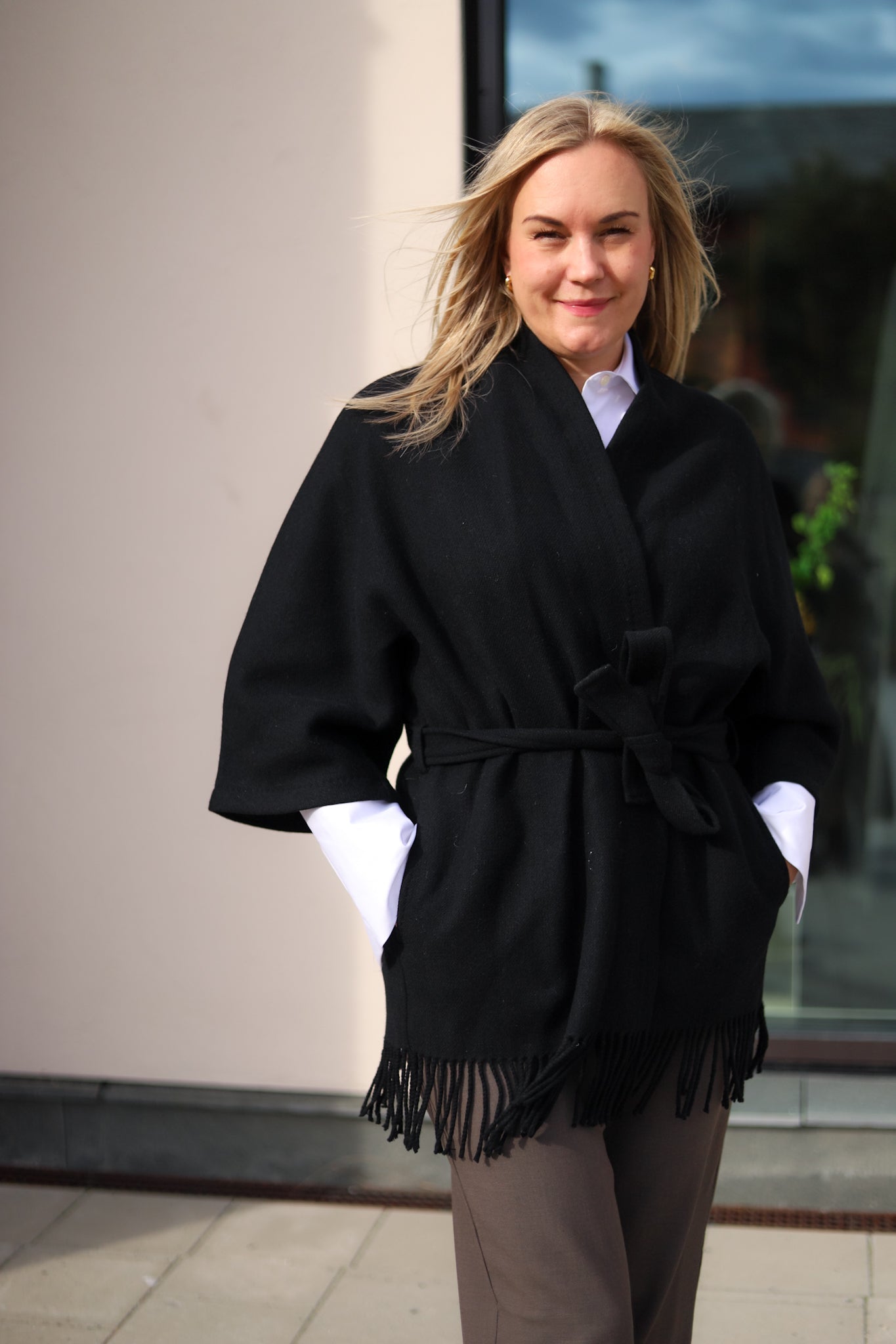 Elegant lett jakke med stilige detaljer fra norske Christian Aks. Akila Jacket er laget av myk luksuriøs lammeull og kommer her klassisk sort. Den har et rent og tidløst design med frynser langs hem. Modellen minner om en kimono med vide 3/4 ermer og omslag med løst knytebelte. Den har to innvendige lommer. Jakken sitter elegant tett i halsen og har fin lengde nedpå hoften. Beltet gir deg mulighet for å justere midjen etter eget ønske. Jakken er ikke fóret og egner deg derfor like godt ute som inne. En deilig lett jakke med stilige detaljer!
