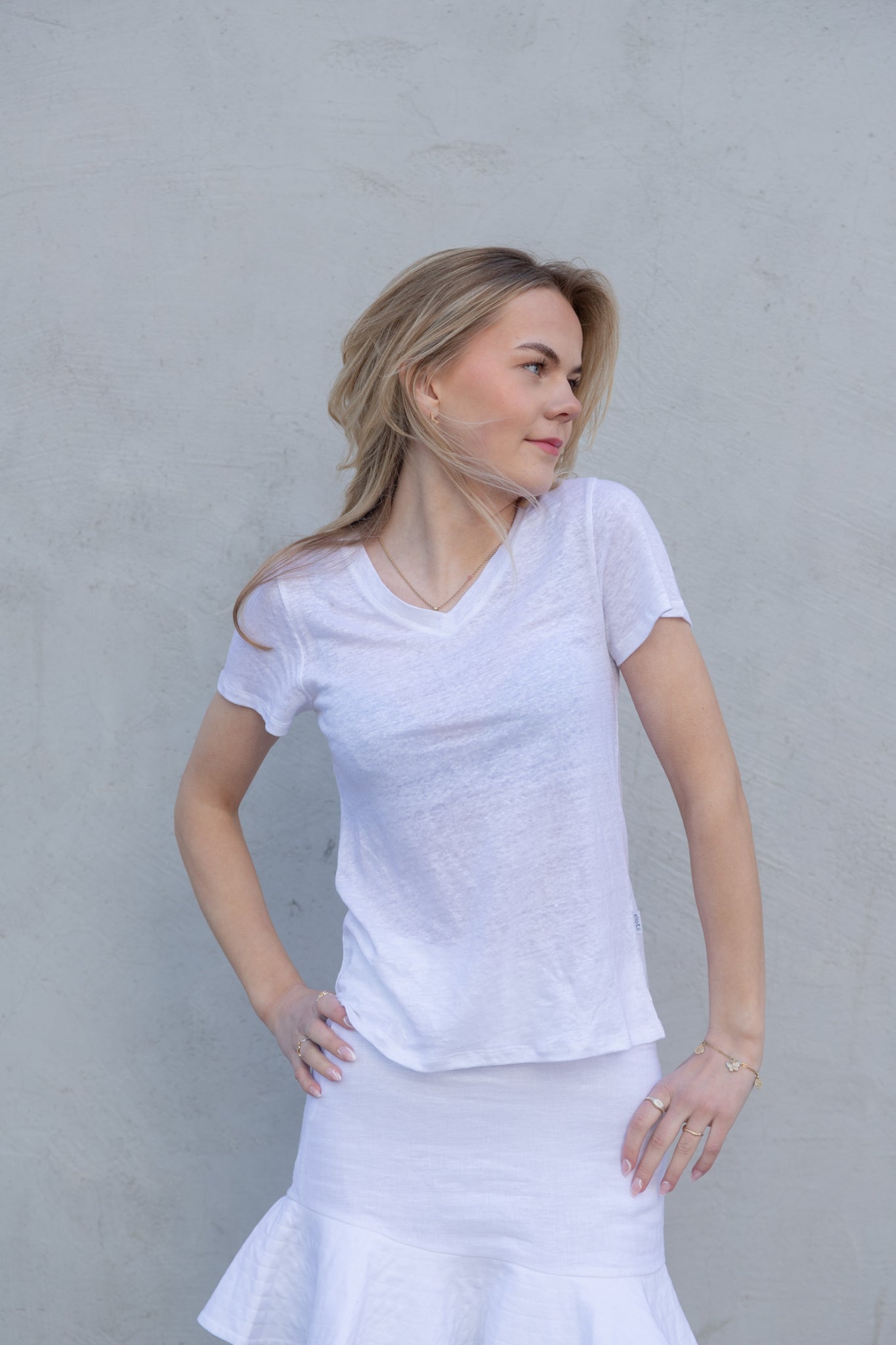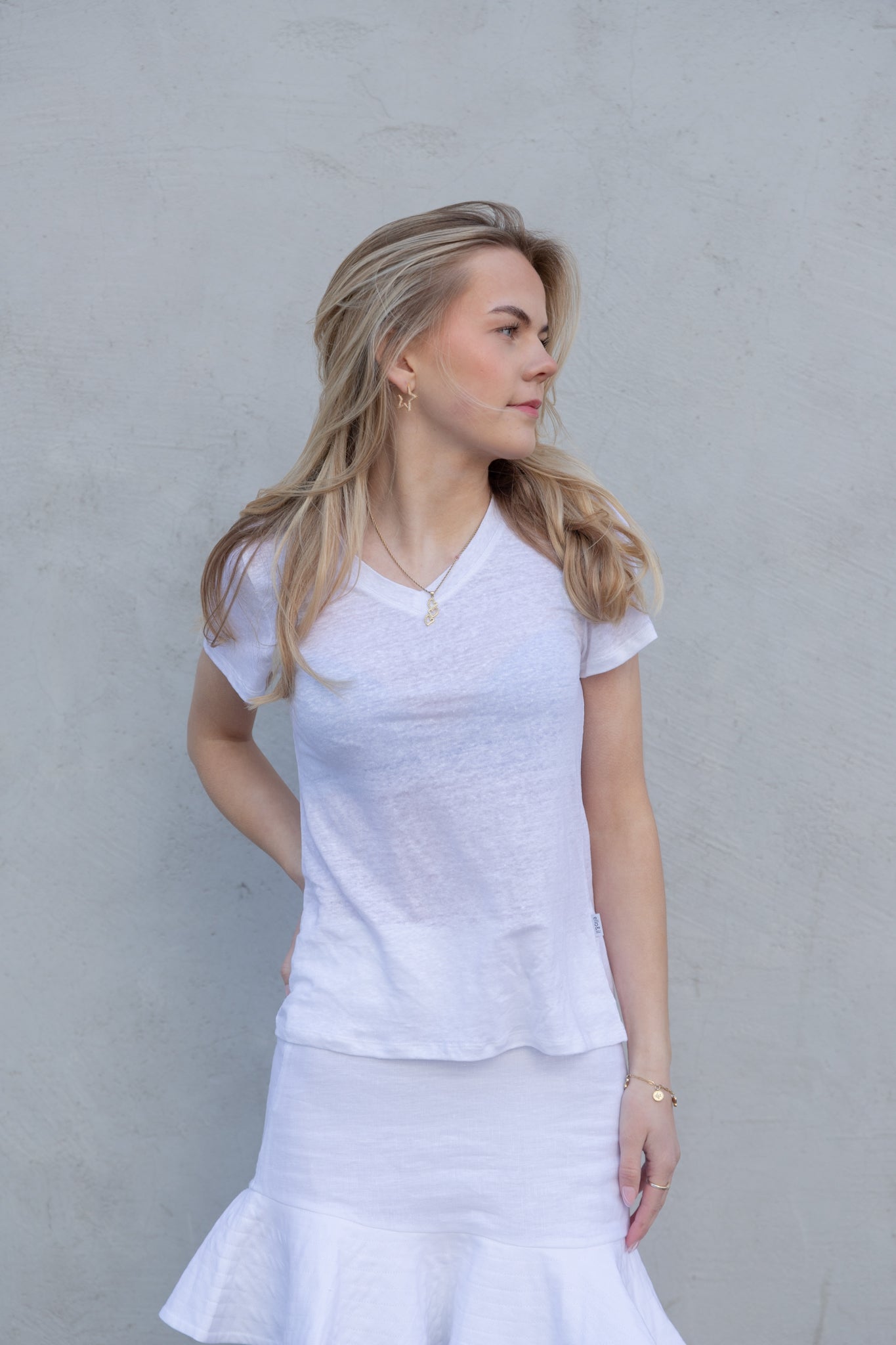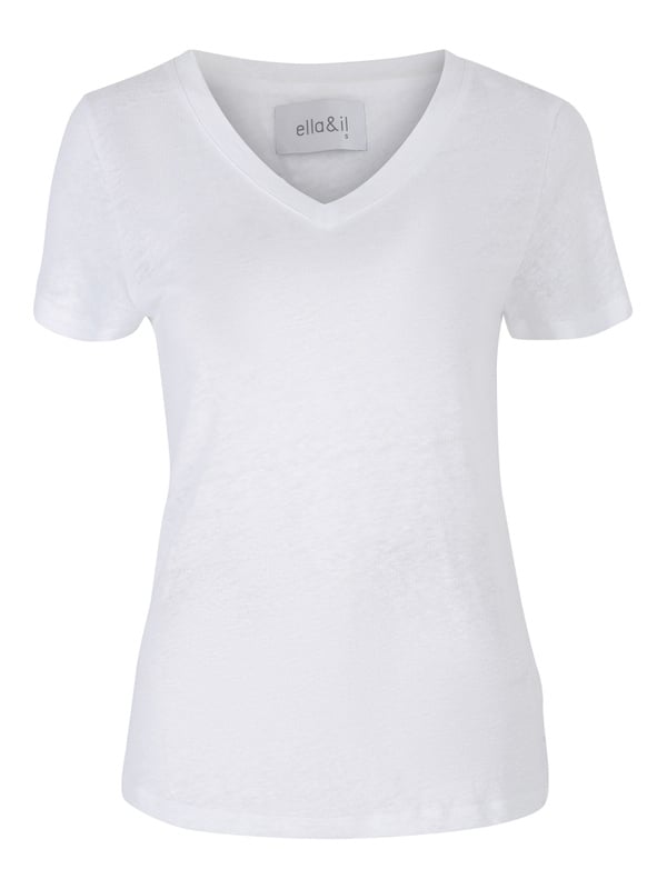 Deilig t-skjorte i 100% lin fra Ella&il. Dette er den perfekte basic t-skjorten som har blitt en favoritt for mange! Med sin rette form og v-hals. Et basisplagg som alle kvinner bør ha i garderoben! Her i klassisk hvit.