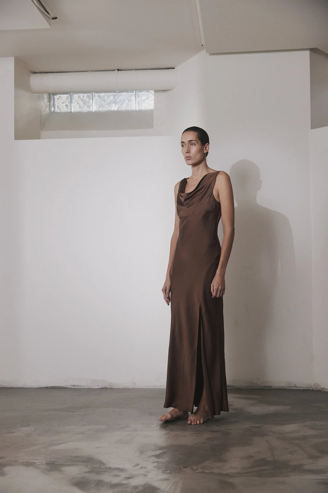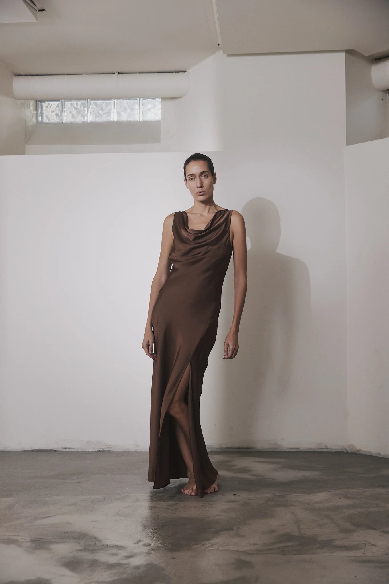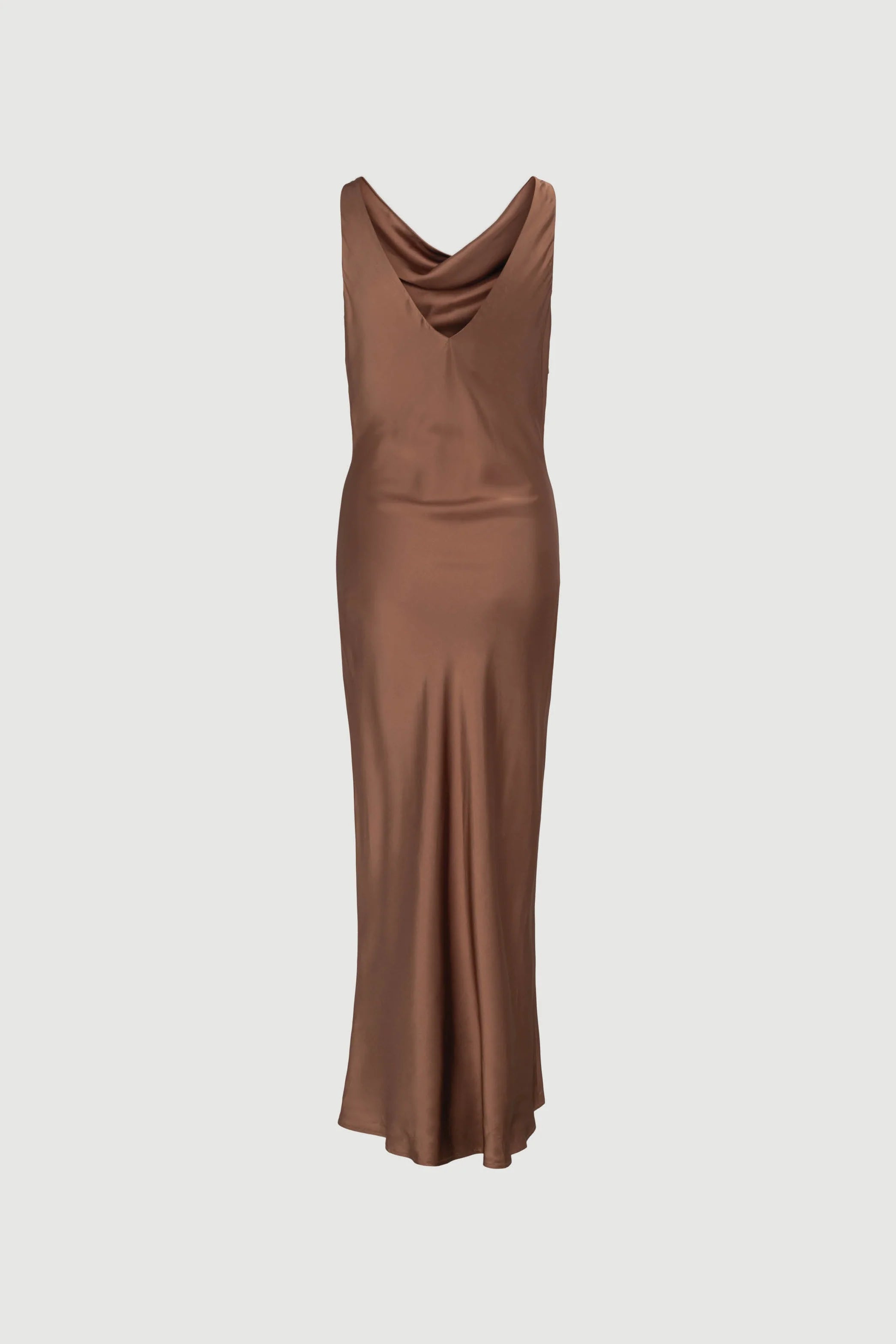 Bestselgeren Cameron dress fra Envelope kommer nå i en rik moccabrun farge. En elegant ermløs kjole med vakker drapert hals og dyp v i ryggen. Feminin insvinget fasong med flatterende maxilengde. Den luksuriøse viskosen er blank og faller flott. En perfekt selskapskjole som kombinerer eleganse med en lett uanstrengt stil.