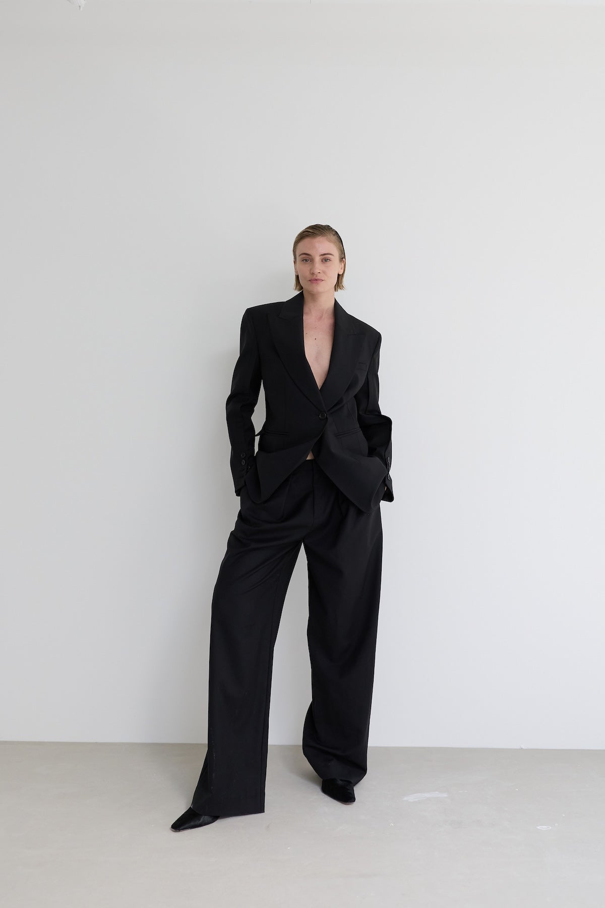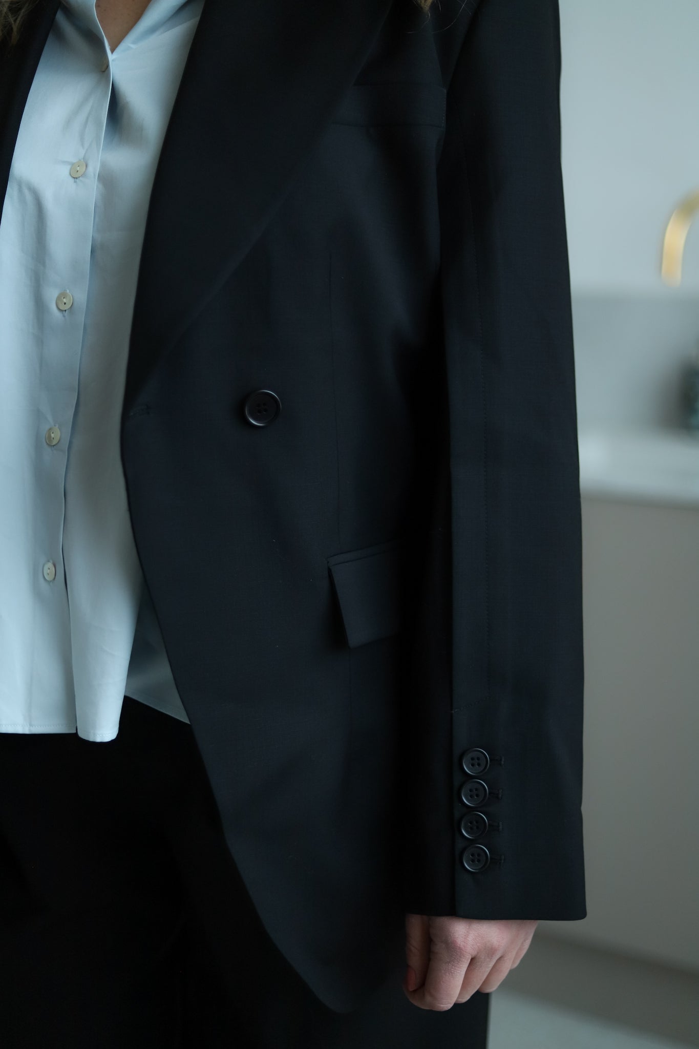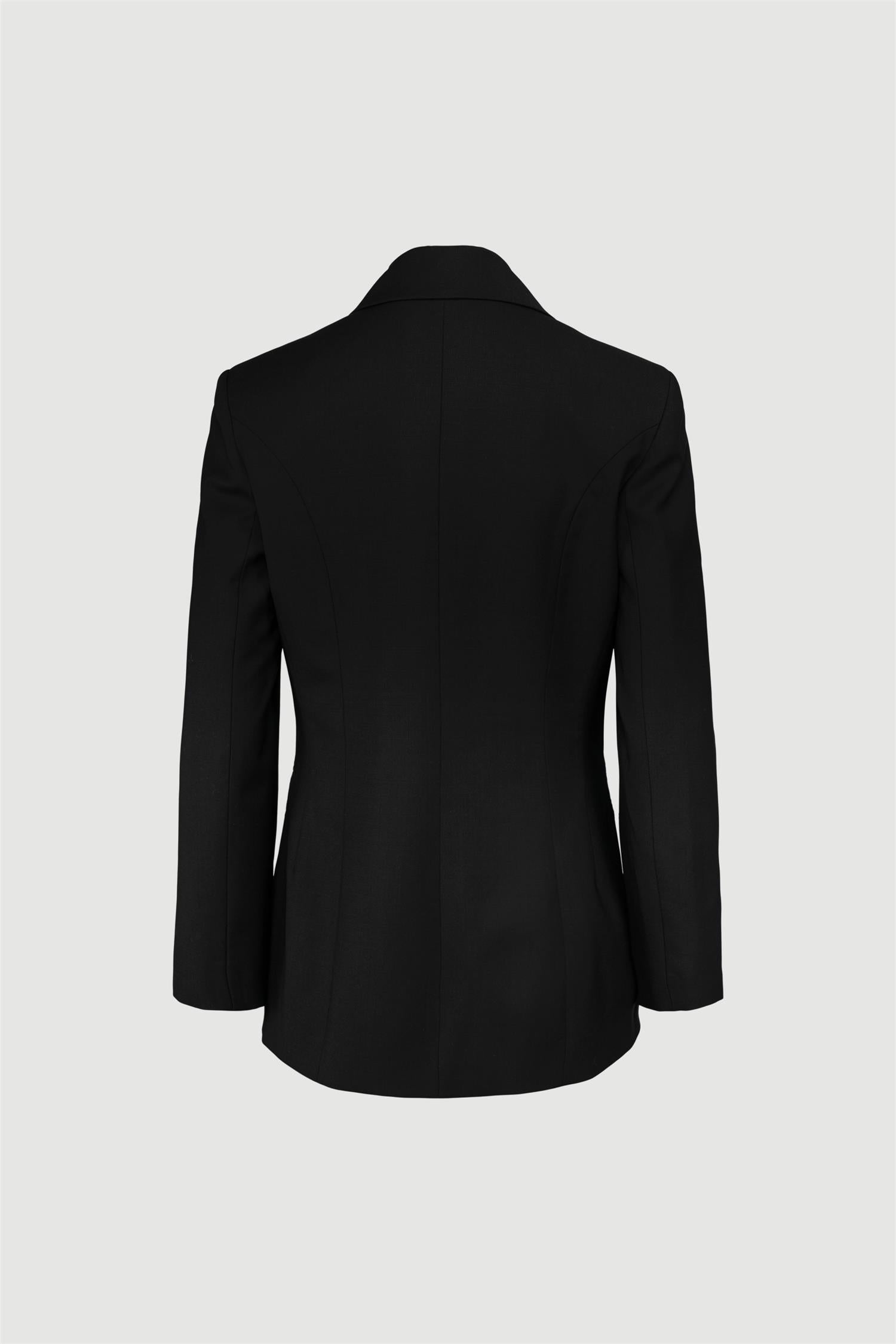 Skreddersydd blazer med asymmetrisk snitt i klassisk sort fra Envelope 1976. Den er laget av 100 % fin italiensk ull, har en knapp i front, en enkel lomme på brystet og brede lommer med klaff i midjen. Jakken er designet for å løfte både hverdagsantrekk og en mer formell stil. Style den med Monaco-buksene for en komplett look i matchende stoff.