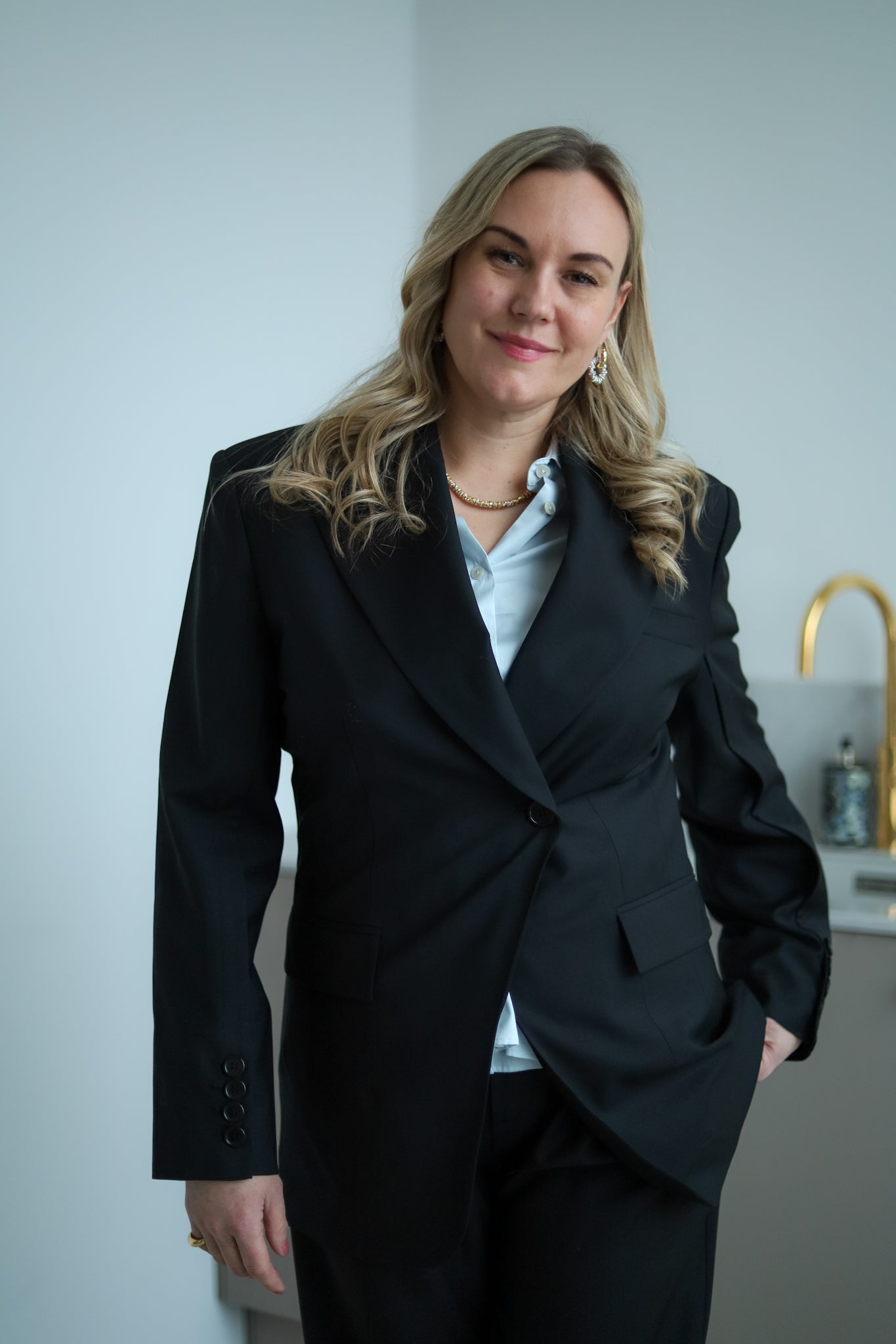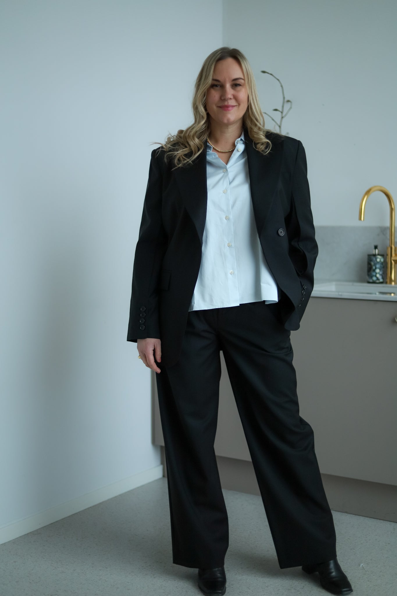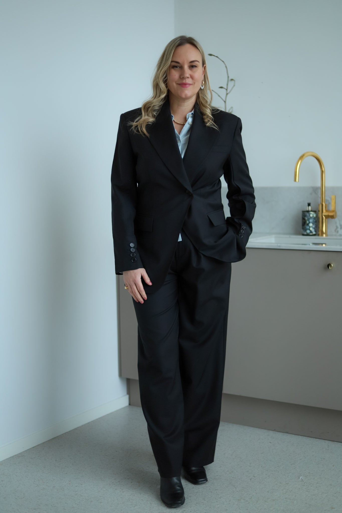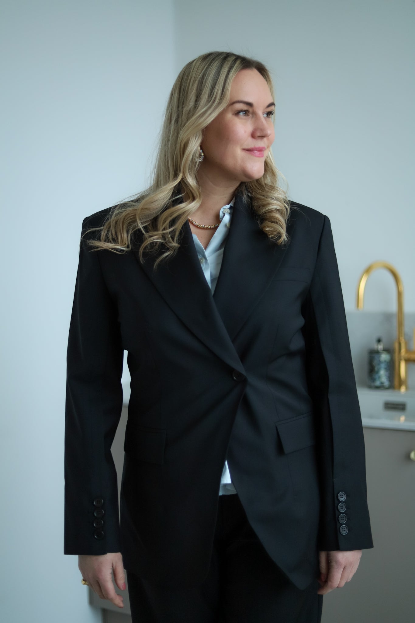 Skreddersydd blazer med asymmetrisk snitt i klassisk sort fra Envelope 1976. Den er laget av 100 % fin italiensk ull, har en knapp i front, en enkel lomme på brystet og brede lommer med klaff i midjen. Jakken er designet for å løfte både hverdagsantrekk og en mer formell stil. Style den med Monaco-buksene for en komplett look i matchende stoff.