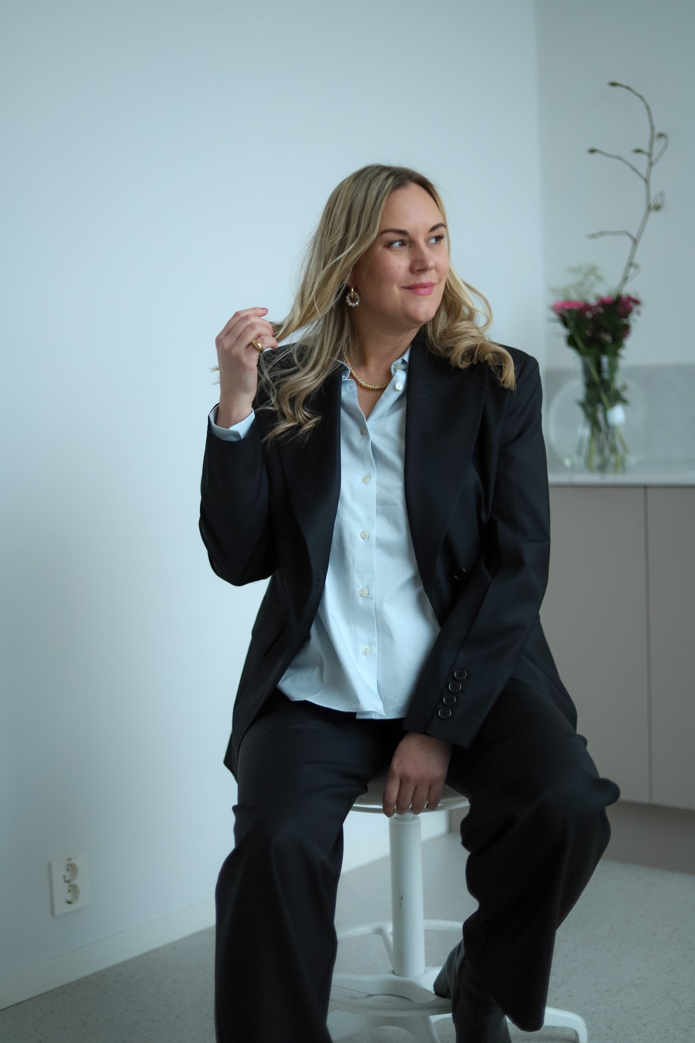 Passformen er litt oversized; bruk en størrelse mindre hvis du foretrekker en mer normal silhuett. Marie er 168 cm og har på seg størrelse 38.
