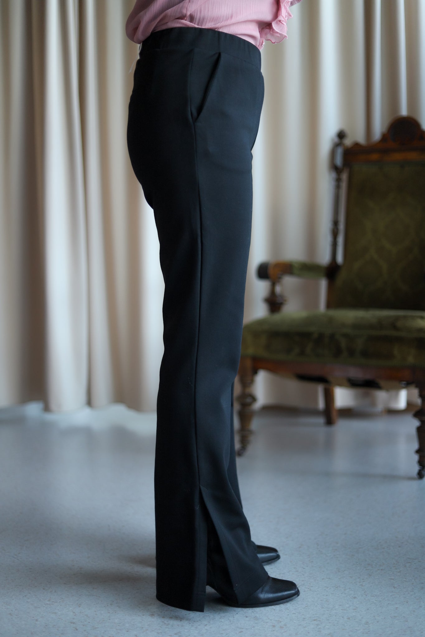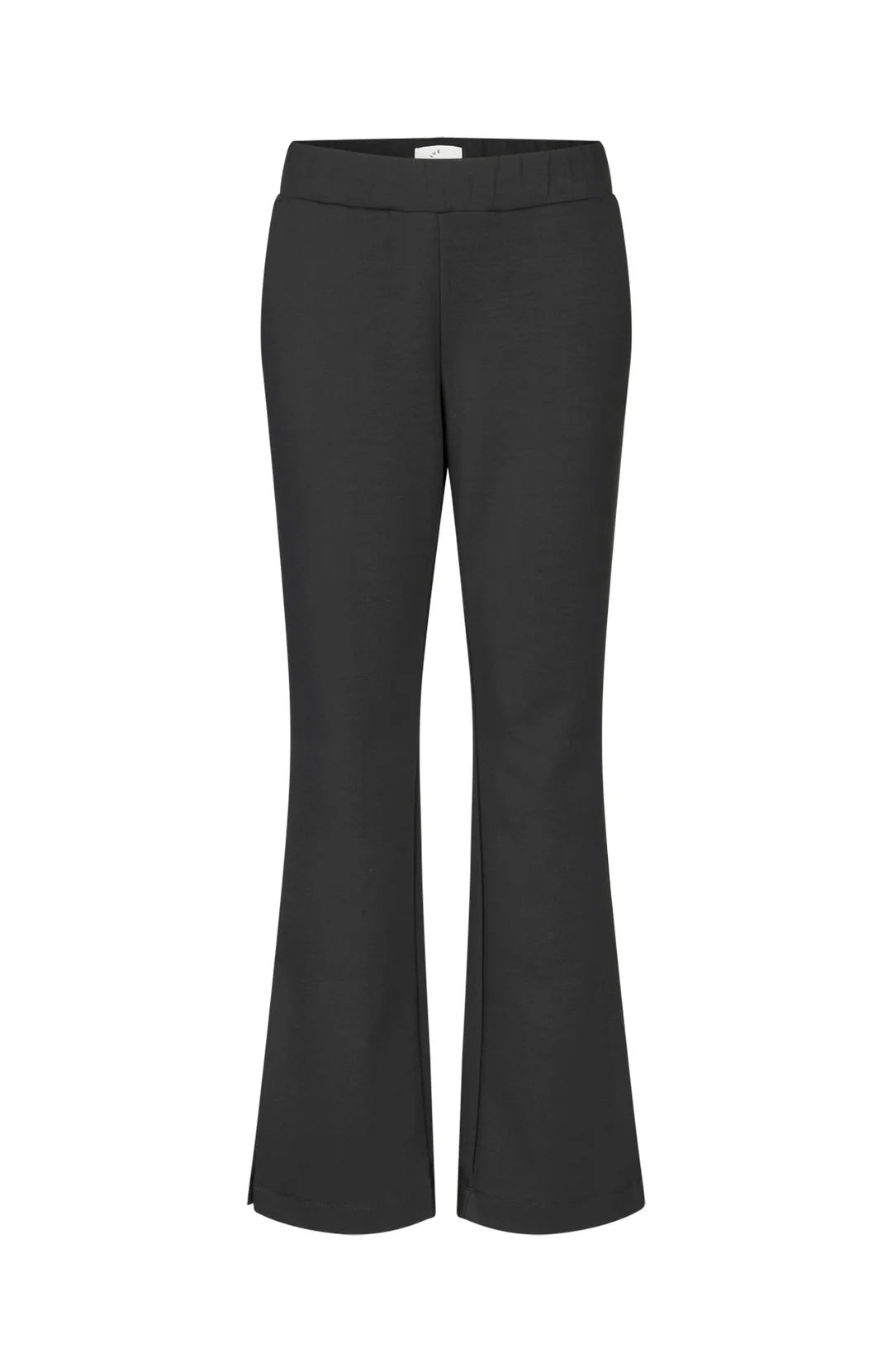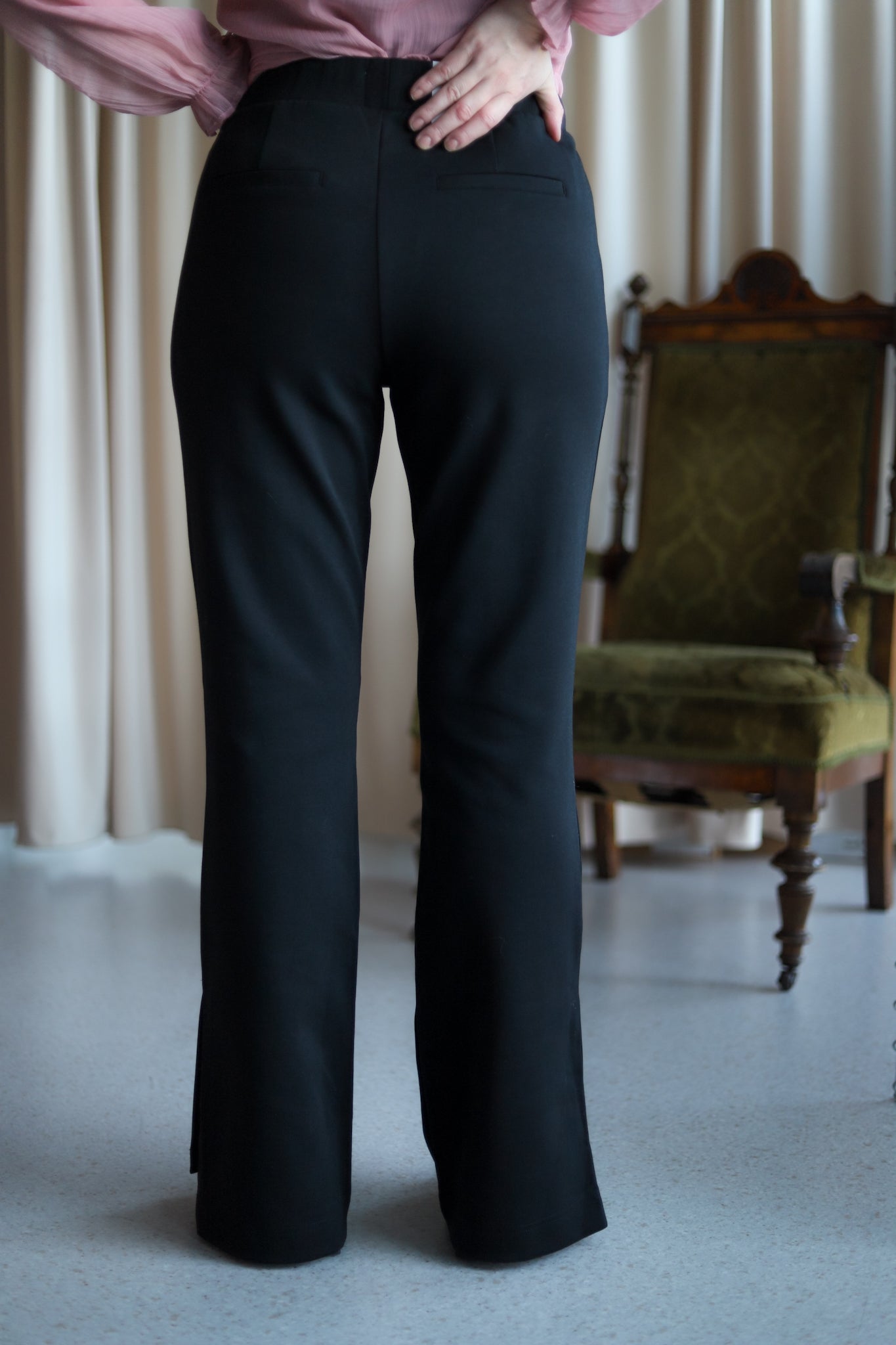 Nicole pant fra FiveUnits har trendy flare og kommer i deilig myk og stretchy bomullsjersey. Modellen har medium livhøyde og linning med behagelig strikk. Skrålommer i front og pyntelommer bak. Flatterende silhuette med elegant sleng og splitt i sidene. En chic og comfy bukse, her i tidløs sort.