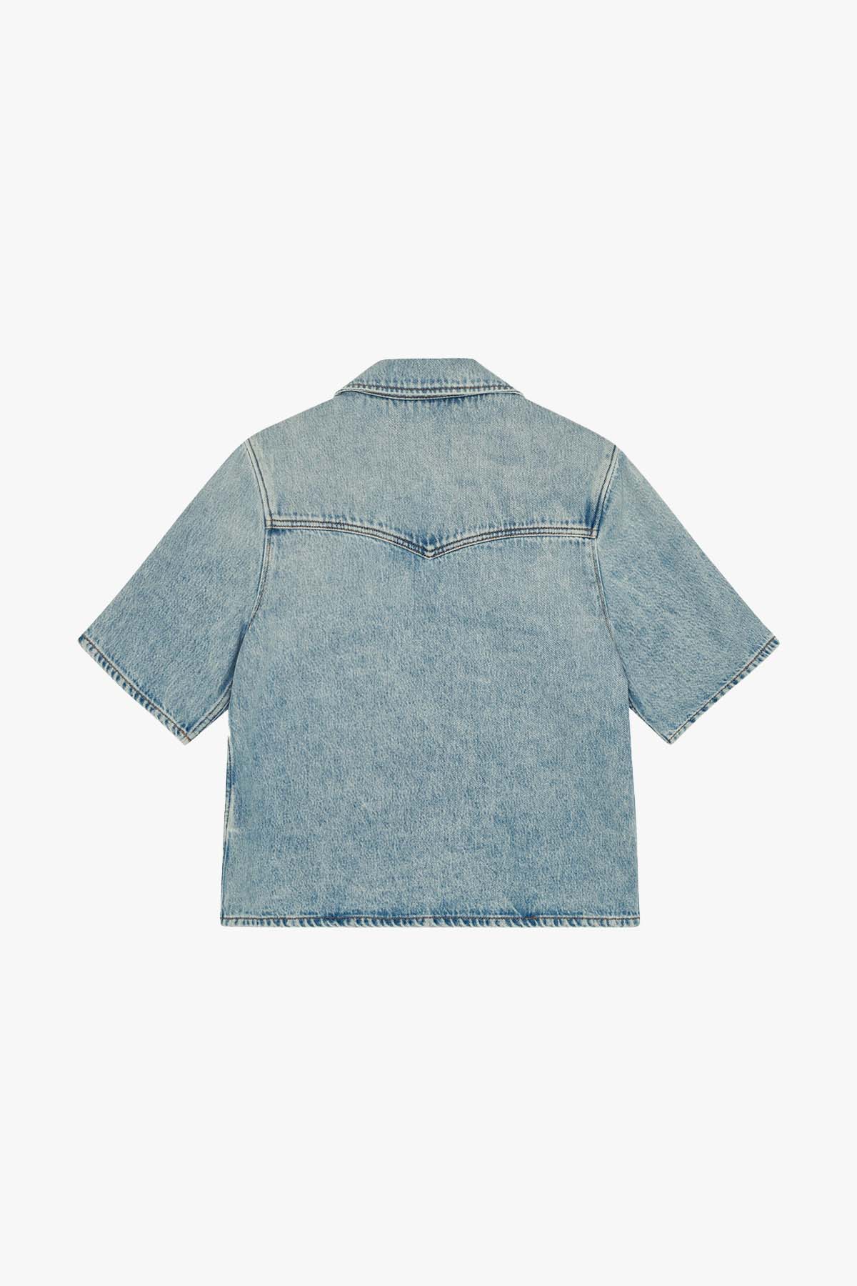 Tøff skjorte i lys blå denim fra Ganni. Modellen er rett med nett lengde. Knepping i front, V-hals og slag med hakk. Brystlommer i front og korte ermer. Skjorten har en lett retrovibe og er i en nydelig myk bomullsmix. Style skjorten med matchende jeans eller skjørt for komplett look.