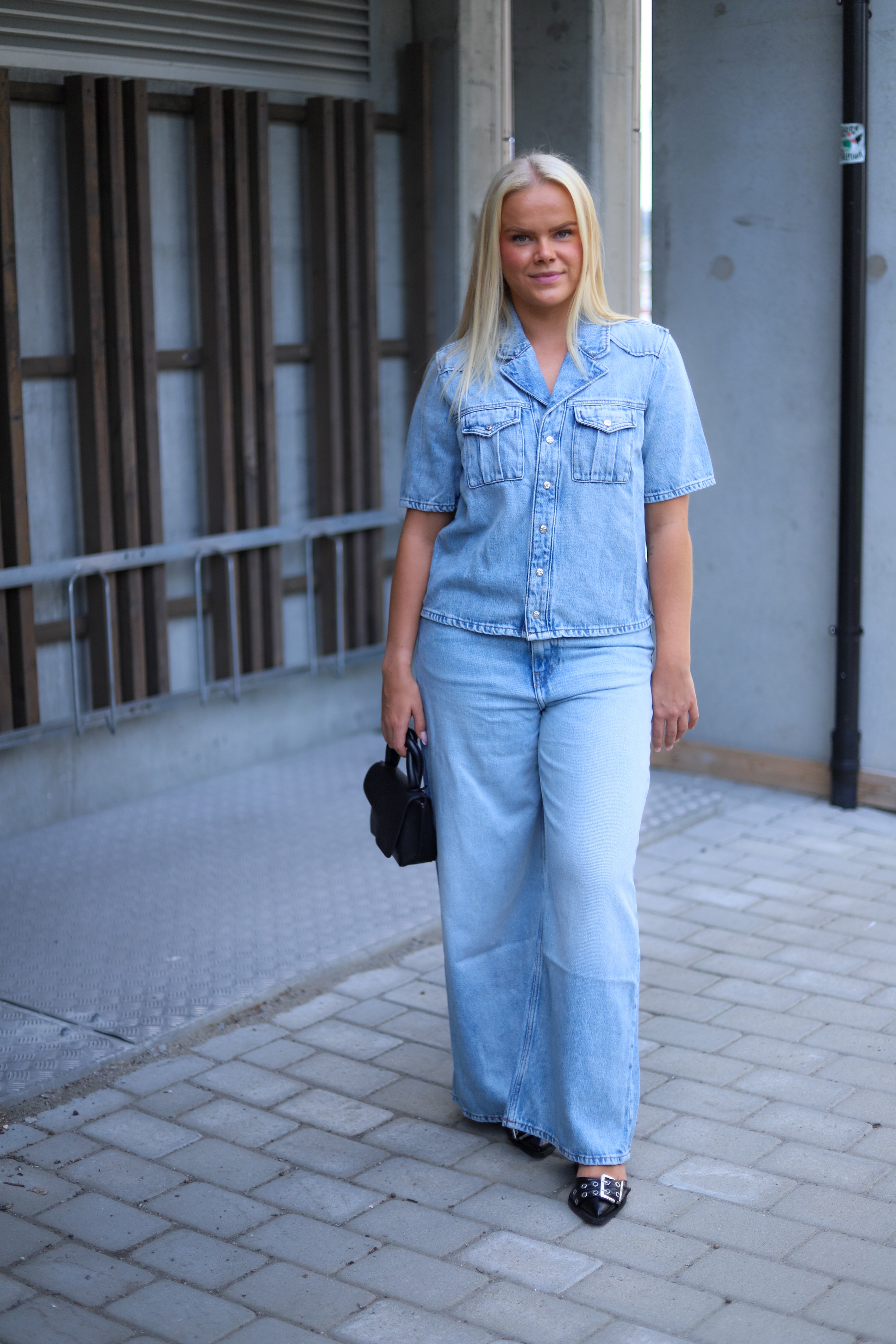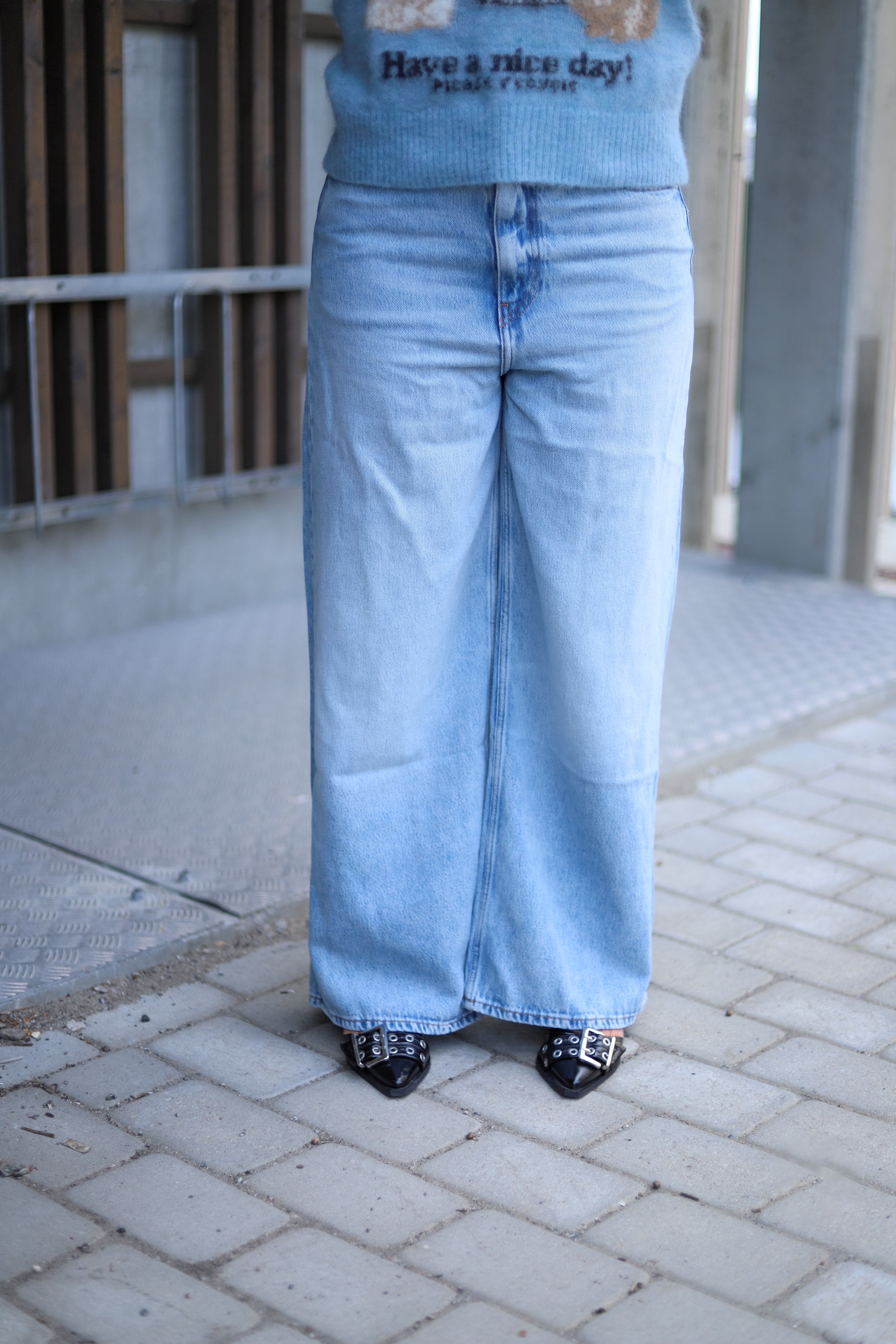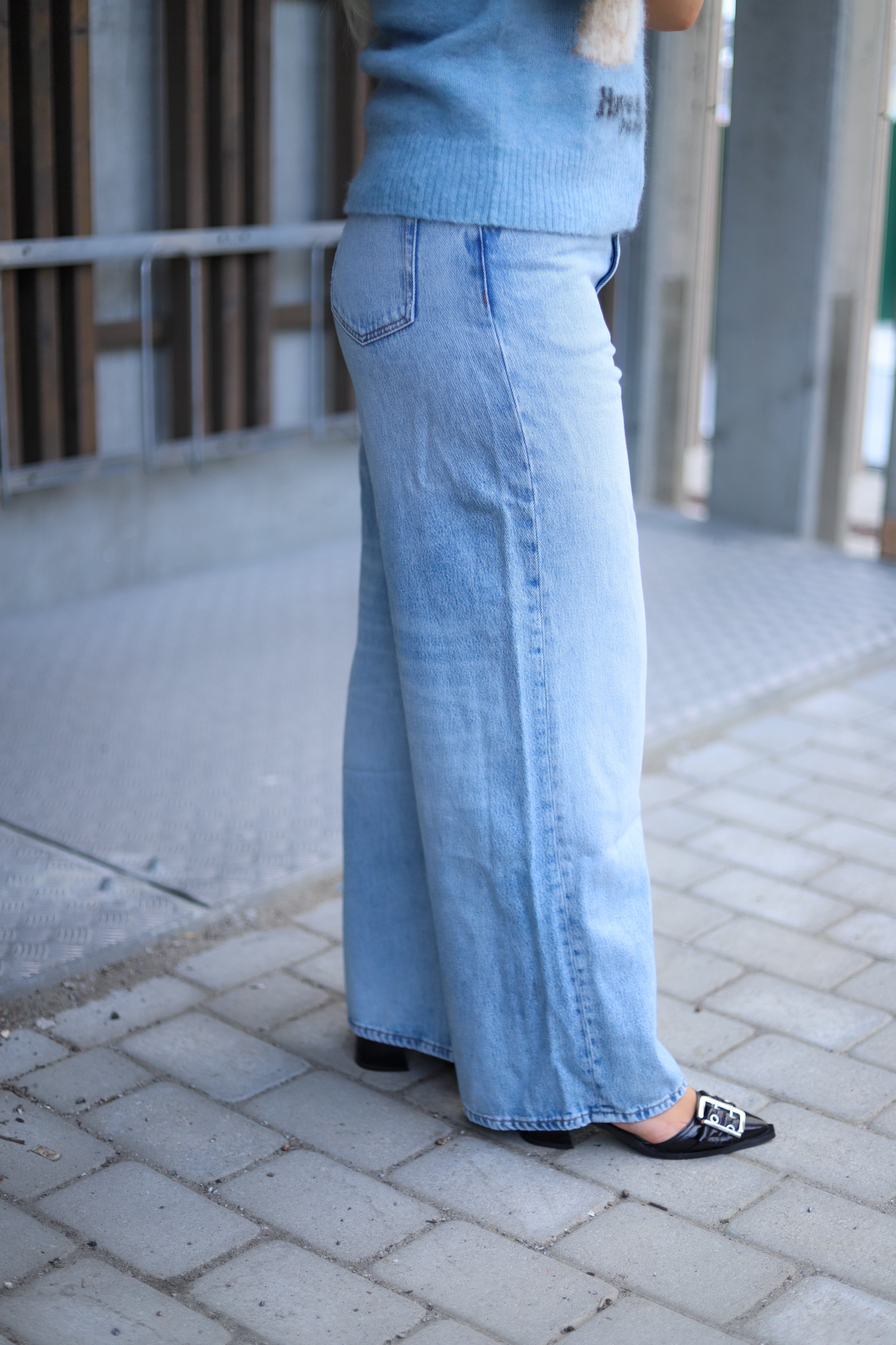 Kule jeans i lys blå denim fra Ganni. Modellen er vid med høyt liv og lange ben. Klassisk 5-pocket look med linning, beltehemper og skjult gylf. Jeansen er laget i en nydelig myk bomullsmix. Sesongens mest trendy jeans i en stilig lys blå vask. Style den med matchende skjorte for komplett look.