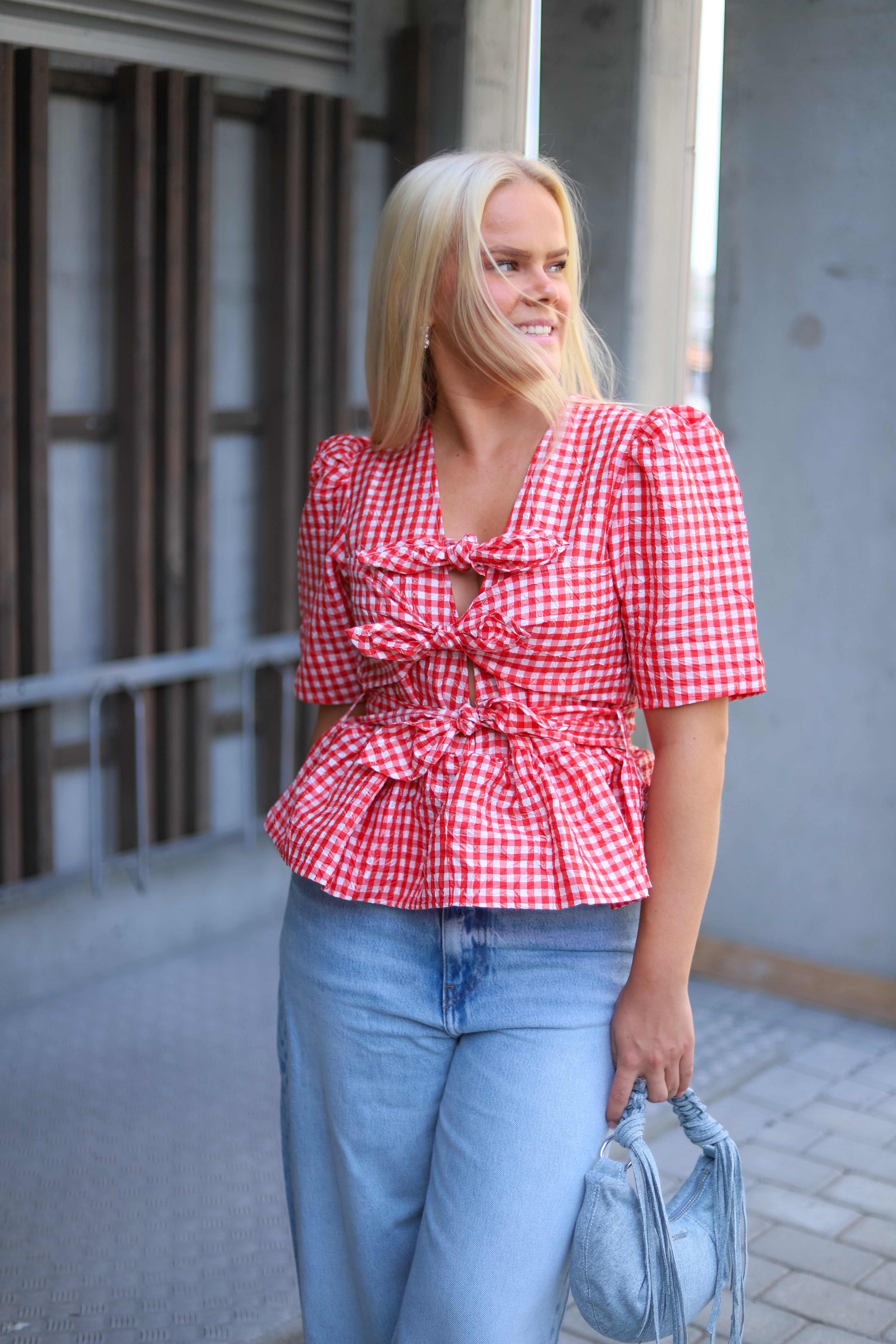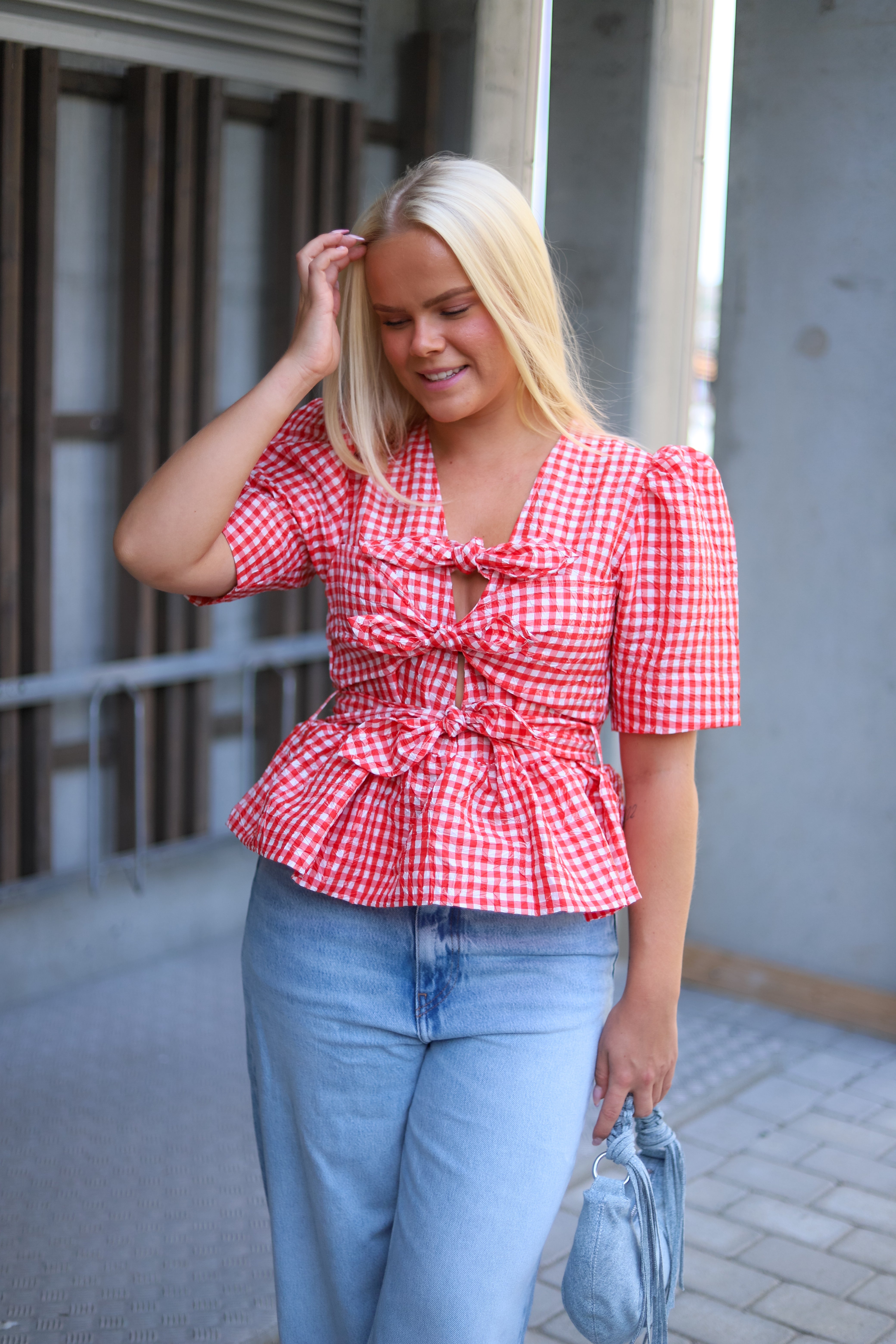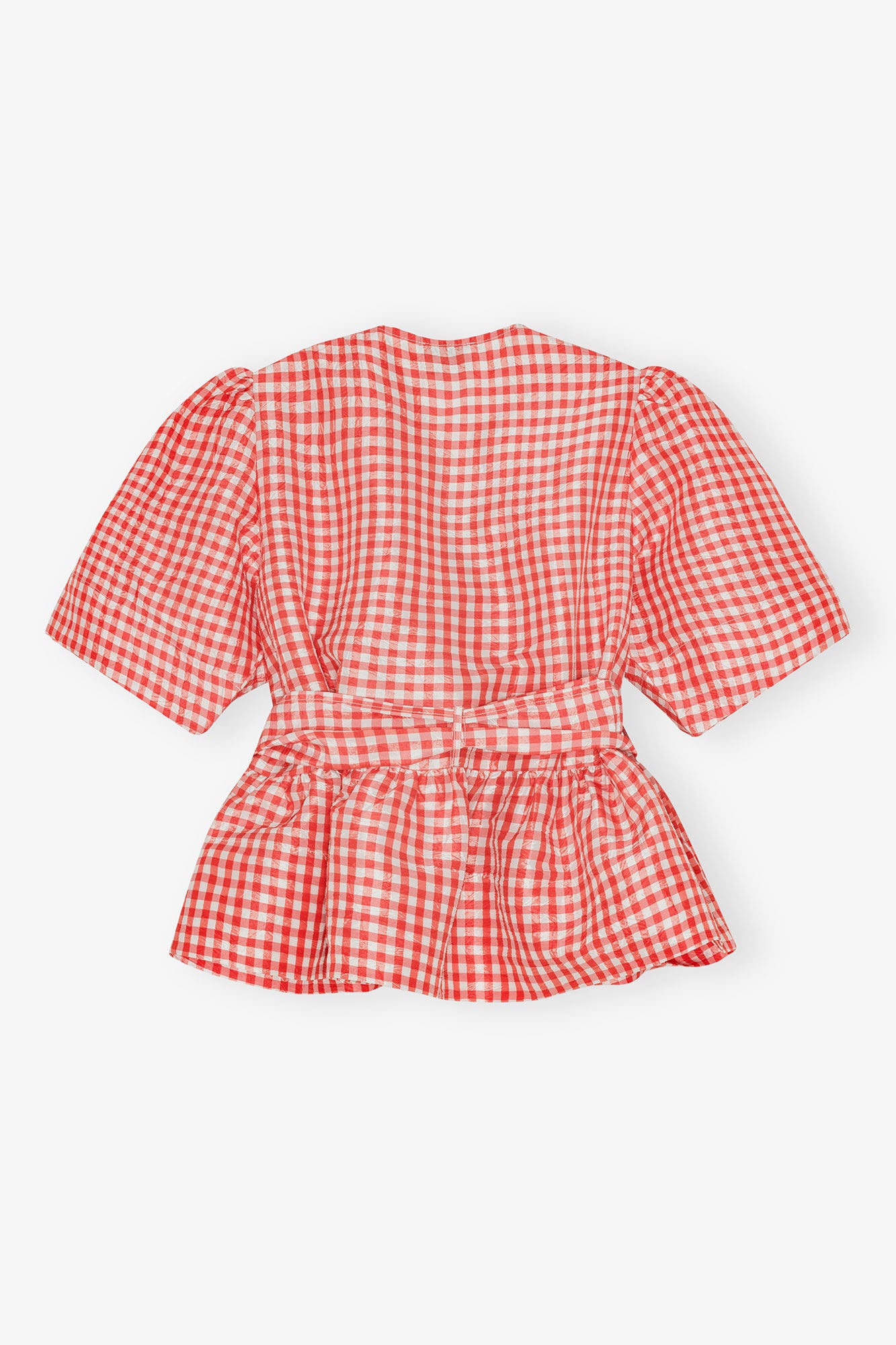 Smårutet bluse i rødt og hvitt fra Ganni. Modellen er tettsittende med markert midje og nett lengde med volanger i hem. V-hals og knytedetaljer i front. Toppen har korte ermer med puff i skuldre. Sesongens søteste topp i trendy rød med lekre detaljer.