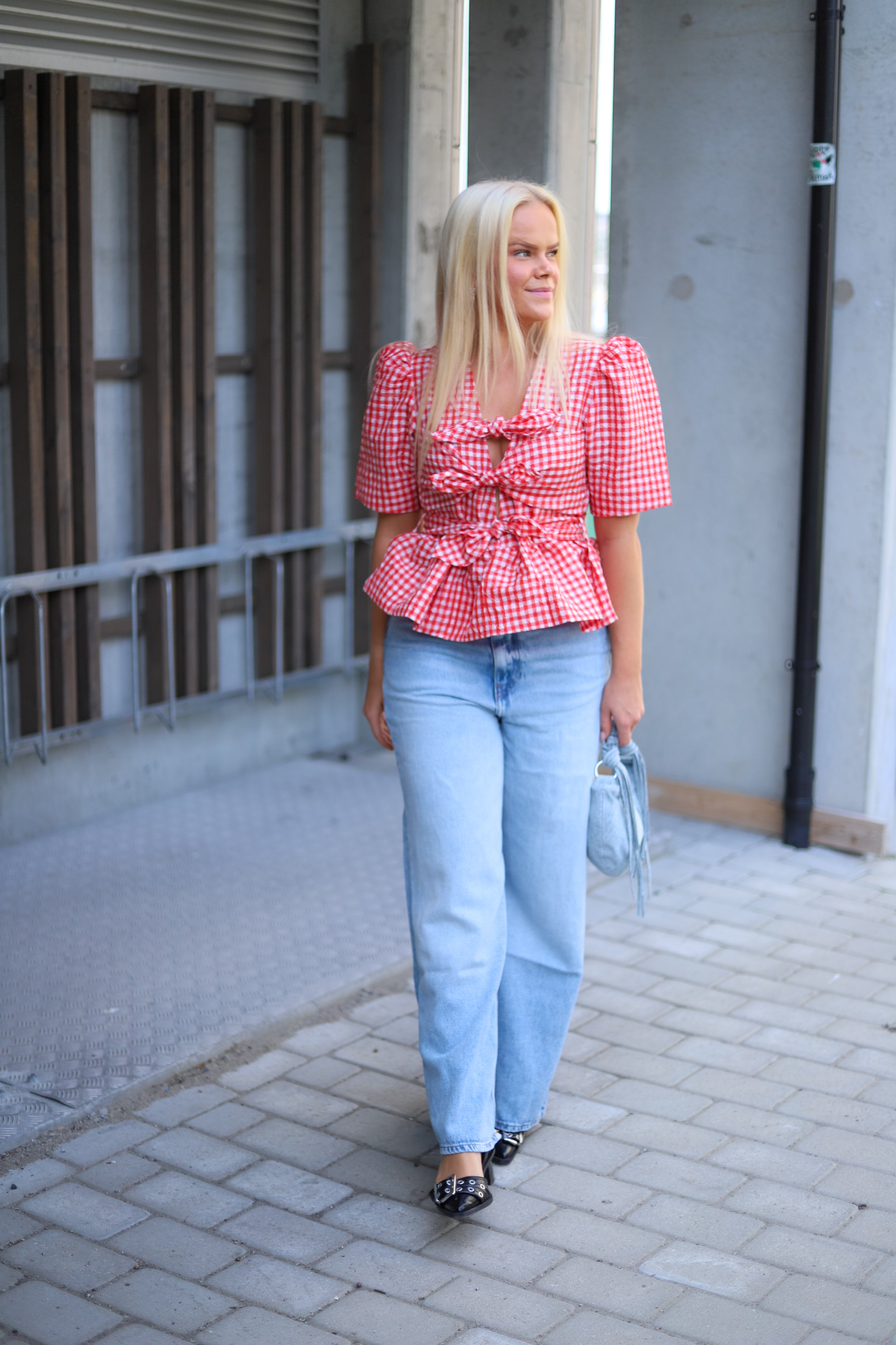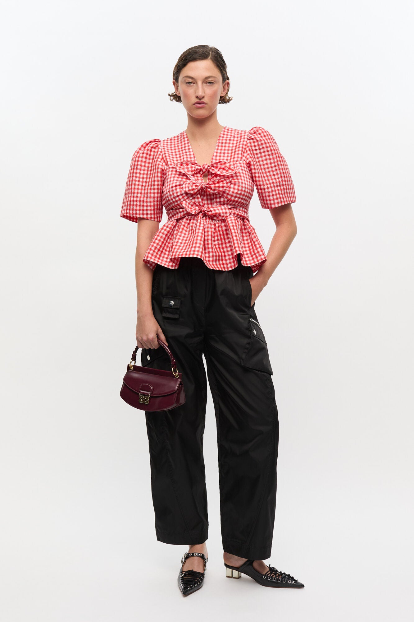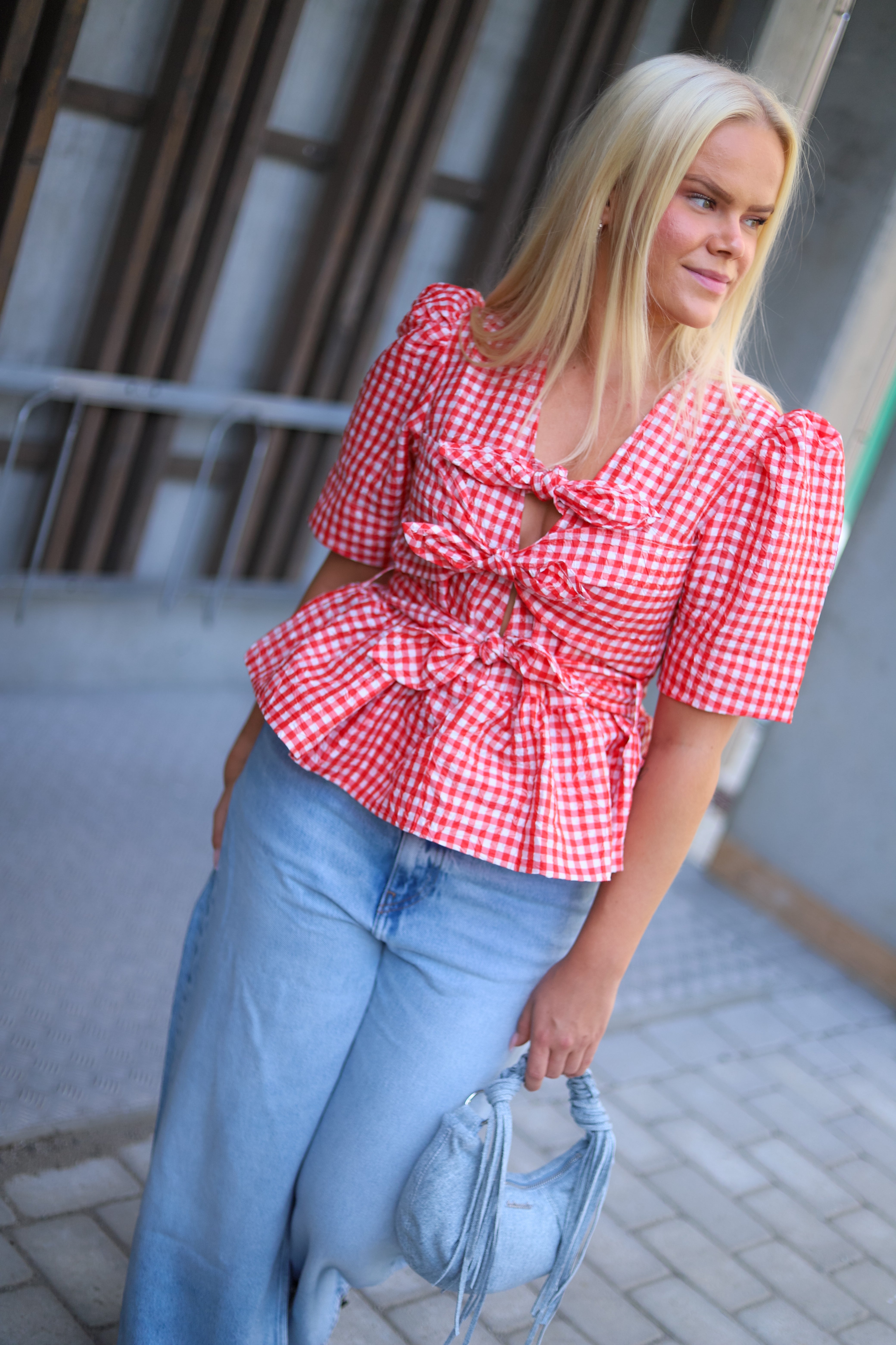 Smårutet bluse i rødt og hvitt fra Ganni. Modellen er tettsittende med markert midje og nett lengde med volanger i hem. V-hals og knytedetaljer i front. Toppen har korte ermer med puff i skuldre. Sesongens søteste topp i trendy rød med lekre detaljer.