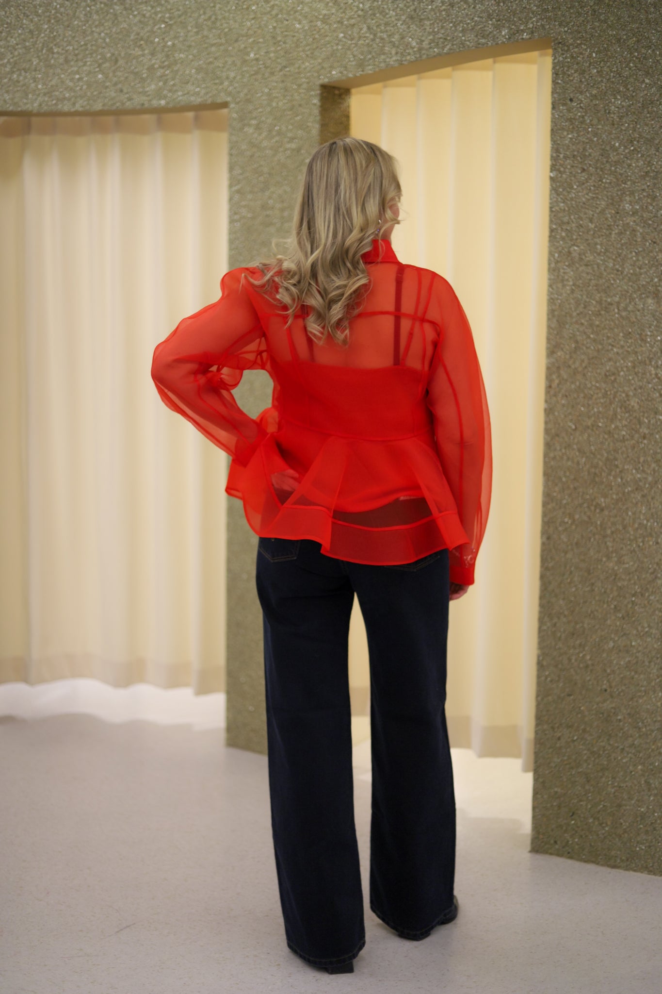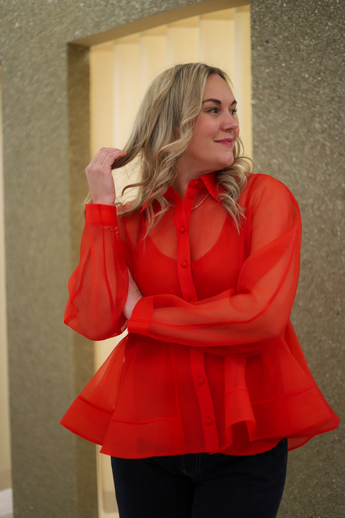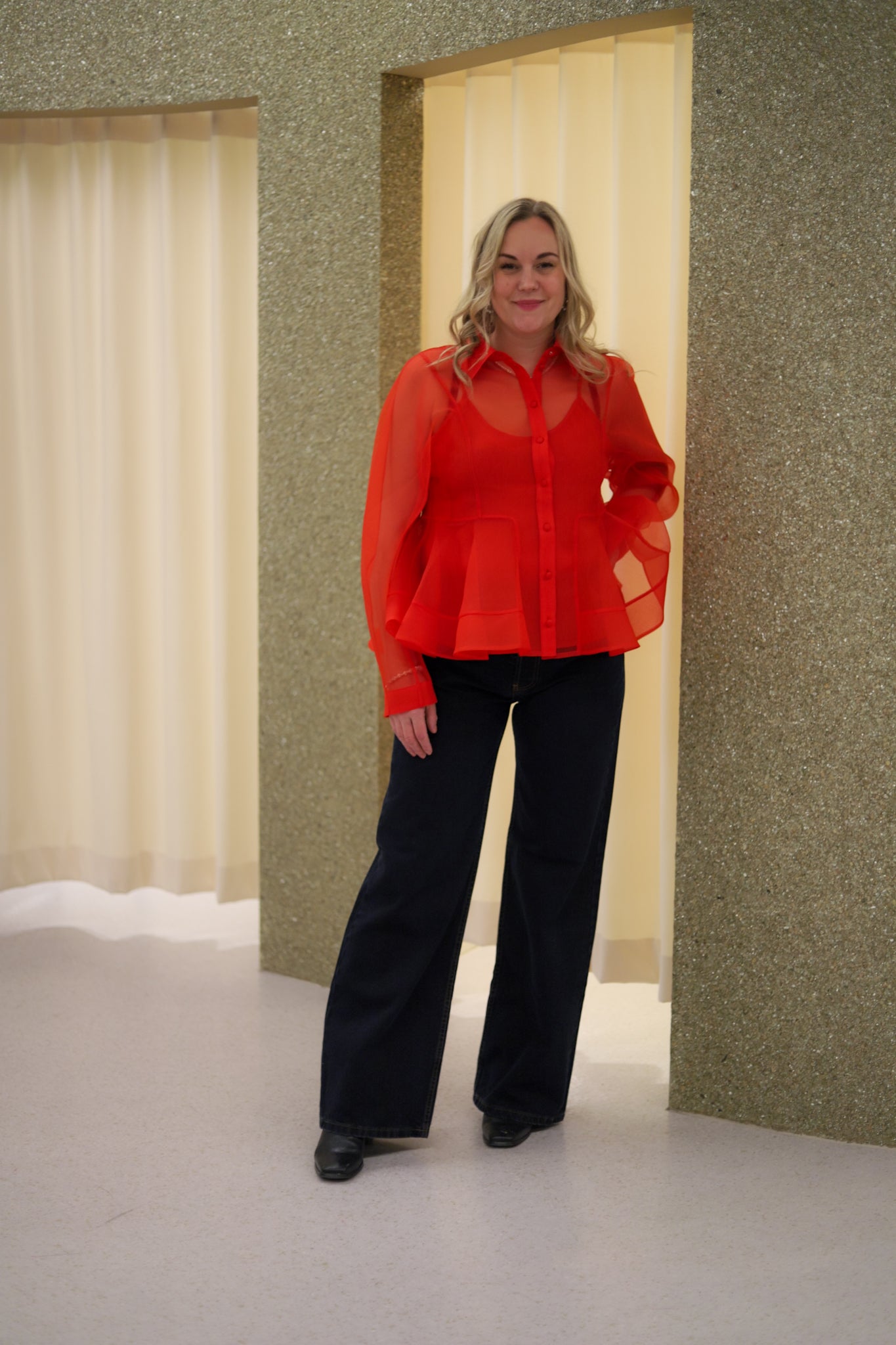 Fresh rød organzabluse med peplum effekt fra Ganni. Gjennomskinnelig teksturert organza med ton-i-ton singlet som medfølger. Skjorten har klassisk krage og trukne knapper i front. Den har buede lange ermer og voluminøs peplumsilhuett. Nydelig bluse som er elegant til dressbukser og kul til jeans.
