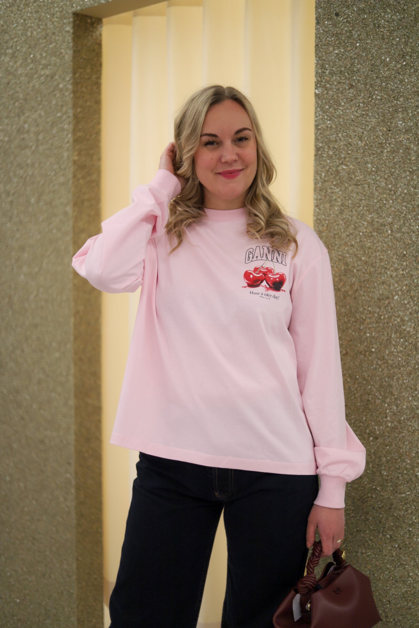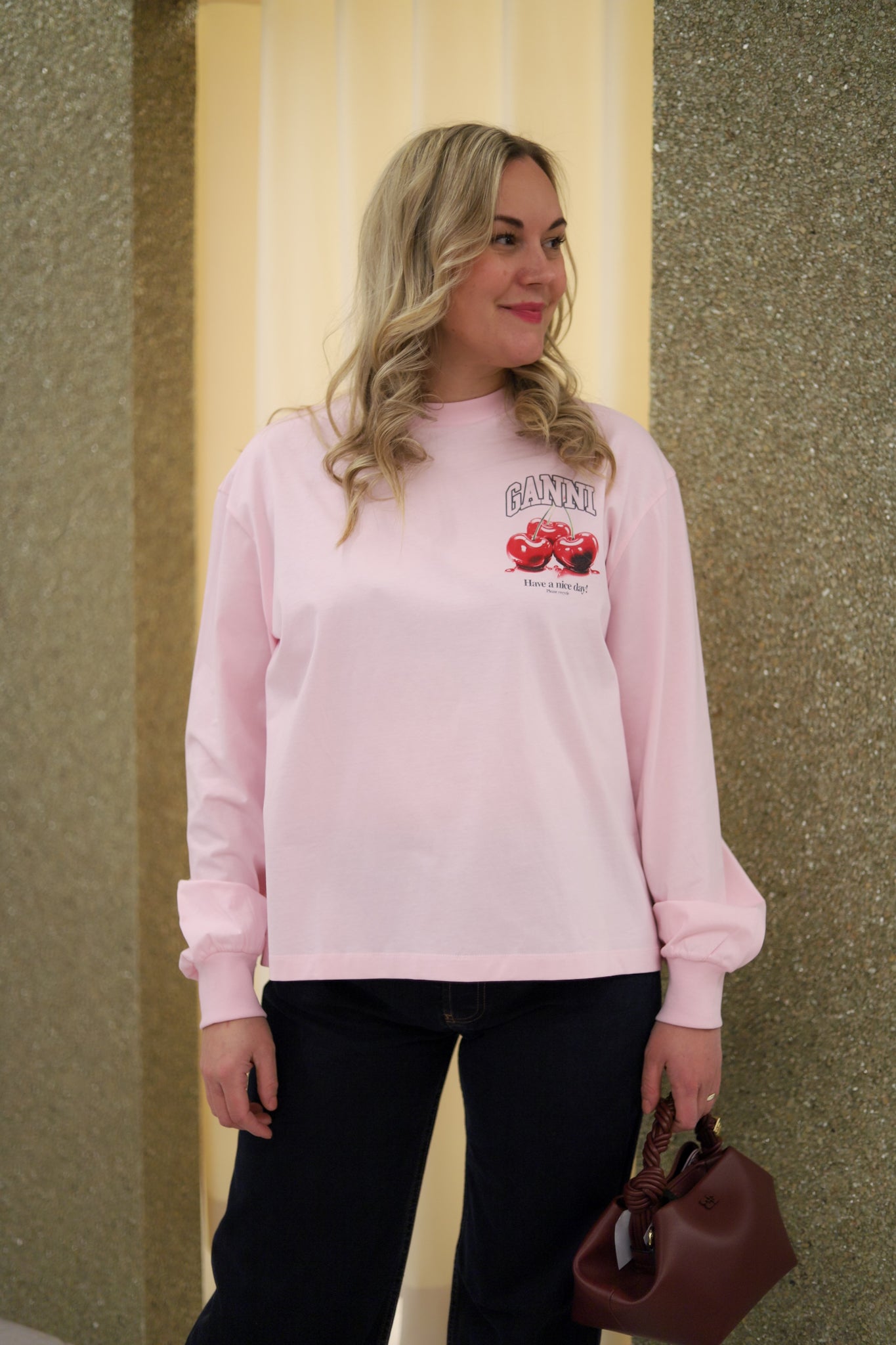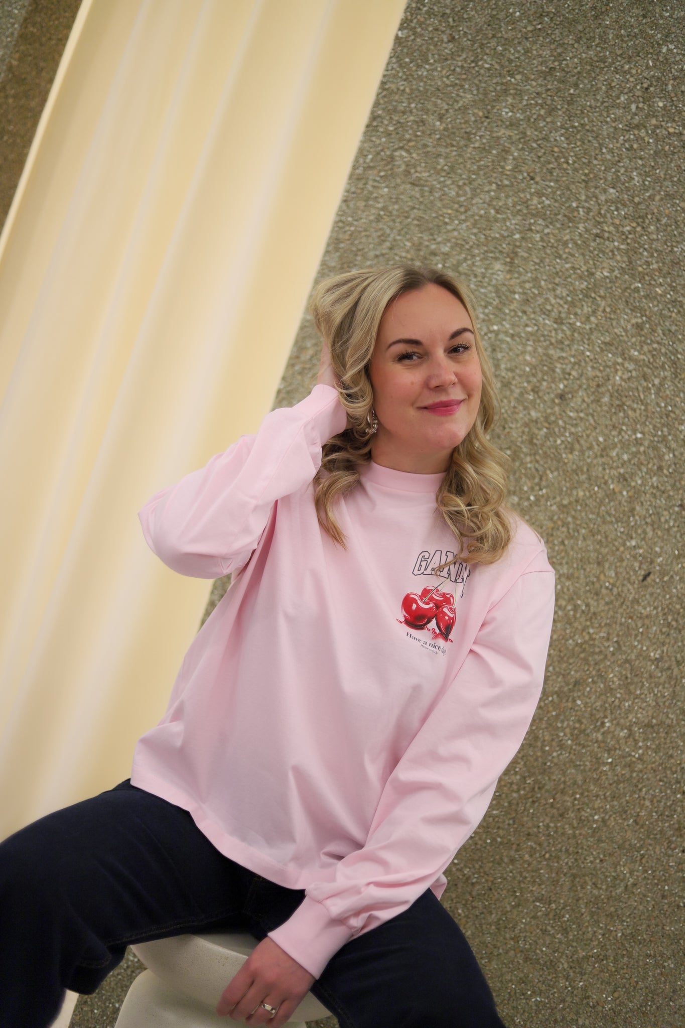 Langermet topp i lys rosa fra Ganni. Regulær crewneck modell med avslappet passform. Deilig myk bomullskvalitet med ribb i halsen. Leknet print på venste bryst med logo og kirsebær. Stilig topp til jeans og skjørt.