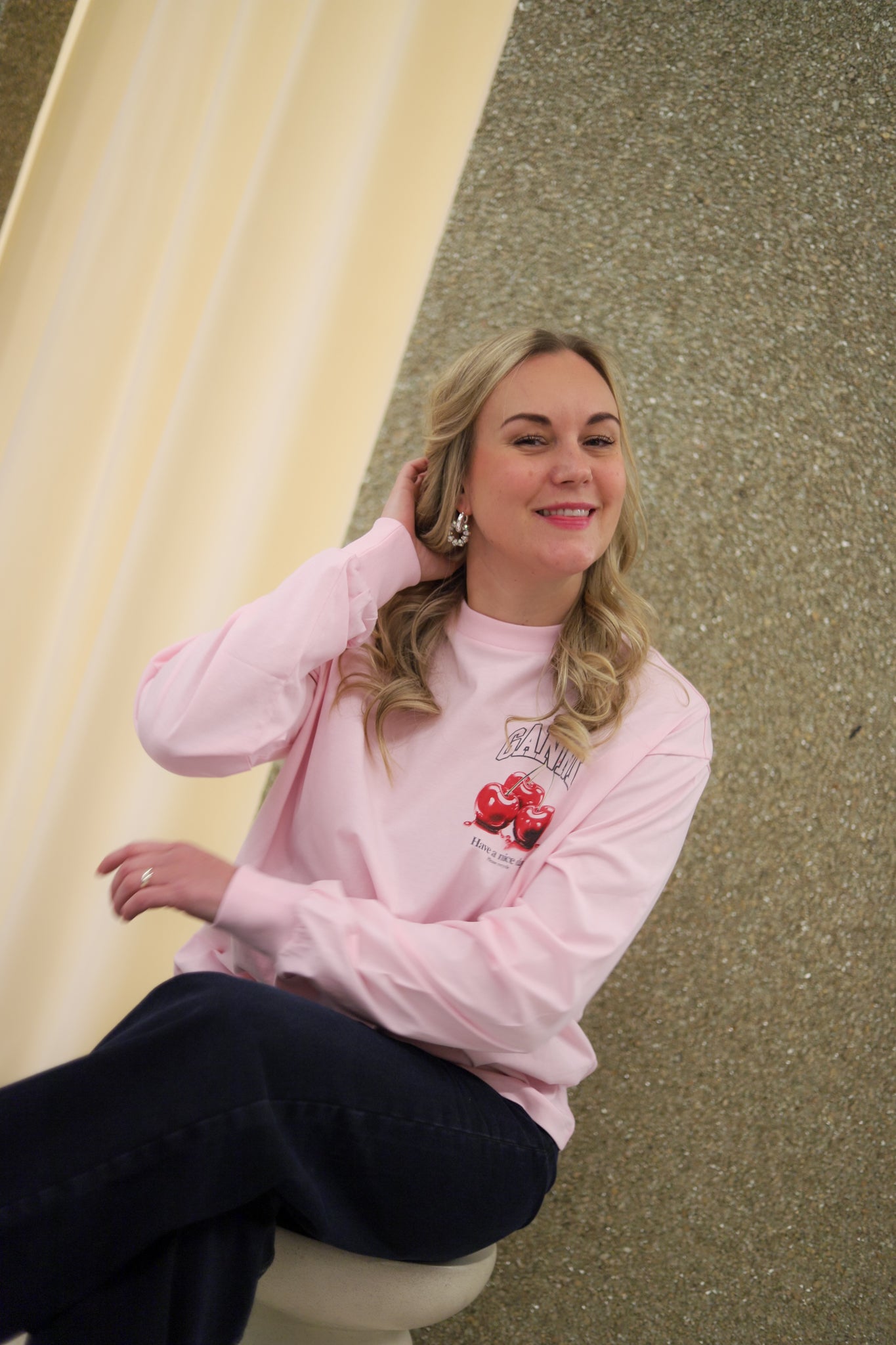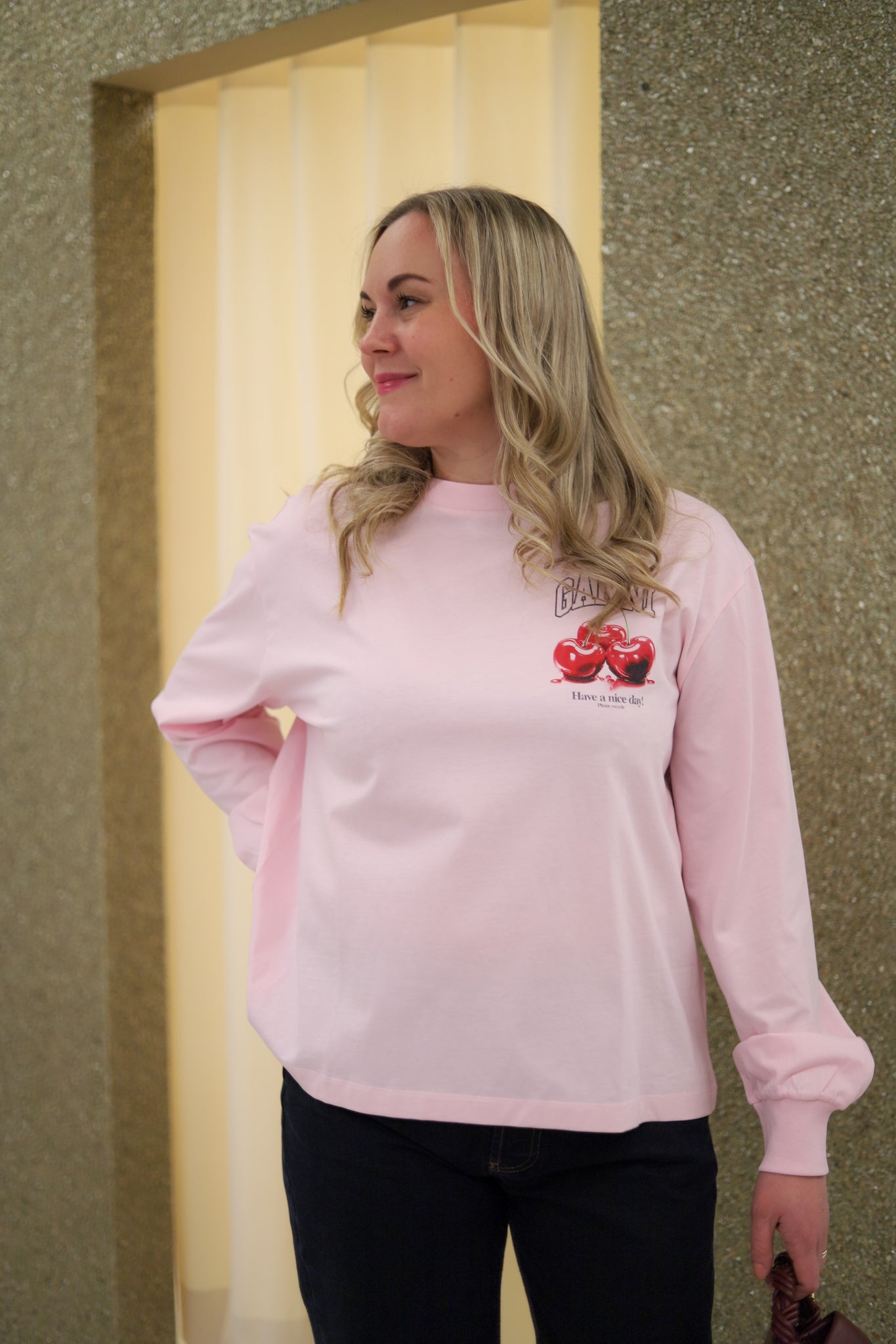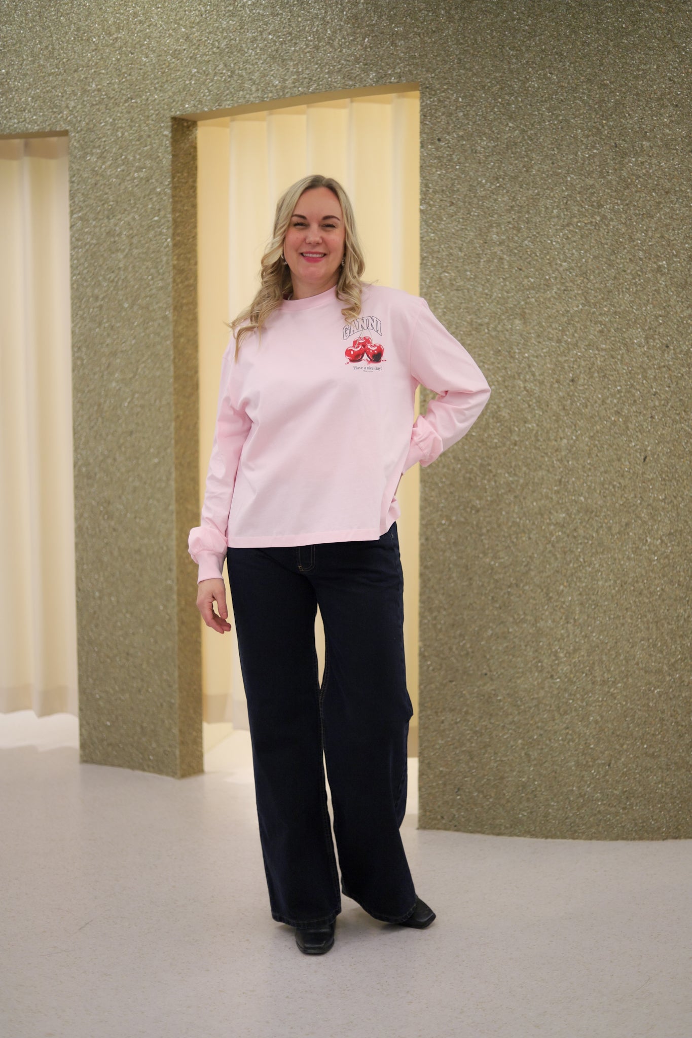 Langermet topp i lys rosa fra Ganni. Regulær crewneck modell med avslappet passform. Deilig myk bomullskvalitet med ribb i halsen. Leknet print på venste bryst med logo og kirsebær. Stilig topp til jeans og skjørt.