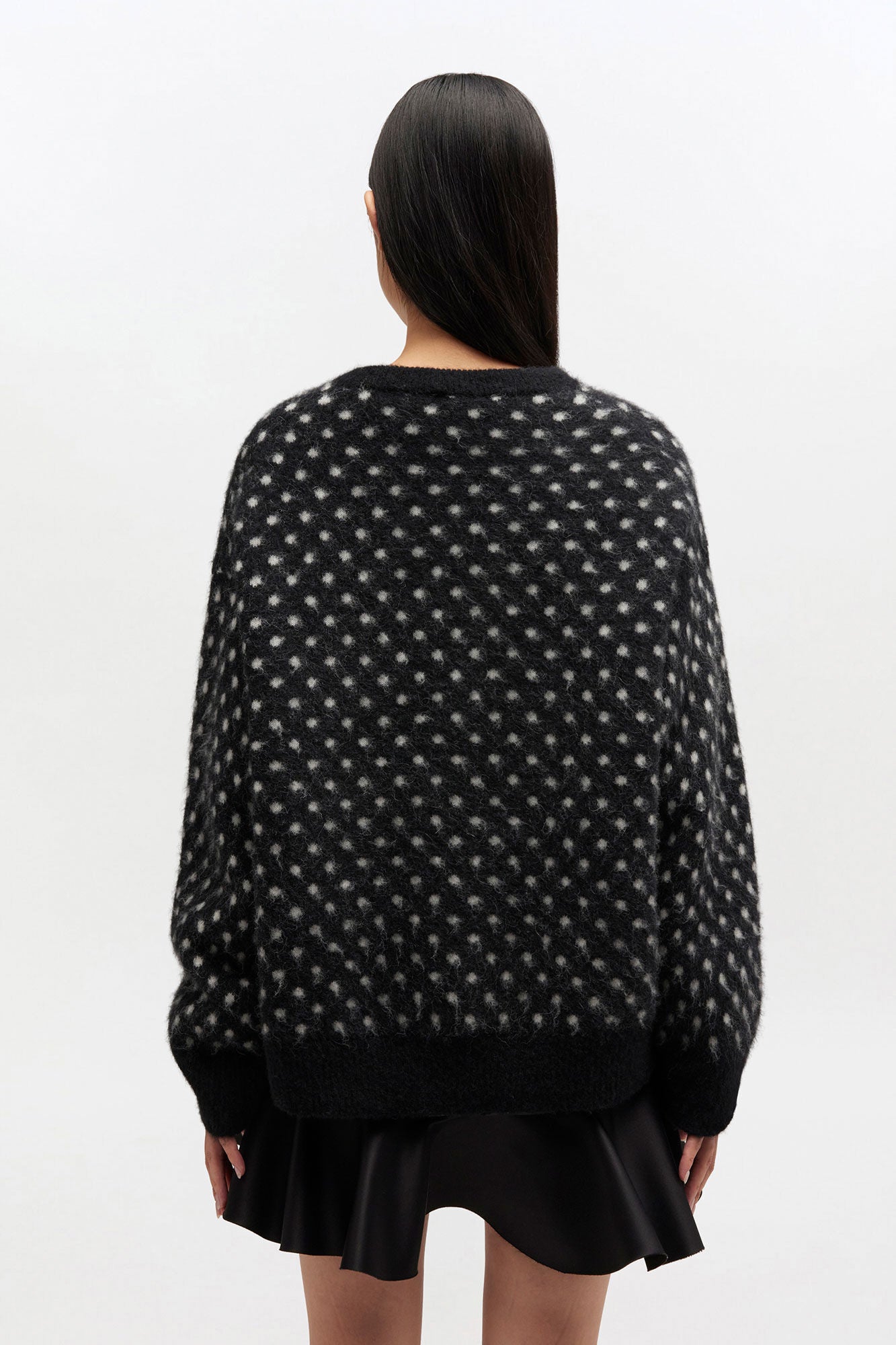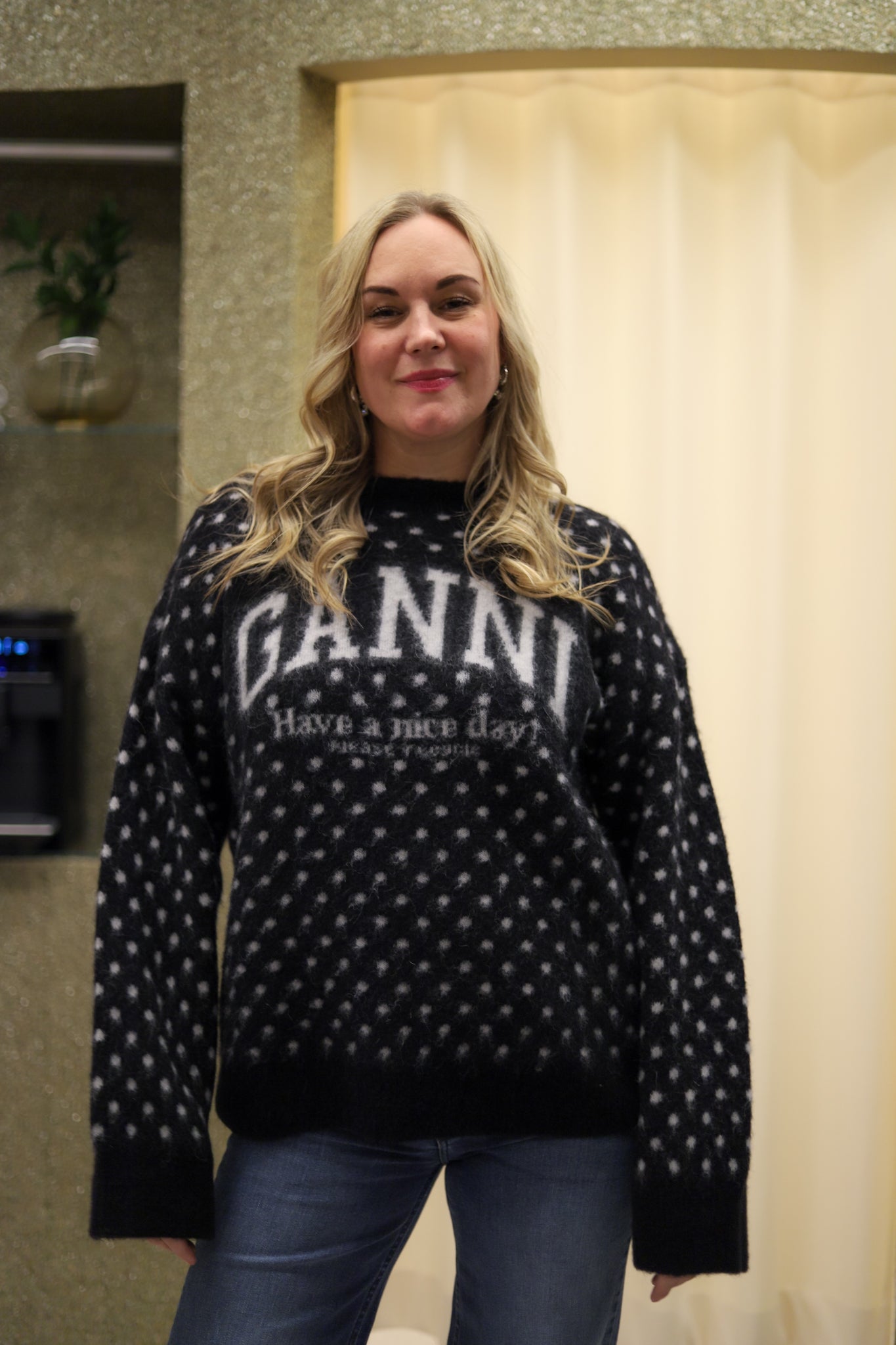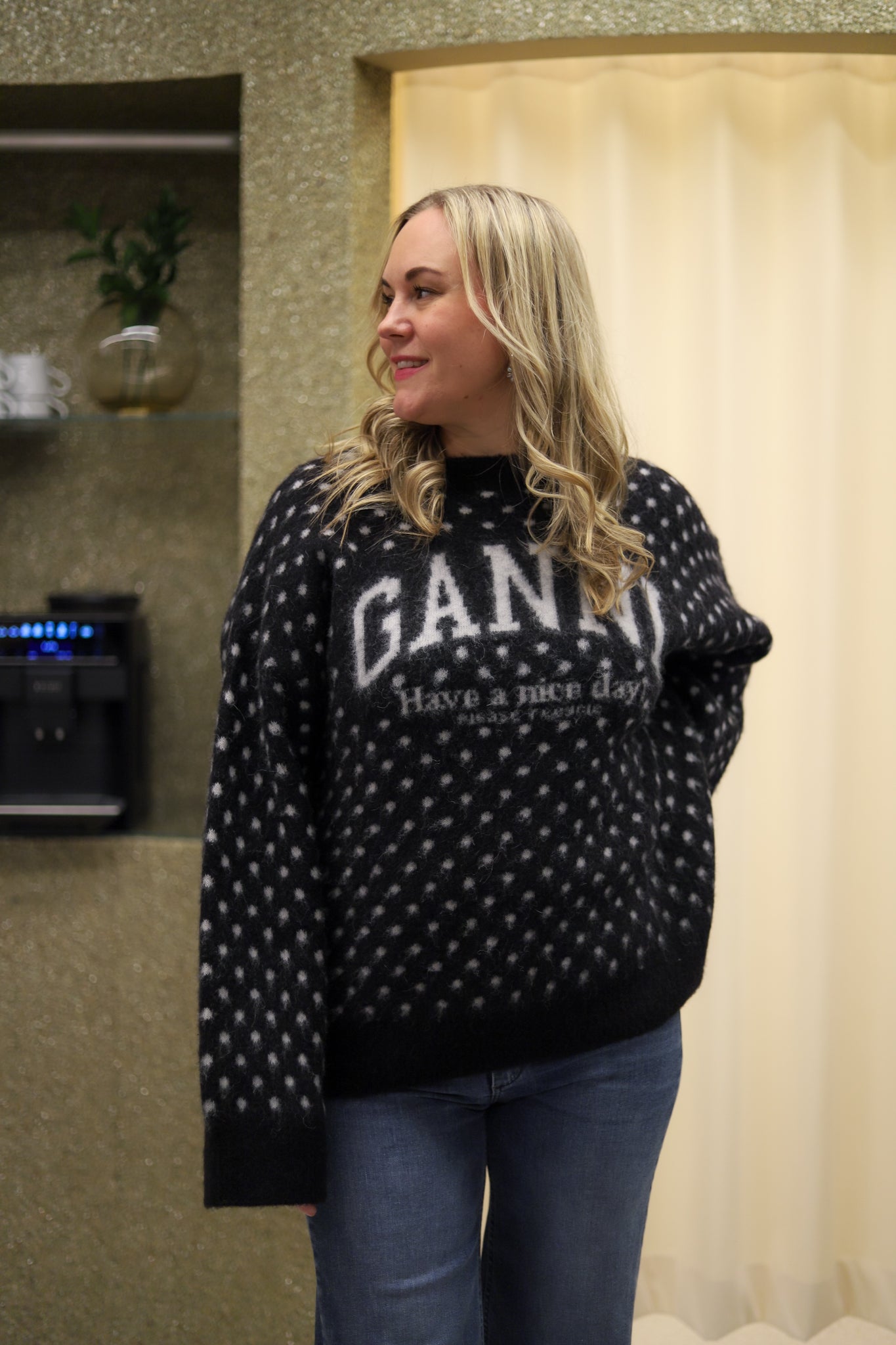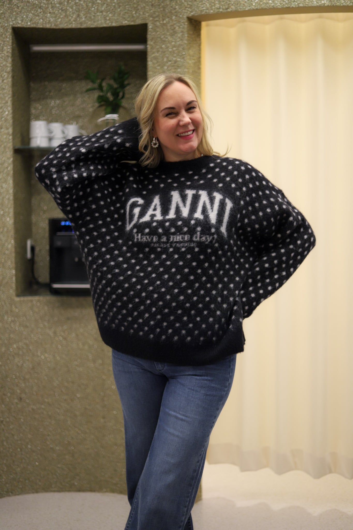 Deilig strikk i klassisk sort med trendy hvite prikker fra Ganni. Modellen er oversized med rund hals og lange ermer med droppet skulder. Ganni logo i front og teksten "have a nice day". Ribbestrikk i hals, hem og mansjett.