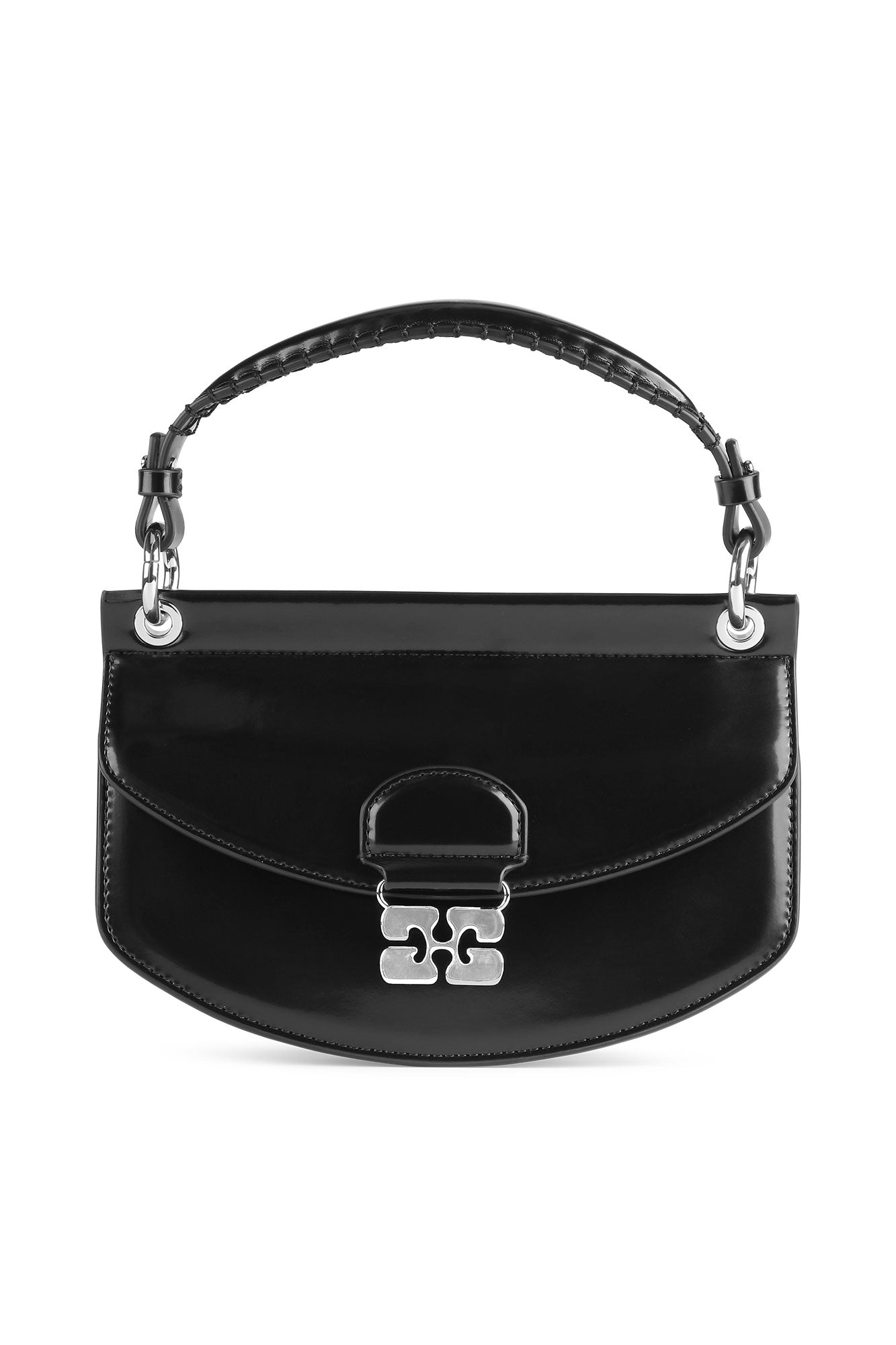 Stilig veske i klassisk sort lakkuttrykk fra Ganni. Vesken har magnetisk lukking med en sølvfarget GANNI «Butterfly»-lås og en avtakbar stropp og topphåndtak, slik at den kan brukes både som skulderveske eller clutch. På innsiden har vesken en stikklomme og tre hovedrom, hvorav ett er med glidelåslukking. Nydelig veske med lekre detaljer i sølv.