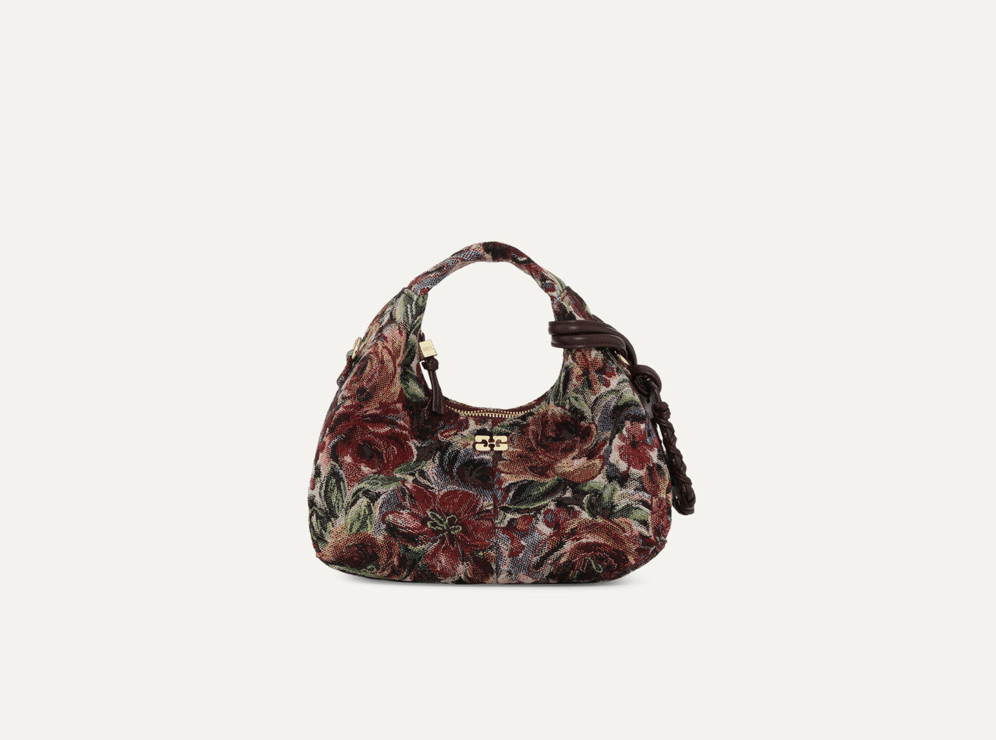 Stilig veske i flerfarget blomsterprint fra Ganni. Modellen har topphåndtak, justerbar og avtakbar stropp og glidelåslukking. Den har korsettdetaljer med snøring, merkelapp i speil og gullfargede detaljer for en elegant look.
