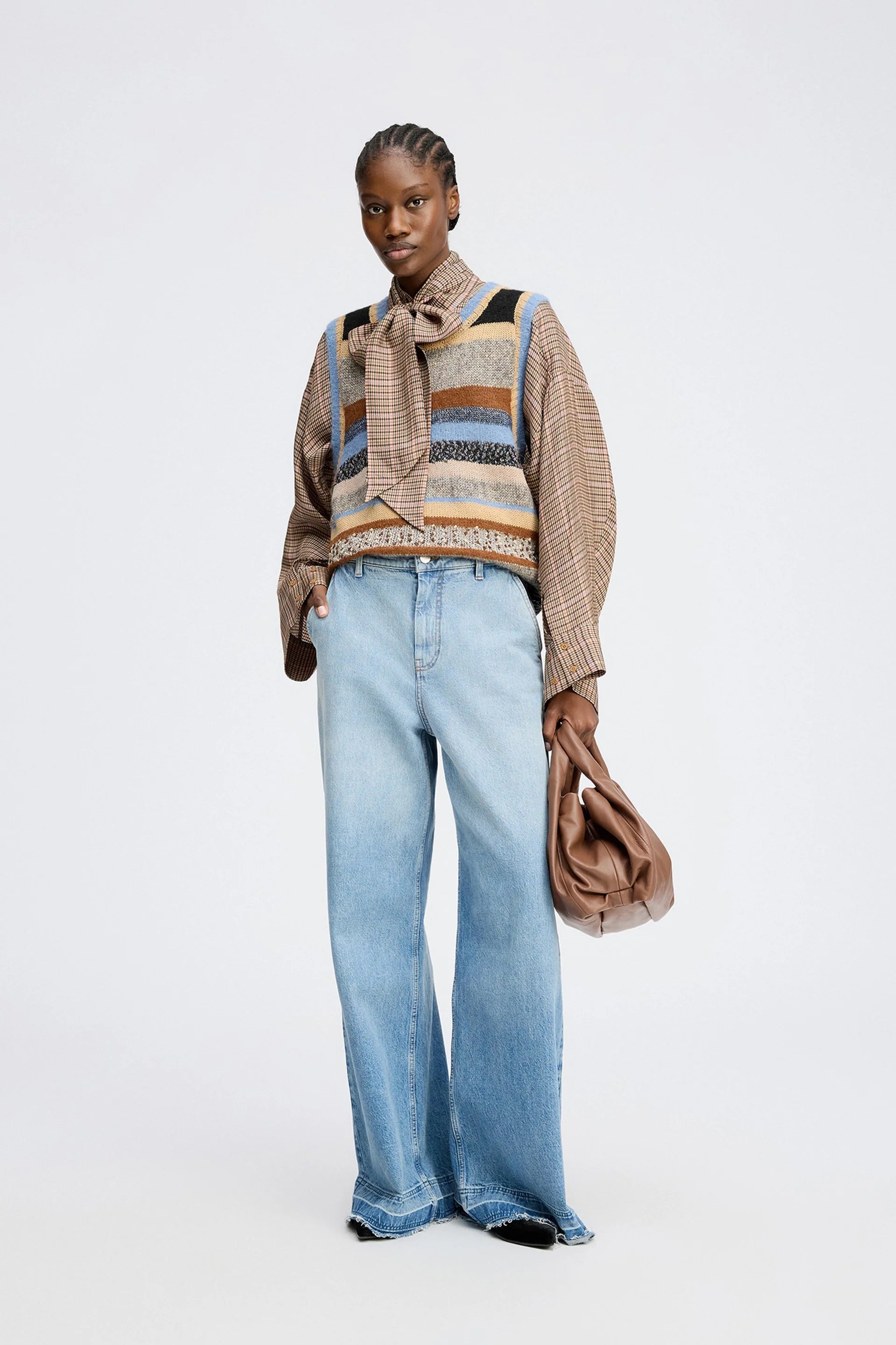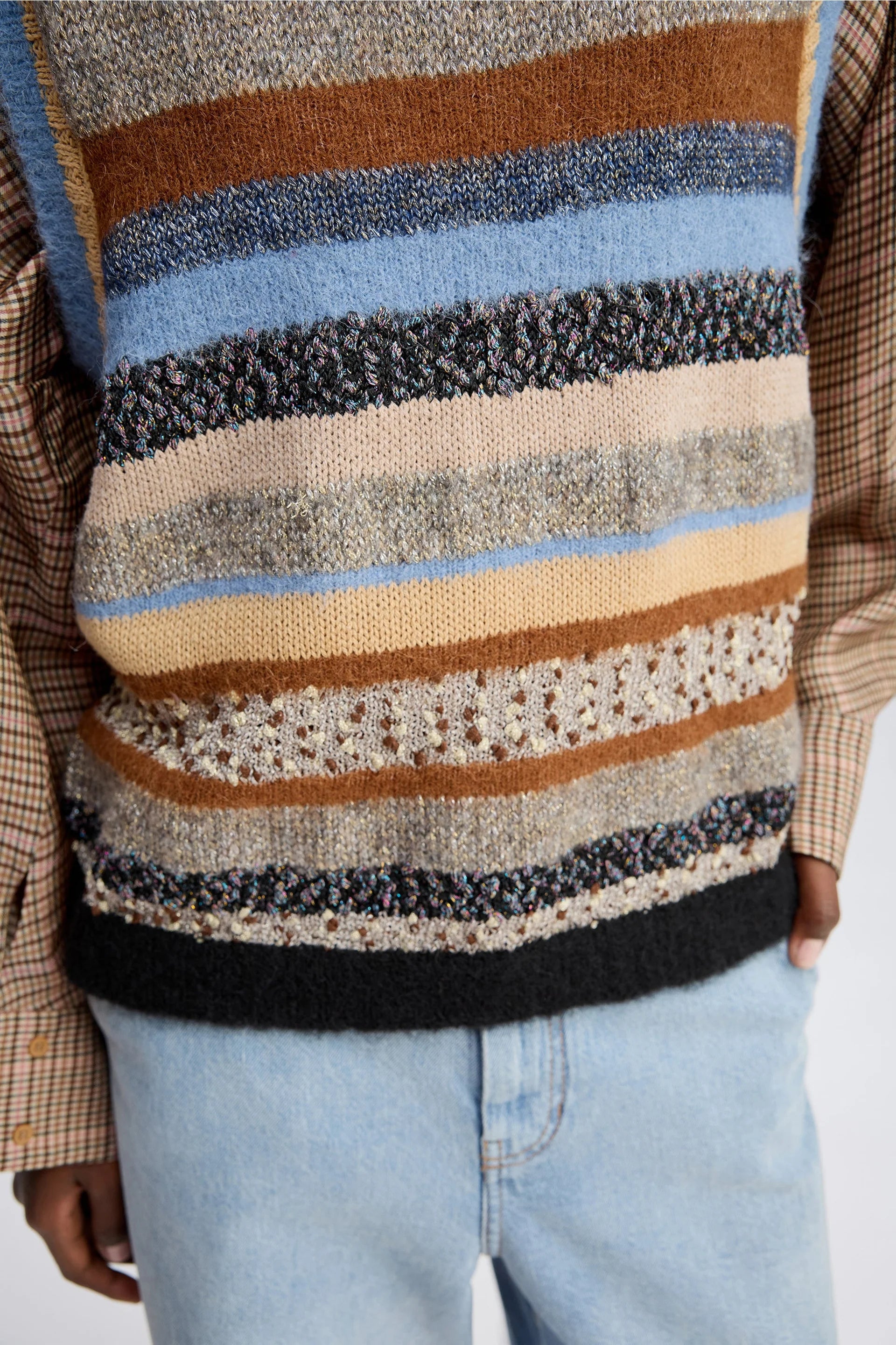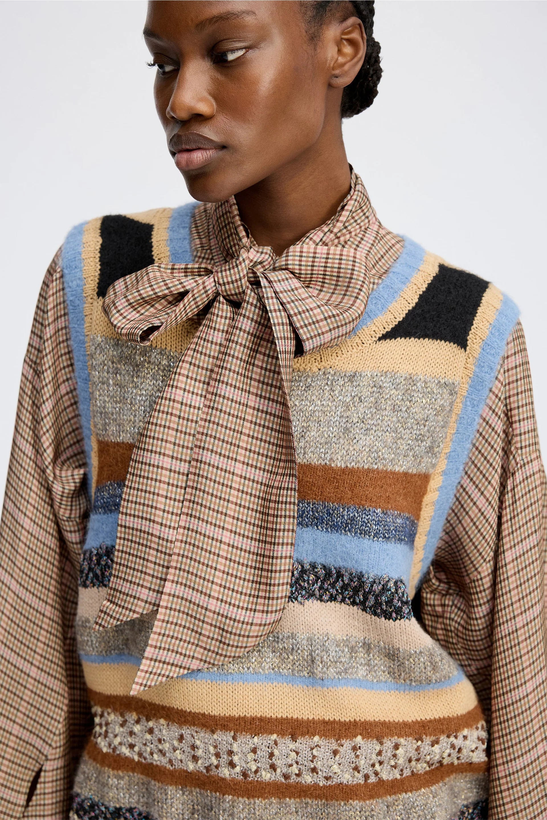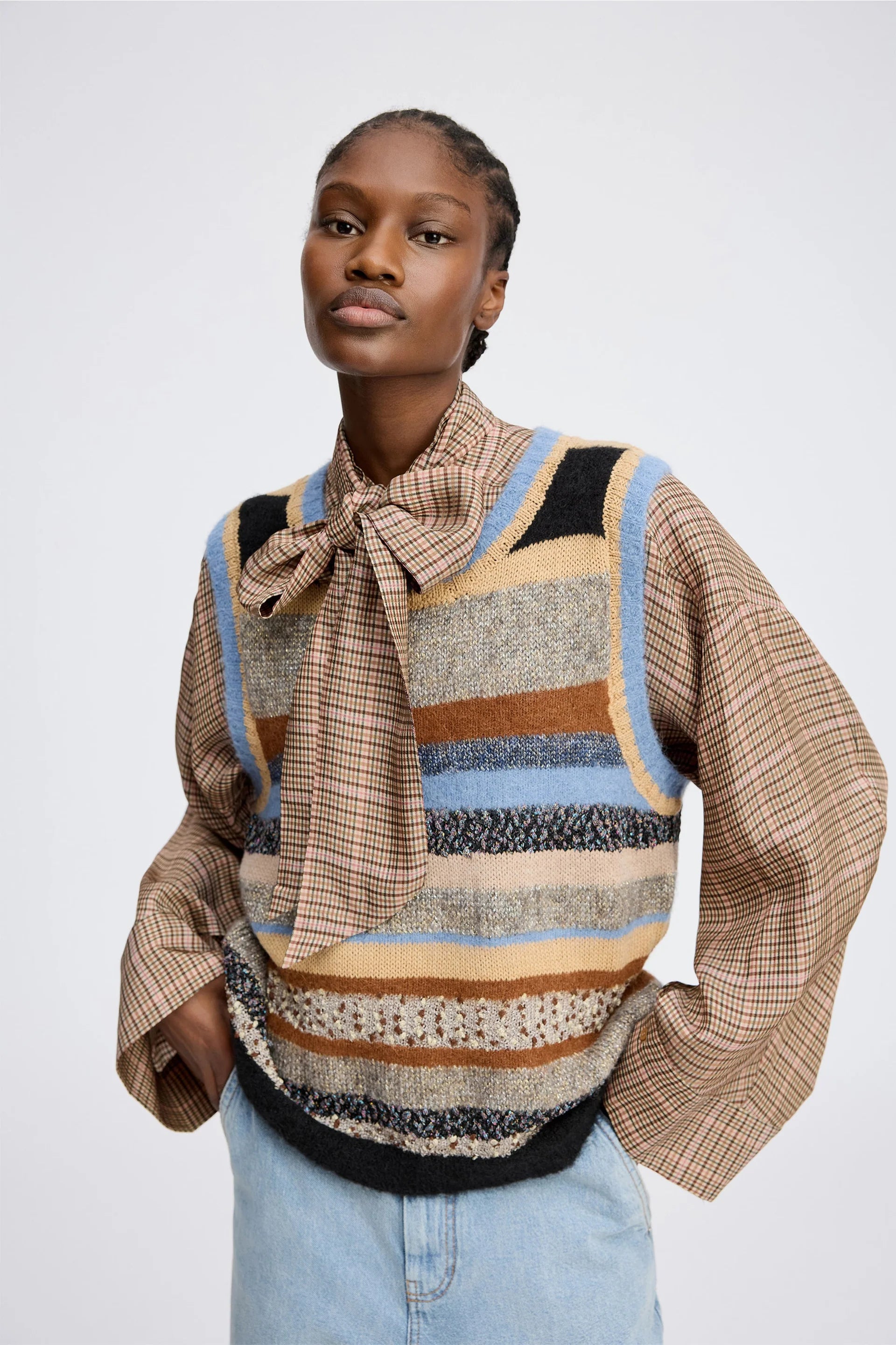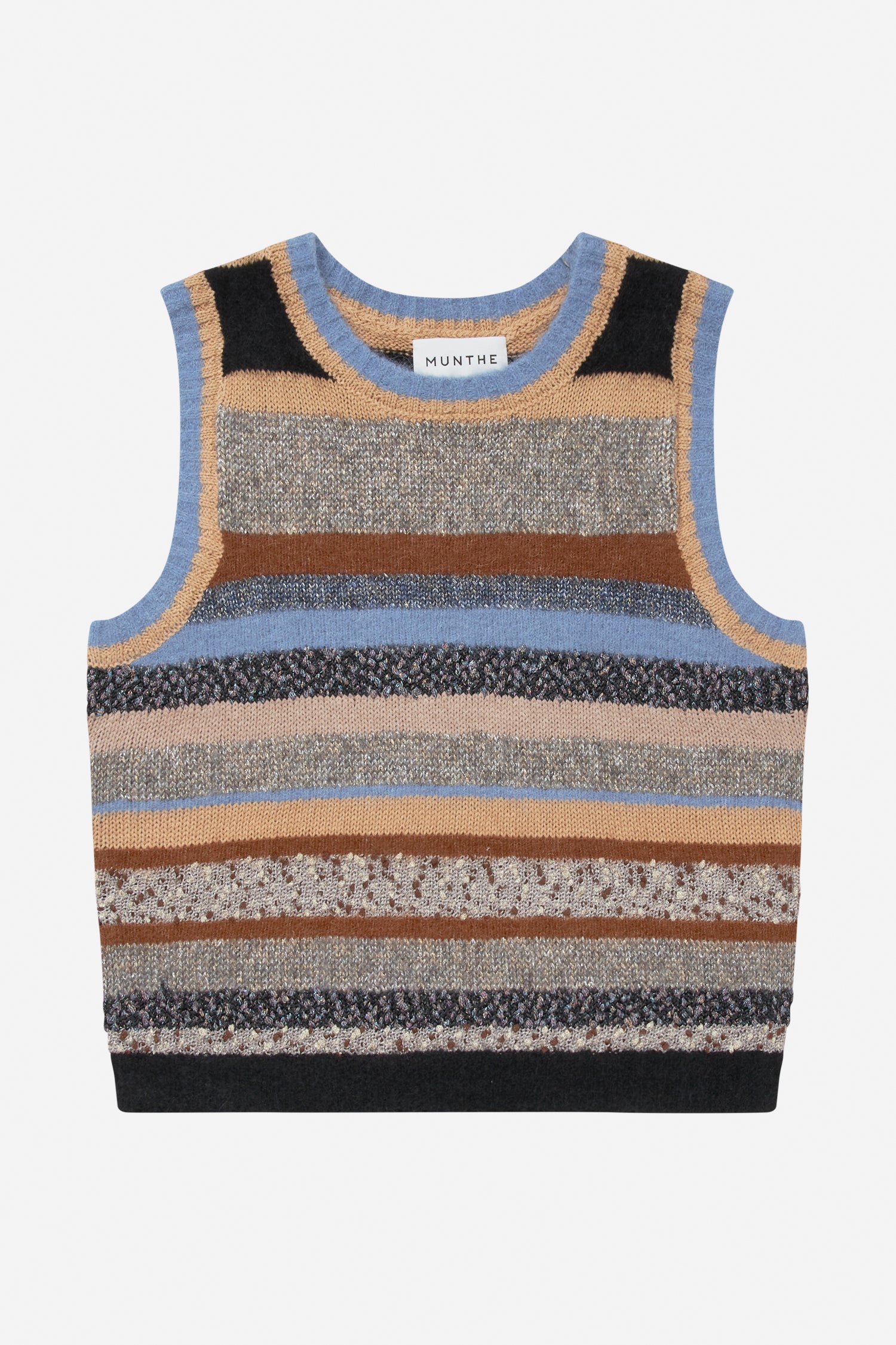 Fresh strikket vest i lekre toner fra Munthe. Klassisk modell med rund hals, rett passform og hoftelengde. Strikket med elegante striper i ulike kavaliteter og farger. Style vesten over en polo eller skjorte!