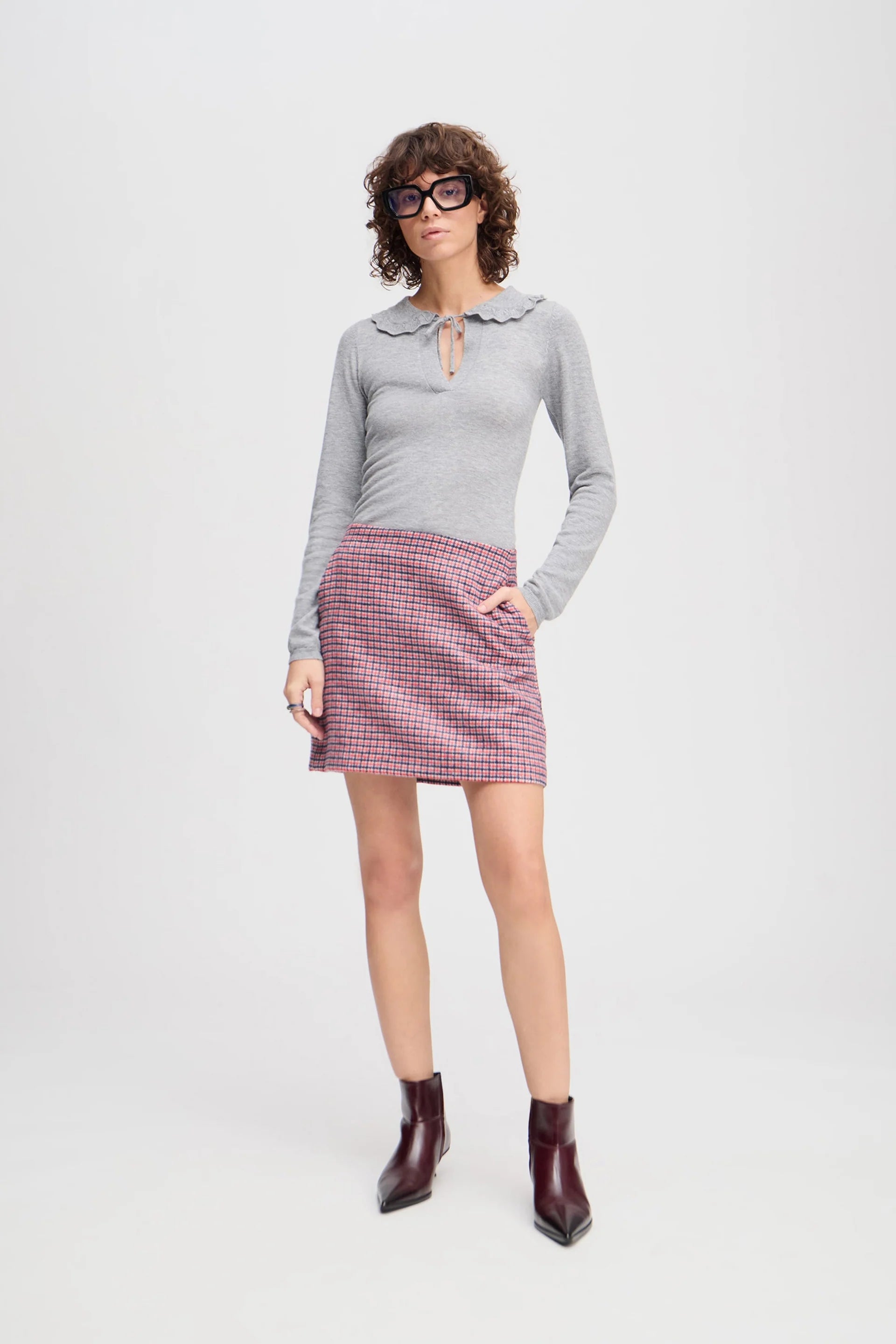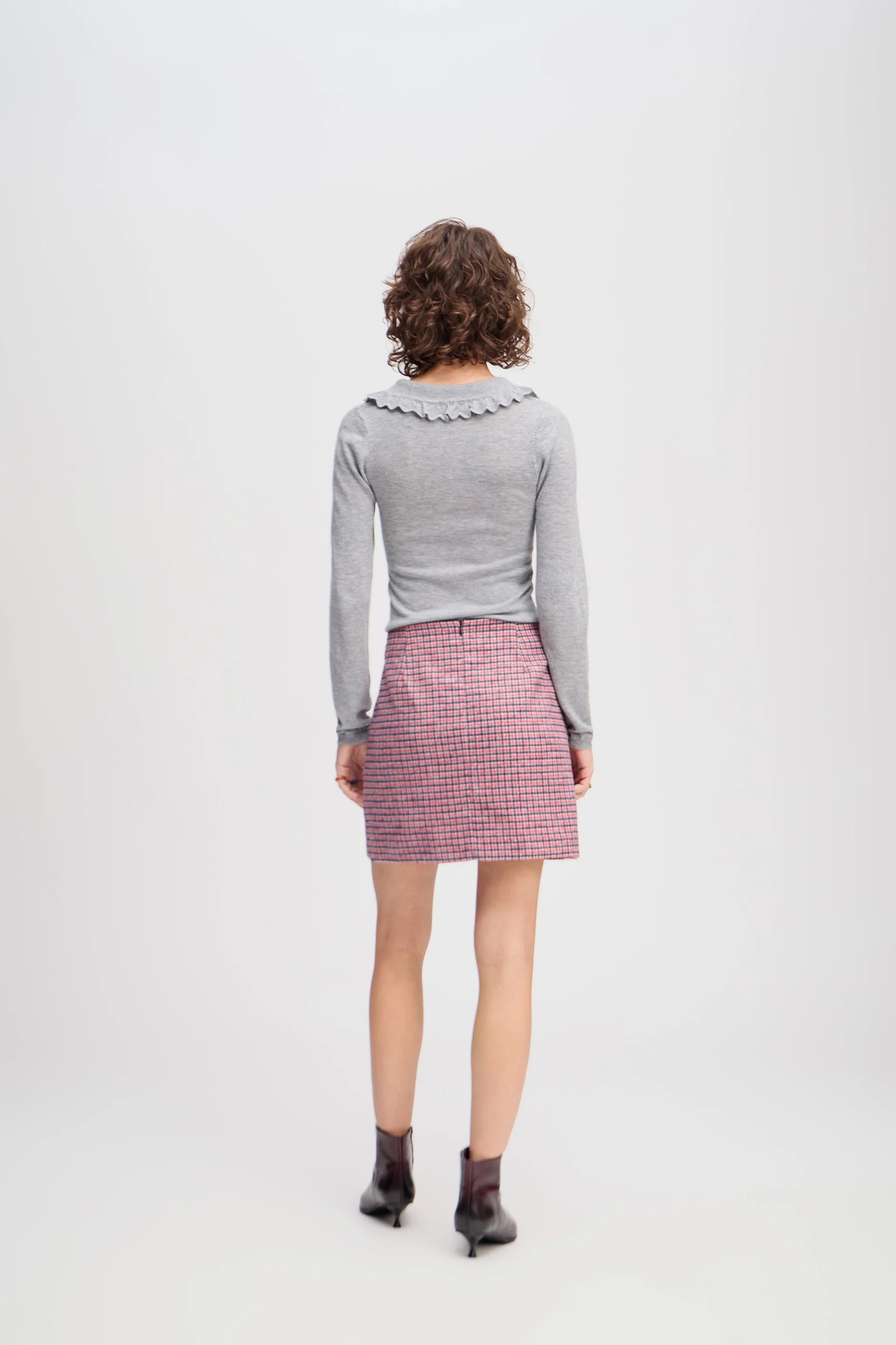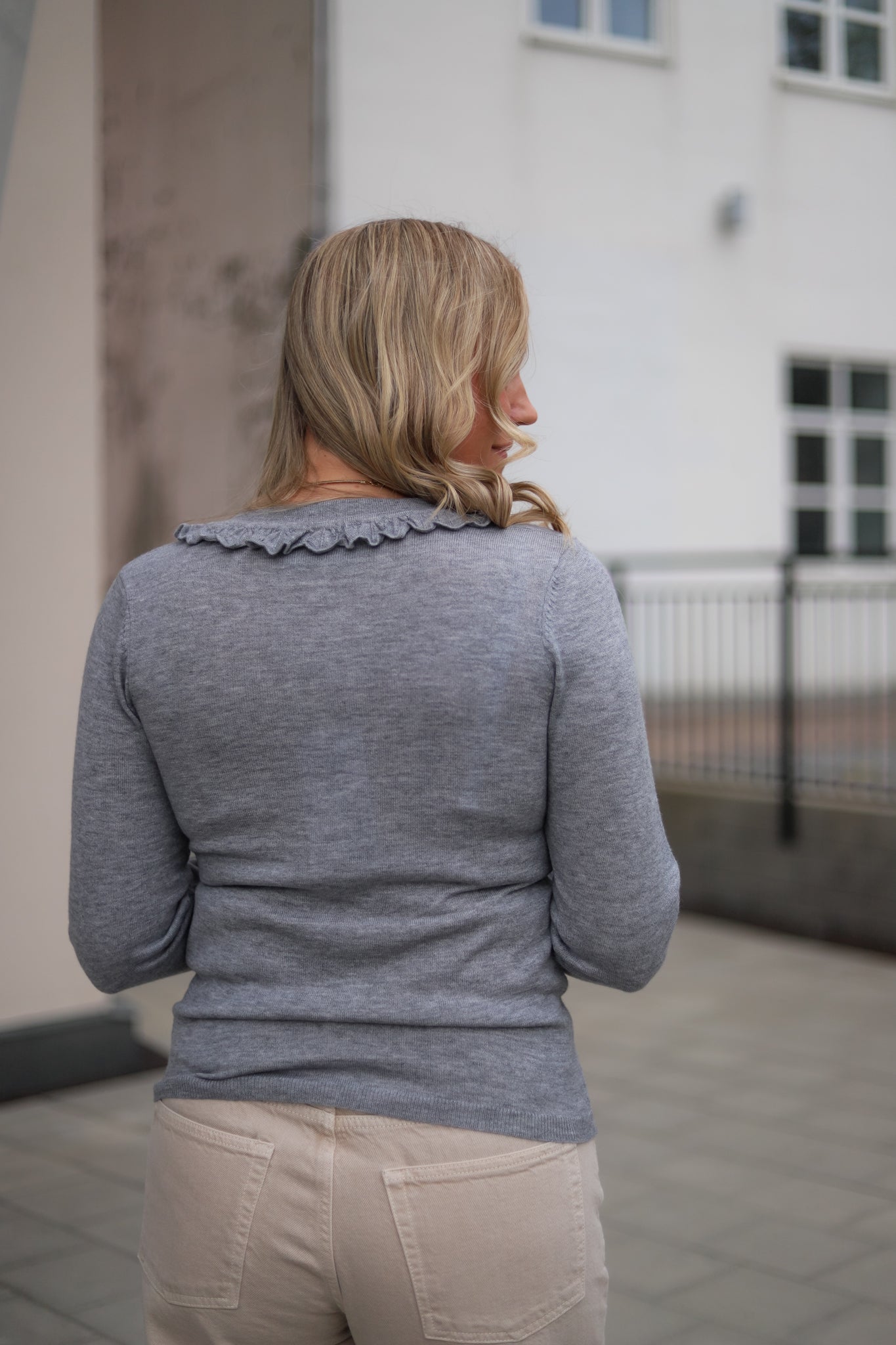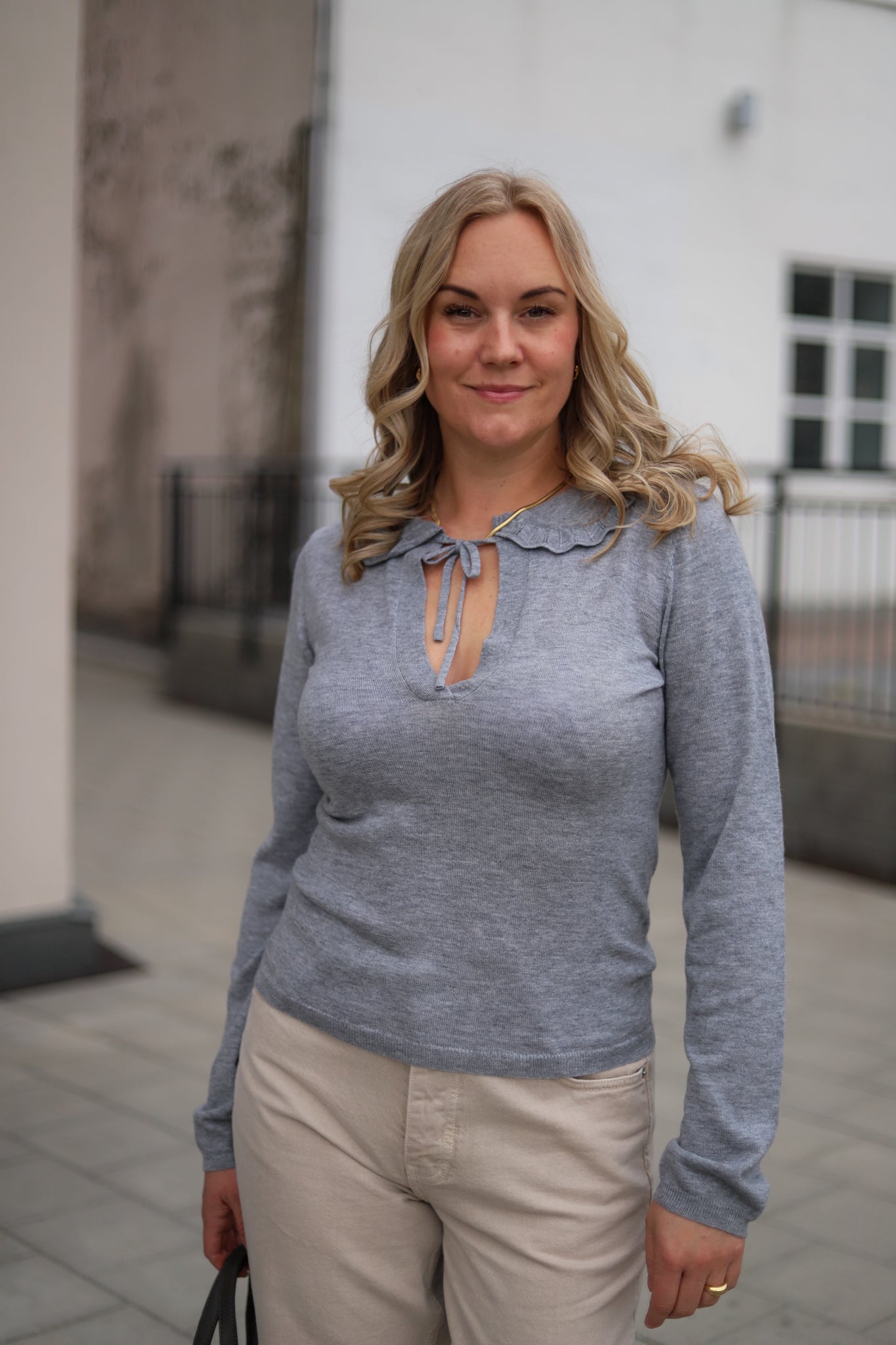 Polo-strikk med elegante detaljer i kragen fra Munthe. Deilig tynn og myk ullblanding i tidløs gråmelert farge. Genseren har v-hals og feminin knyting i halsen. Passformen er smal og ettersittende med smal ribb i mansjett og langs hem. Søt tynnstrikket topp som er pen alene eller under en blazer.