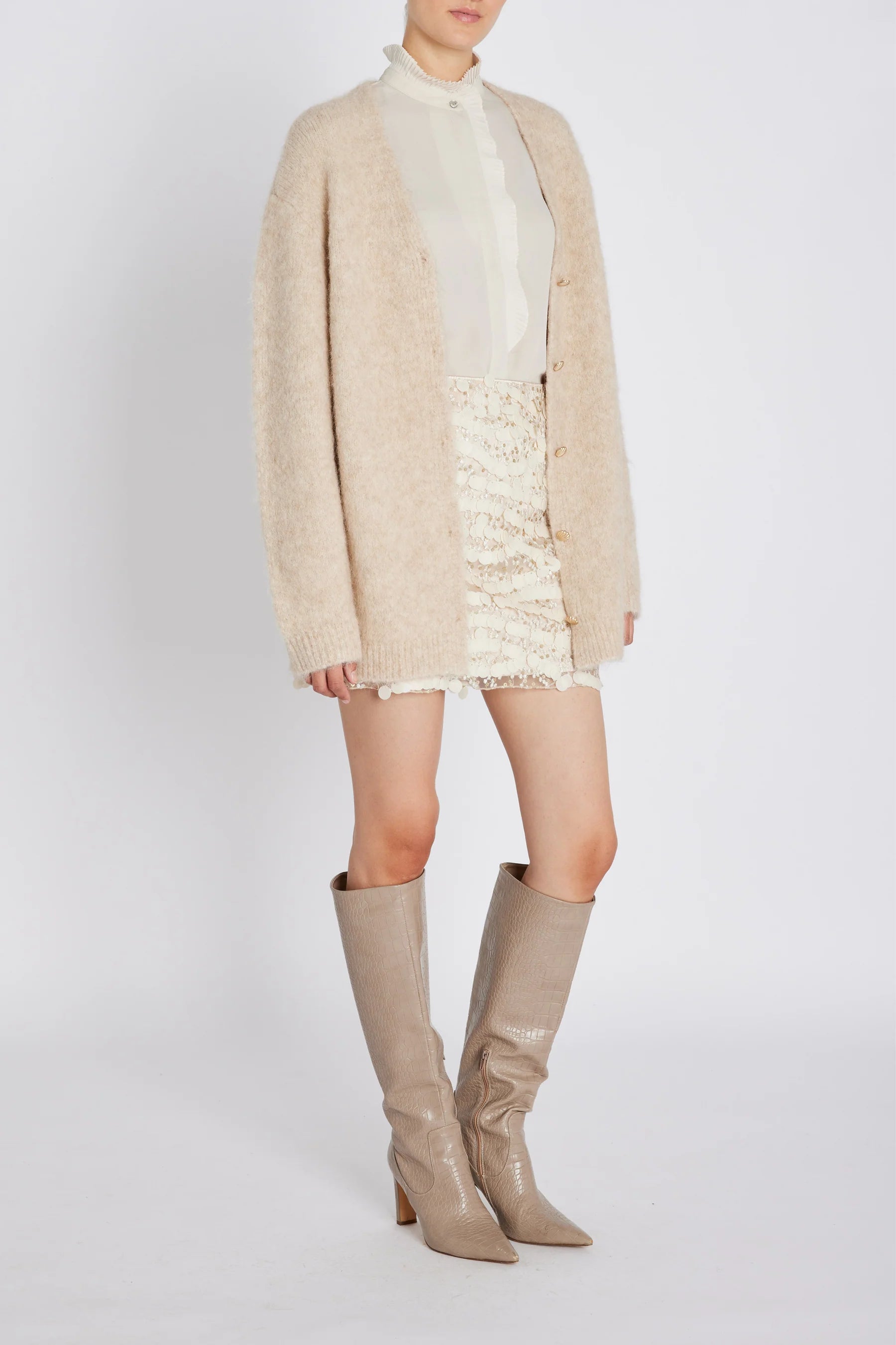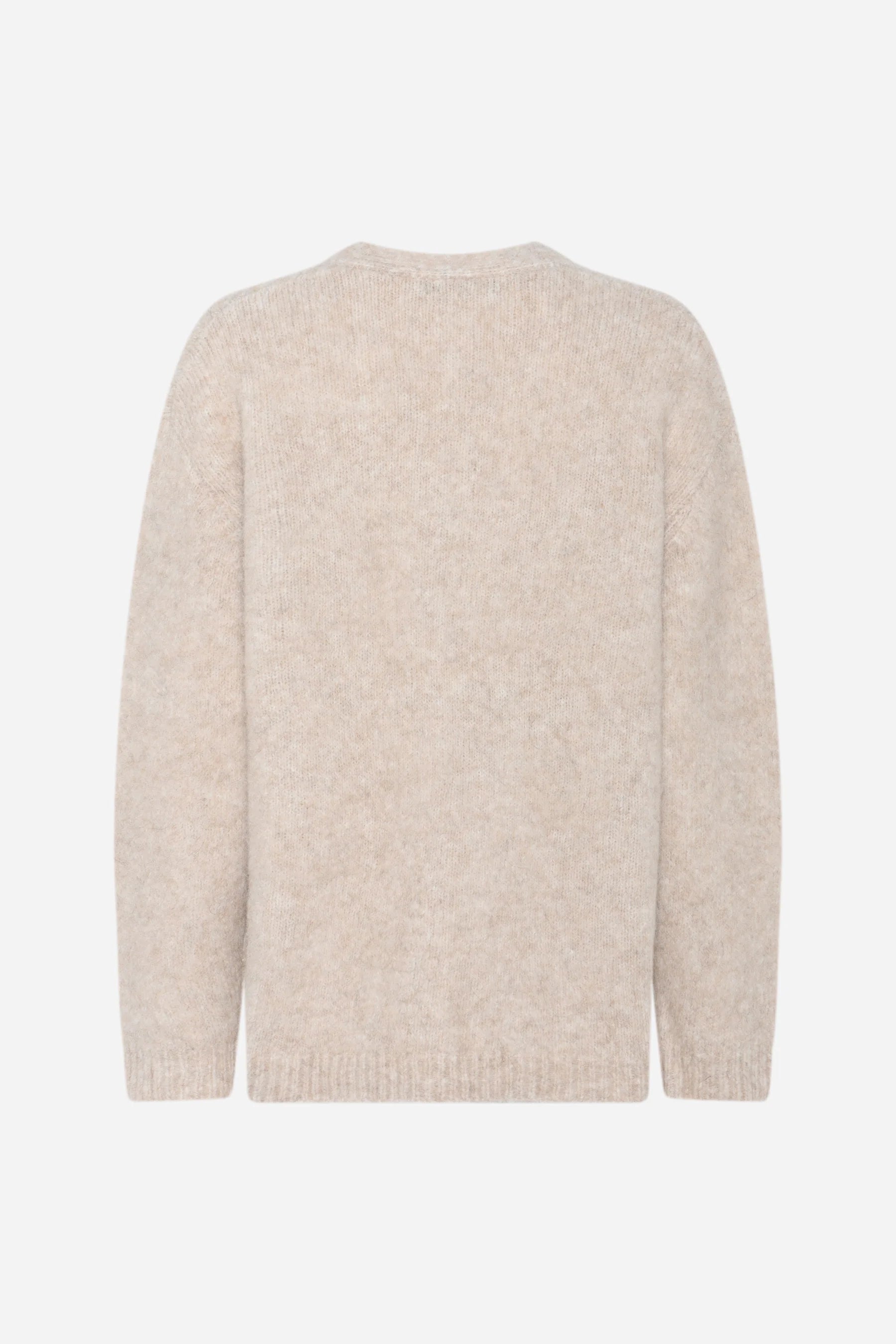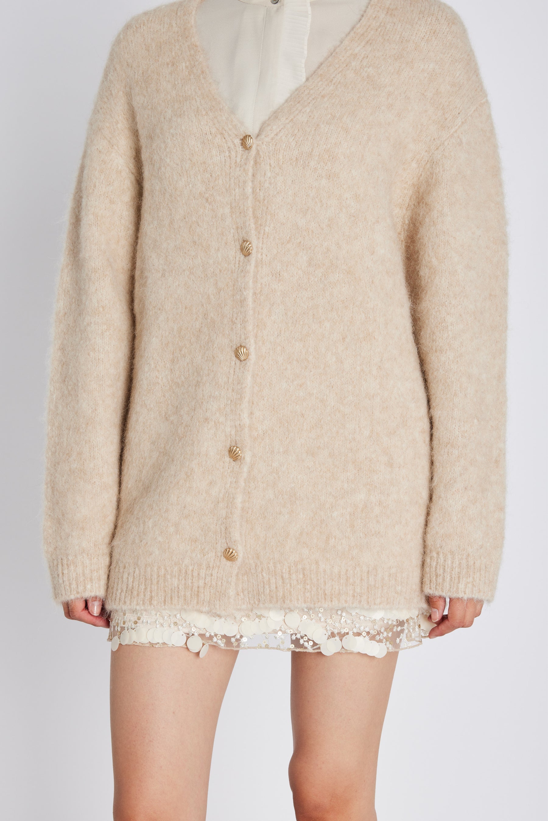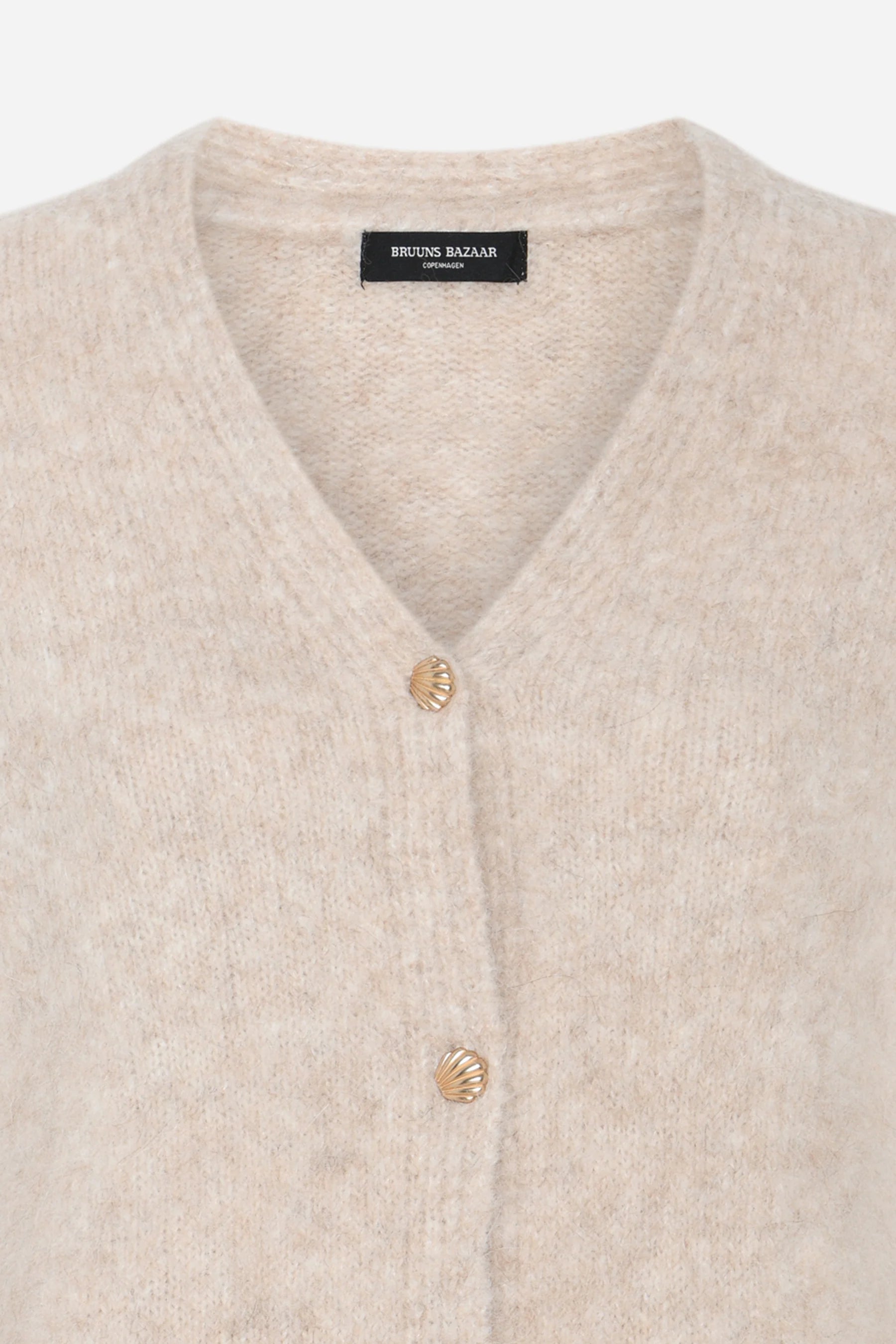 Nydelig cardigan i beige alpakkamix fra Bruuns Bazaar. Modellen er rett med god lengde til under baken og lange ermer med droppet skulder. Den har V-hals og dekorative knapper i gull, formet som skjell. Ribbestrikk i hals, hem og mansjett. Bruk den over en kjole for et lag-på-lag looken eller style den med dine favorittjeans og boots.