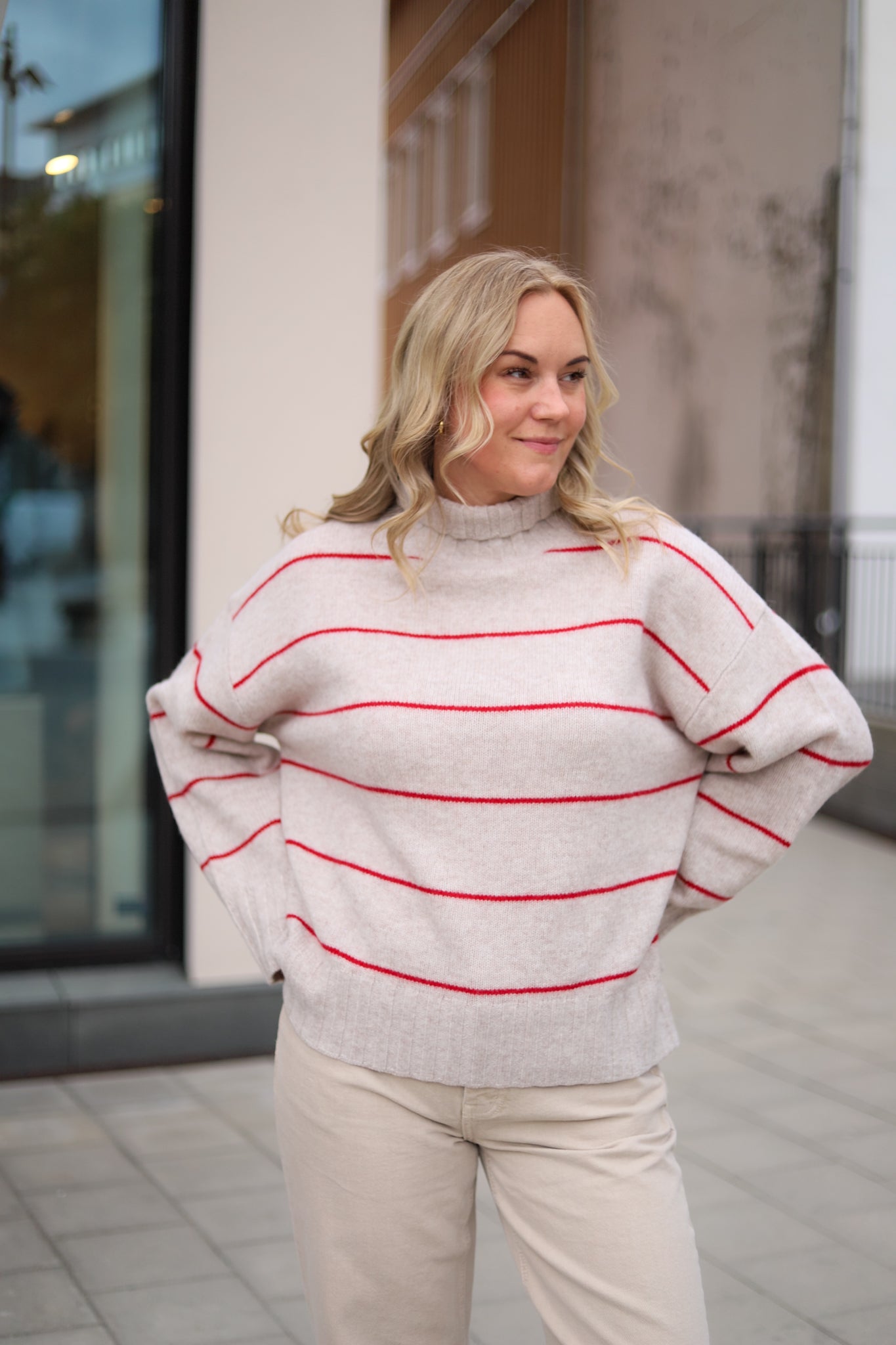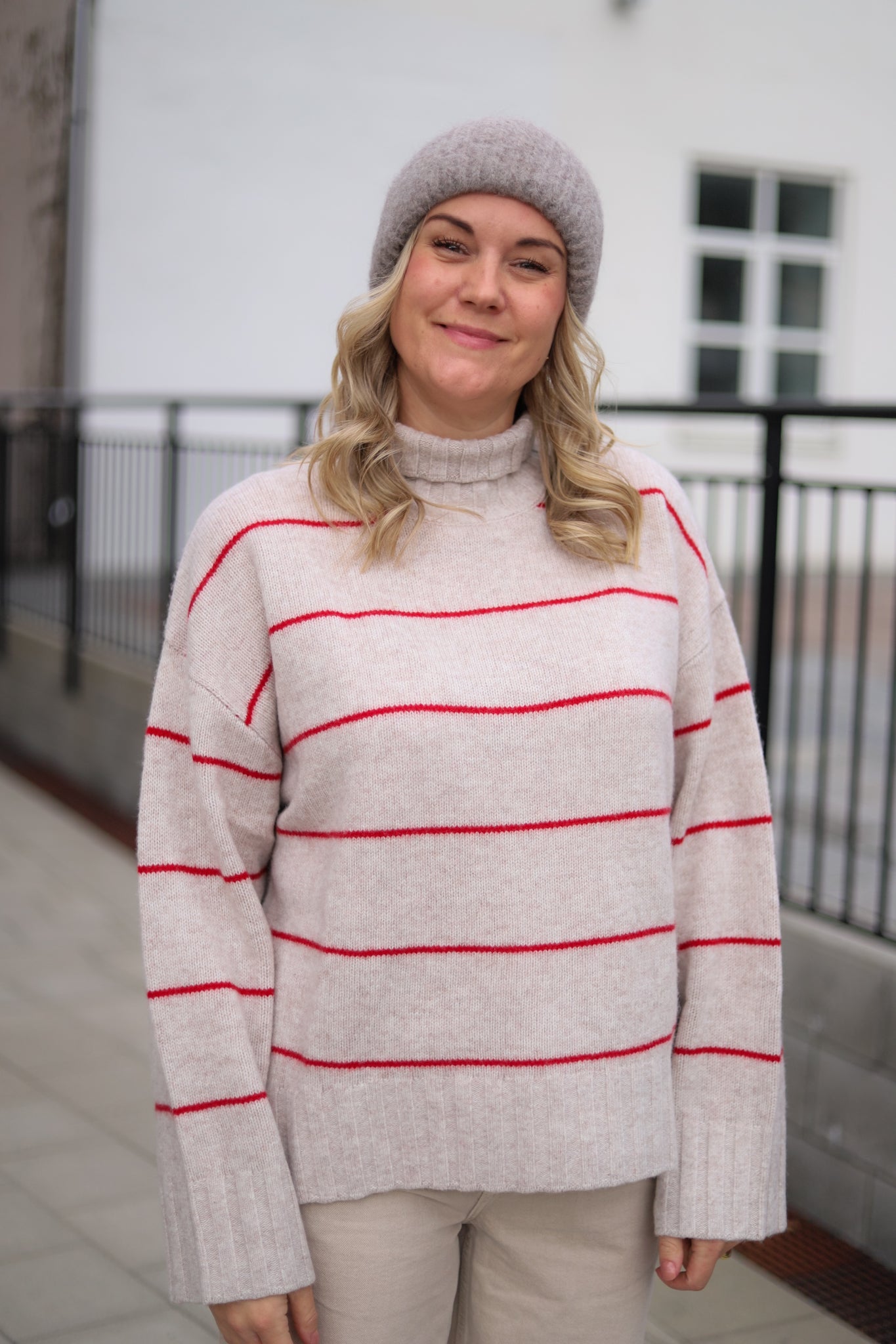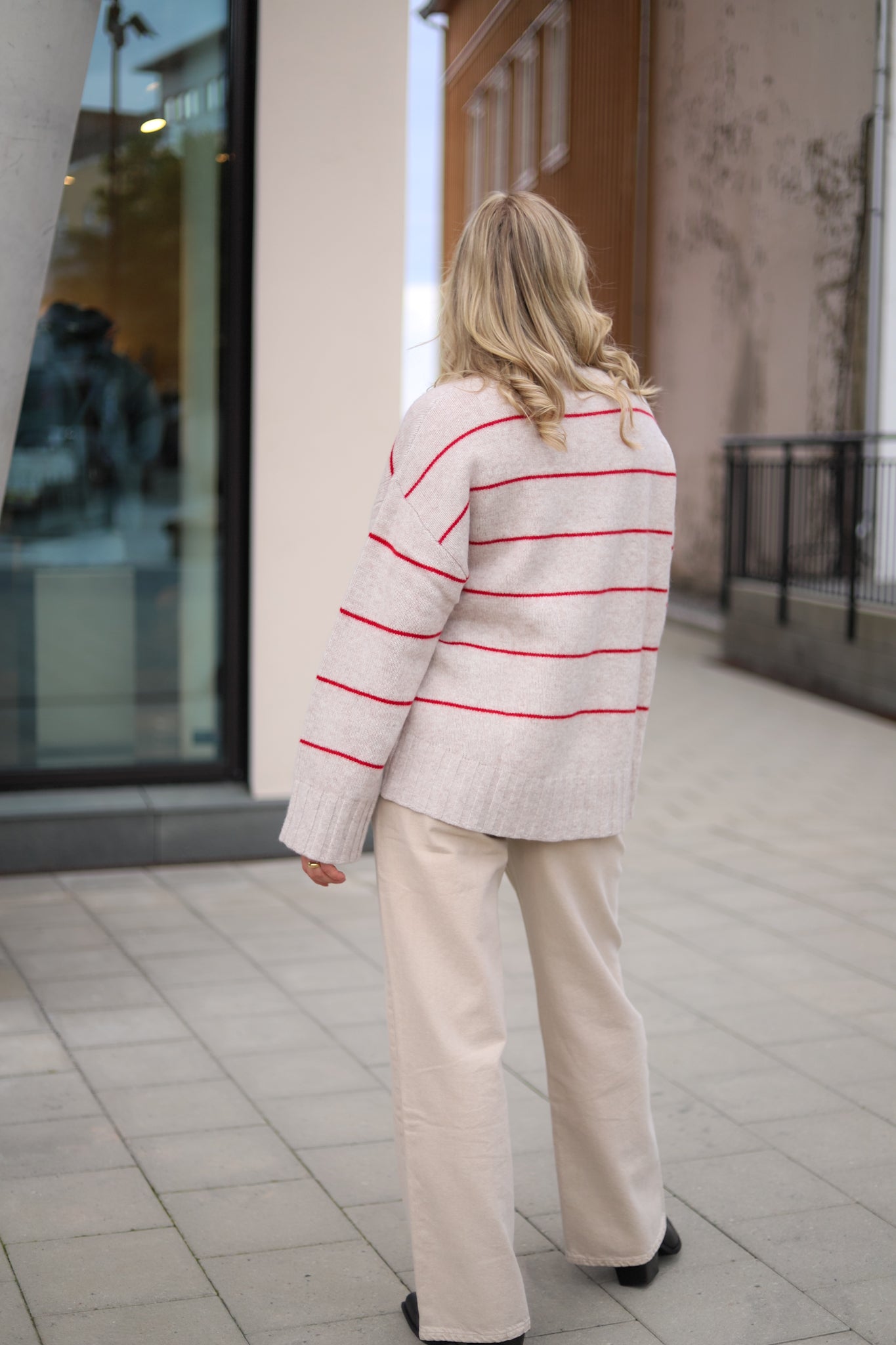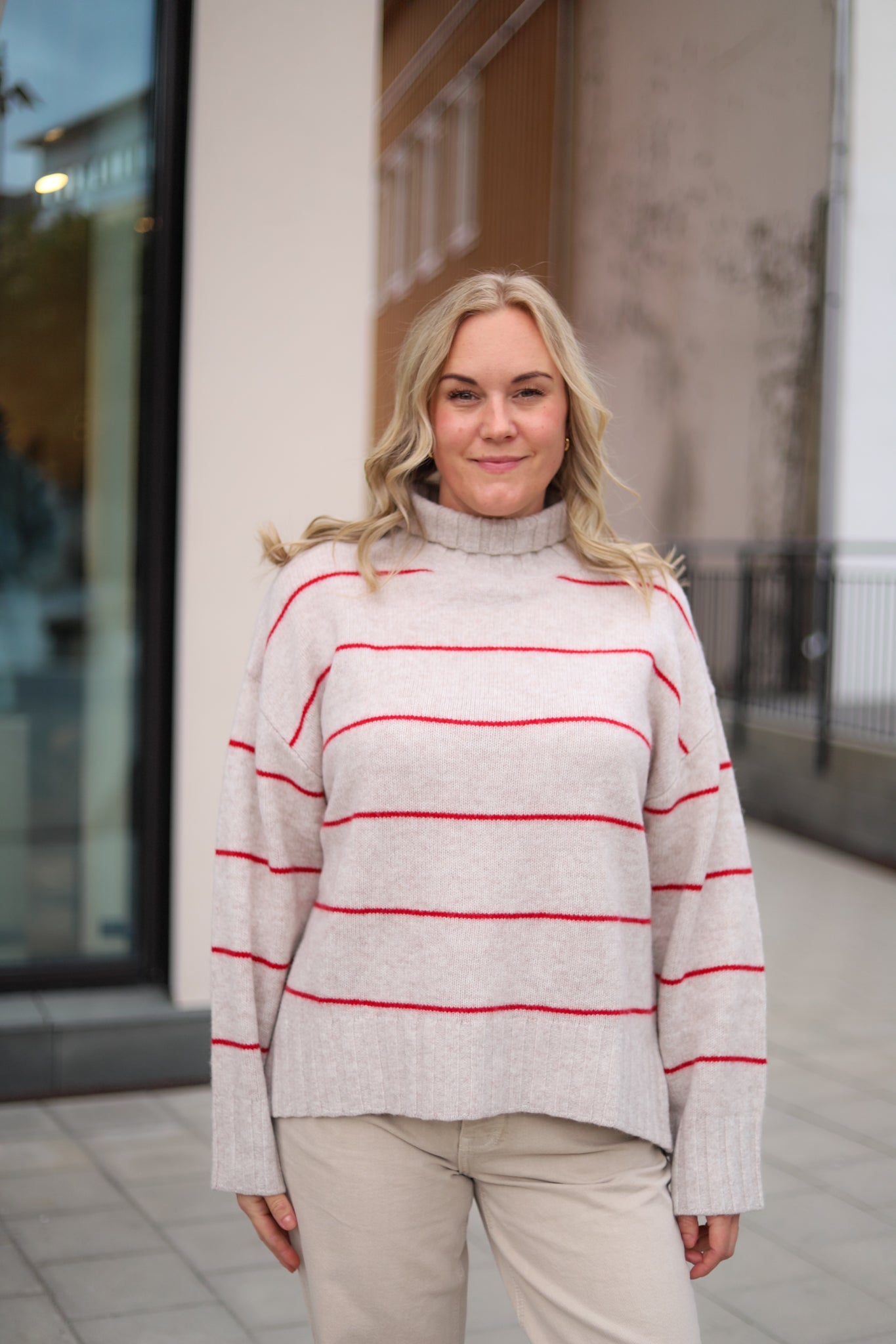 Stilig strikk i beige med røde striper fra Camilla Pihl. Modellen er rett med avslappet passform, semihøy hals og lange ermer med droppet skulder. Ribbestrikk i hals, hem og mansjett gir en diskré struktur til den myke, avslappede looken. Denne allsidige strikken er det perfekte garderobegrunnlaget – ideelt for lag-på-lag eller bruk alene gjennom sesonger.