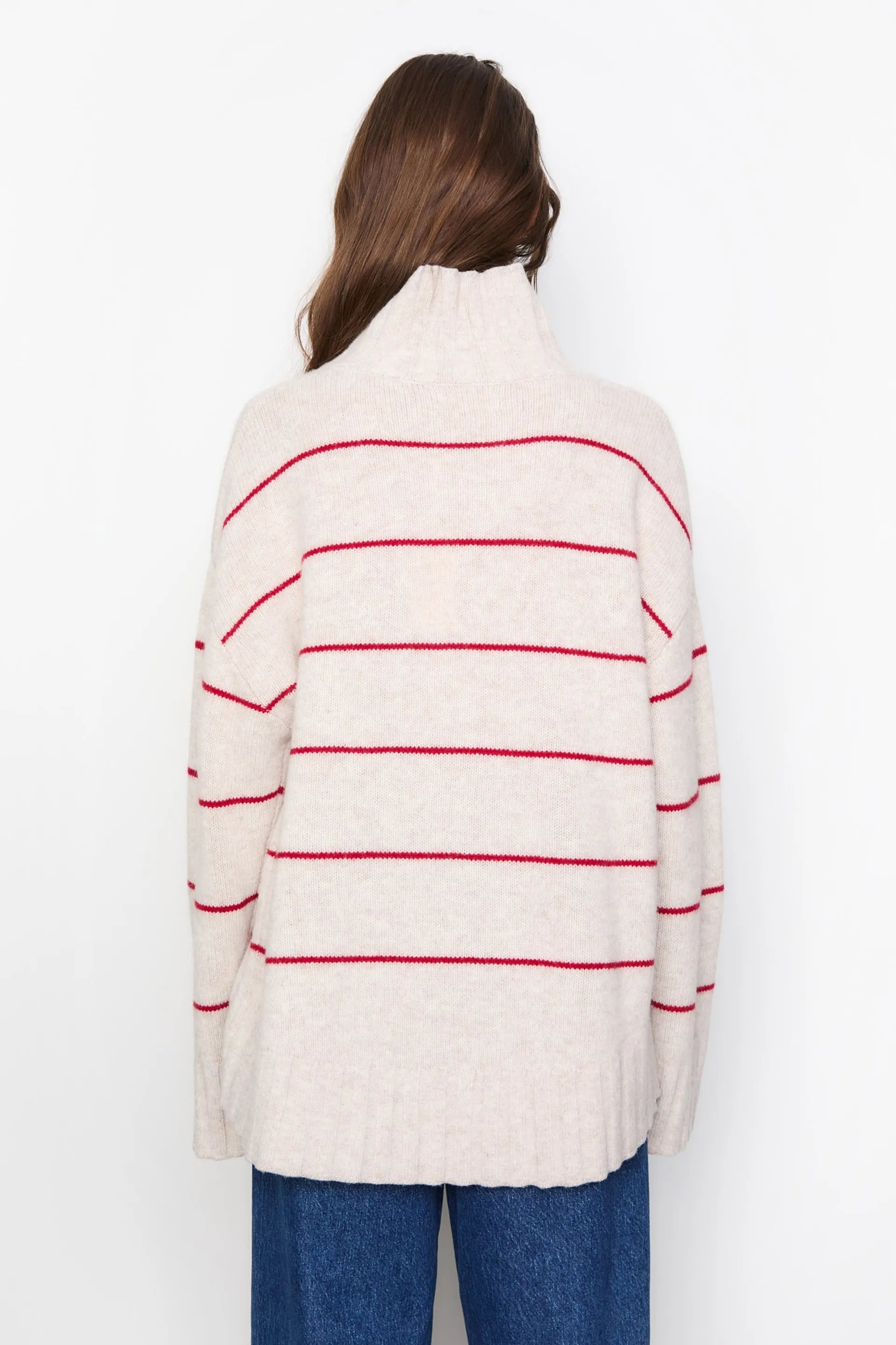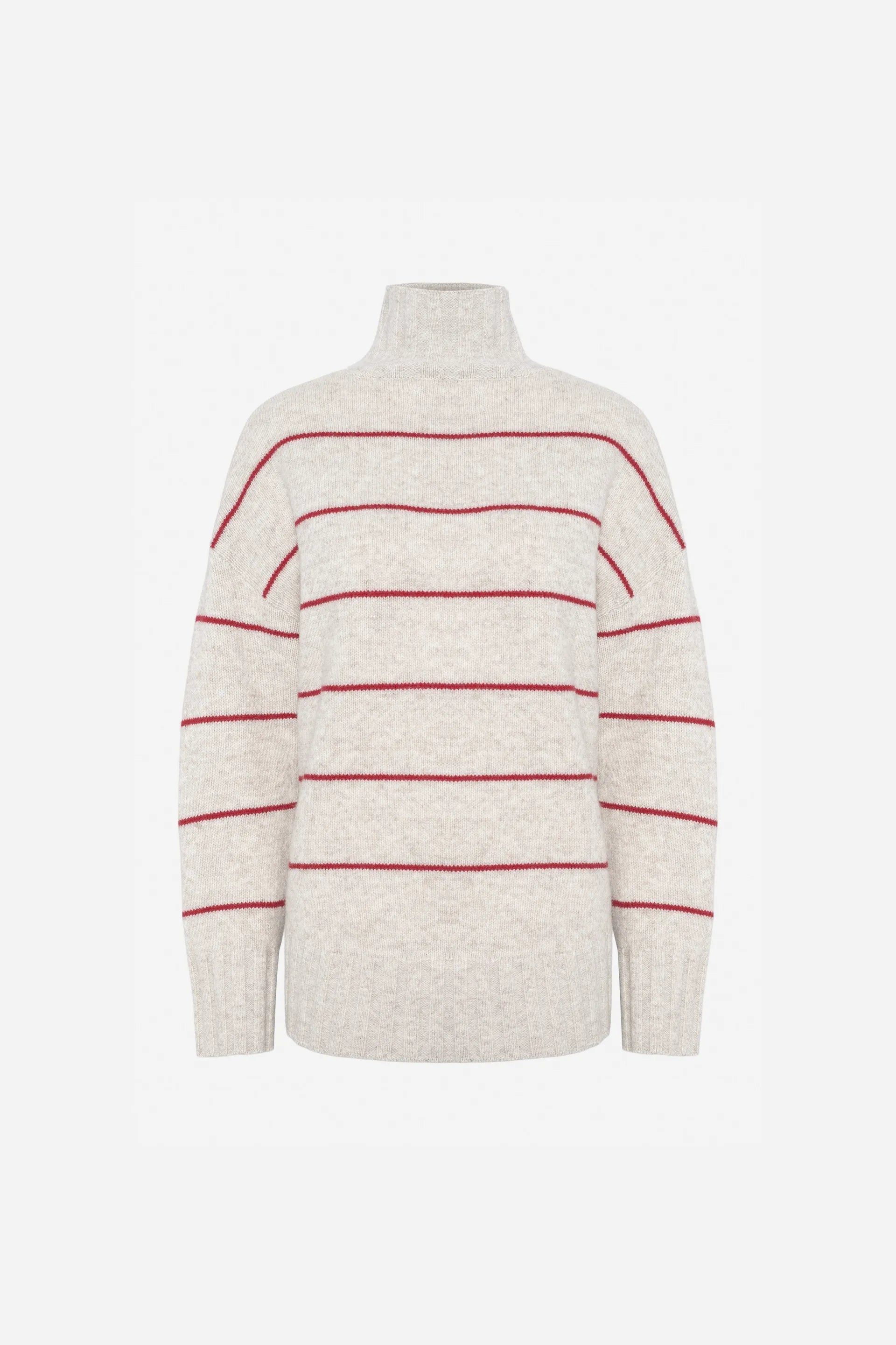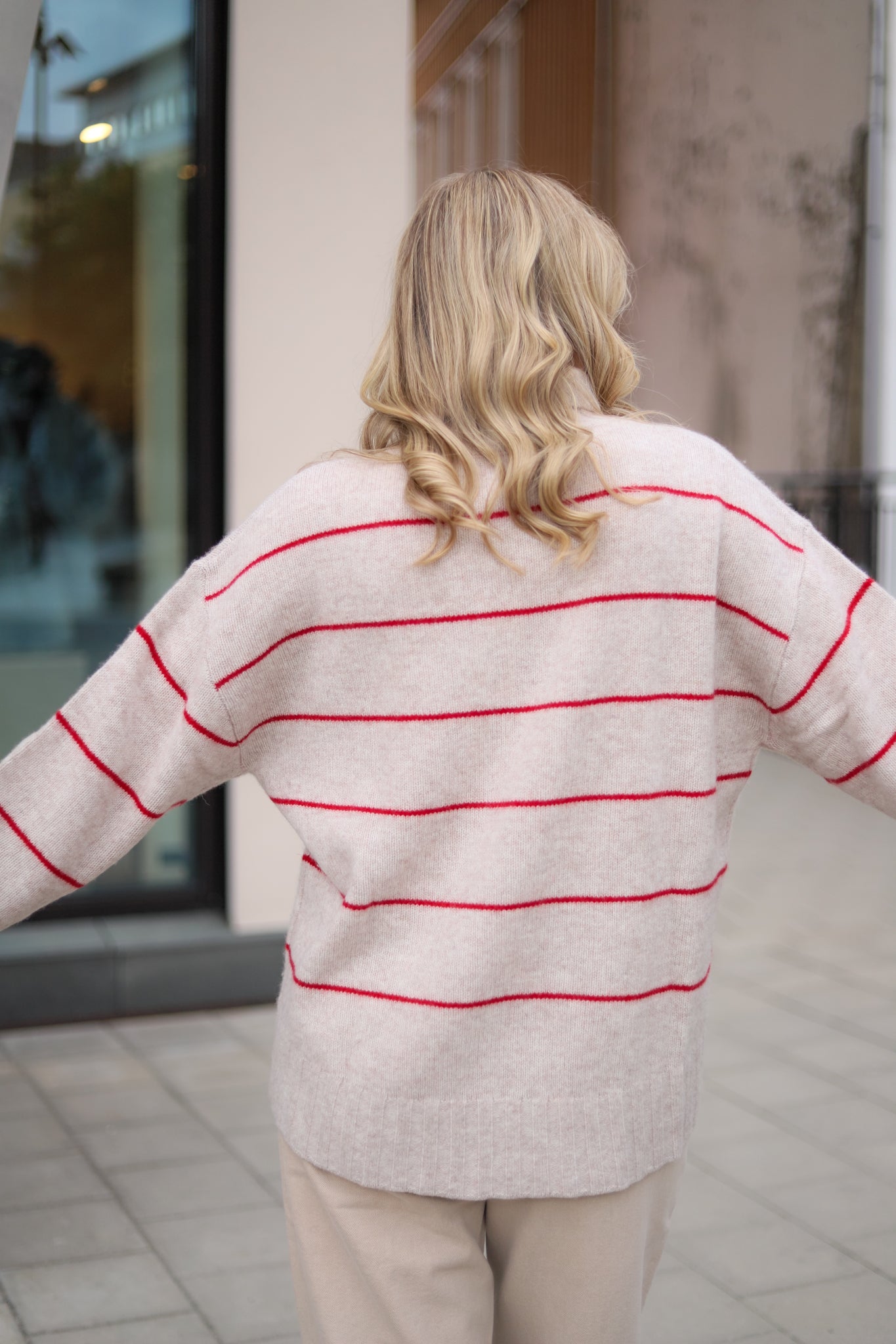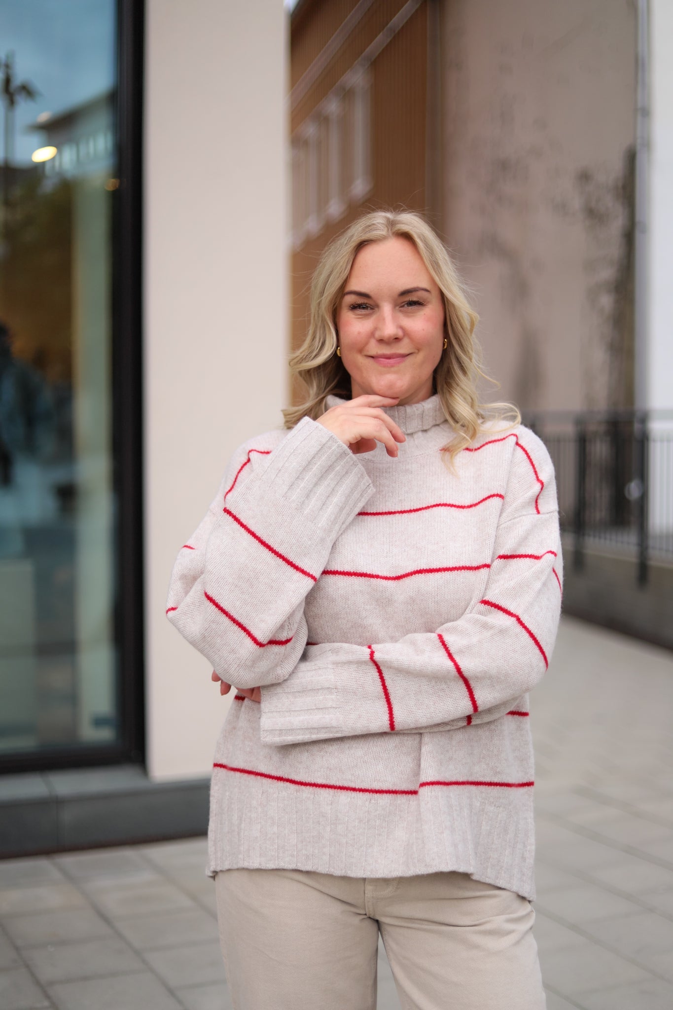 Stilig strikk i beige med røde striper fra Camilla Pihl. Modellen er rett med avslappet passform, semihøy hals og lange ermer med droppet skulder. Ribbestrikk i hals, hem og mansjett gir en diskré struktur til den myke, avslappede looken. Denne allsidige strikken er det perfekte garderobegrunnlaget – ideelt for lag-på-lag eller bruk alene gjennom sesonger.
