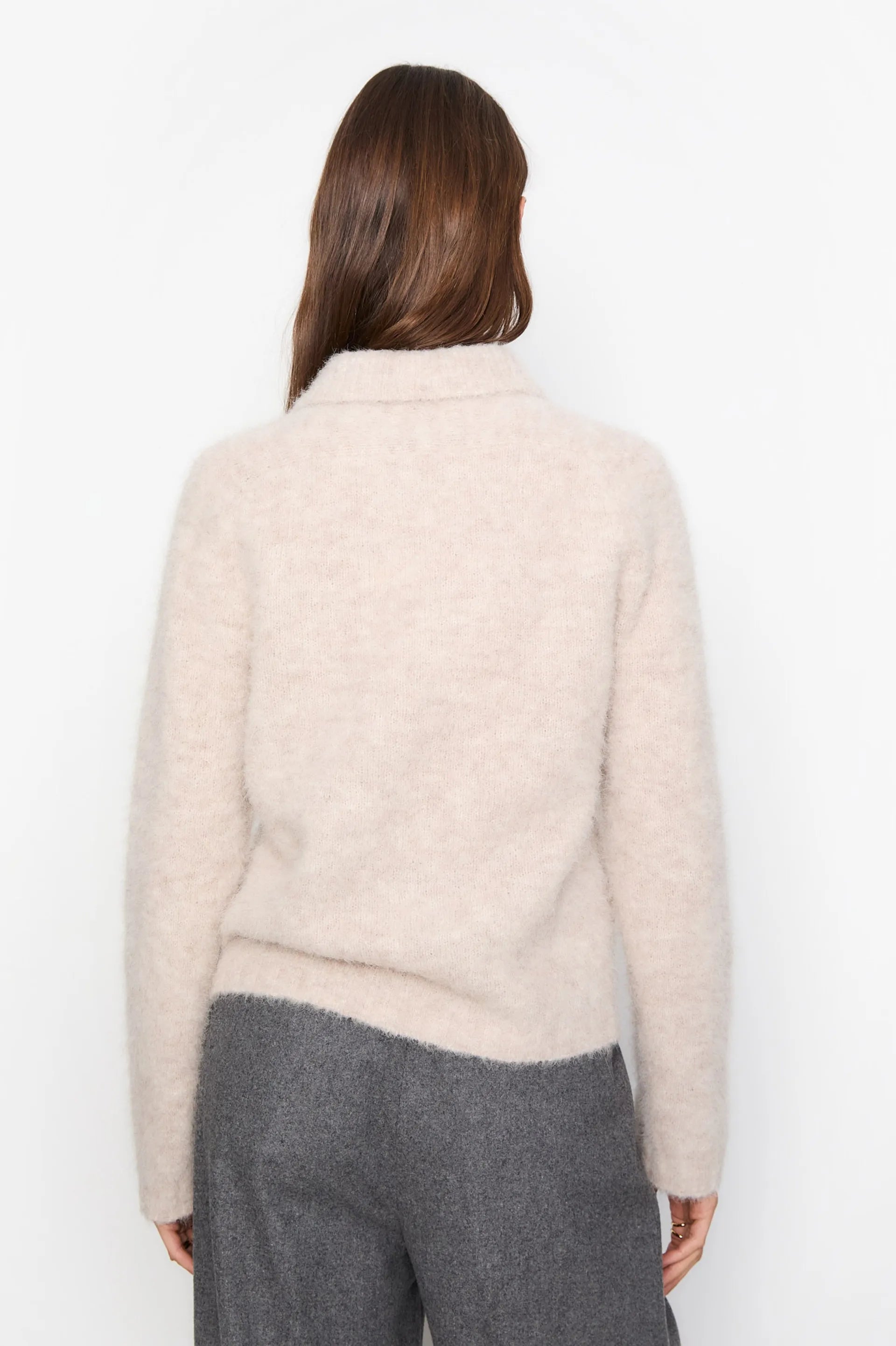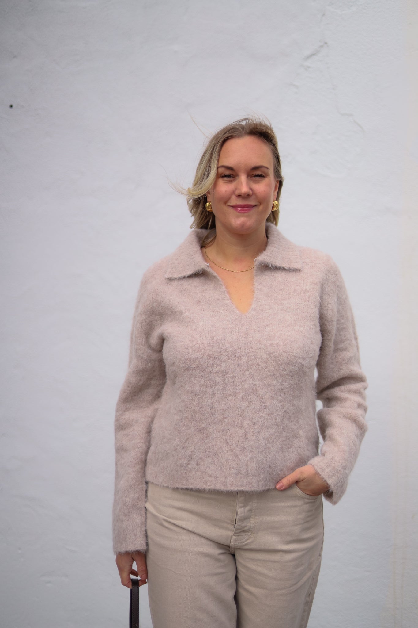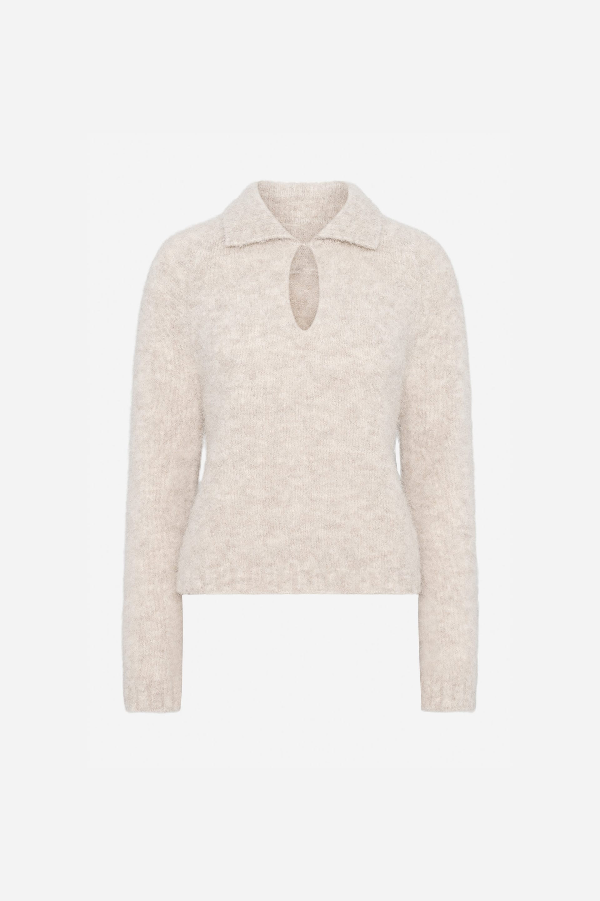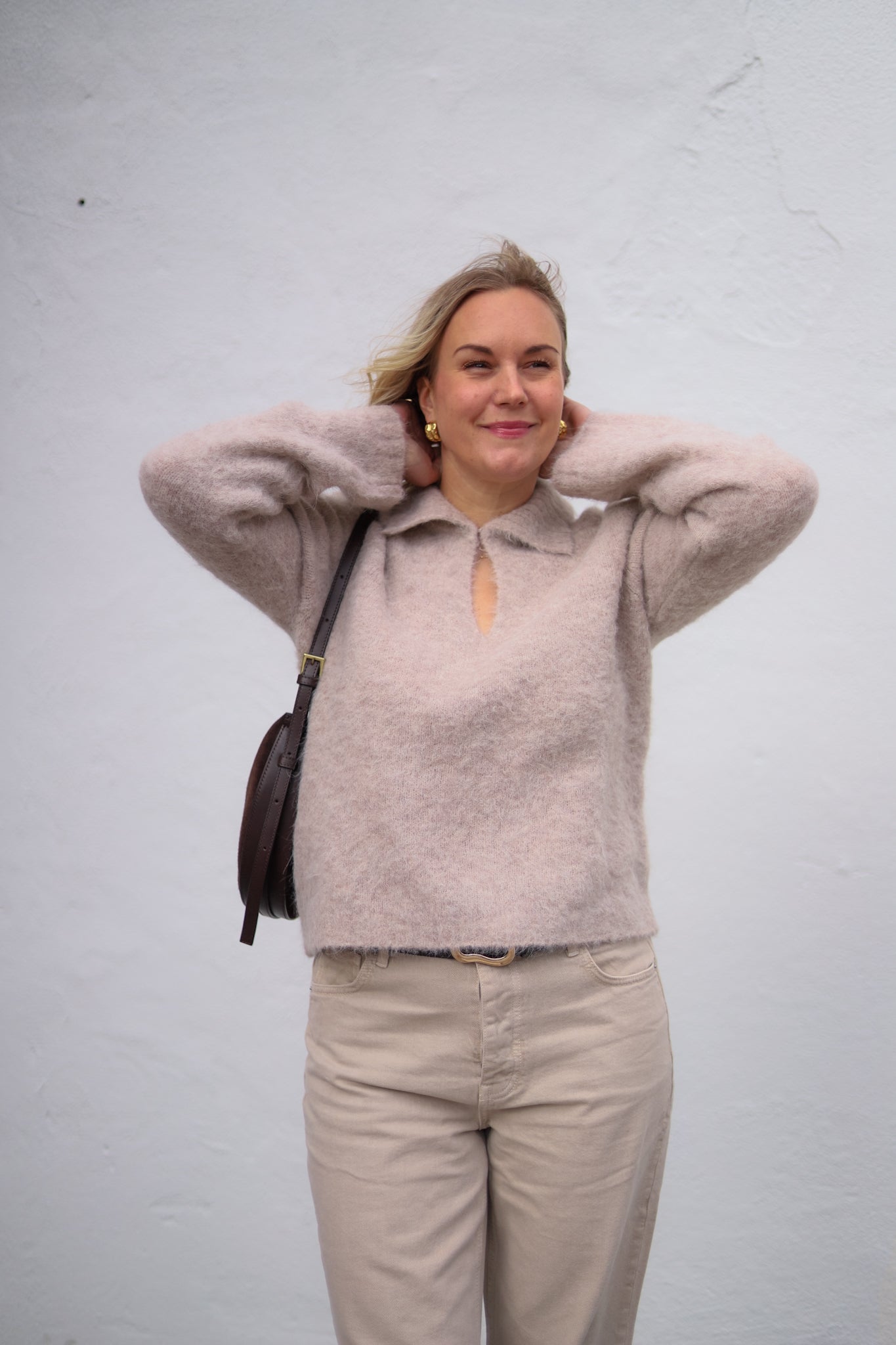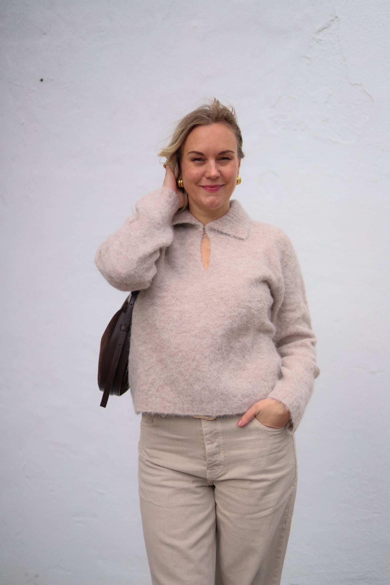Nydelig strikk i lys beige fra Camilla Pihl. Modellen er rett med lange raglanermer. Stilig polokrage og nøkkelhullsåpning på brystet. Ribbestrikk i hals, men og mansjett. Laget av en delikat og børstet alpakkablanding. Den perfekte hverdagsgenser med avslappet passform.