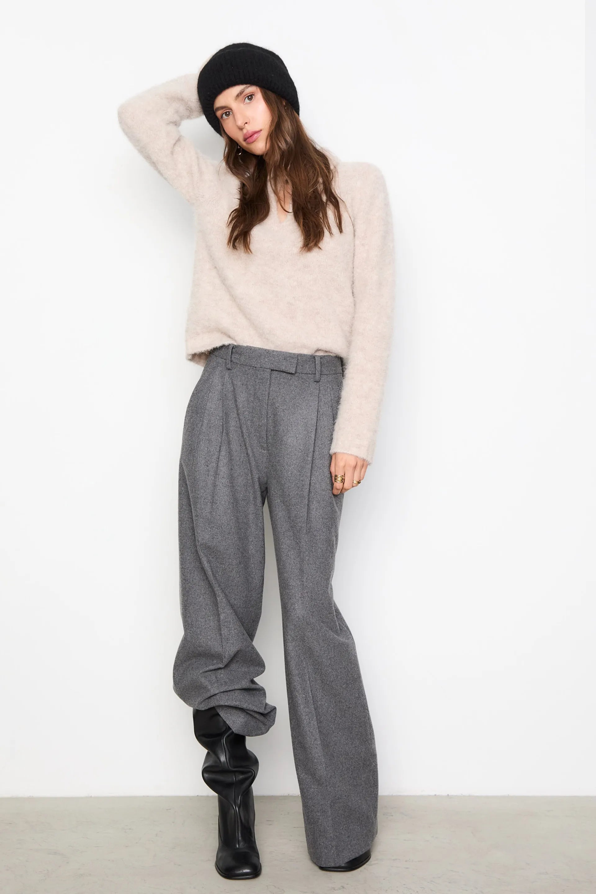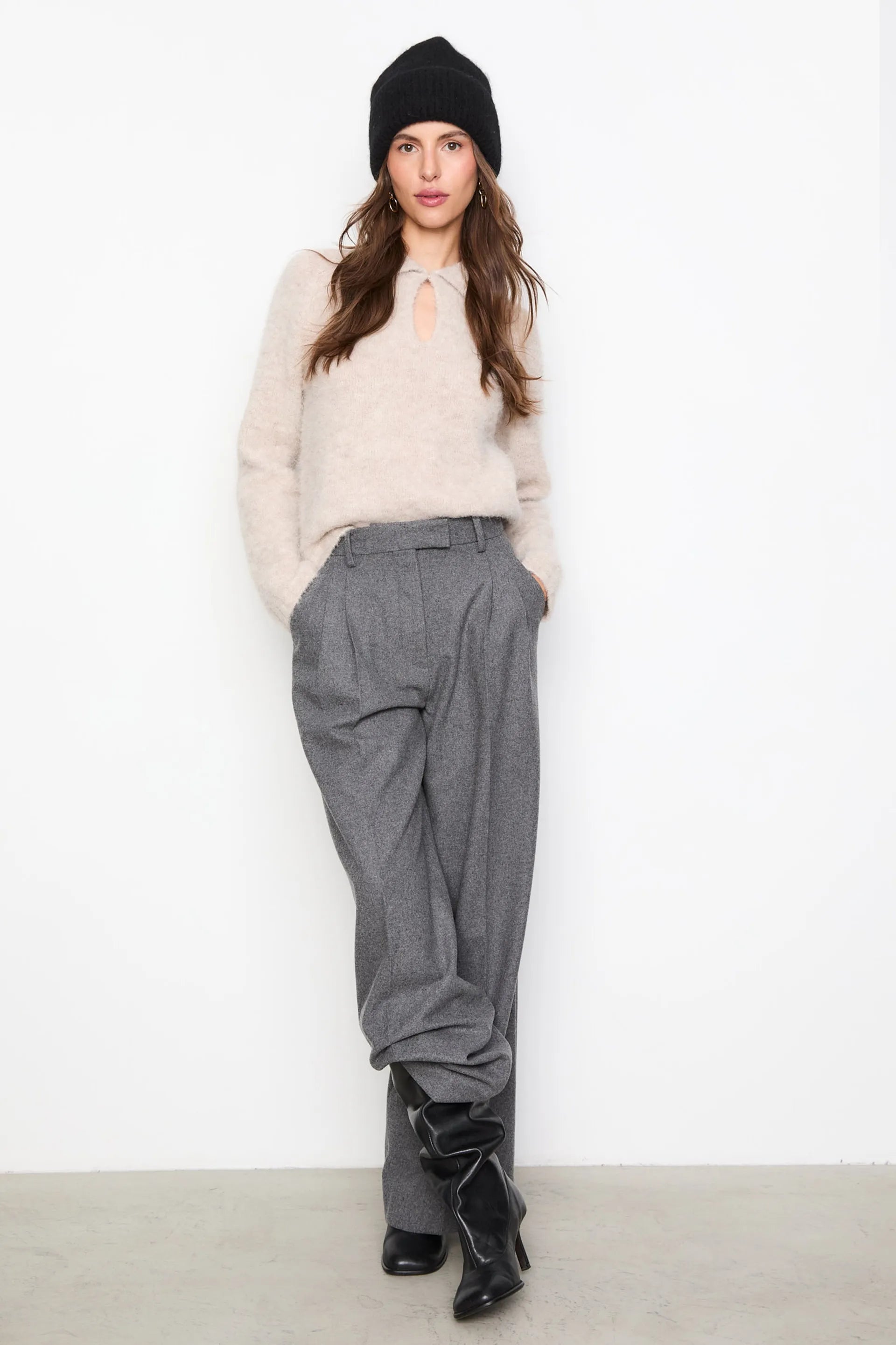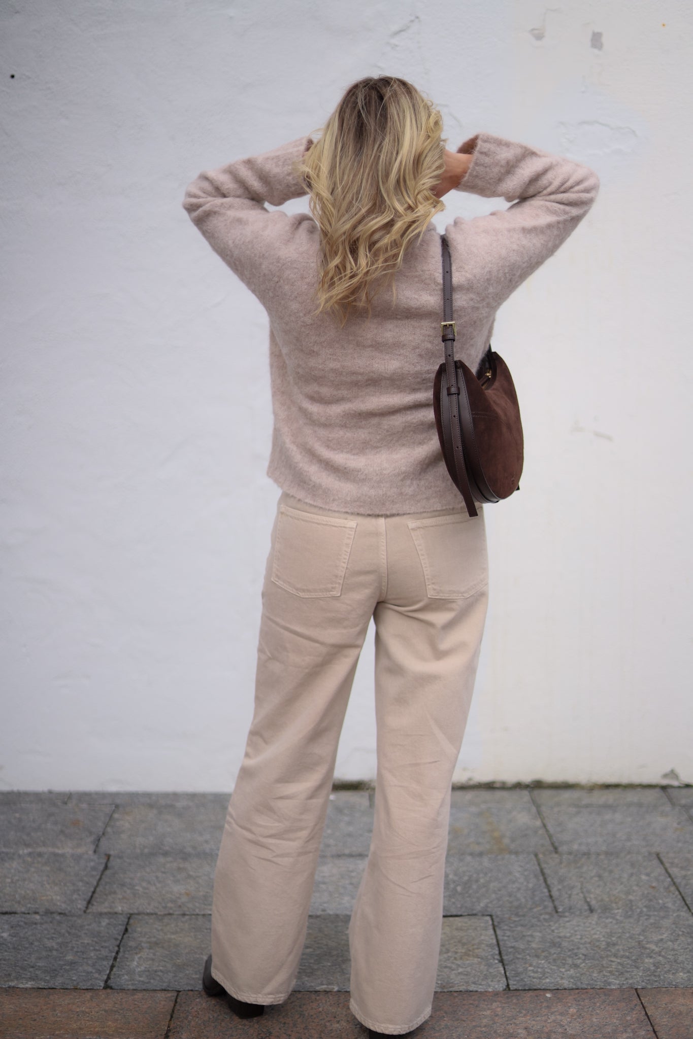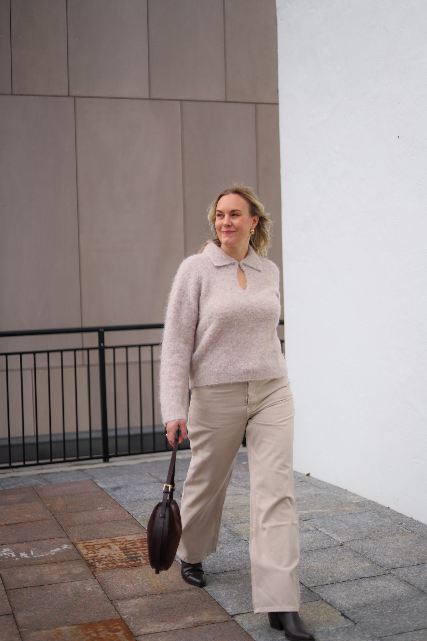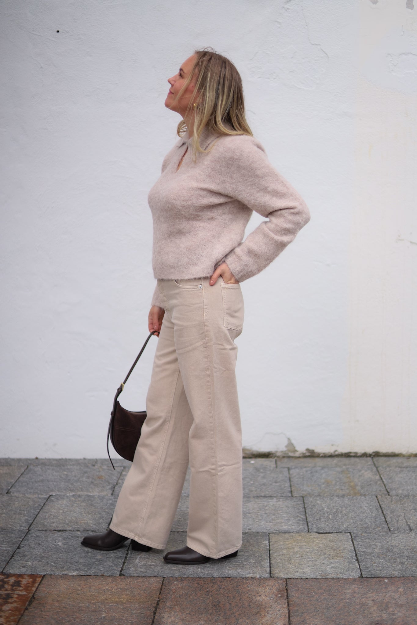 Nydelig strikk i lys beige fra Camilla Pihl. Modellen er rett med lange raglanermer. Stilig polokrage og nøkkelhullsåpning på brystet. Ribbestrikk i hals, men og mansjett. Laget av en delikat og børstet alpakkablanding. Den perfekte hverdagsgenser med avslappet passform.