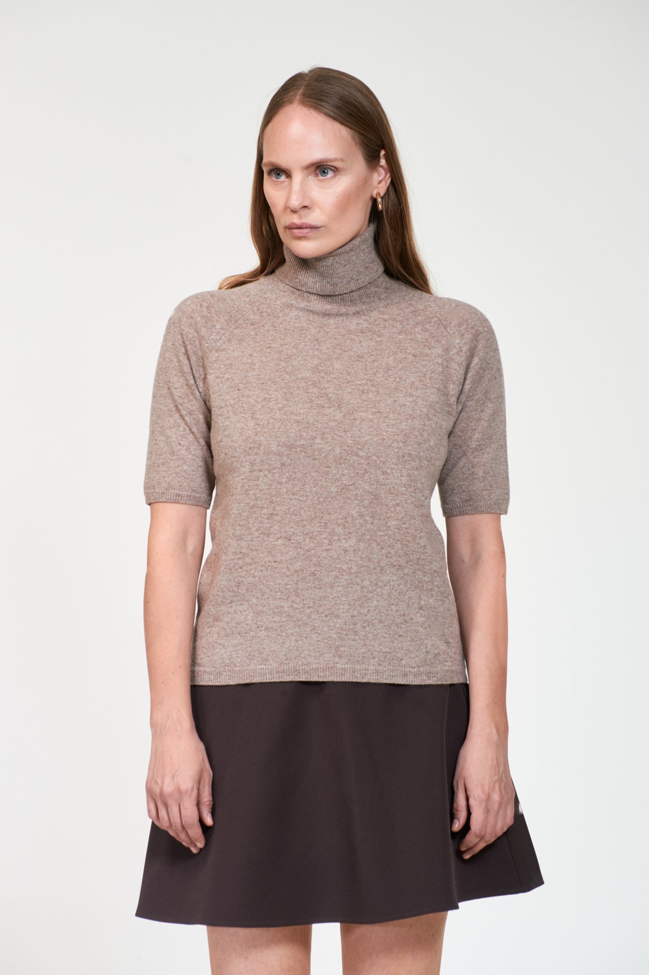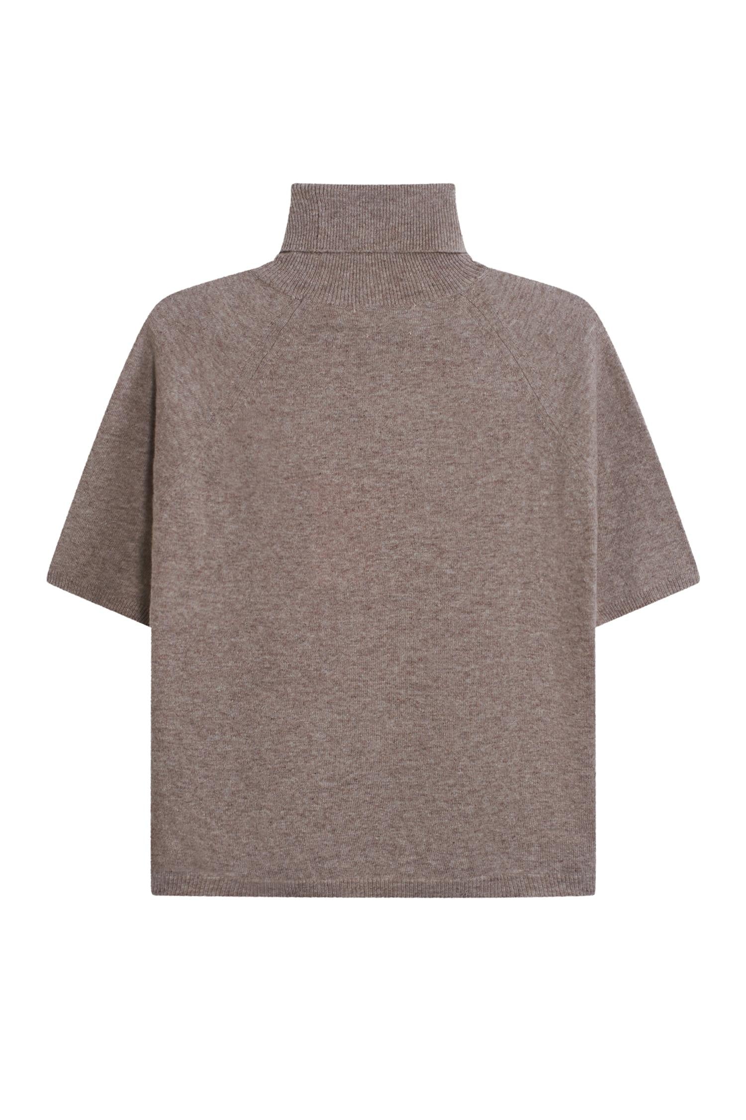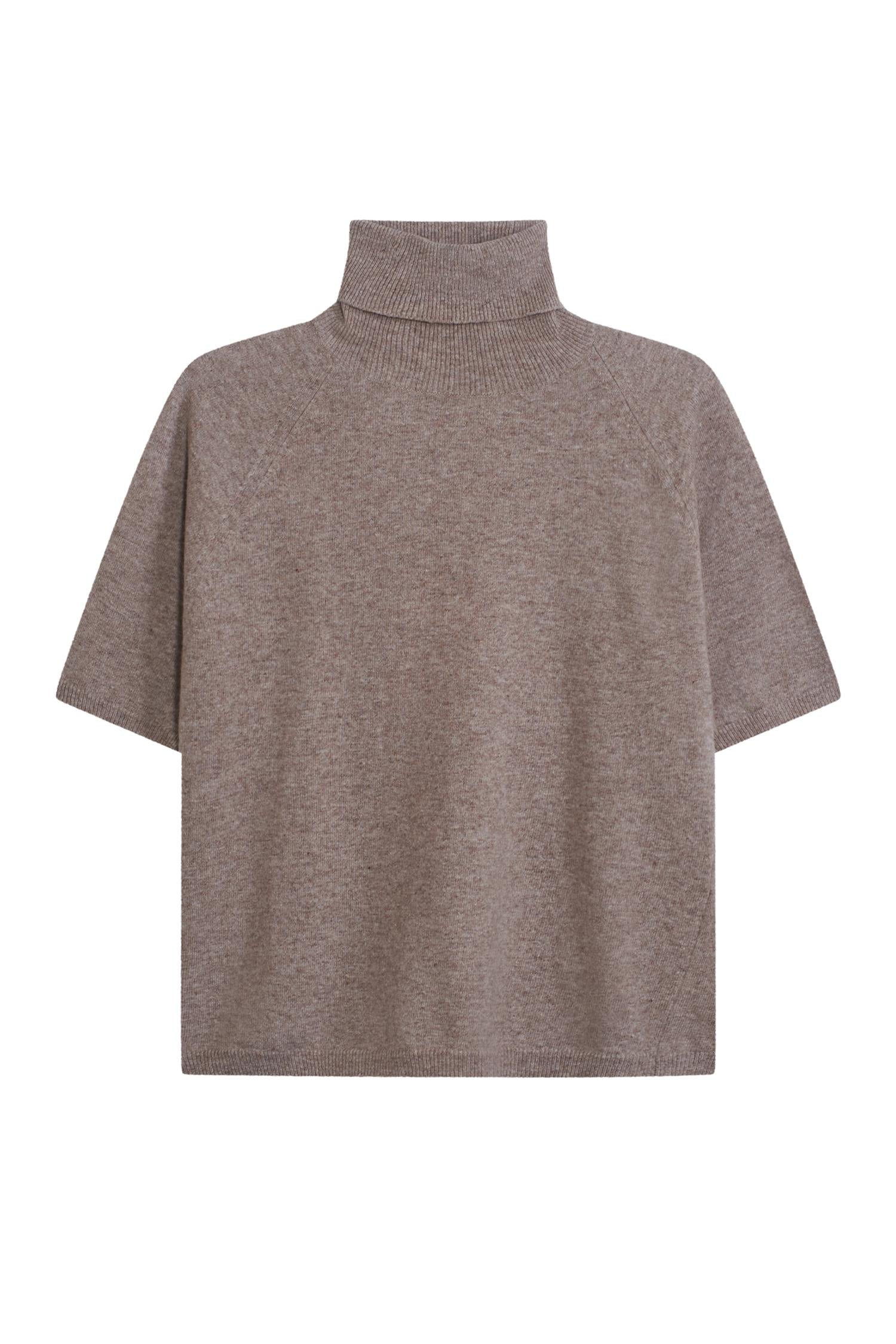 Elegant strikk i delikat brun melert farge fra Arnie Says. Kortermet med høy hals i en tørr men myk og slitesterk ullblanding. Modellen er rett og nett i fasongen med raglan skuldre. Tidløst basisplagg.