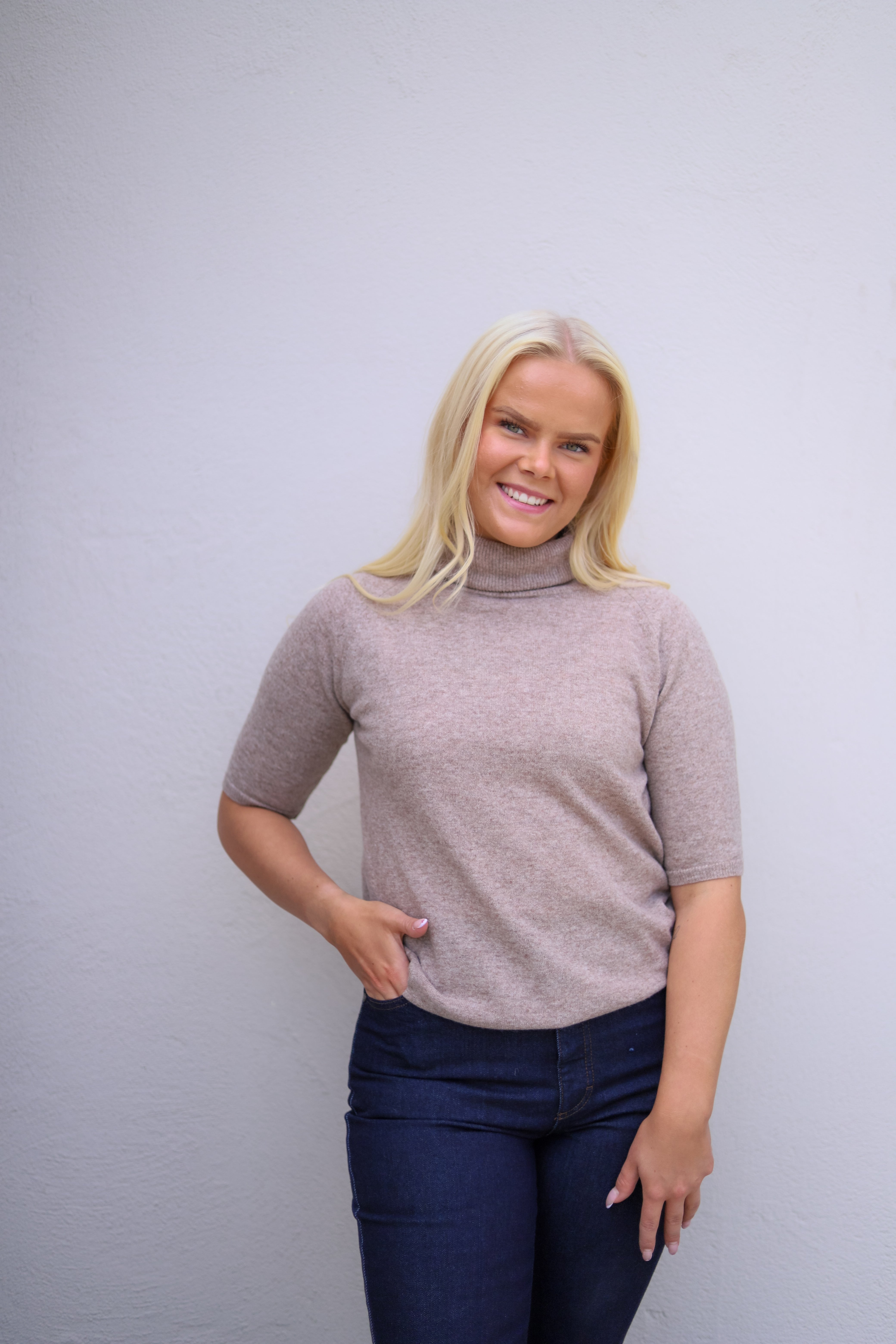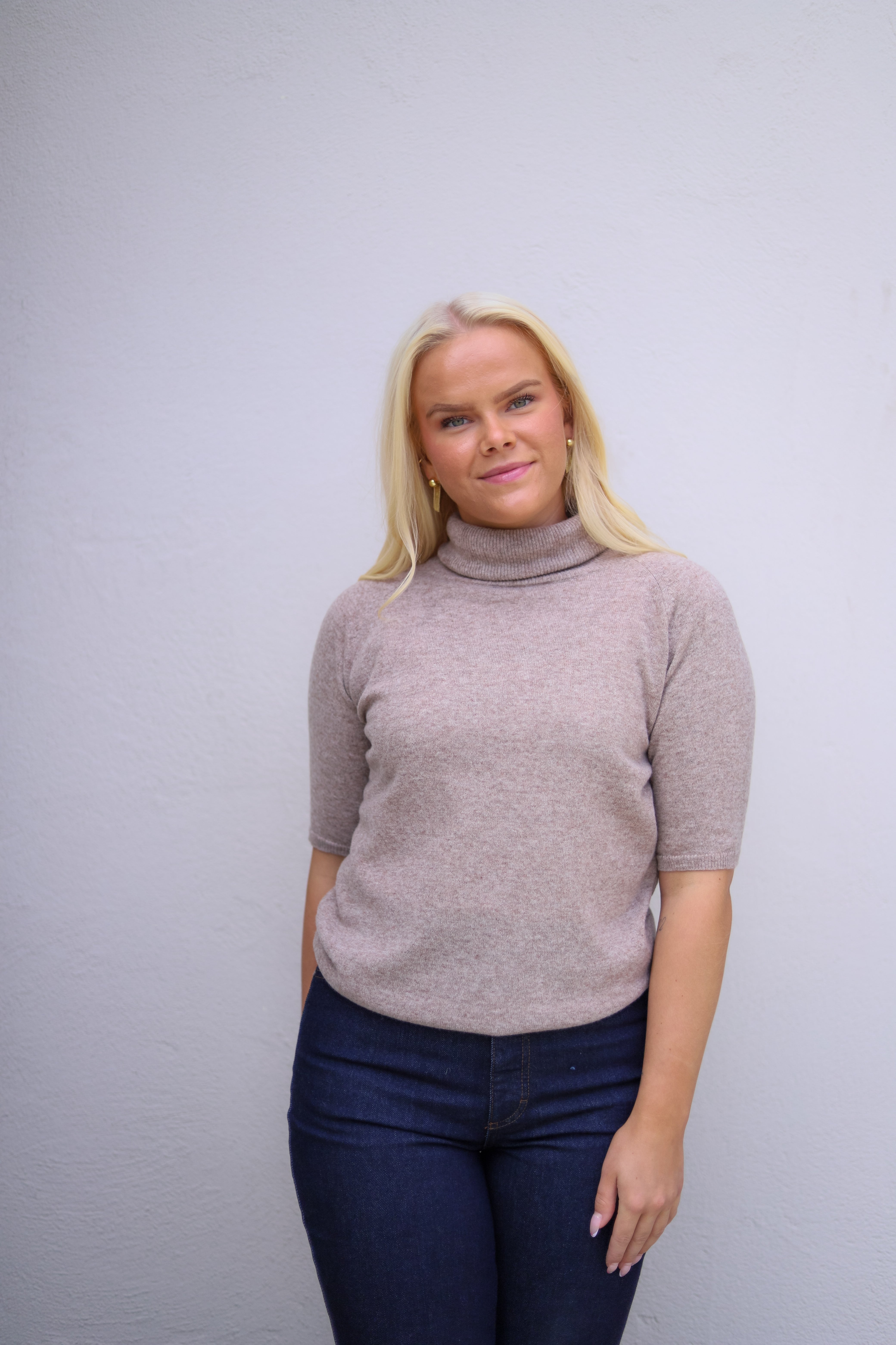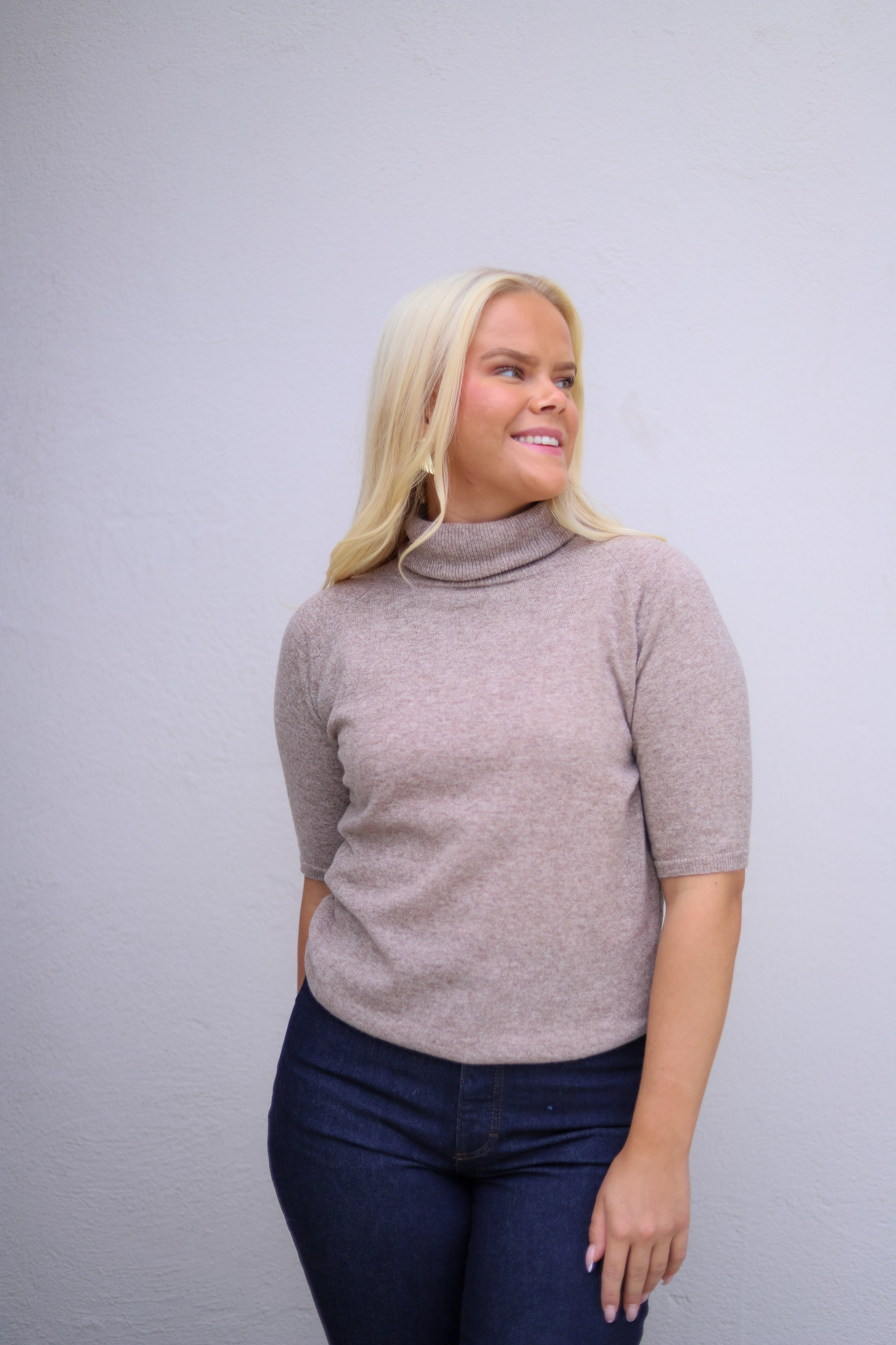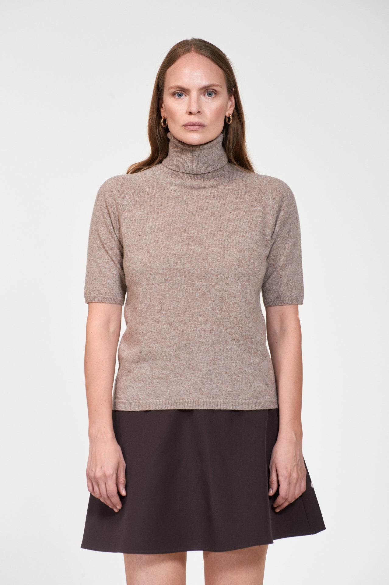 Elegant strikk i delikat brun melert farge fra Arnie Says. Kortermet med høy hals i en tørr men myk og slitesterk ullblanding. Modellen er rett og nett i fasongen med raglan skuldre. Tidløst basisplagg.