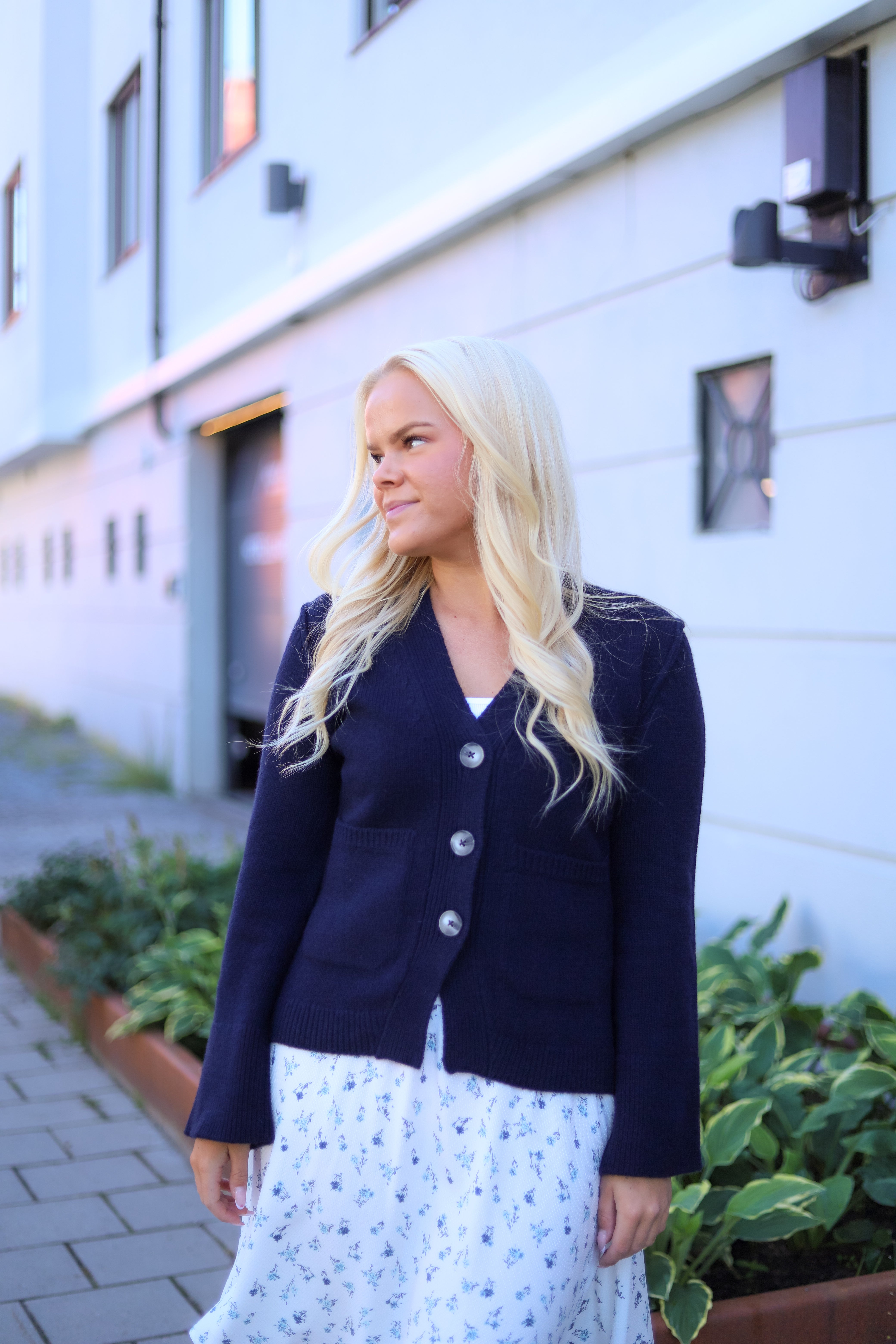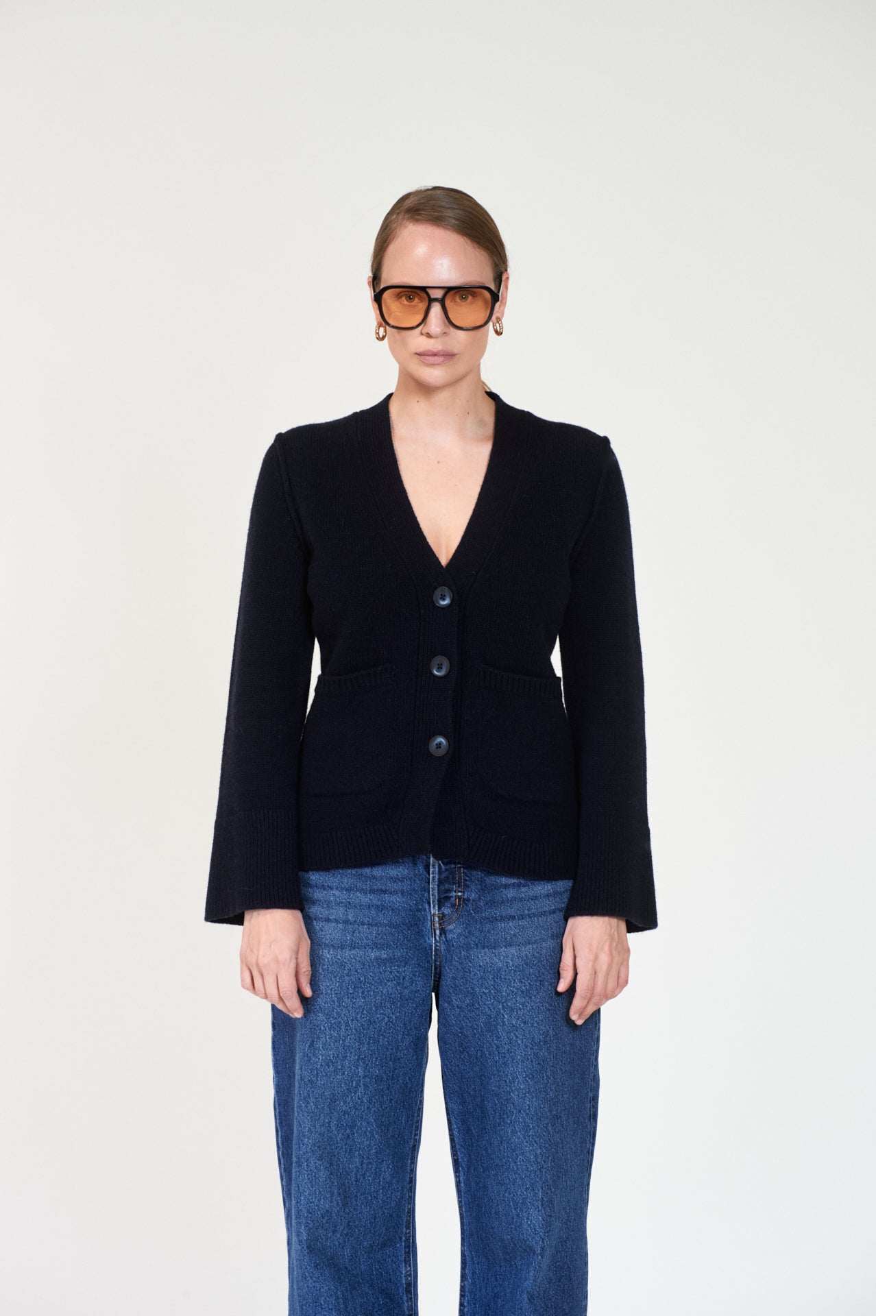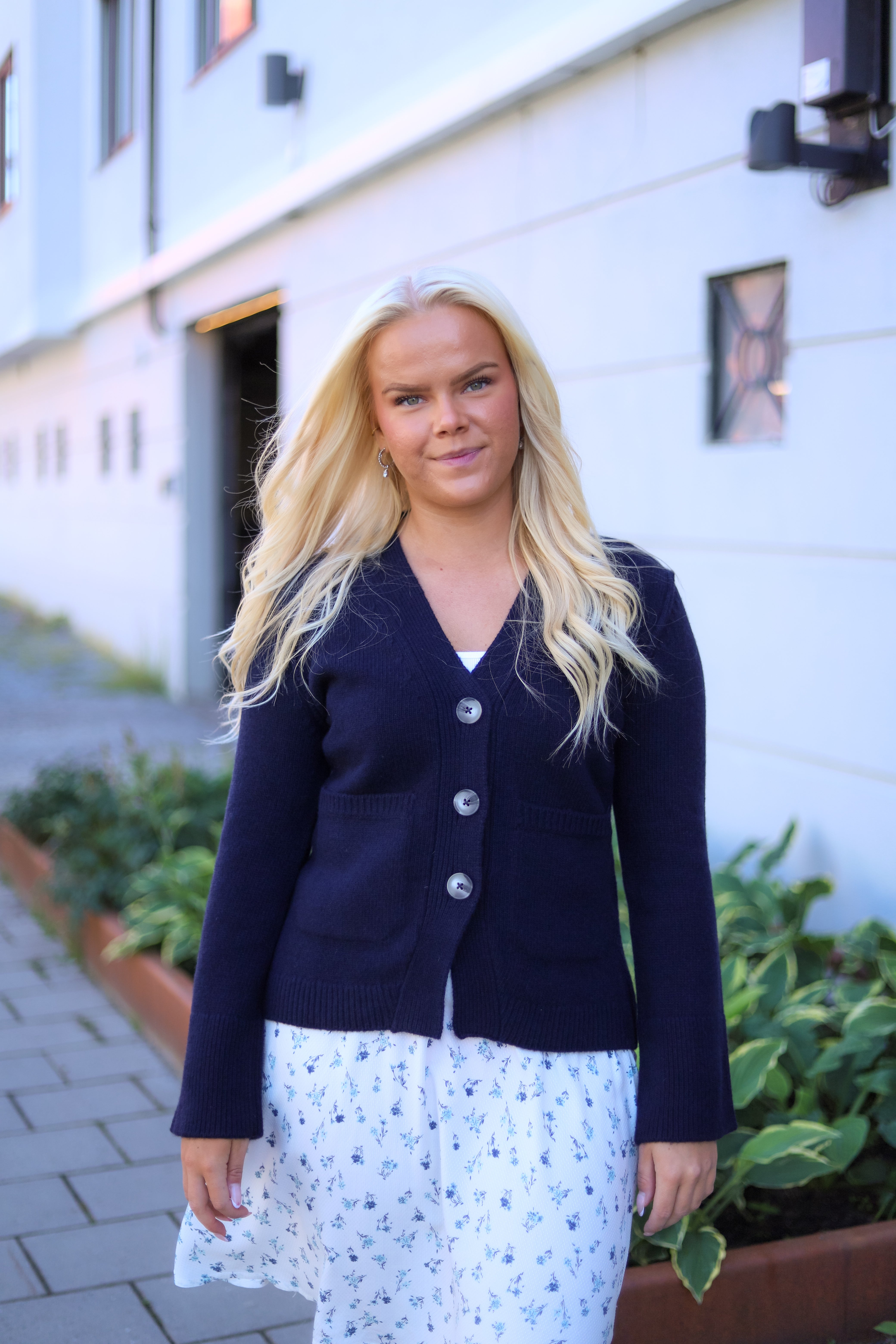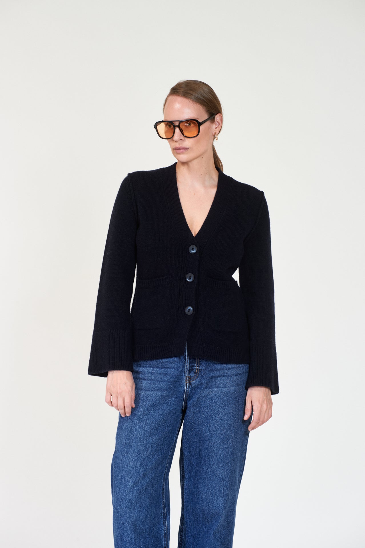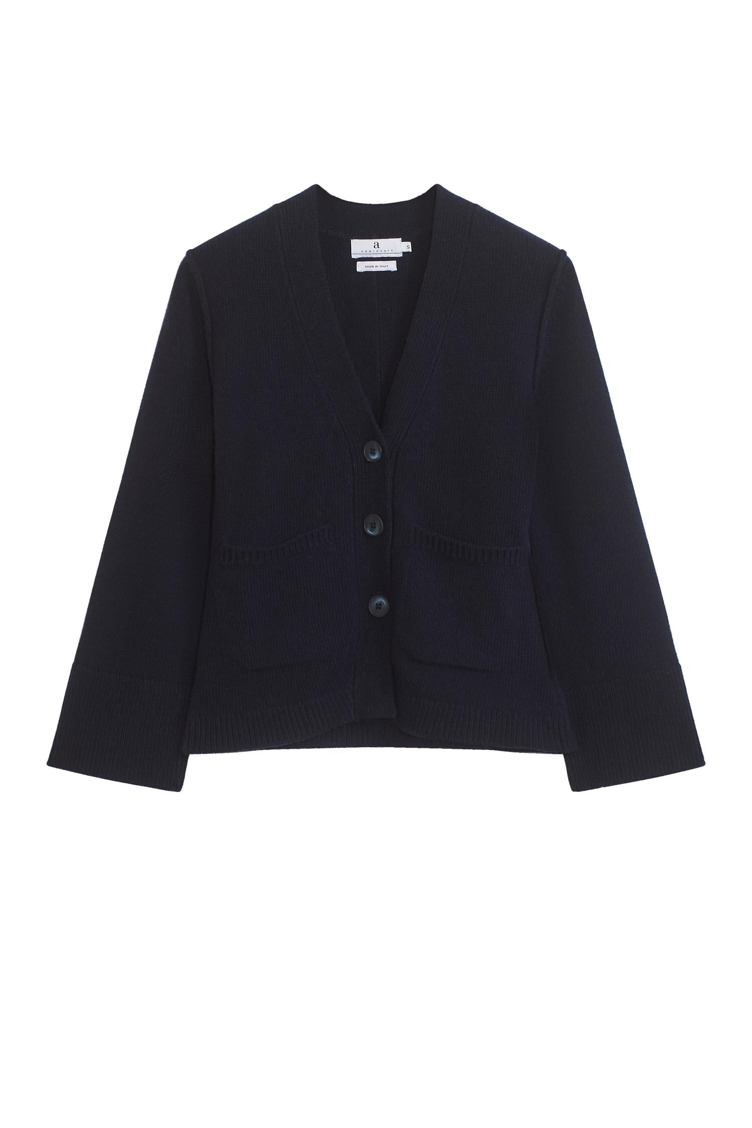 Cardigan i klassisk navy farge fra Arnie Says. En stilig cardigan med figursydd midje og doble lommer foran. Strikkejakken er laget av et kompakt ull materiale som sikrer både komfort og stil. Den har vide ermer og en dyp V-hals foran.