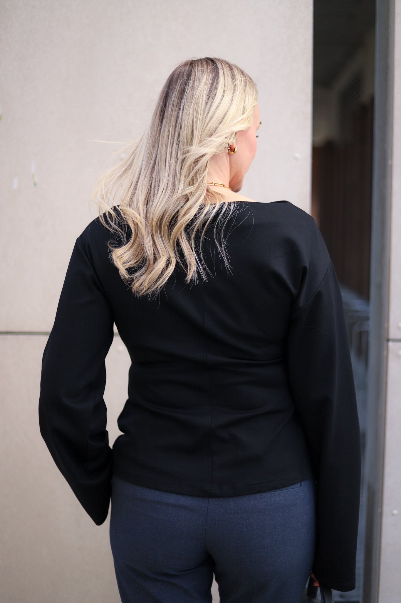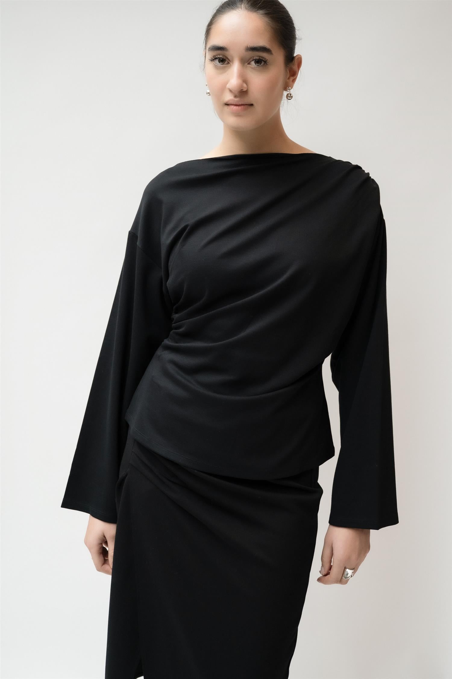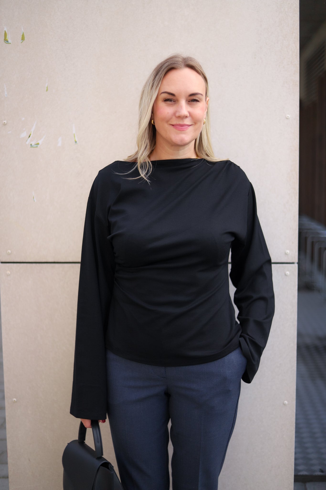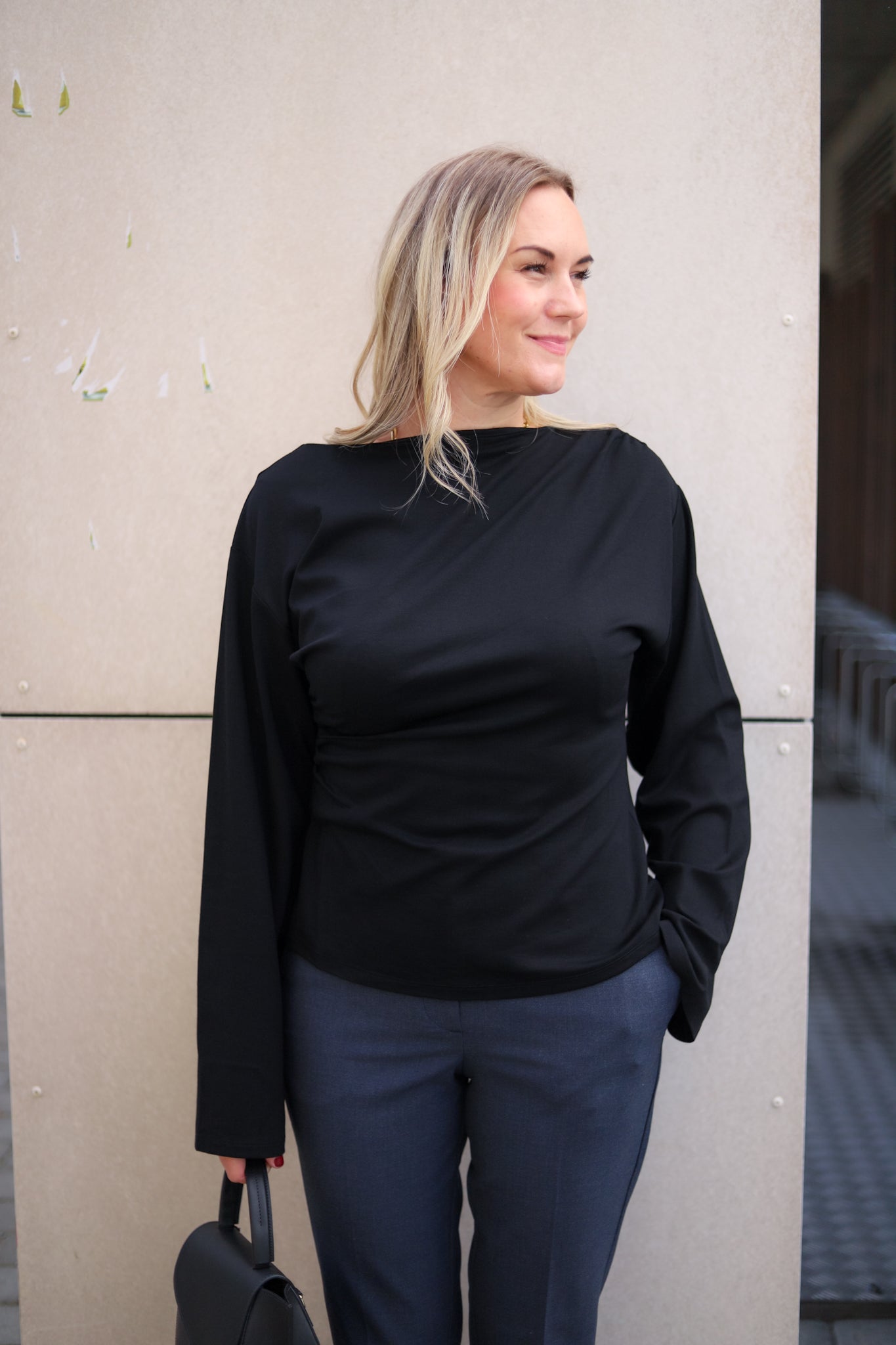 Tidløs topp i klassisk sort fra Viveh. Med en elegant båthals og vide ermer løfter denne toppen basegarderoben med sofistikerte designdetaljer. Elegant silhuett fremhevet med subtile draperinger over brystet for en flatterende effekt. Toppen er laget av et tykt viskose-blandet jerseystoff som gir både komfort og struktur. En søm midt bak gir et skreddersydd preg for en raffinert passform. En tidløs klassiker med lekre detaljer! Style toppen med matchende skjørt for komplett look.