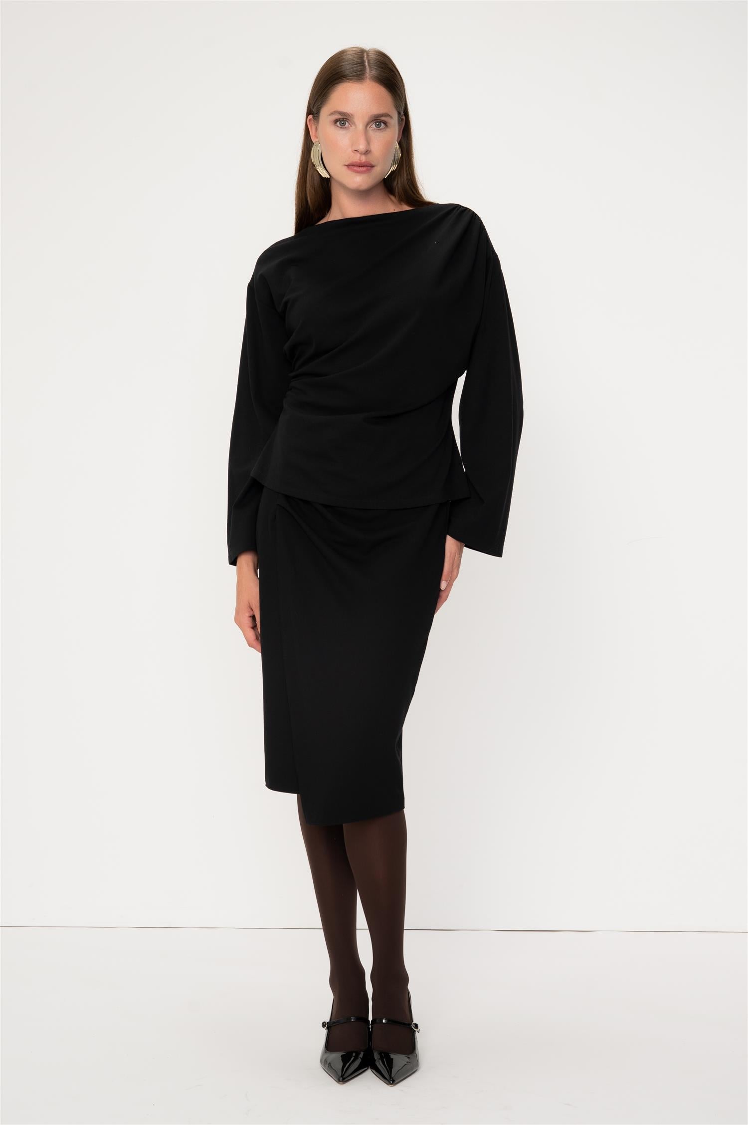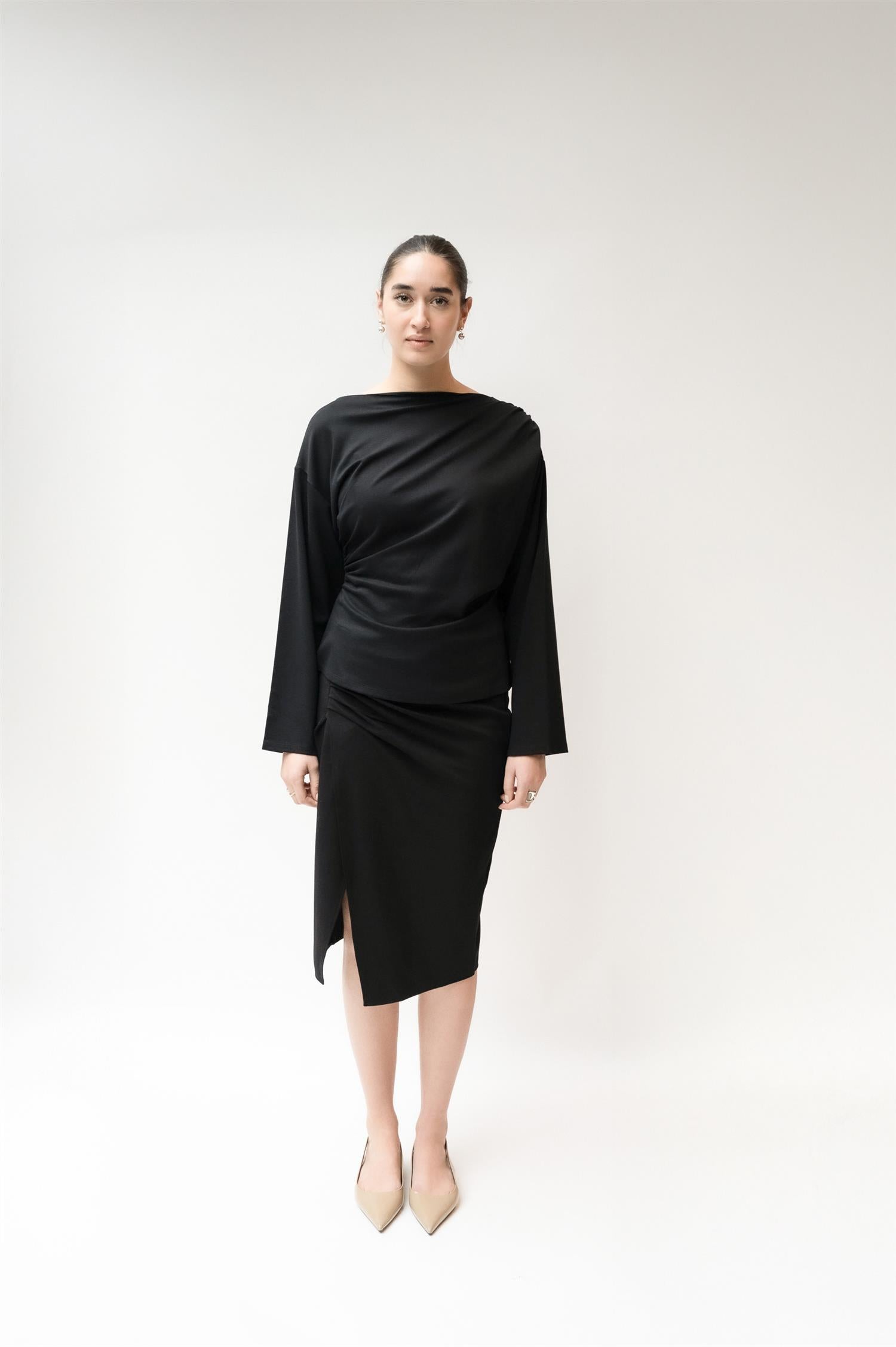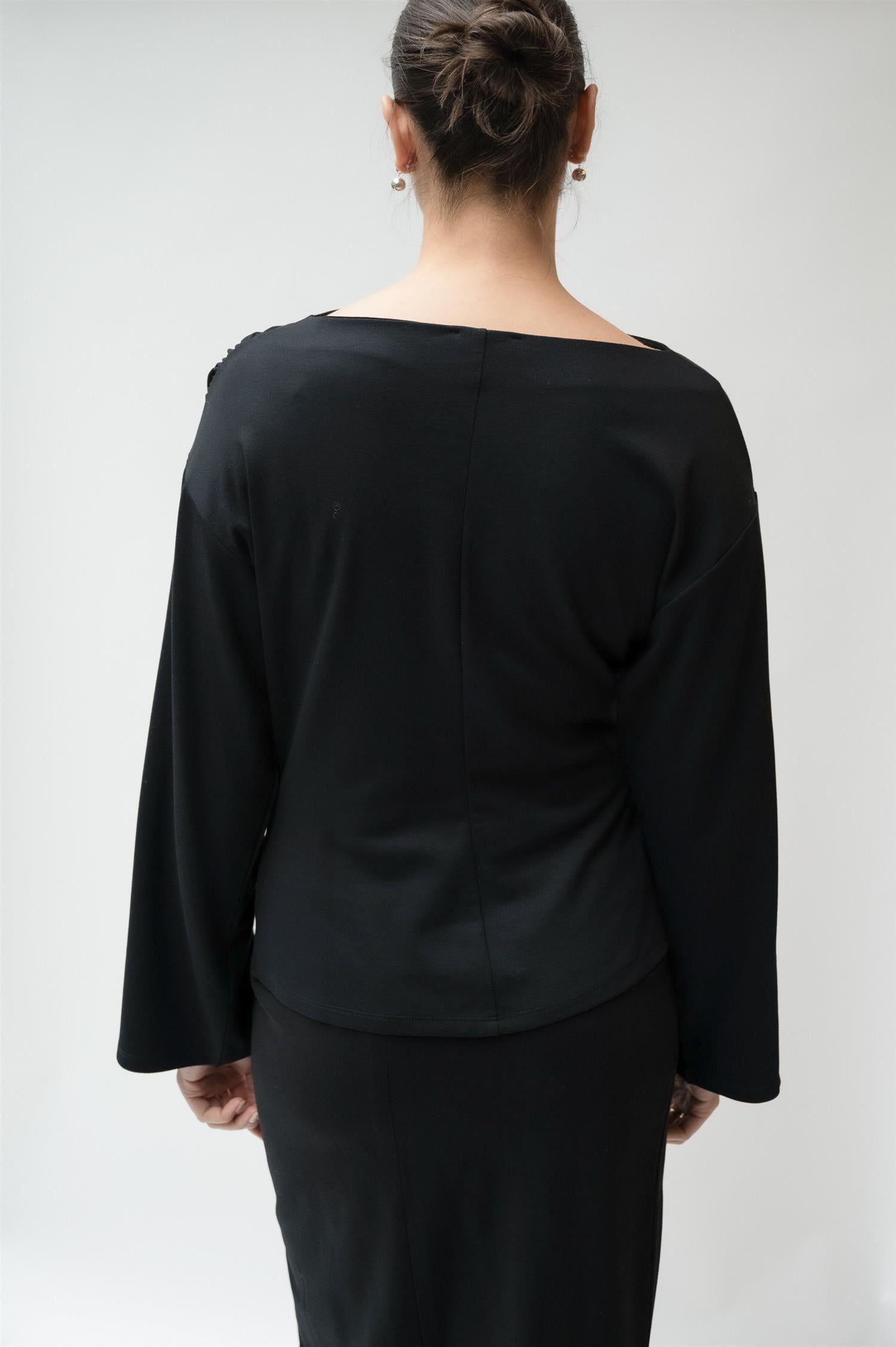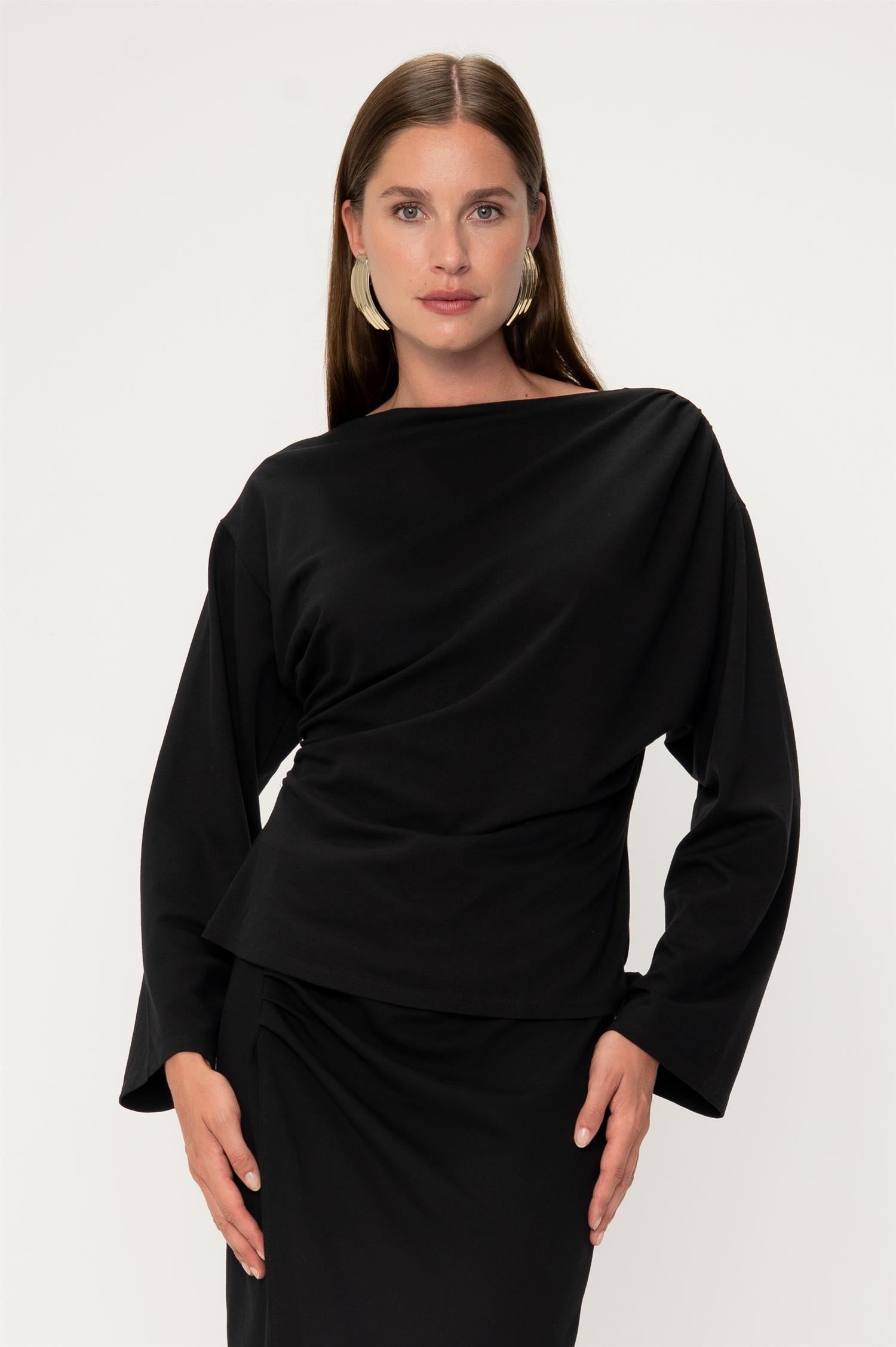 Tidløs topp i klassisk sort fra Viveh. Med en elegant båthals og vide ermer løfter denne toppen basegarderoben med sofistikerte designdetaljer. Elegant silhuett fremhevet med subtile draperinger over brystet for en flatterende effekt. Toppen er laget av et tykt viskose-blandet jerseystoff som gir både komfort og struktur. En søm midt bak gir et skreddersydd preg for en raffinert passform. En tidløs klassiker med lekre detaljer! Style toppen med matchende skjørt for komplett look.