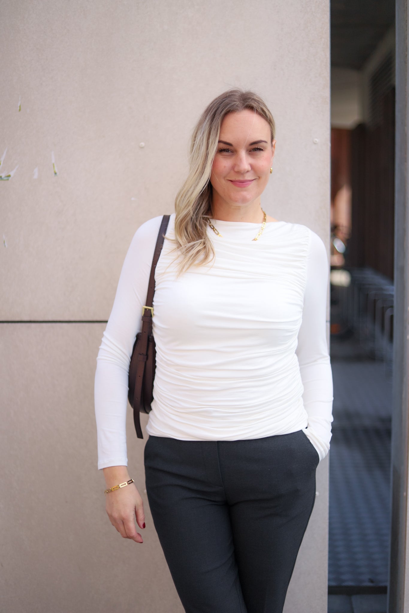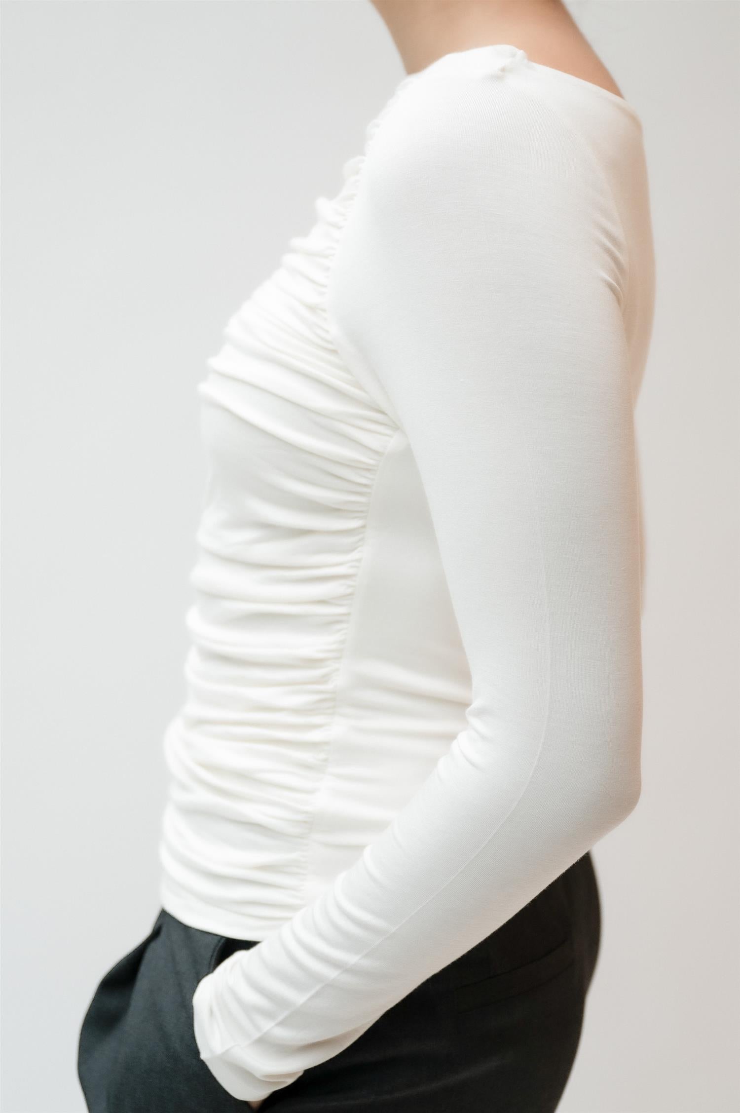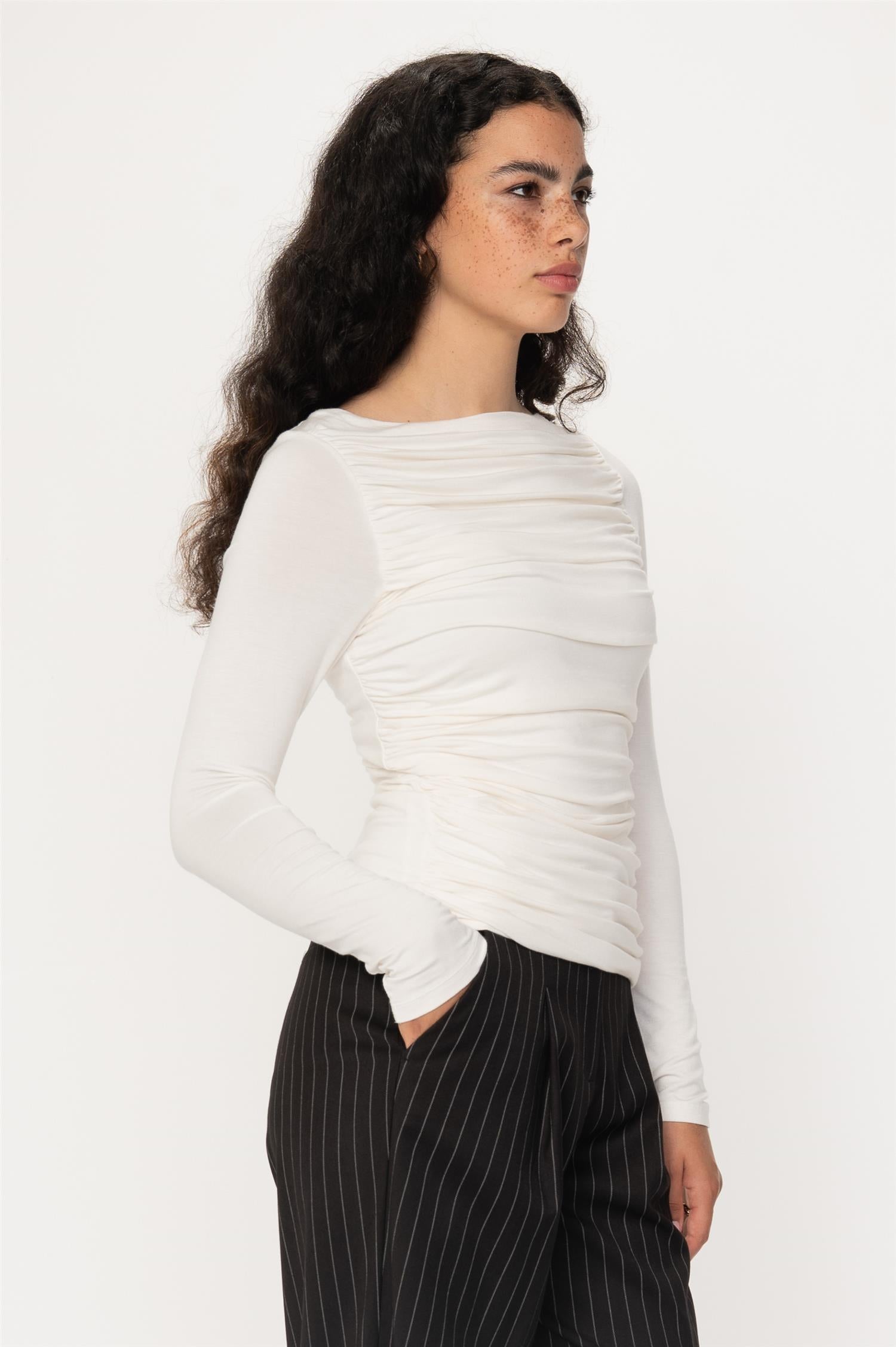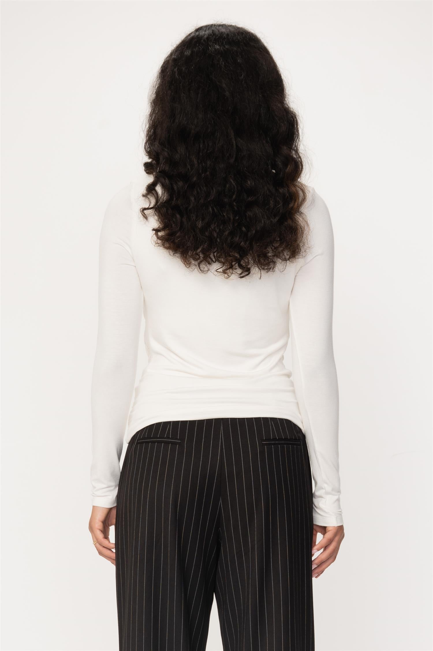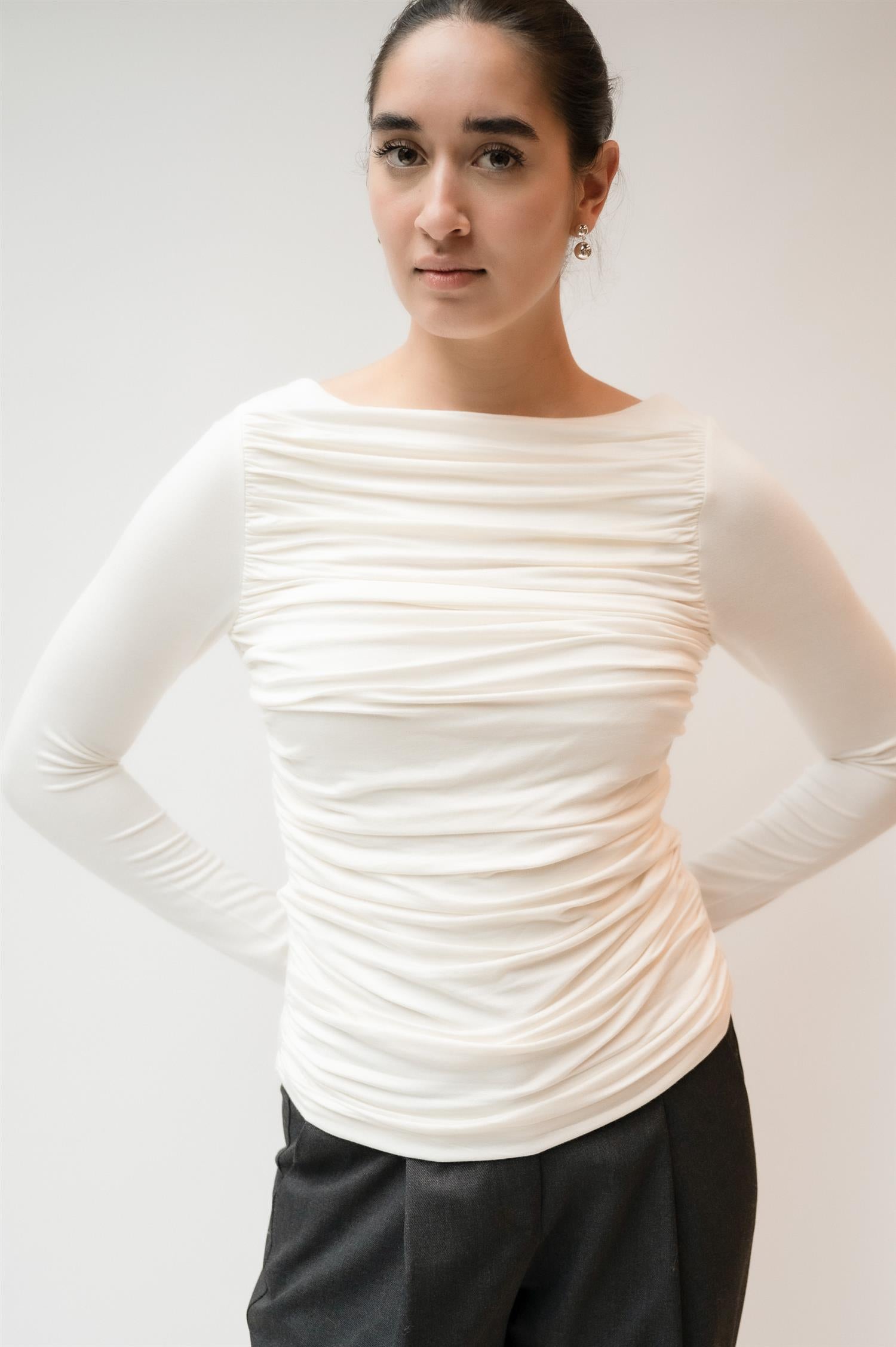 Nydelig topp i off white med delikate draperinger fra Viveh. Tettsittende modell med lange smale ermer og elegant båthalsutringning. Den er designet for allsidighet og kan brukes på to måter, enten med elegante draperinger eller en stilren front. Toppen er laget i myk viskosejersey og er dobbeltfôret for ekstra støtte og komfort. En vinner i basegarderoben.