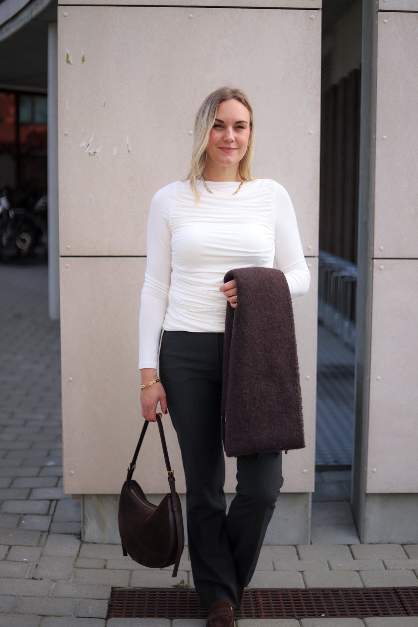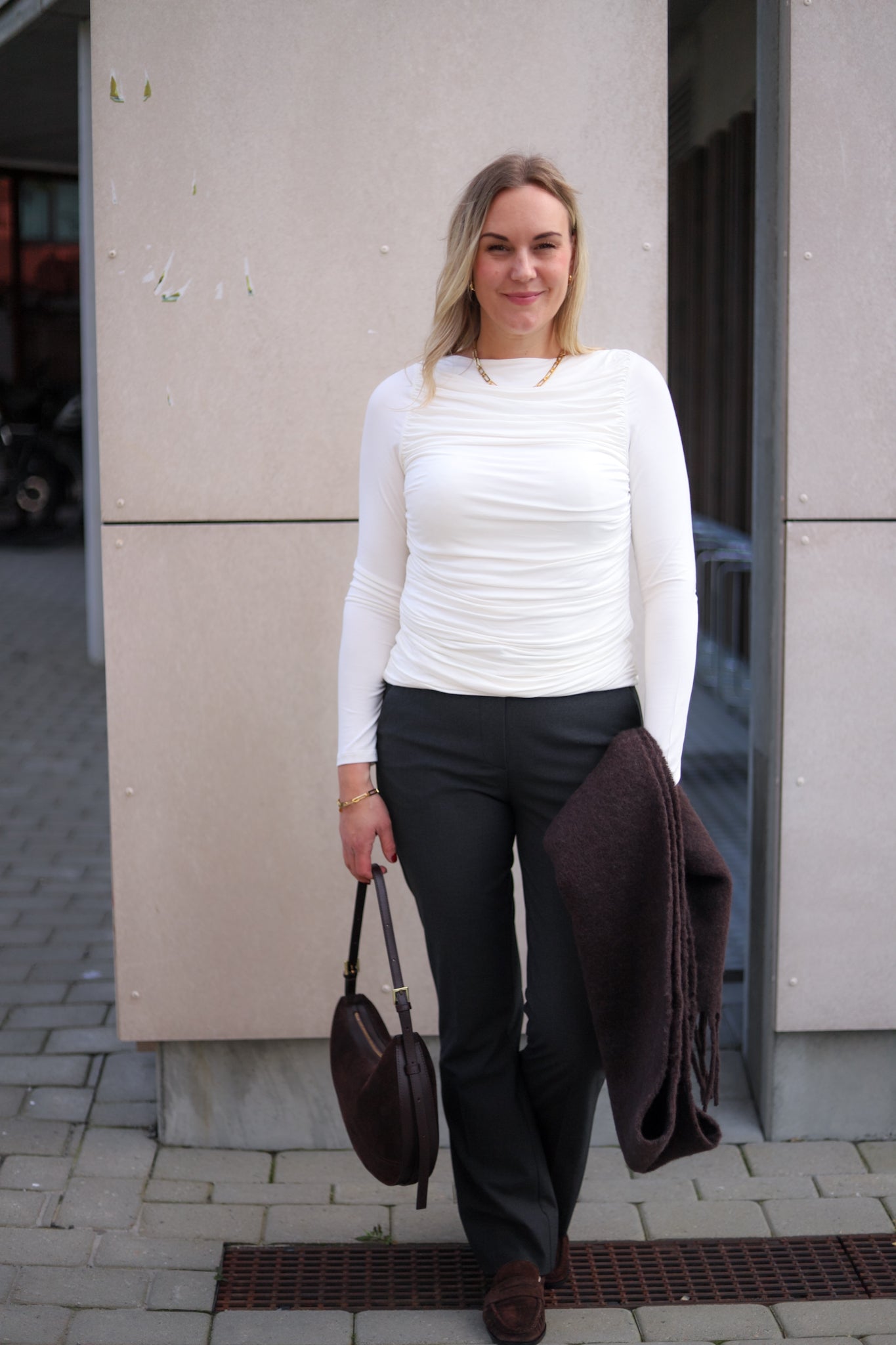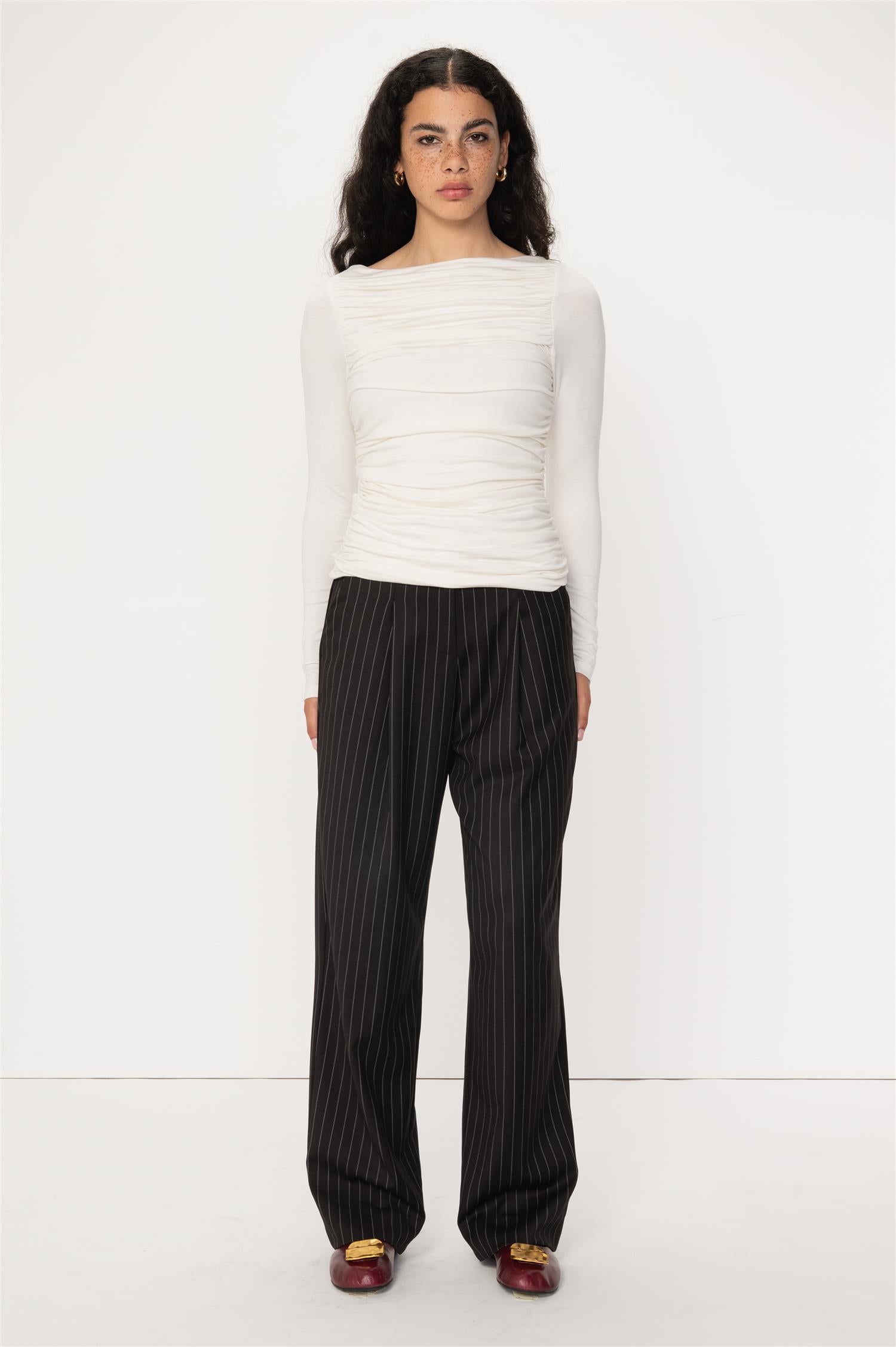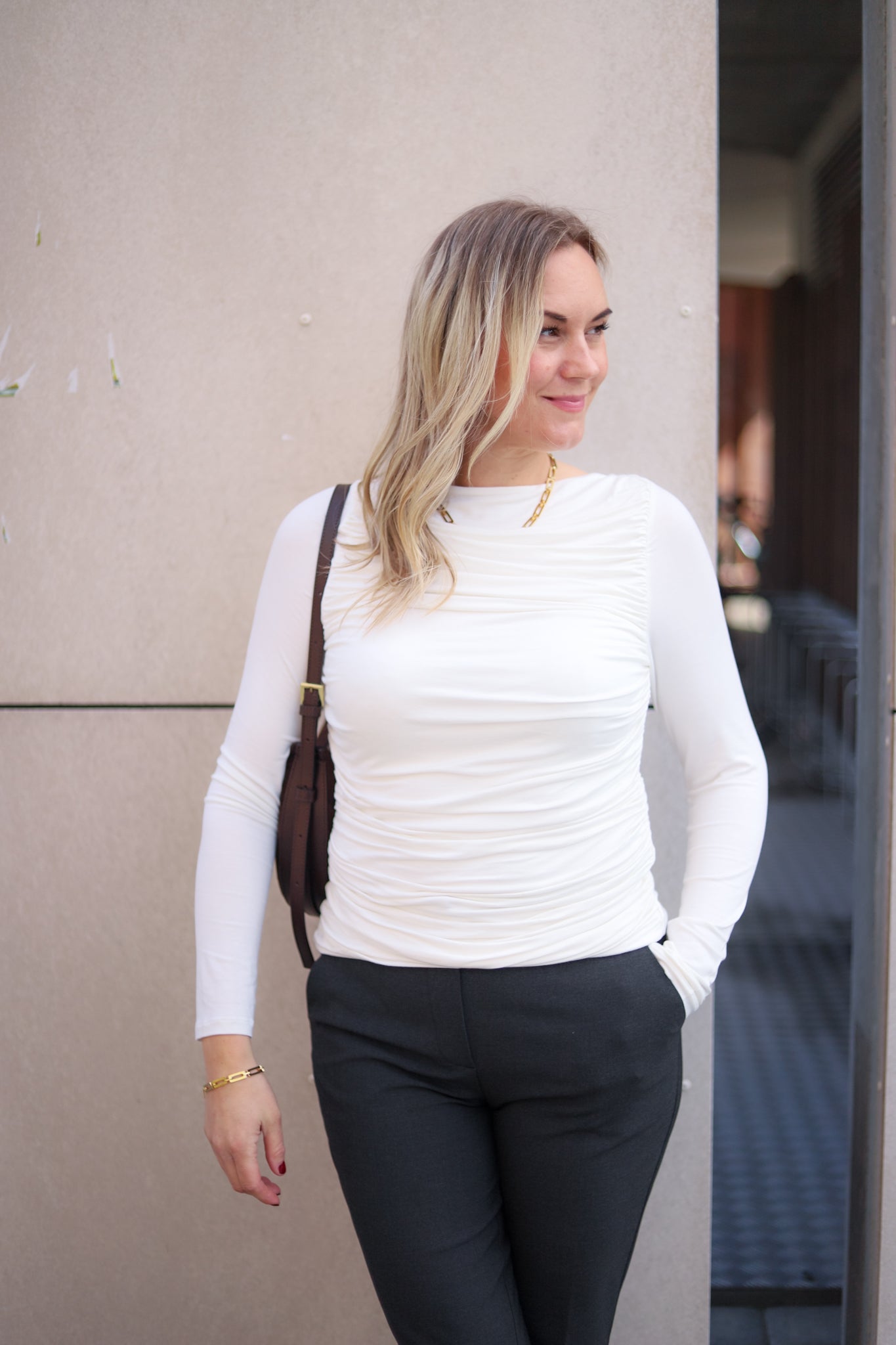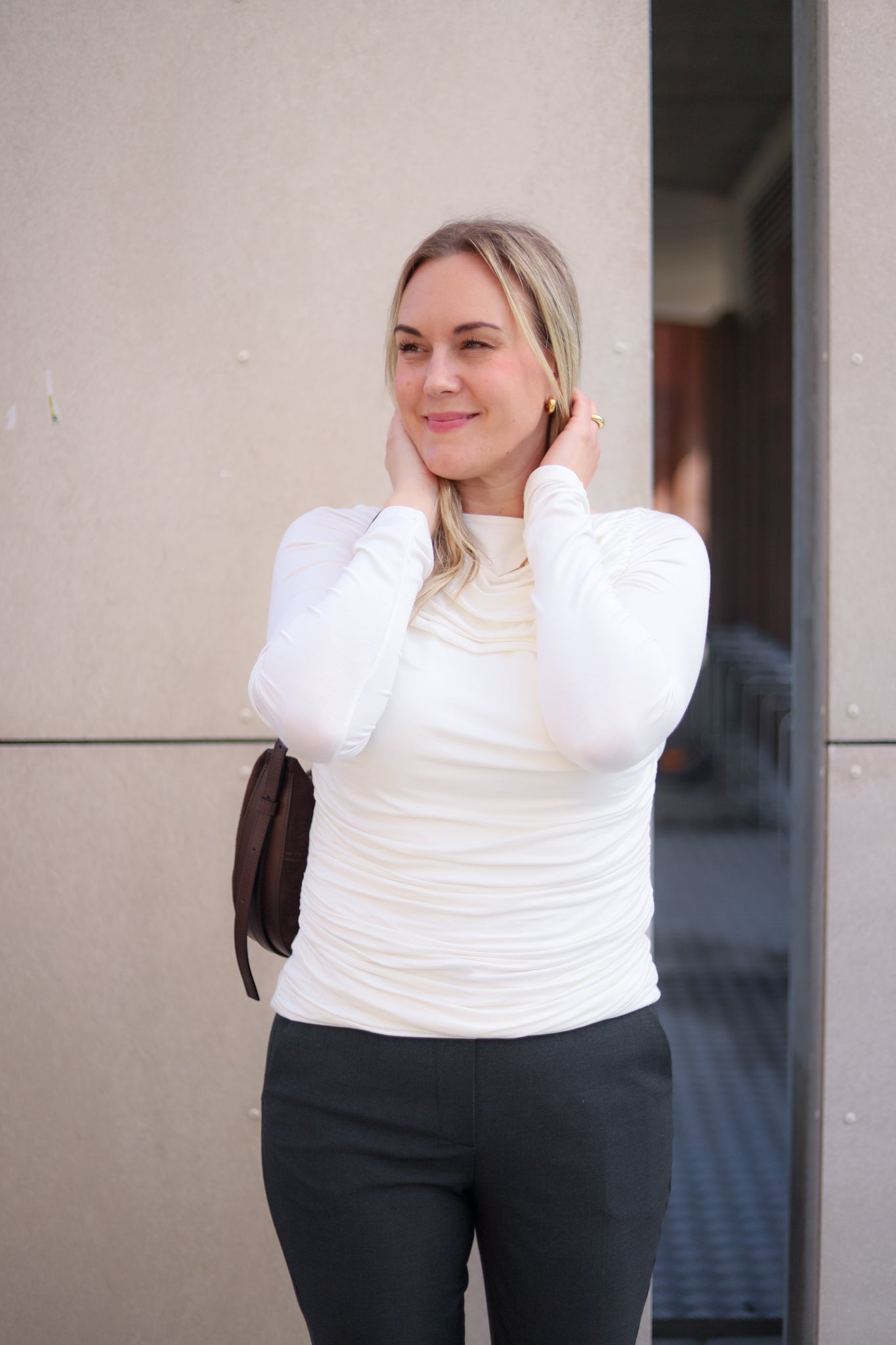 Nydelig topp i off white med delikate draperinger fra Viveh. Tettsittende modell med lange smale ermer og elegant båthalsutringning. Den er designet for allsidighet og kan brukes på to måter, enten med elegante draperinger eller en stilren front. Toppen er laget i myk viskosejersey og er dobbeltfôret for ekstra støtte og komfort. En vinner i basegarderoben.