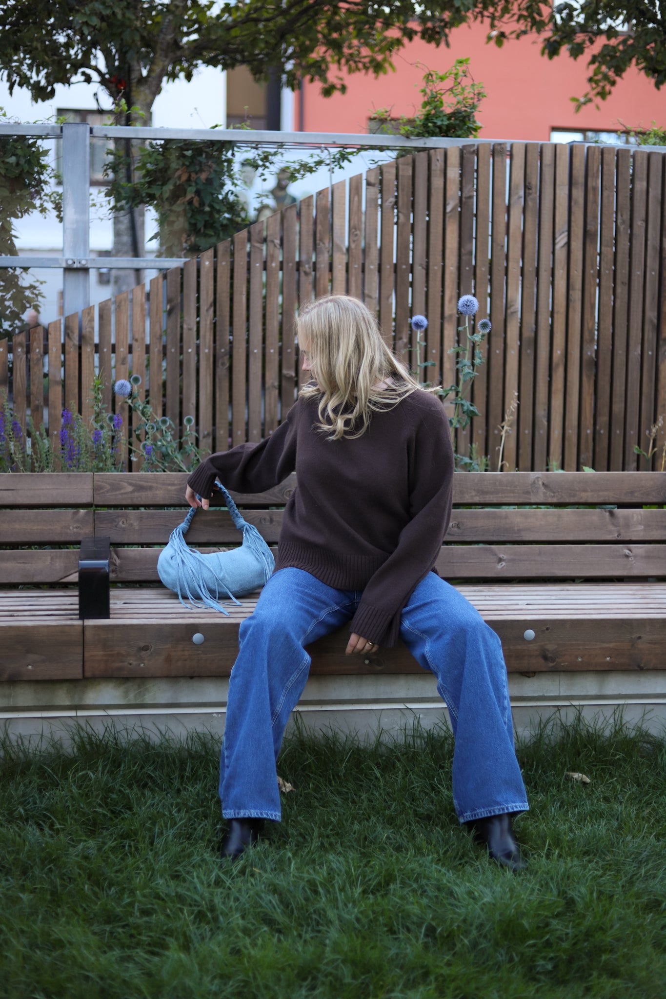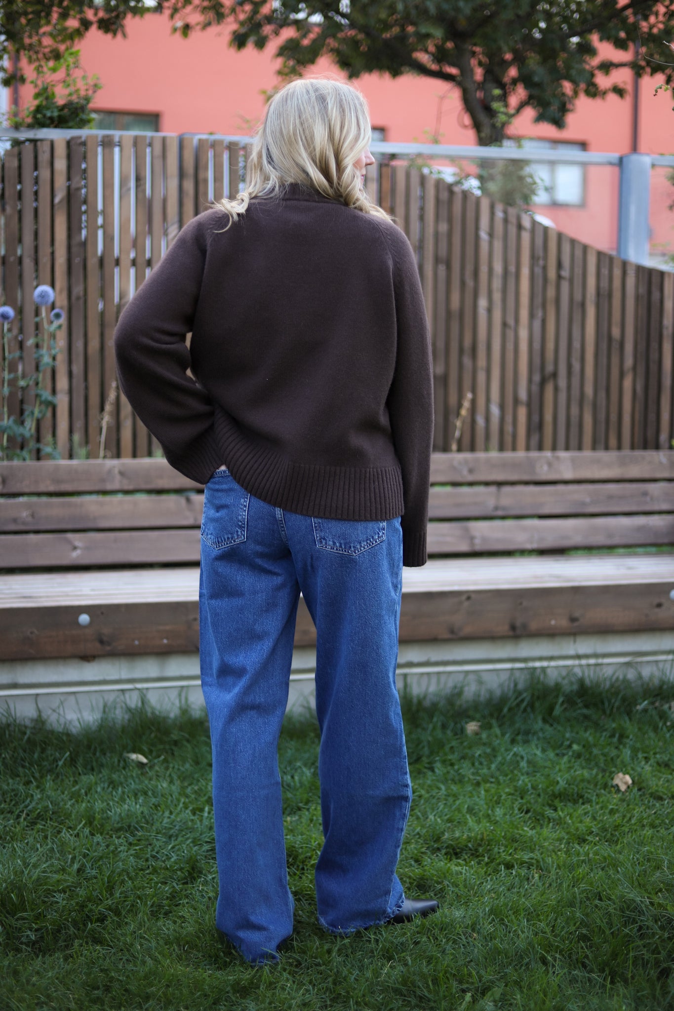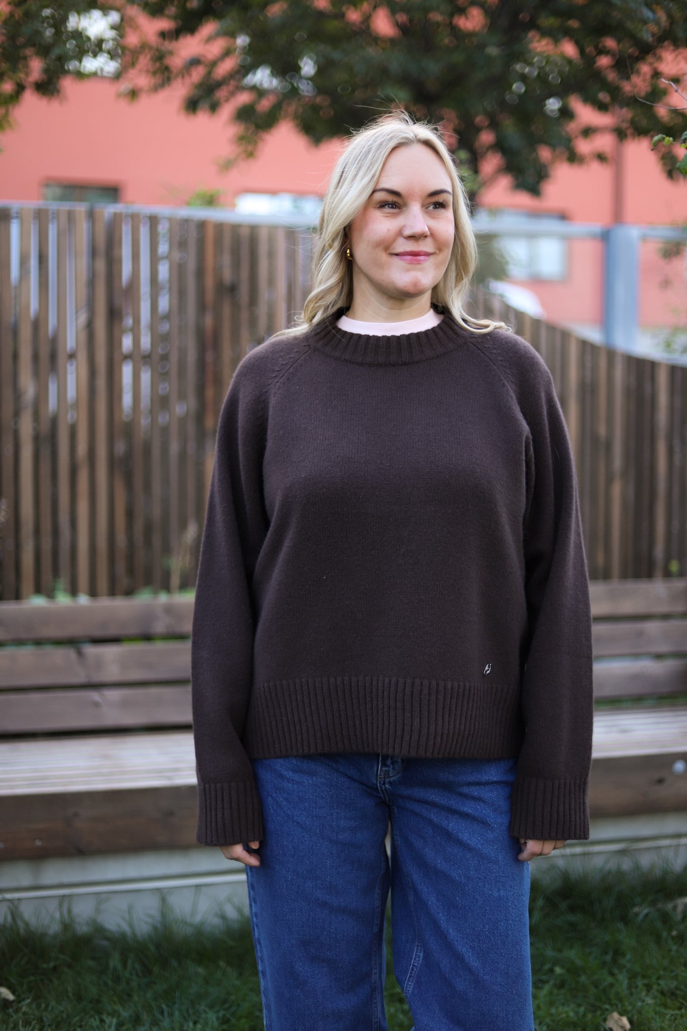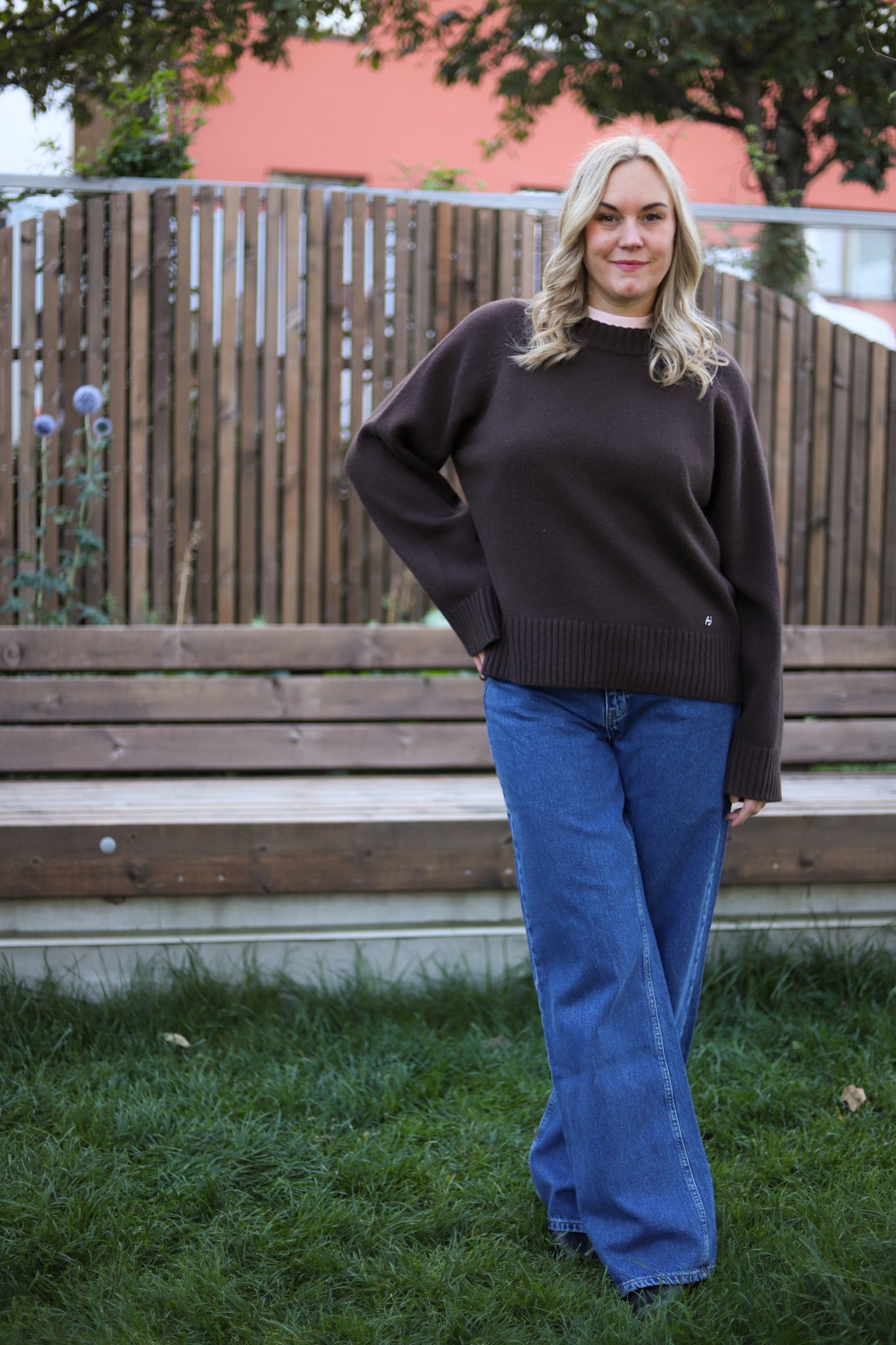 Stilig strikk i mørk brunt fra Holzweiler. Modellen er rett med pen hoftelengde og rund hals. Lange vide ermer med droppet skulder. Ribbestrikk i hals, hem og mansjett. Perfekt hverdagsgenser i høstgarderoben.