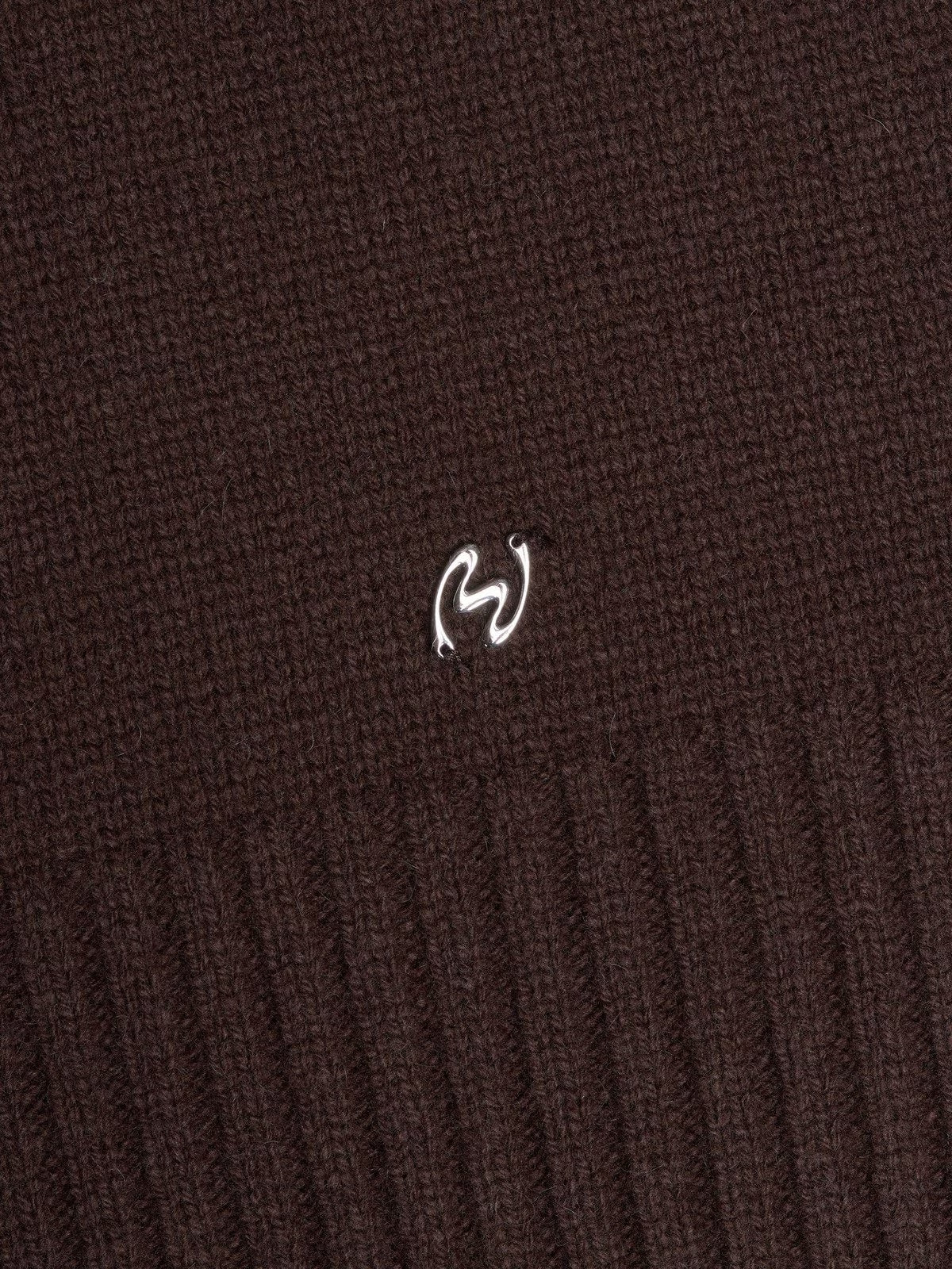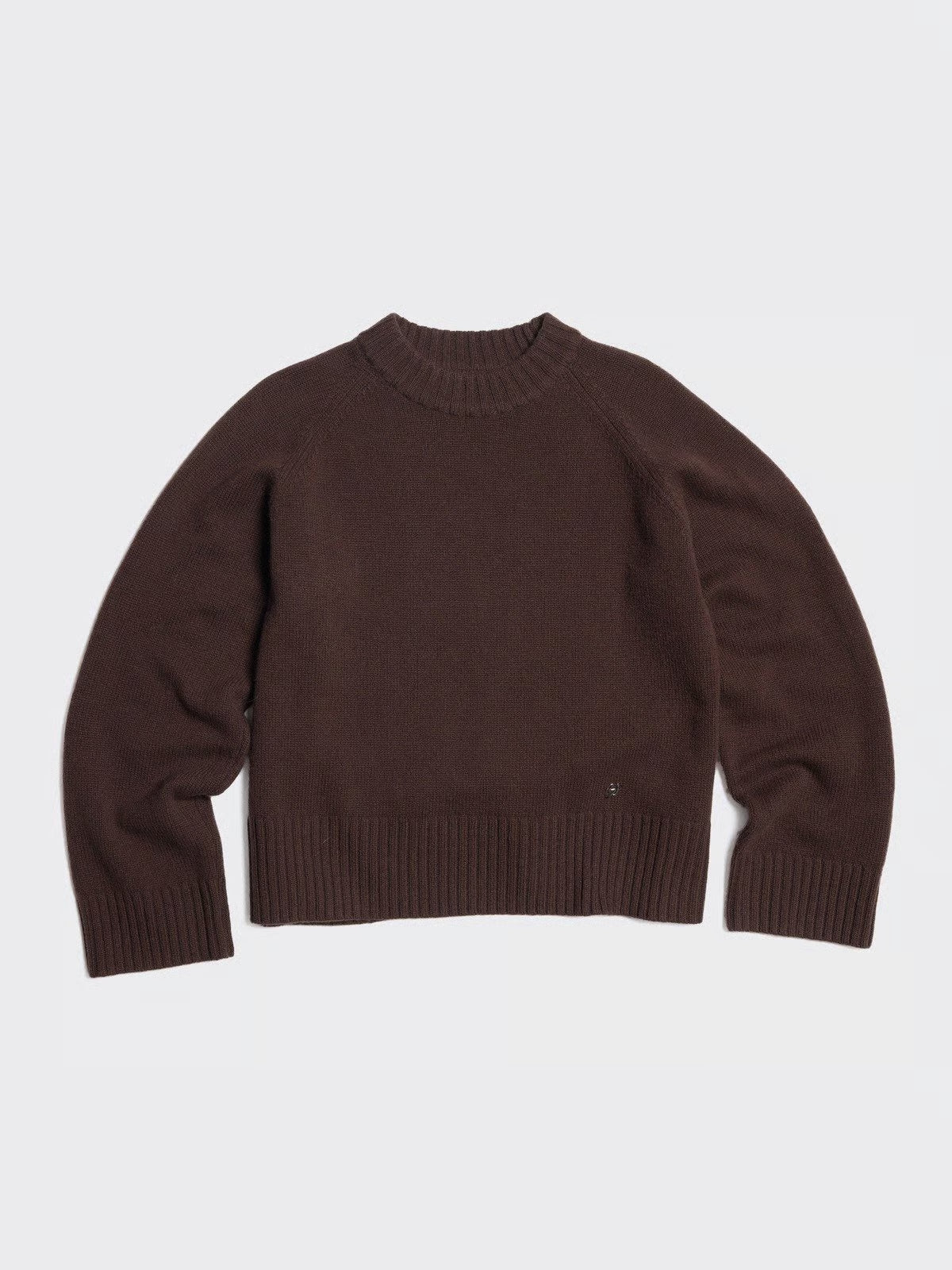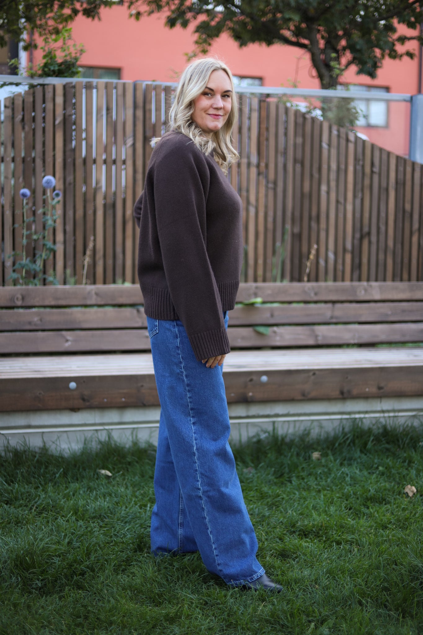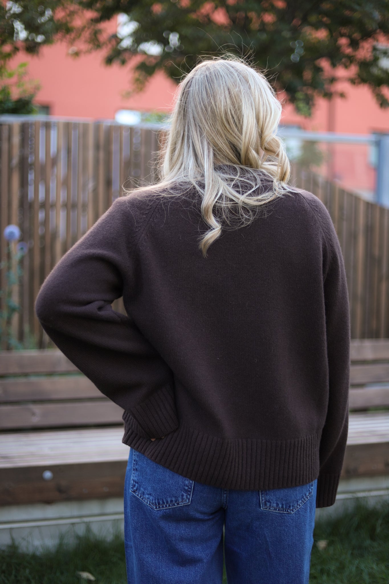 Stilig strikk i mørk brunt fra Holzweiler. Modellen er rett med pen hoftelengde og rund hals. Lange vide ermer med droppet skulder. Ribbestrikk i hals, hem og mansjett. Perfekt hverdagsgenser i høstgarderoben.
