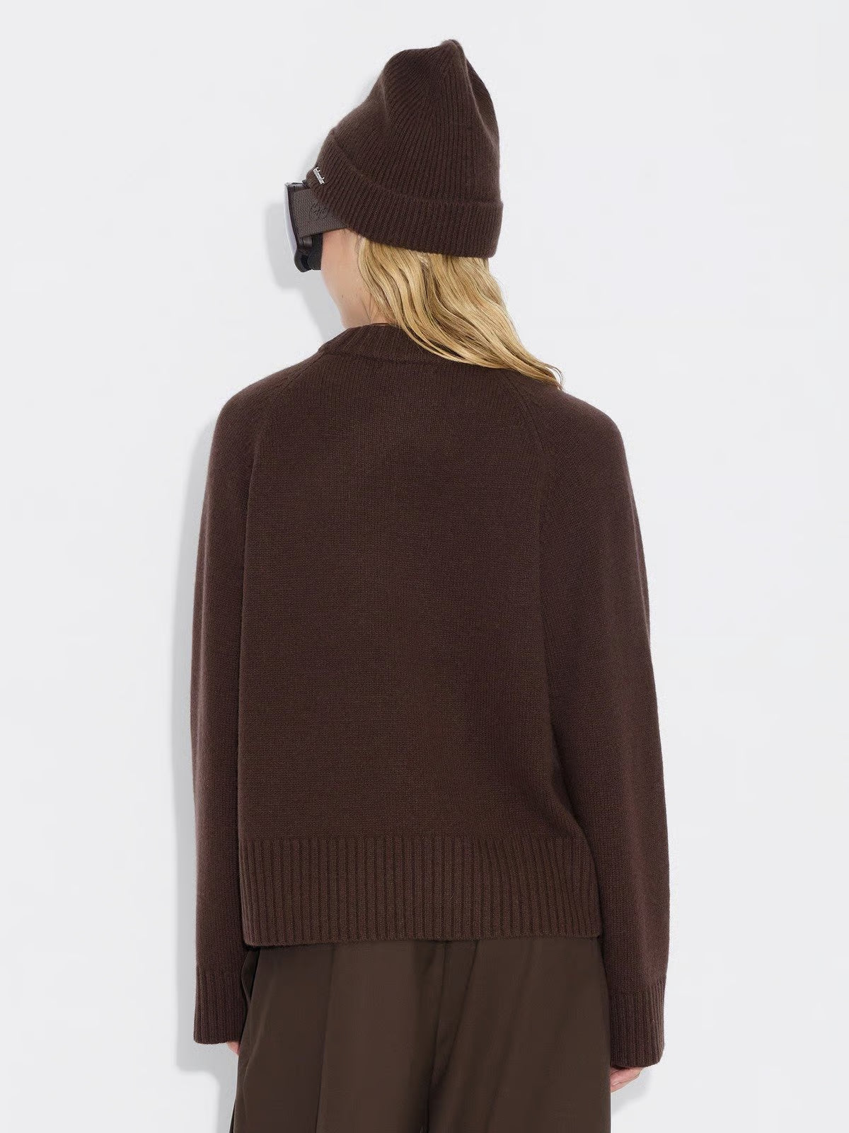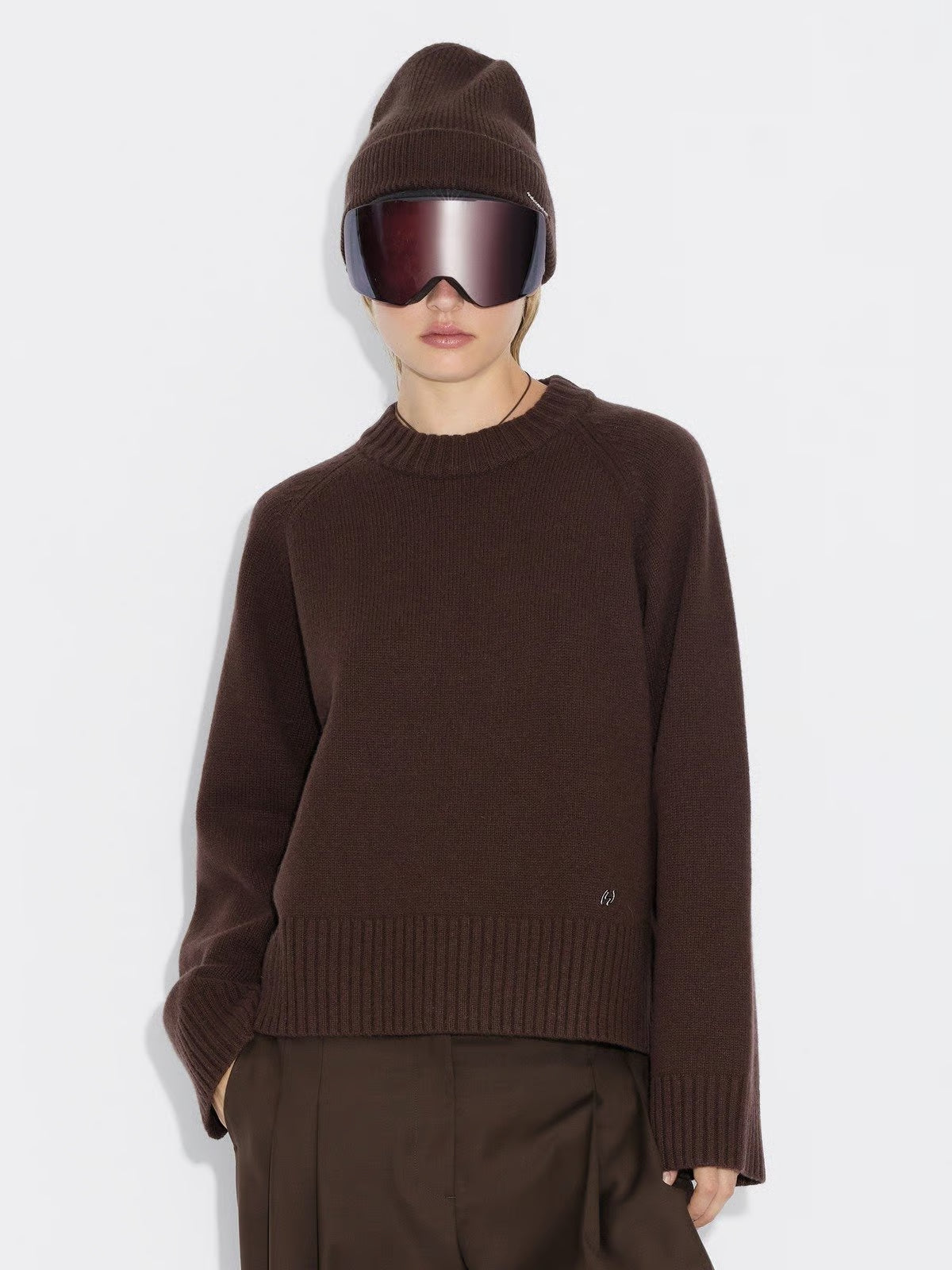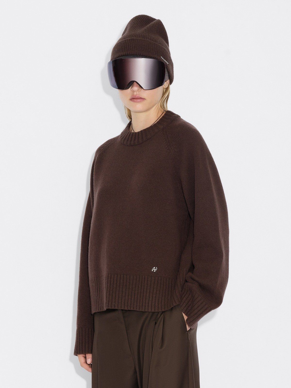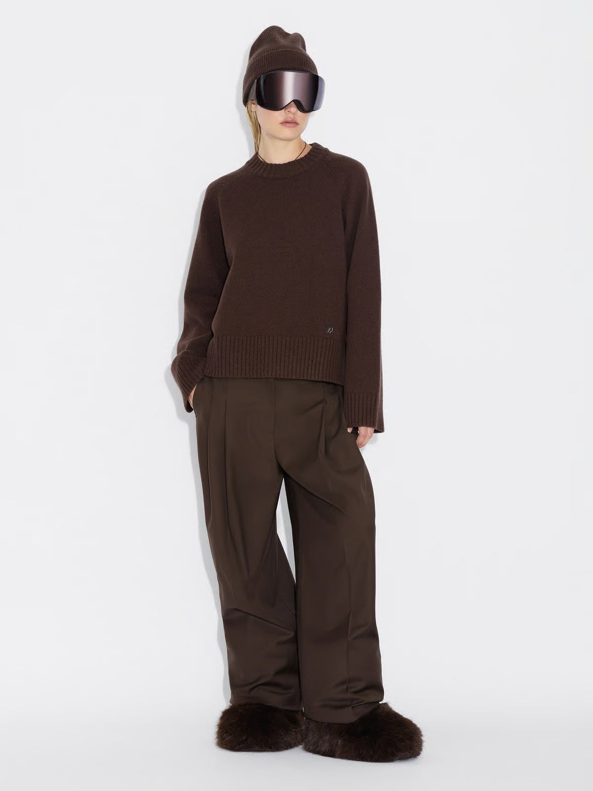 Stilig strikk i mørk brunt fra Holzweiler. Modellen er rett med pen hoftelengde og rund hals. Lange vide ermer med droppet skulder. Ribbestrikk i hals, hem og mansjett. Perfekt hverdagsgenser i høstgarderoben.